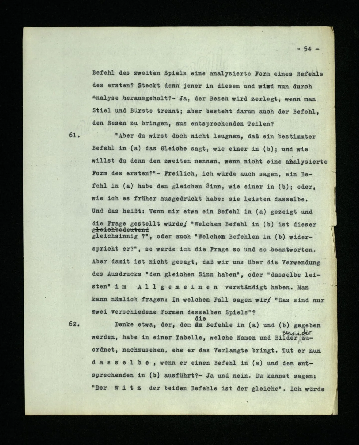 685. “Suche den A” heißt nicht “Suche den B”; aber ich mag, indem ich die beiden Befehle befolge, genau das gleiche tun. Zu sagen, es müsse dabei etwas anderes geschehen, wäre ähnlich, als sagte man: die Sätze “Heute ist mein Geburtstag” und “Am 26. April ist mein Geburtstag” müßten sich auf verschiedene Tage beziehen, da ihr Sinn nicht der gleiche sei.