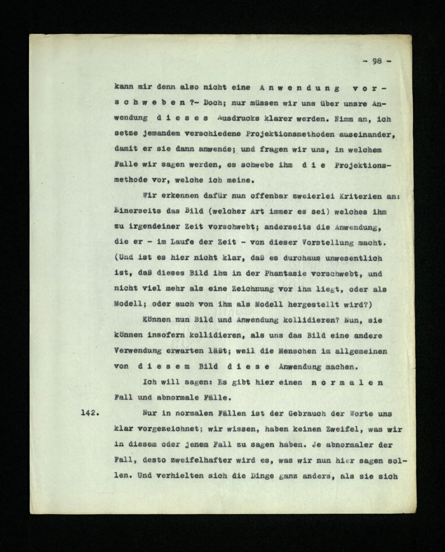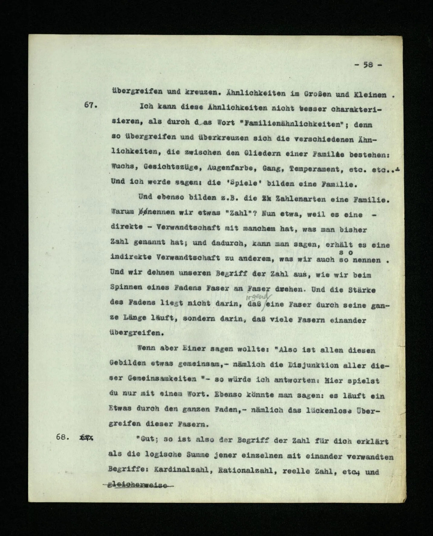 683. Ich zeichne einen Kopf. Du fragst “Wen soll das vorstellen?” – Ich: “Das soll N. sein.” – Du: “Es sieht ihm aber nicht ähnlich; eher noch dem M.” – Als ich sagte, es stelle den N. vor,– machte ich einen Zusammenhang, oder berichtete ich von einem? Welcher Zusammenhang hatte denn bestanden?