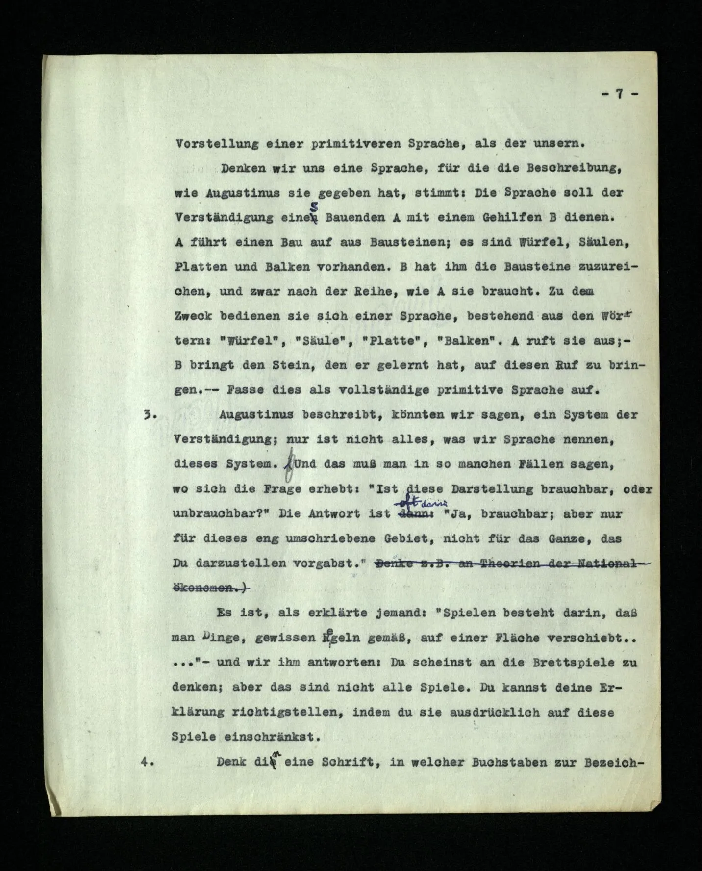 3. Augustinus beschreibt, könnten wir sagen, ein System der Verständigung, nur ist nicht alles, was wir Sprache nennen, dieses System. Und das muß man in so manchen Fällen sagen, wo sich die Frage erhebt: “Ist diese Darstellung brauchbar, oder unbrauchbar?” Die Antwort ist dann “Ja, brauchbar; aber nur für dieses eng umschriebene Gebiet, nicht für das Ganze, das Du darzustellen vorgabst.” Es ist, als erklärte jemand: “Spielen besteht darin, daß man Dinge, gewissen Regeln gemäß, auf einer Fläche verschiebt …” – und wir ihm antworten: Du scheinst an die Brettspiele zu denken; aber das sind nicht alle Spiele. Du kannst deine Erklärung richtigstellen, indem du sie ausdrücklich auf diese Spiele einschränkst.