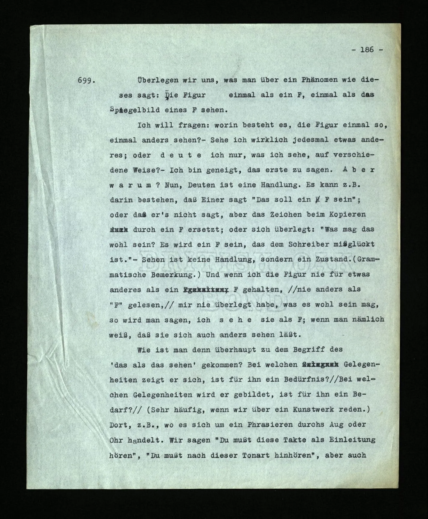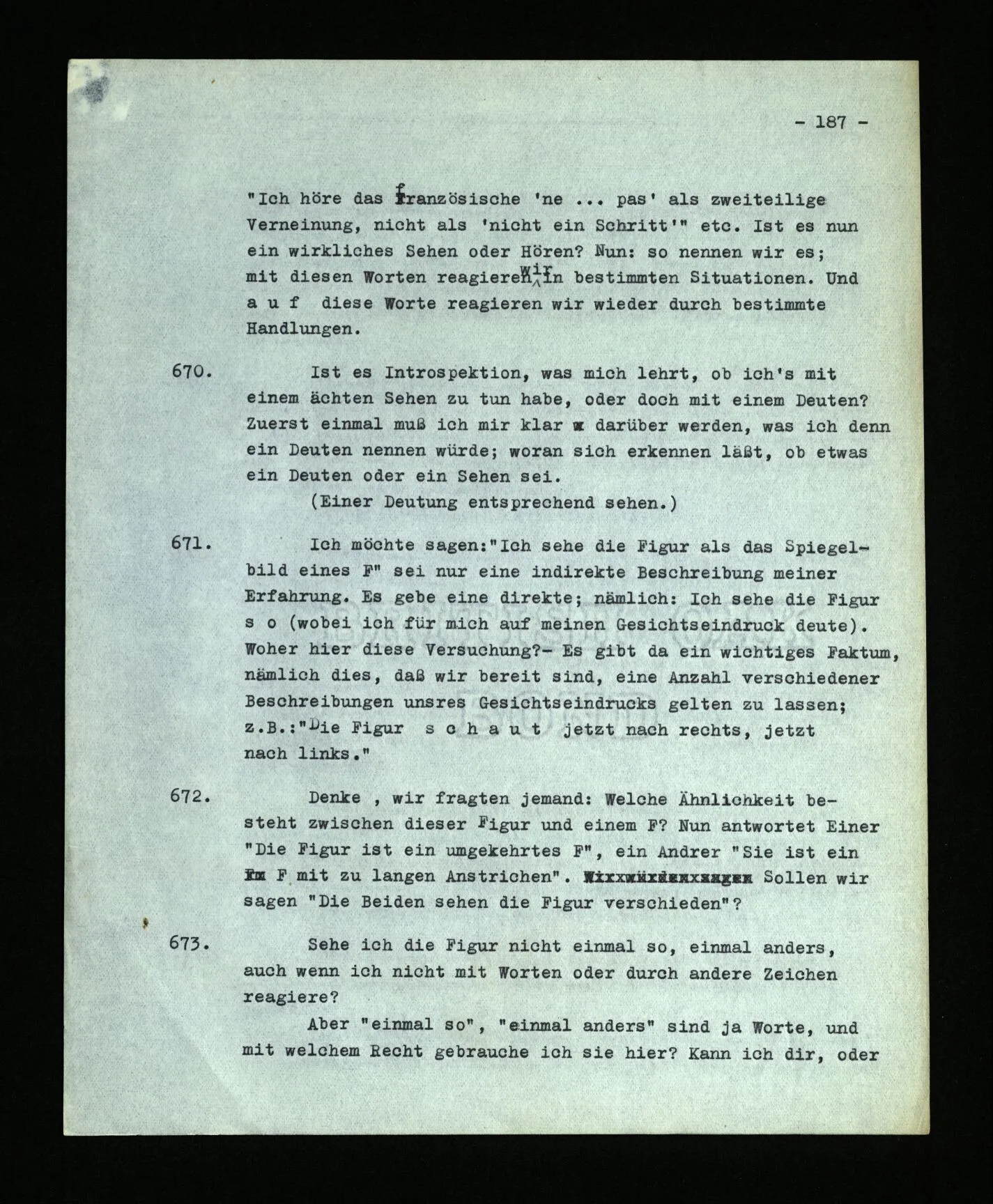 699. Überlegen wir uns, was man über ein Phänomen wie dieses sagt: Die Figur 🖵 einmal als ein F, einmal als das Spiegelbild eines F sehen. Ich will fragen: worin besteht es, die Figur einmal so, einmal anders sehen? – Sehe ich wirklich jedesmal etwas anderes; oder deute ich nur, was ich sehe, auf verschiedene Weise? – Ich bin geneigt, das erste zu sagen. Aber warum? Nun, Deuten ist eine Handlung. Es kann z.B. darin bestehen, daß Einer sagt “Das soll ein F sein”; oder daß er’s nicht sagt, aber das Zeichen beim Kopieren durch ein F ersetzt; oder sich überlegt: “Was mag das wohl sein? Es wird ein F sein, das dem Schreiber mißglückt ist.” – Sehen ist keine Handlung, sondern ein Zustand. (Grammatische Bemerkung.) Und wenn ich die Figur nie für etwas anderes als ein “F” gehalten, mir nie überlegt habe, was es wohl sein mag, so wird man sagen, ich sehe sie als F; wenn man nämlich weiß, daß sie sich auch anders sehen läßt. Wie ist man denn überhaupt zu dem Begriff des ‘das als das sehen’ gekommen? Bei welchen Gelegenheiten zeigt er sich, ist für ihn ein Bedürfnis? (Sehr häufig, wenn wir über ein Kunstwerk reden.) Dort, z.B., wo es sich um ein Phrasieren durchs Aug oder Ohr handelt. Wir sagen “Du mußt diese Takte als Einleitung hören”, “Du mußt nach dieser Tonart hinhören”, aber auch “Ich höre das französische ‘ne … pas’ als zweiteilige Verneinung, nicht als ‘nicht ein Schritt’” etc. Ist es nun ein wirkliches Sehen oder Hören? Nun: so nennen wir es; mit diesen Worten reagieren wir in bestimmten Situationen. Und auf diese Worte reagieren wir wieder durch bestimmte Handlungen.