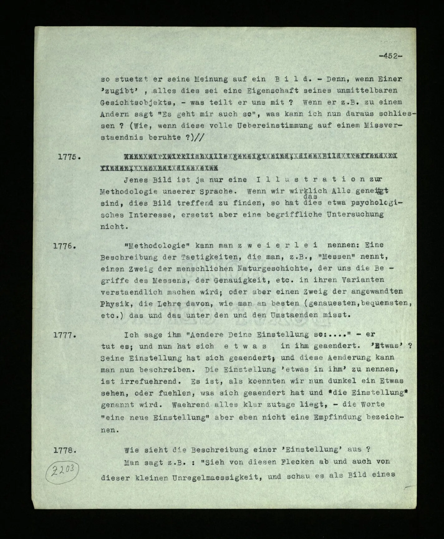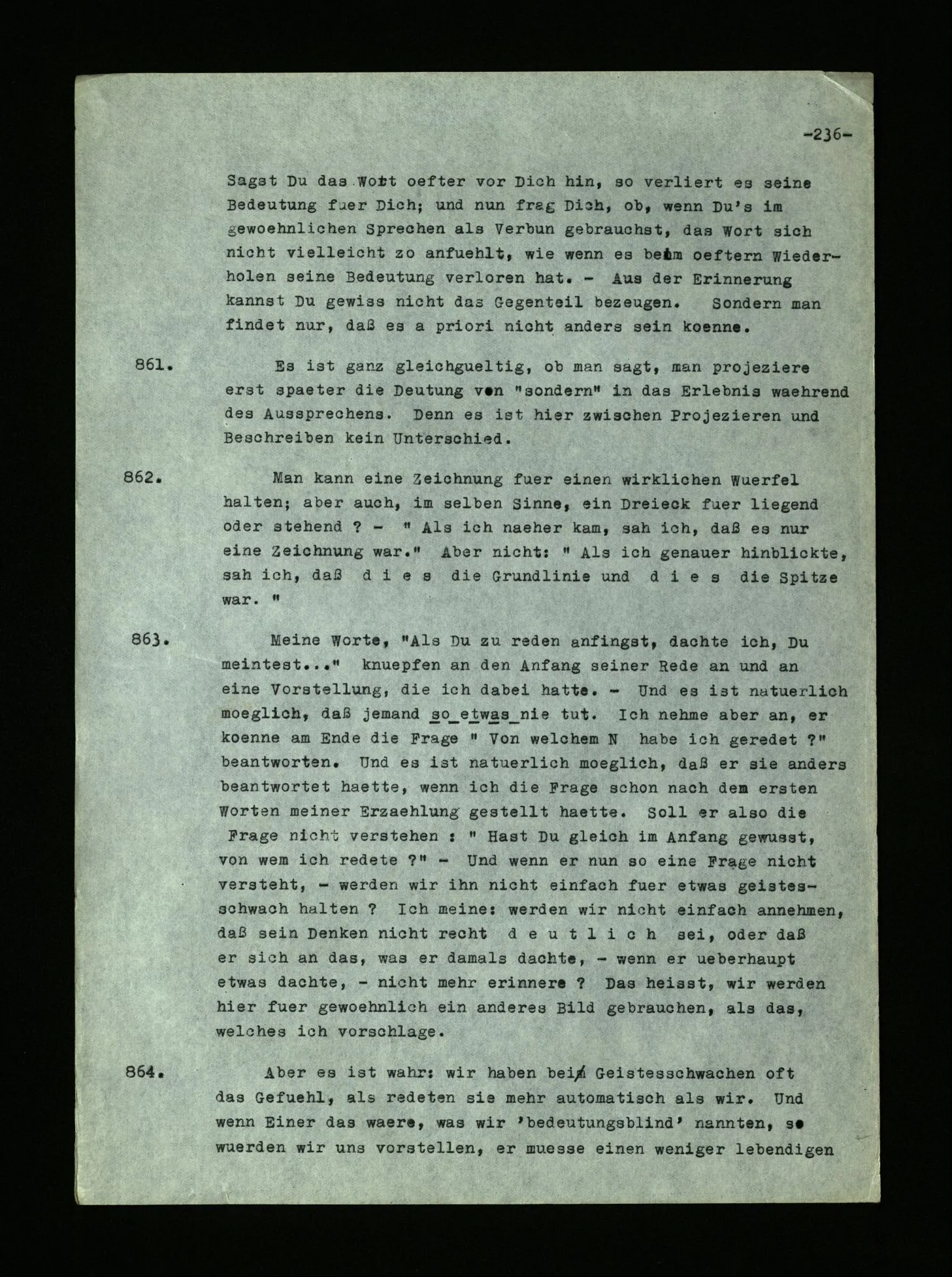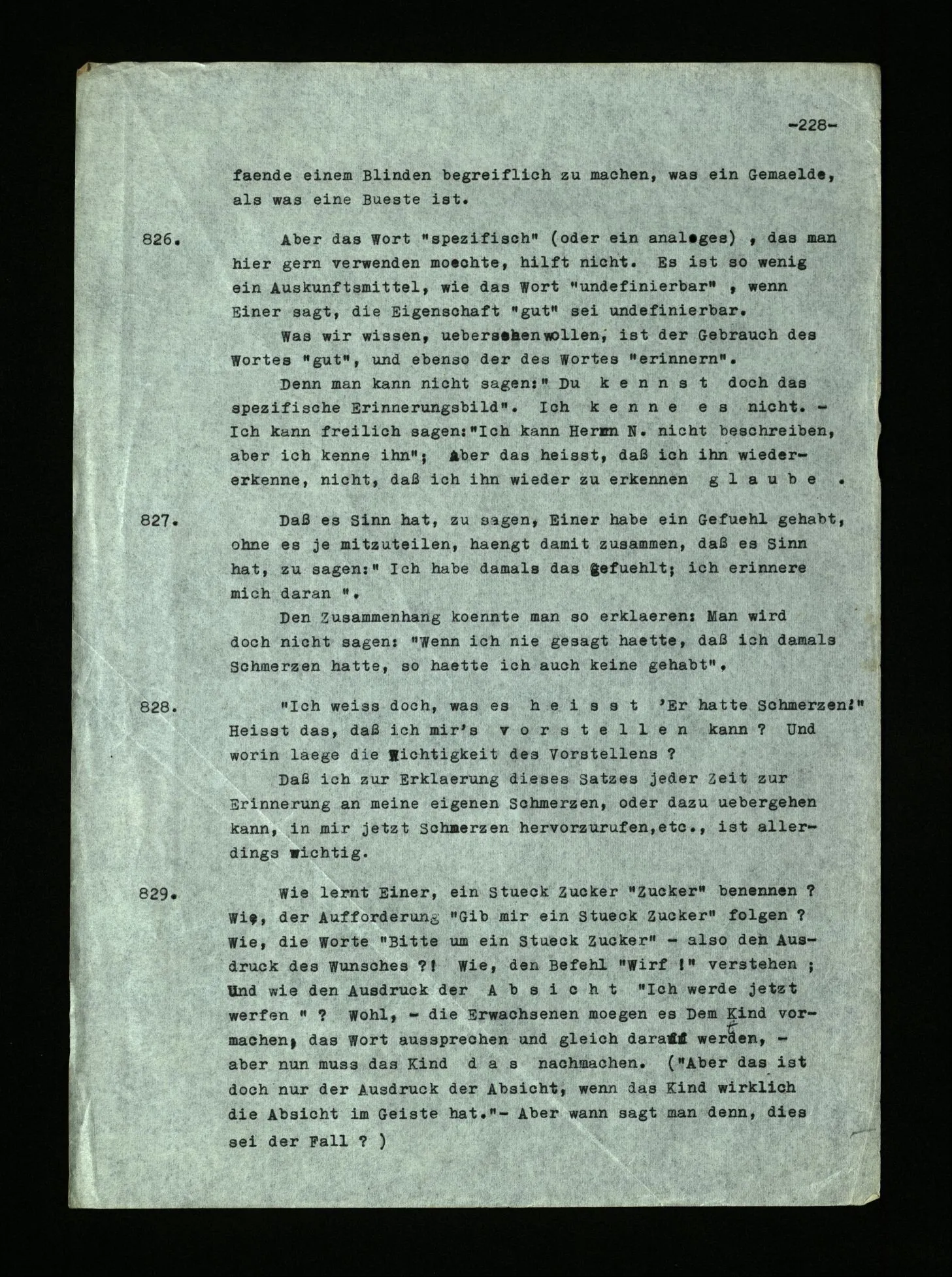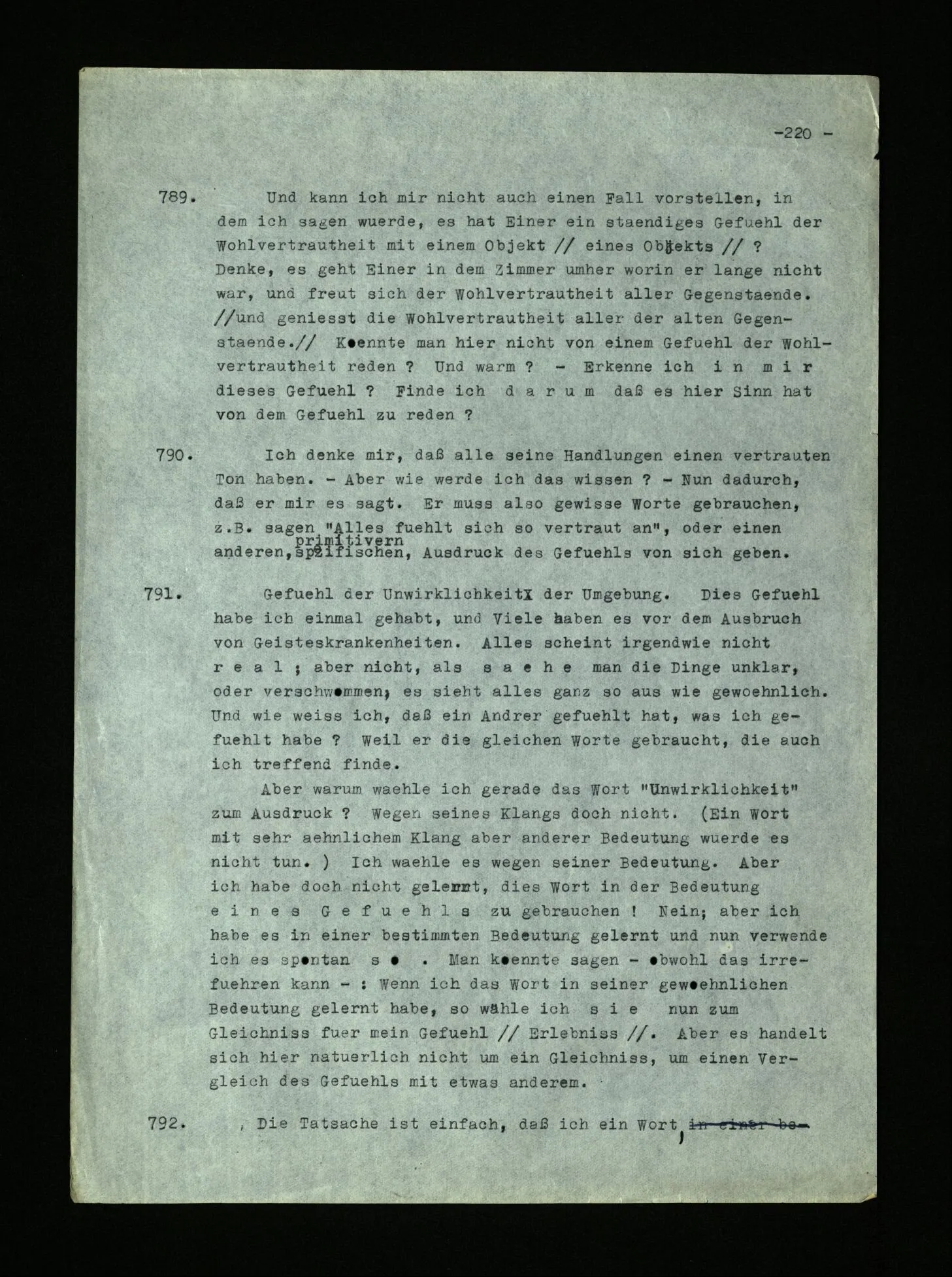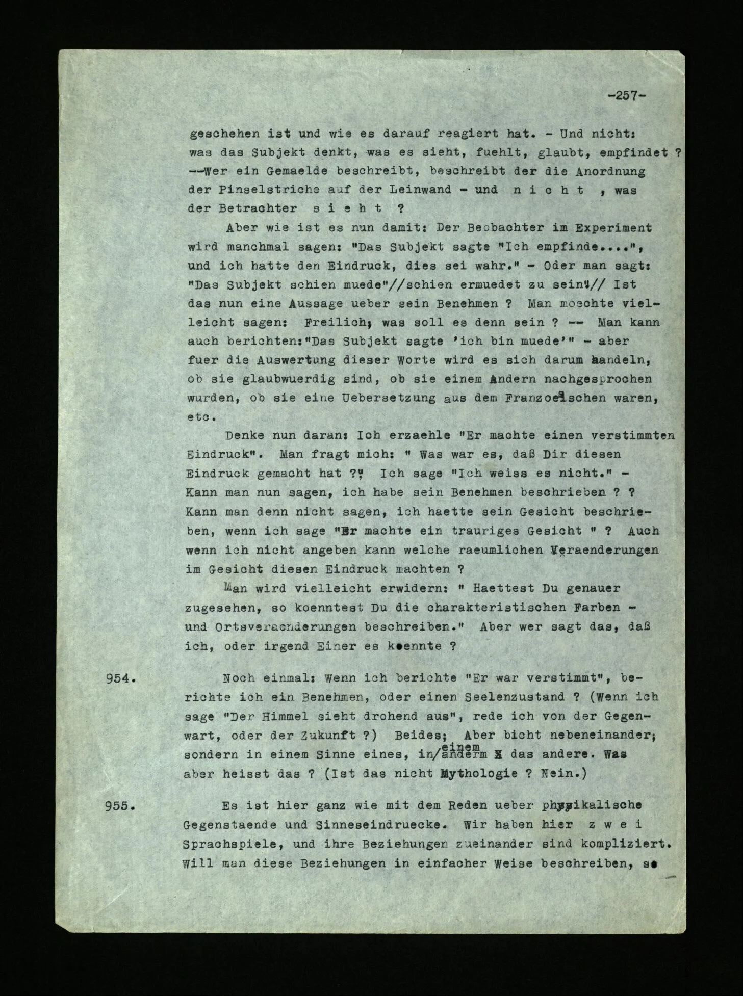 1774. Wenn jemand sagt: Die Form, die Farbe, die Organisation, der Ausdruck, sind doch alle, offenbar, (für jeden Unvoreingenommenen) Eigenschaften, Züge, des subjektiv Gesehenen, des unmittelbaren Gesichtsobjekts, – so verrät ihn hier das Wort “offenbar”. “Offenbar” ist es darum, weil’s Jeder zugibt; und er gibt es nur durch den Sprachgebrauch zu. Man begründet also hier einen Satz durch ein Bild.