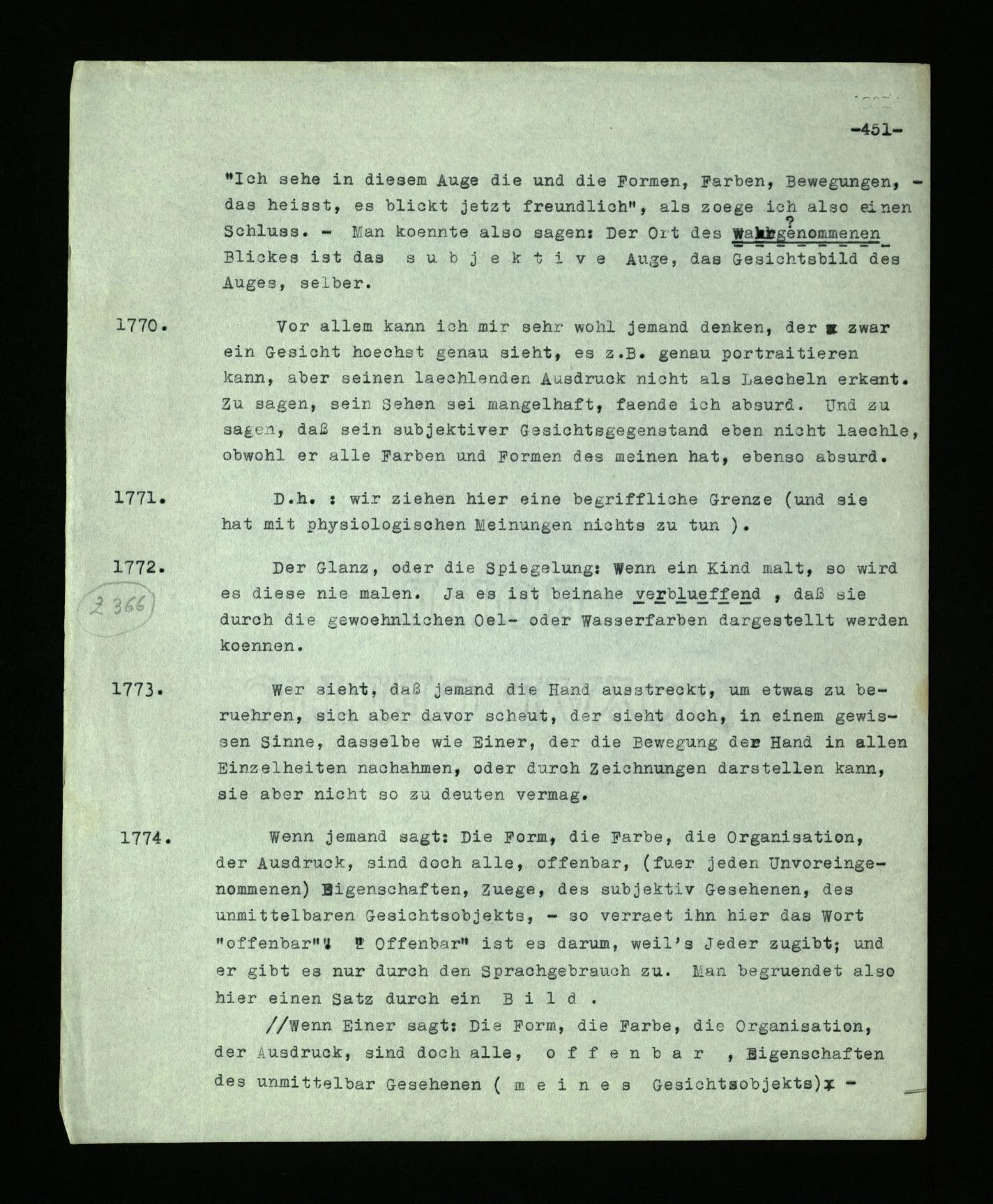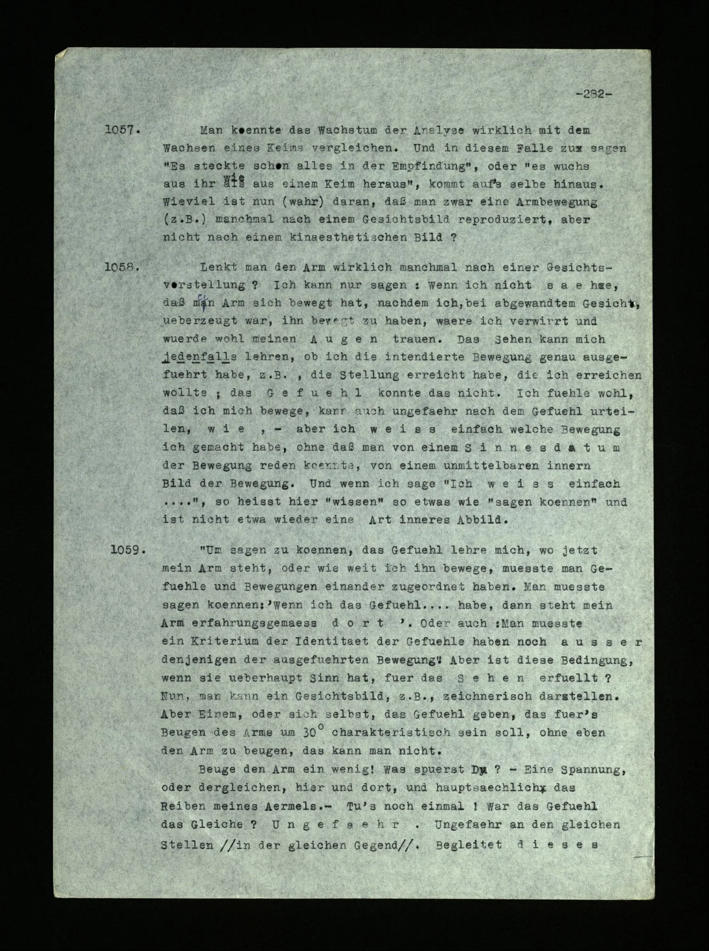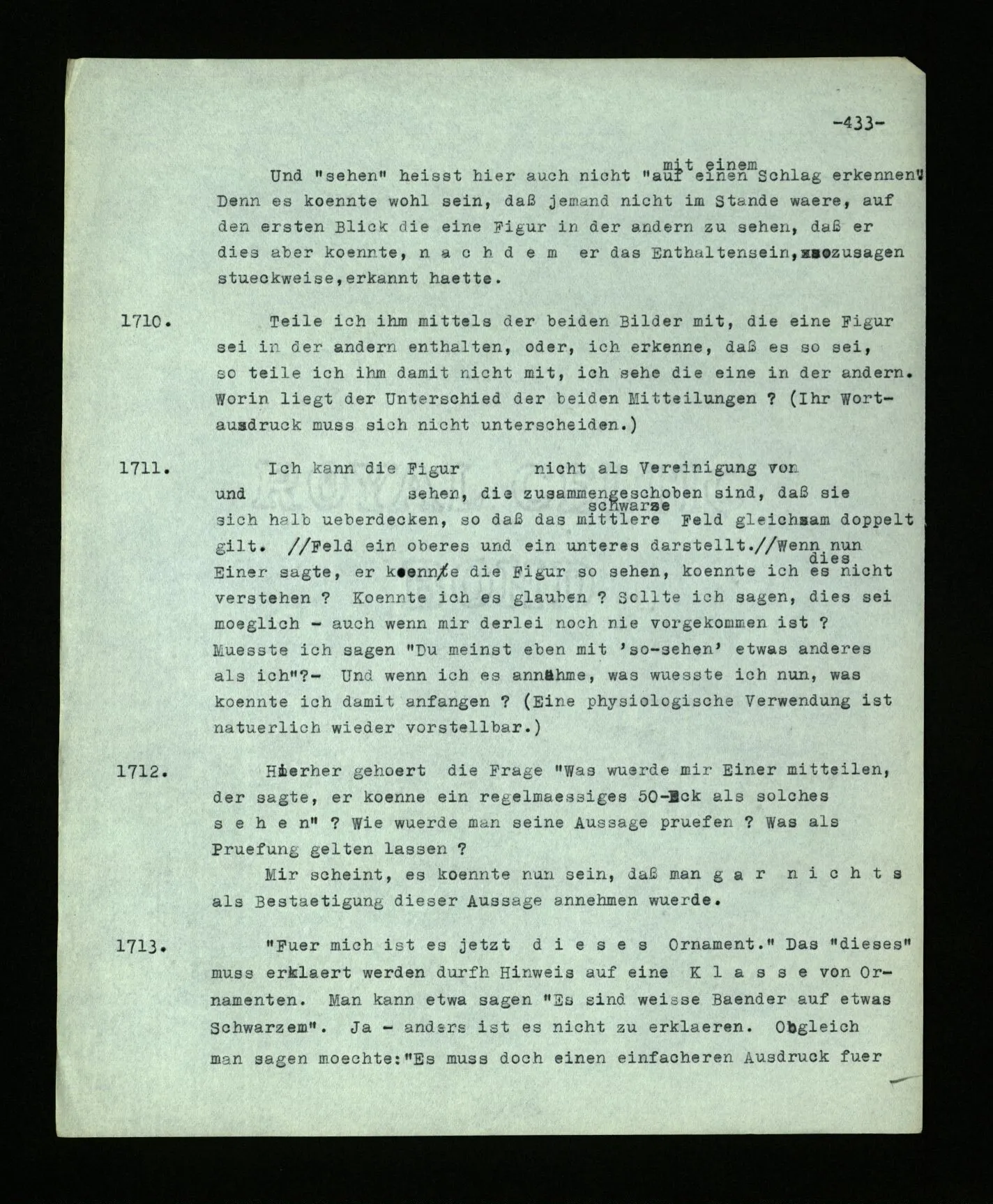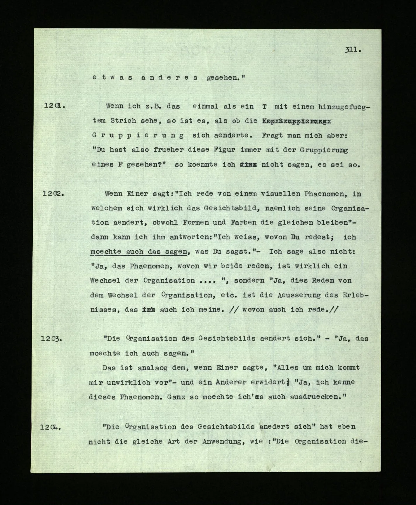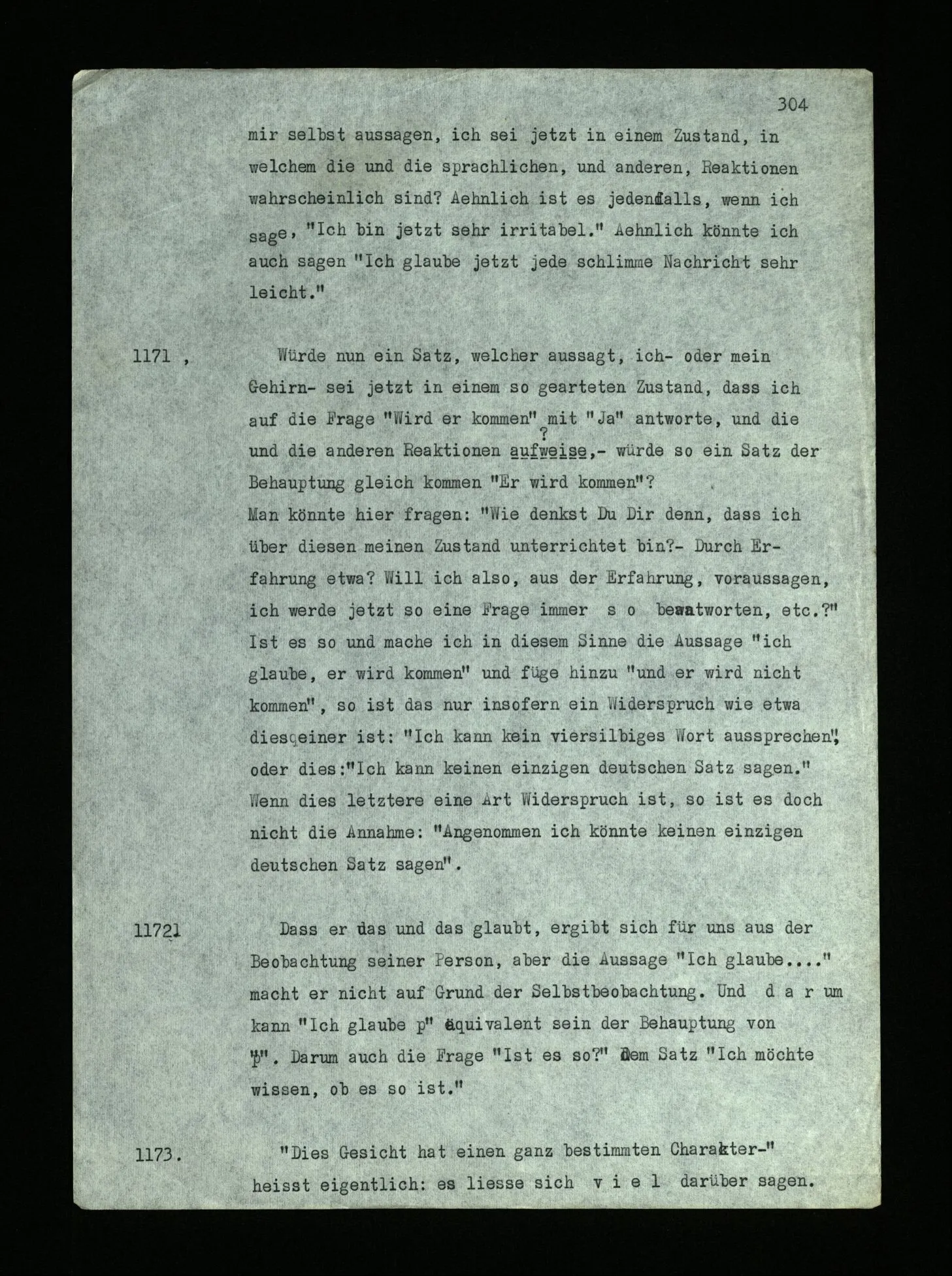 1774. Wenn jemand sagt: Die Form, die Farbe, die Organisation, der Ausdruck, sind doch alle, offenbar, (für jeden Unvoreingenommenen) Eigenschaften, Züge, des subjektiv Gesehenen, des unmittelbaren Gesichtsobjekts, – so verrät ihn hier das Wort “offenbar”. “Offenbar” ist es darum, weil’s Jeder zugibt; und er gibt es nur durch den Sprachgebrauch zu. Man begründet also hier einen Satz durch ein Bild.