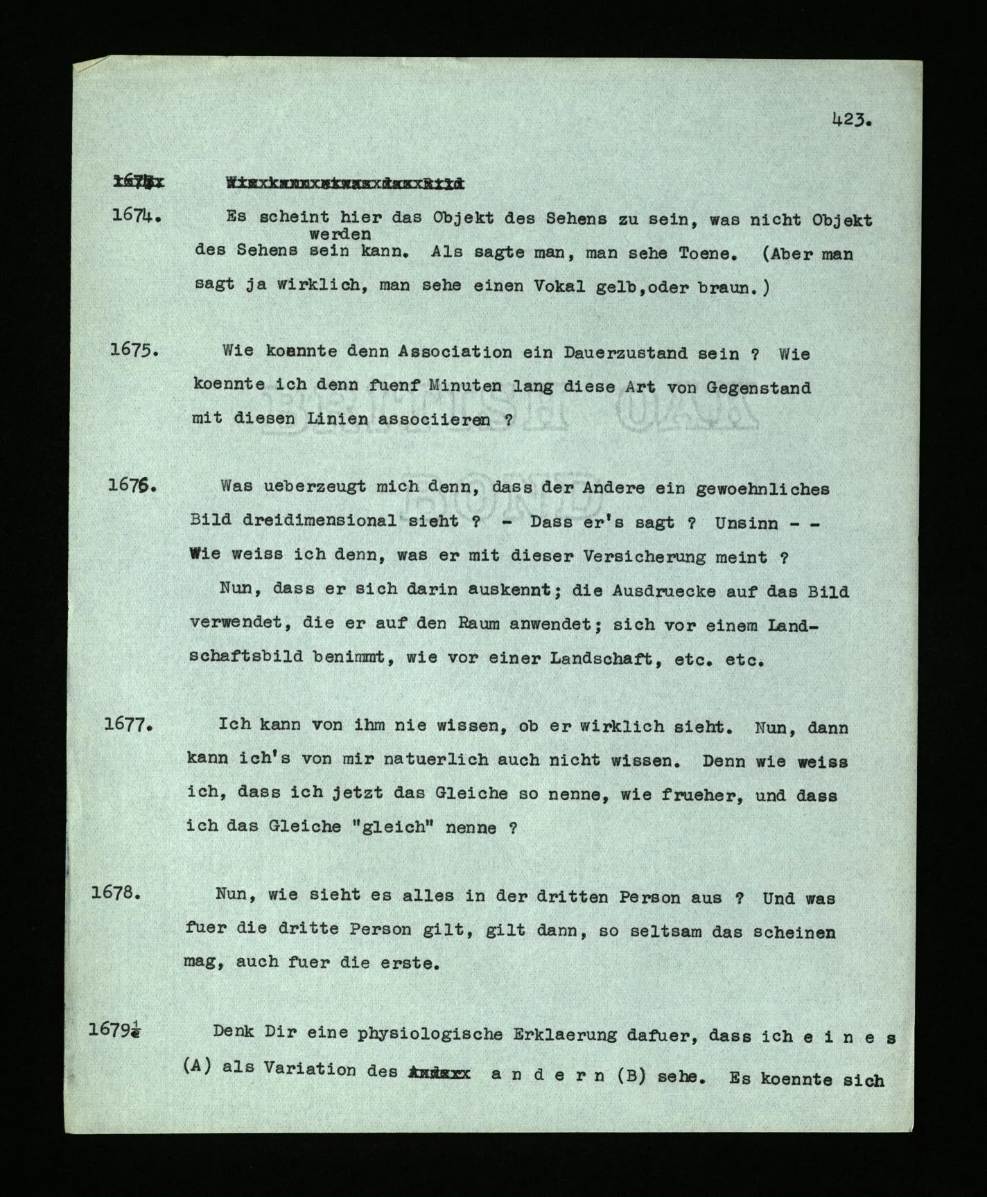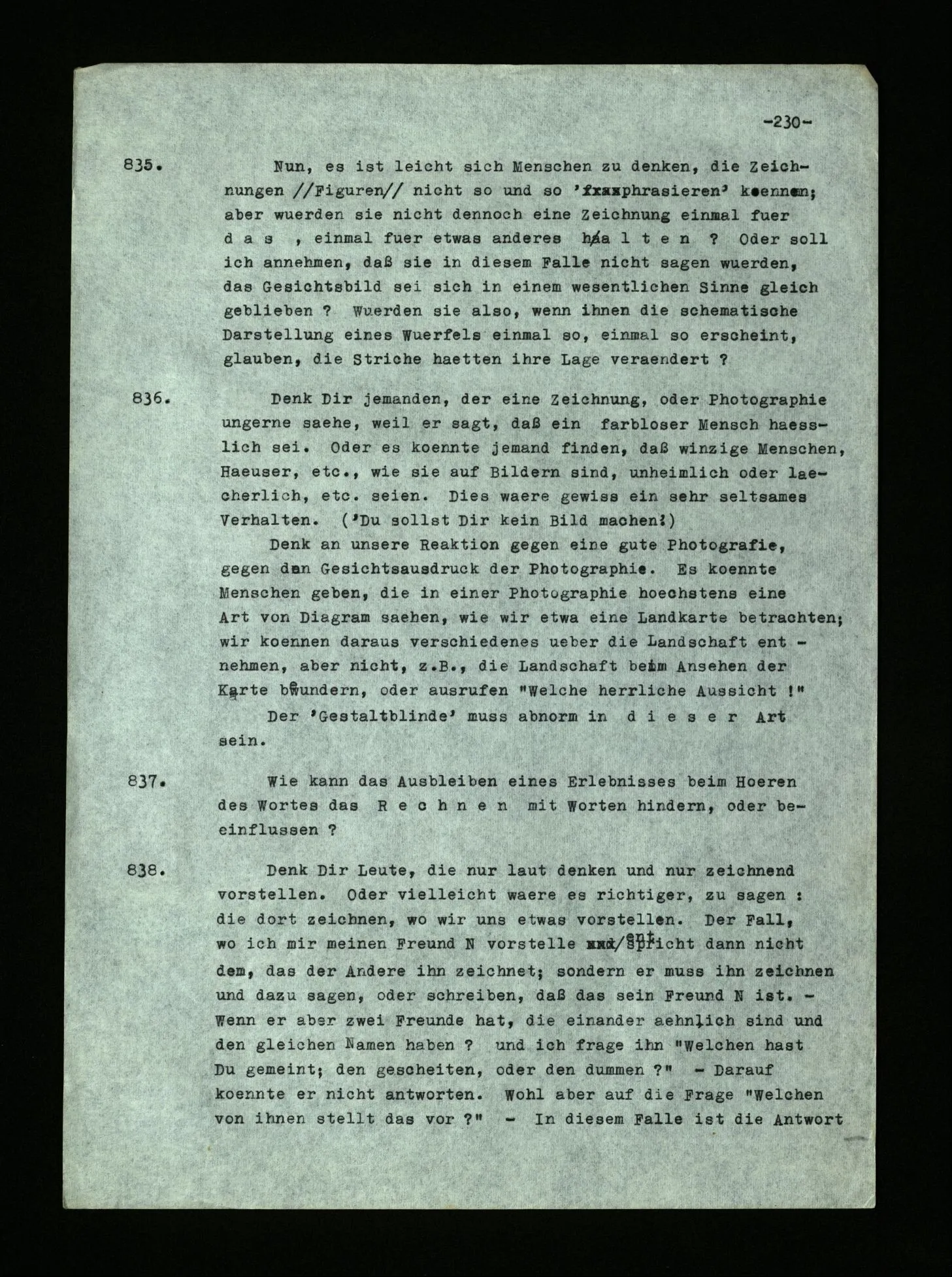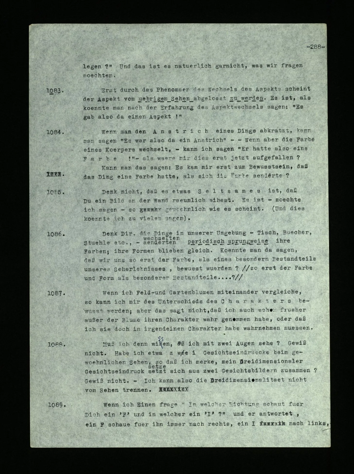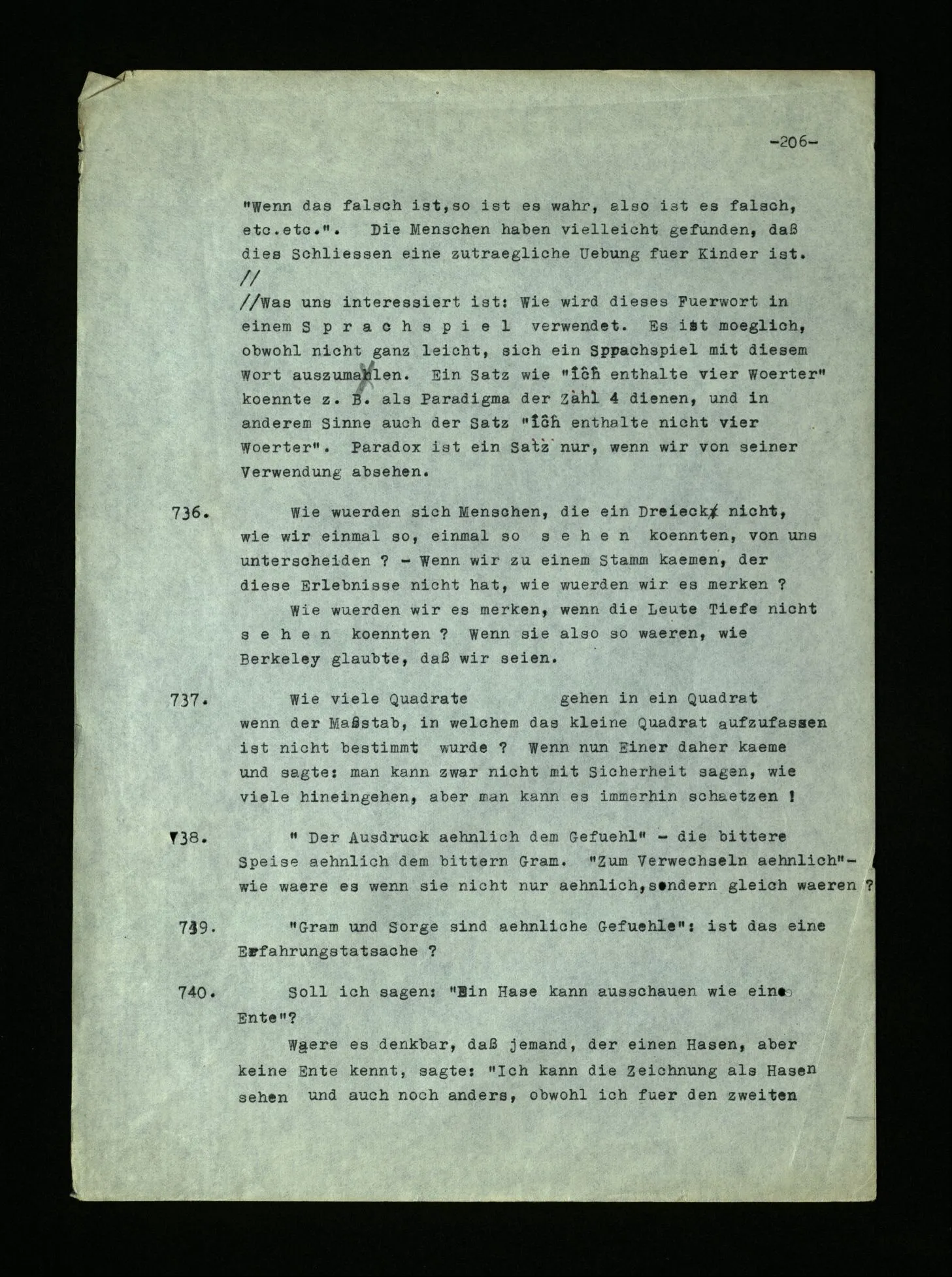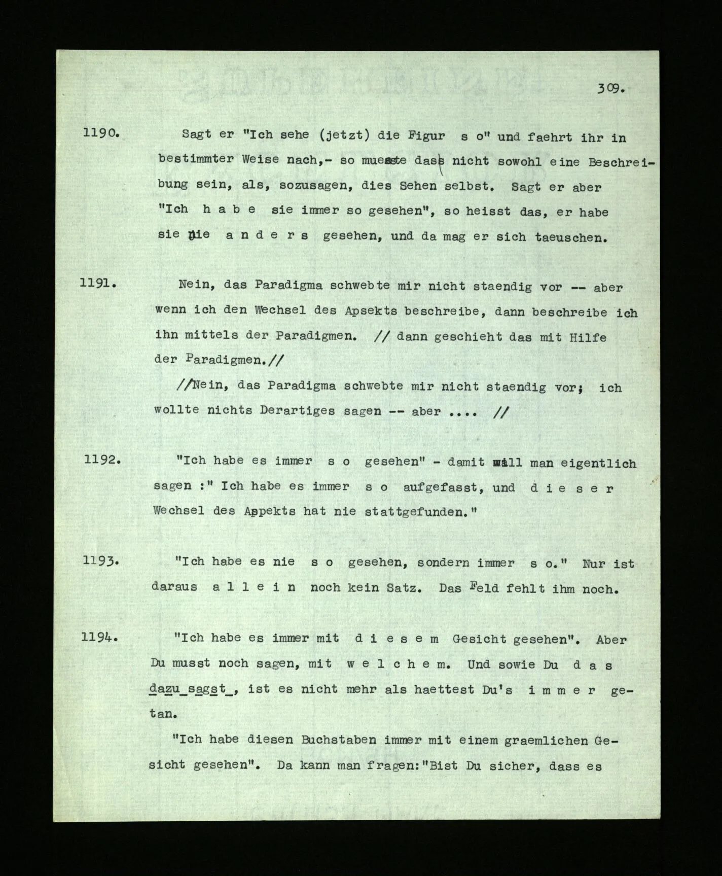 1774. Wenn jemand sagt: Die Form, die Farbe, die Organisation, der Ausdruck, sind doch alle, offenbar, (für jeden Unvoreingenommenen) Eigenschaften, Züge, des subjektiv Gesehenen, des unmittelbaren Gesichtsobjekts, – so verrät ihn hier das Wort “offenbar”. “Offenbar” ist es darum, weil’s Jeder zugibt; und er gibt es nur durch den Sprachgebrauch zu. Man begründet also hier einen Satz durch ein Bild.