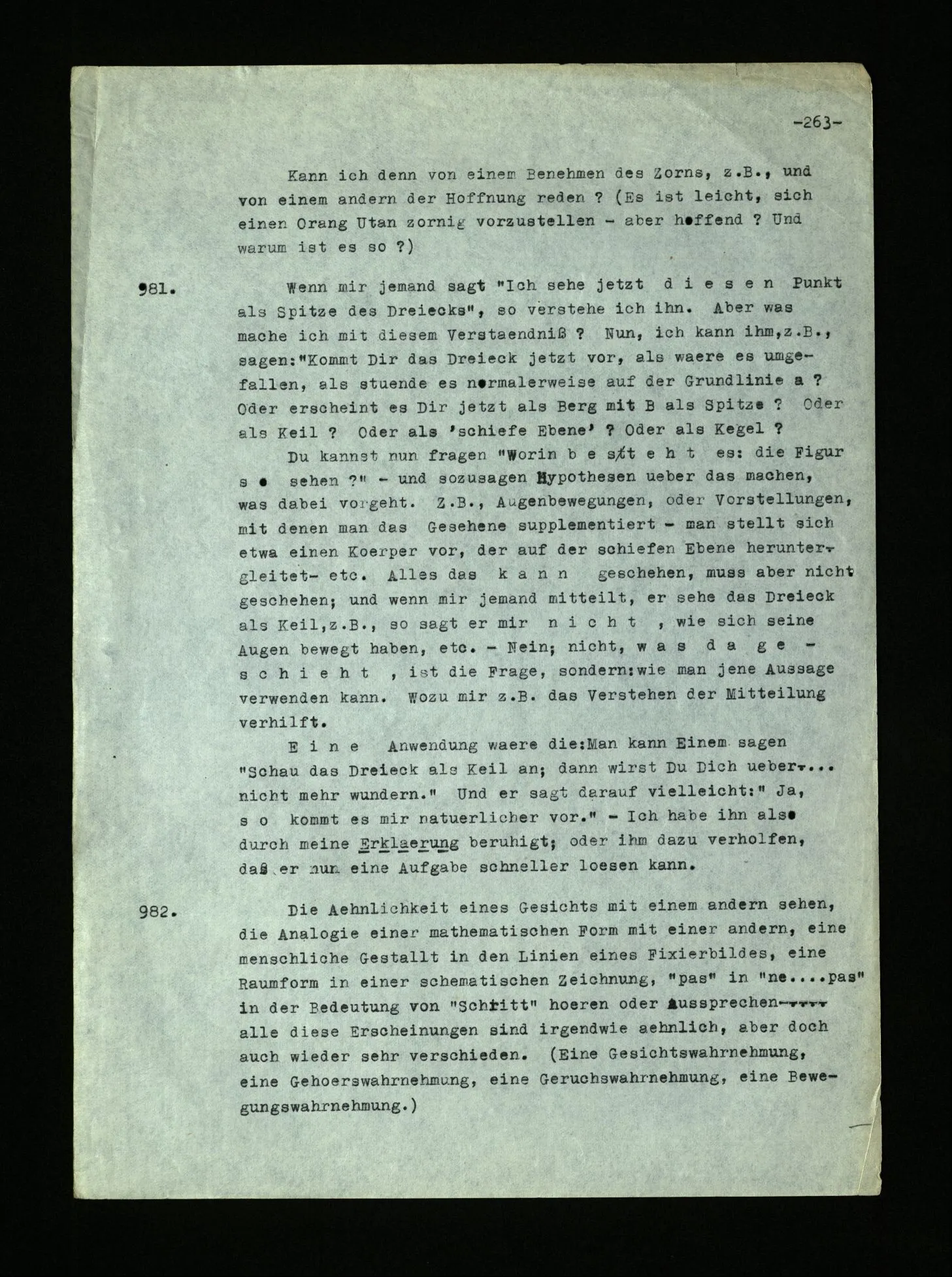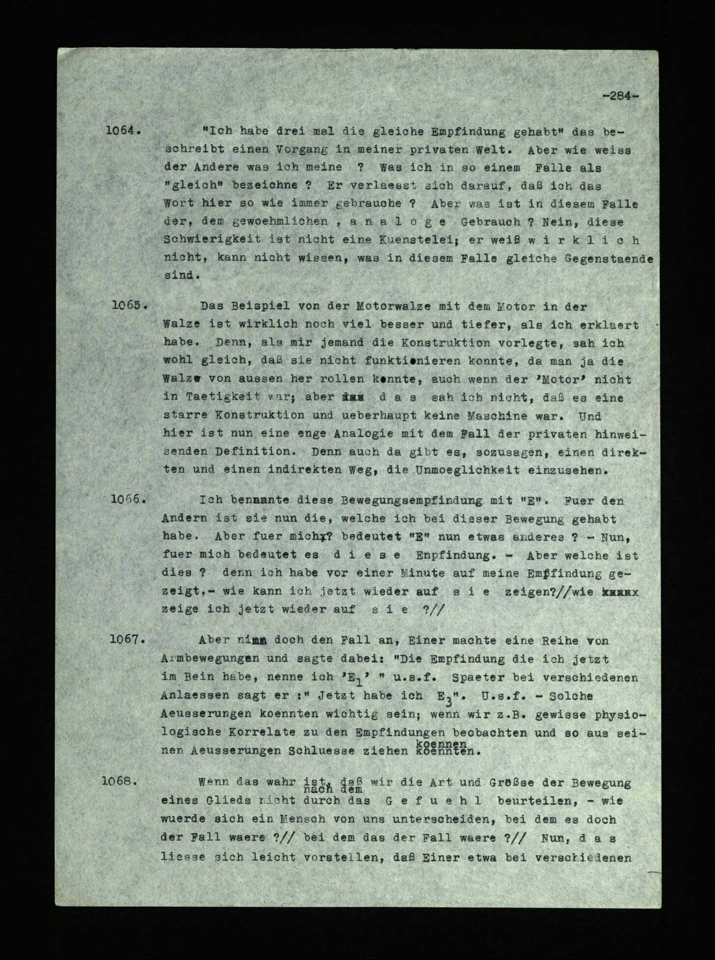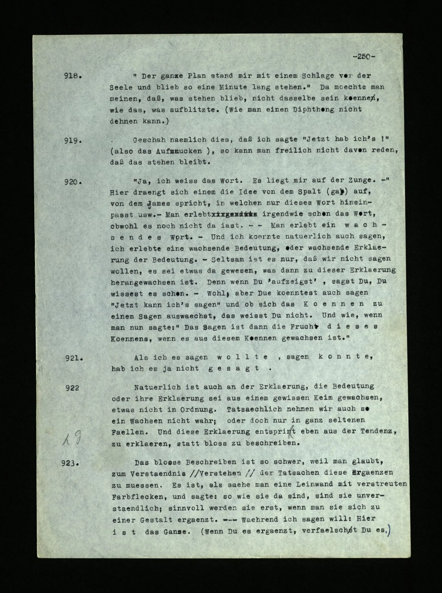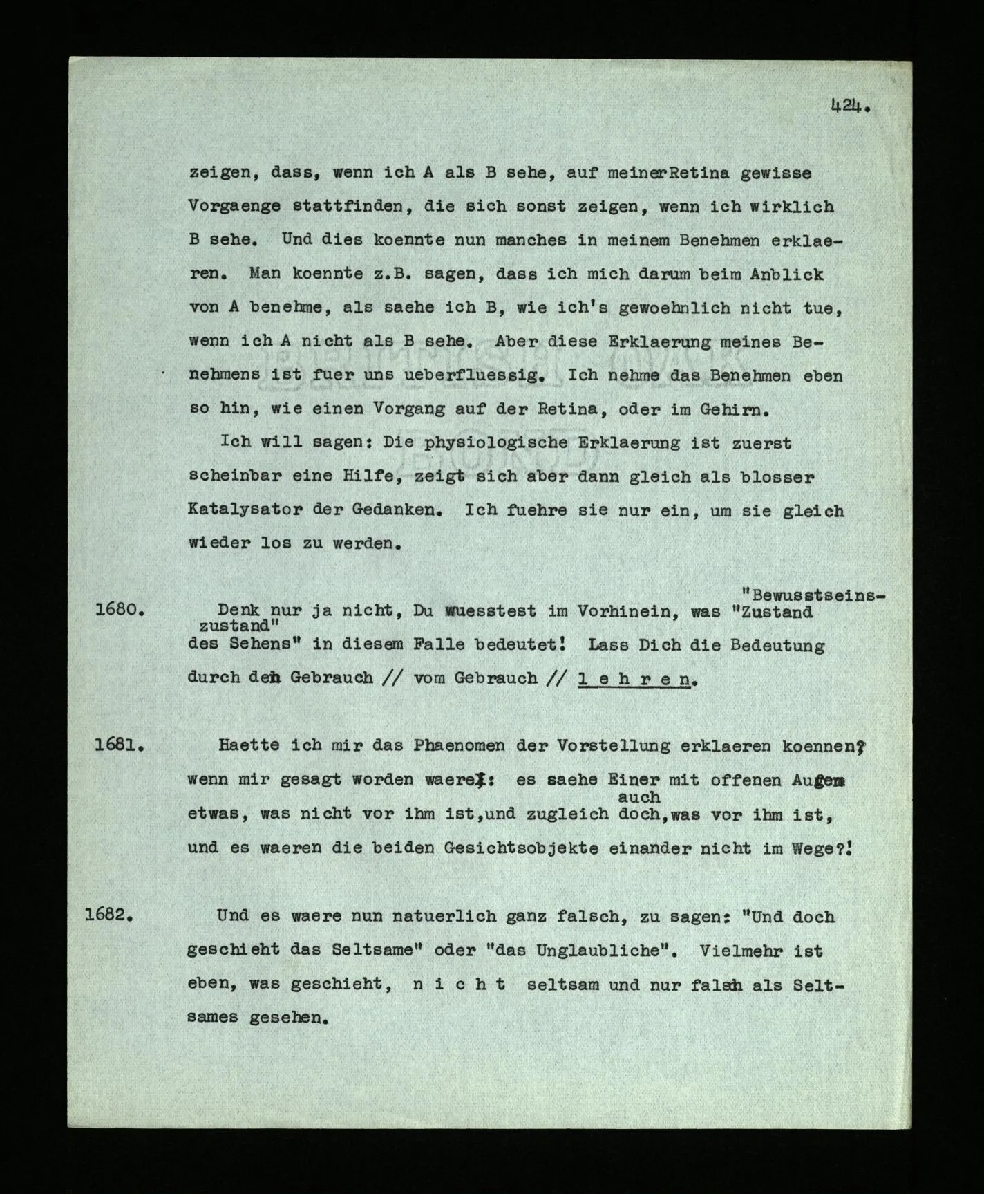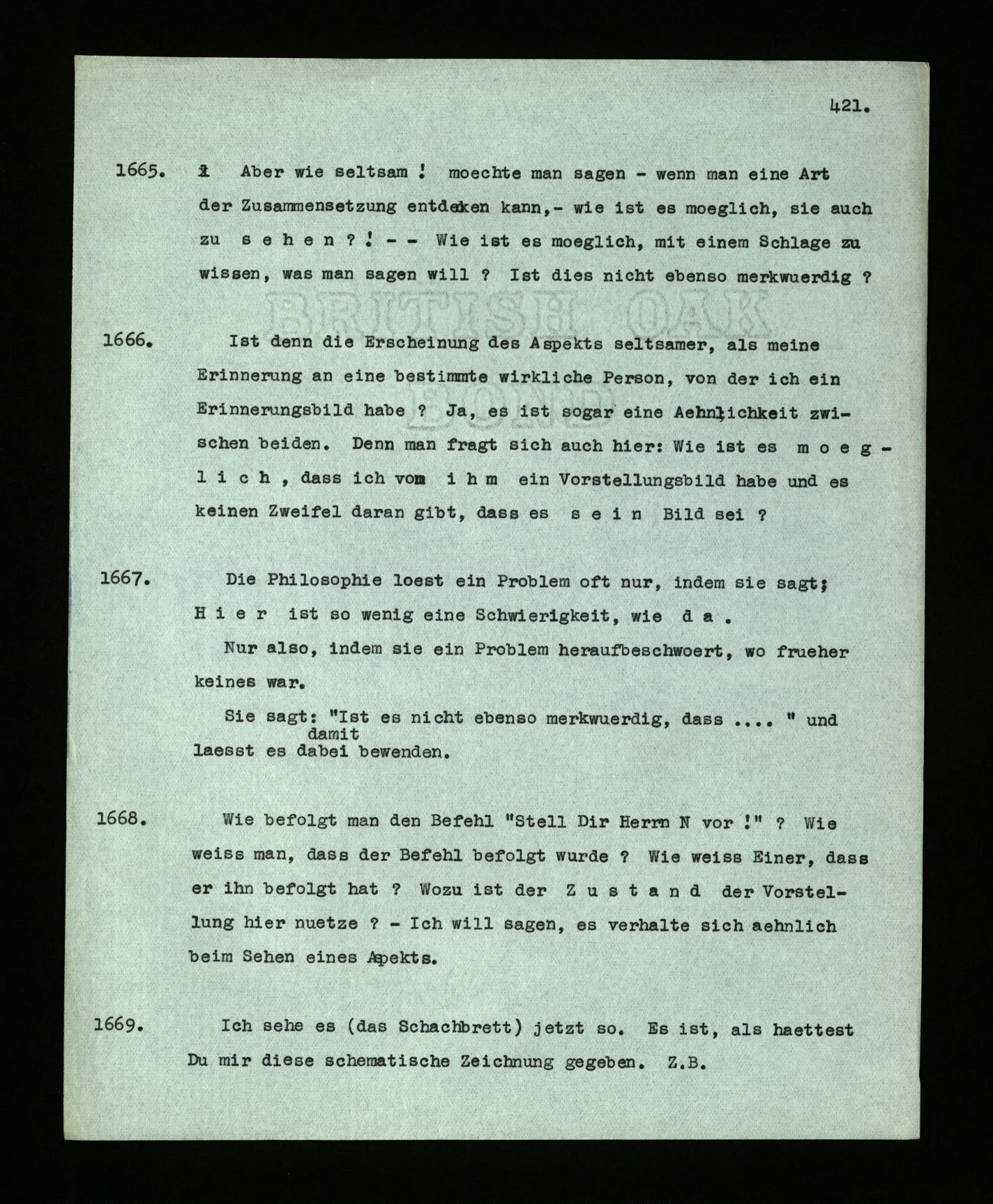 1774. Wenn jemand sagt: Die Form, die Farbe, die Organisation, der Ausdruck, sind doch alle, offenbar, (für jeden Unvoreingenommenen) Eigenschaften, Züge, des subjektiv Gesehenen, des unmittelbaren Gesichtsobjekts, – so verrät ihn hier das Wort “offenbar”. “Offenbar” ist es darum, weil’s Jeder zugibt; und er gibt es nur durch den Sprachgebrauch zu. Man begründet also hier einen Satz durch ein Bild.
