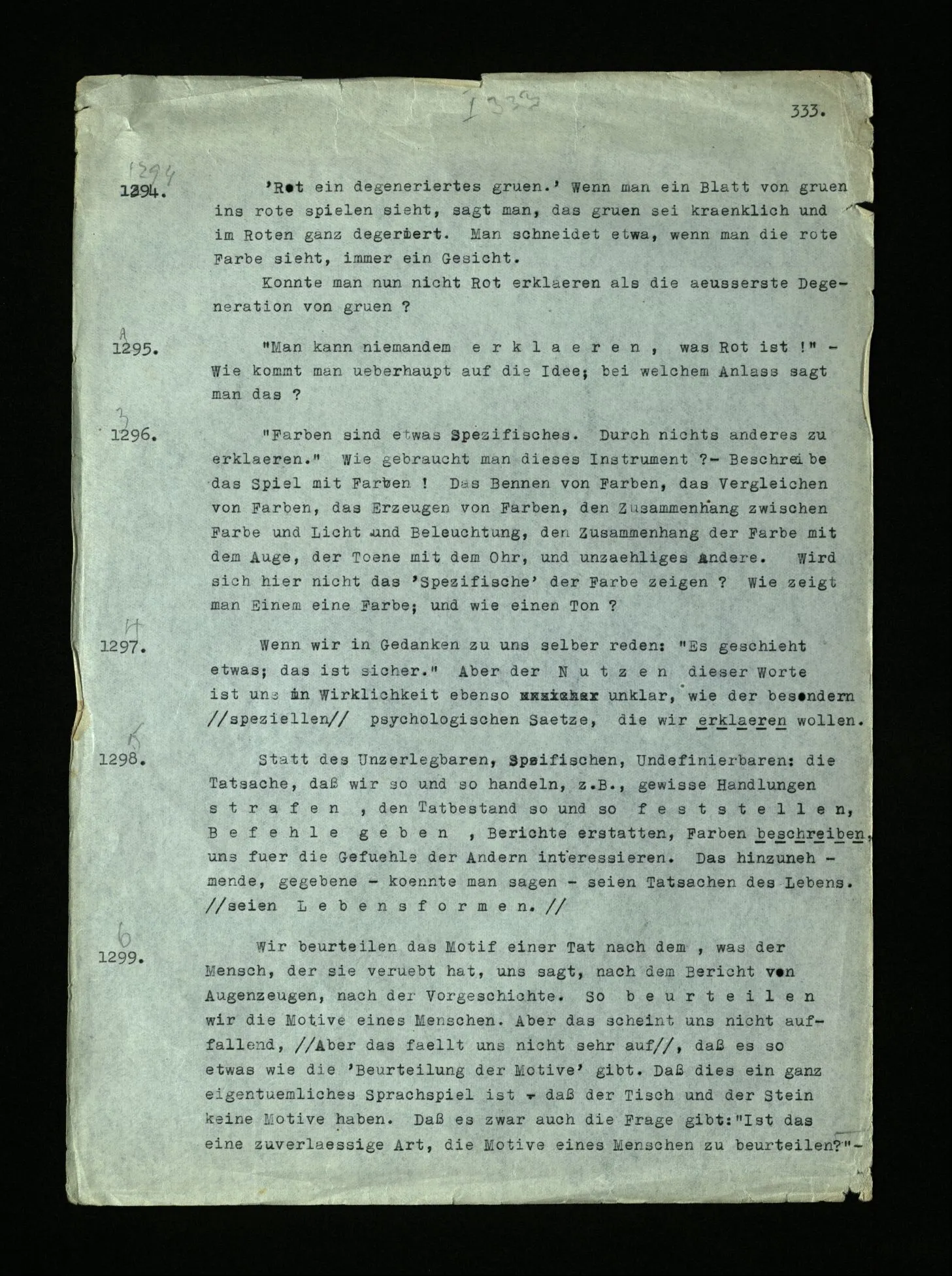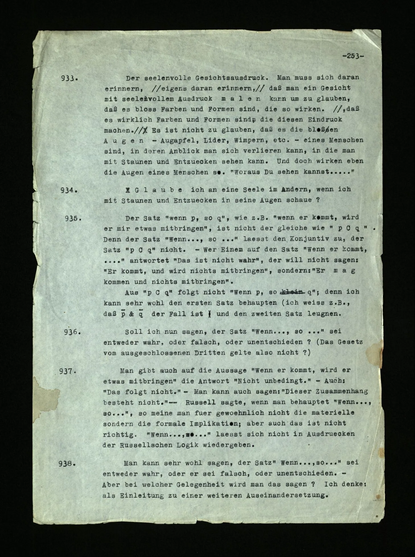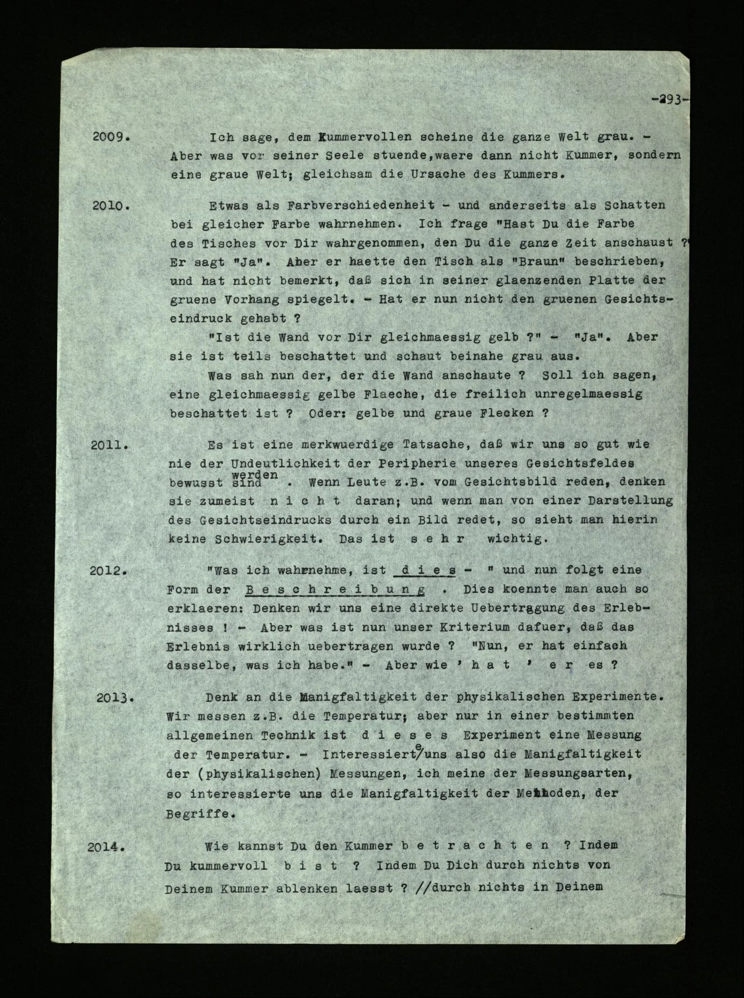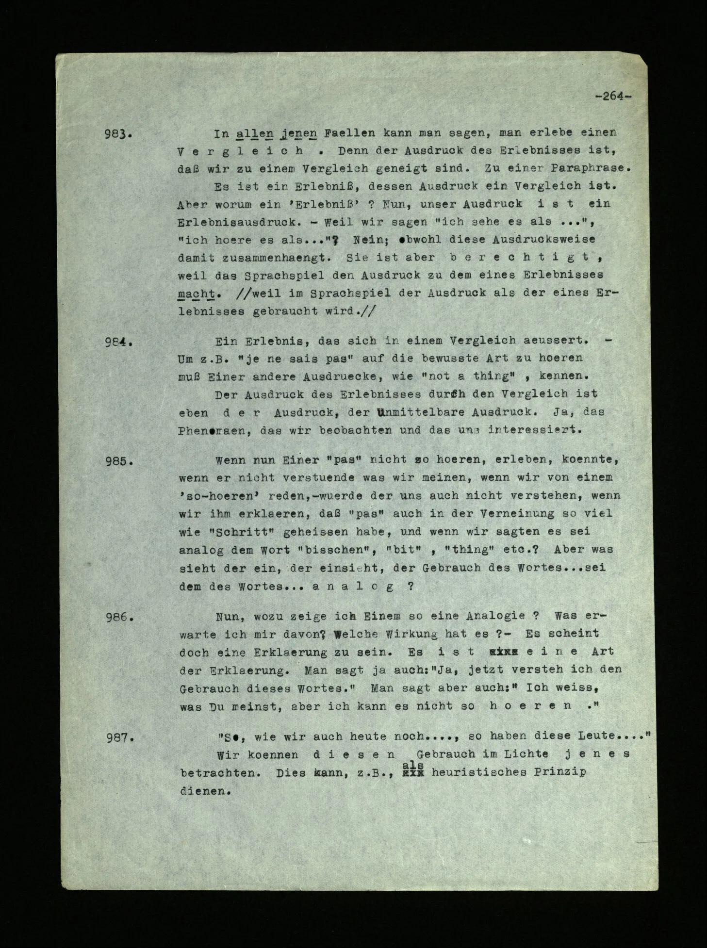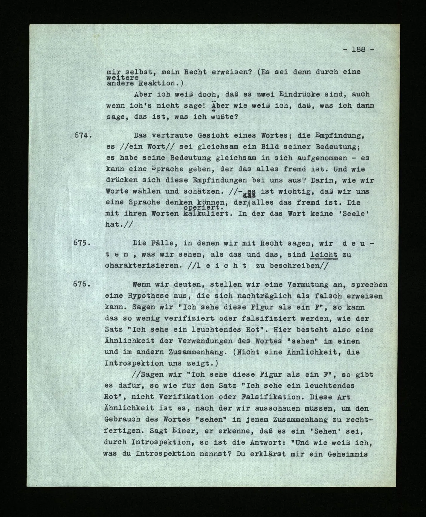 1774. Wenn jemand sagt: Die Form, die Farbe, die Organisation, der Ausdruck, sind doch alle, offenbar, (für jeden Unvoreingenommenen) Eigenschaften, Züge, des subjektiv Gesehenen, des unmittelbaren Gesichtsobjekts, – so verrät ihn hier das Wort “offenbar”. “Offenbar” ist es darum, weil’s Jeder zugibt; und er gibt es nur durch den Sprachgebrauch zu. Man begründet also hier einen Satz durch ein Bild.