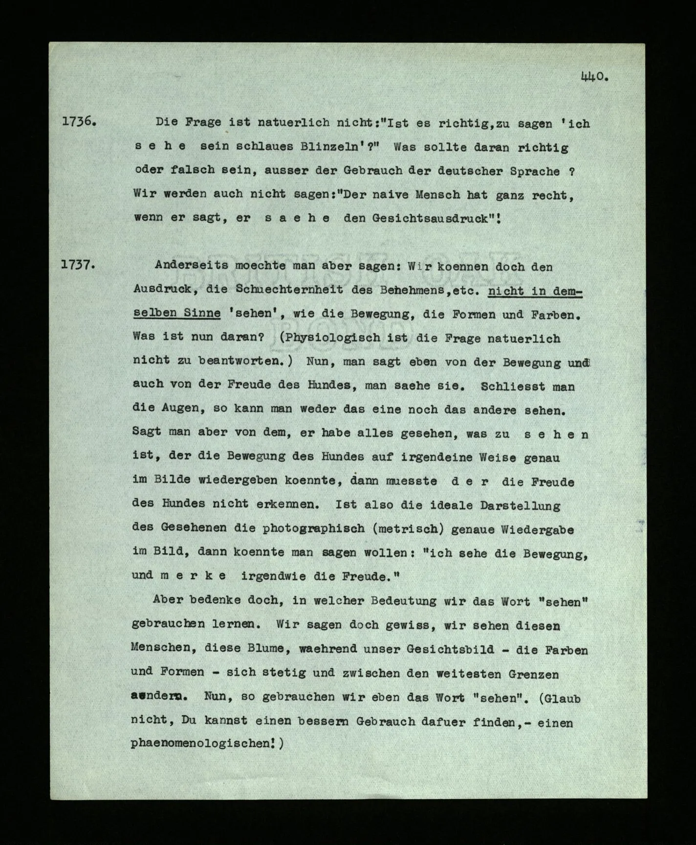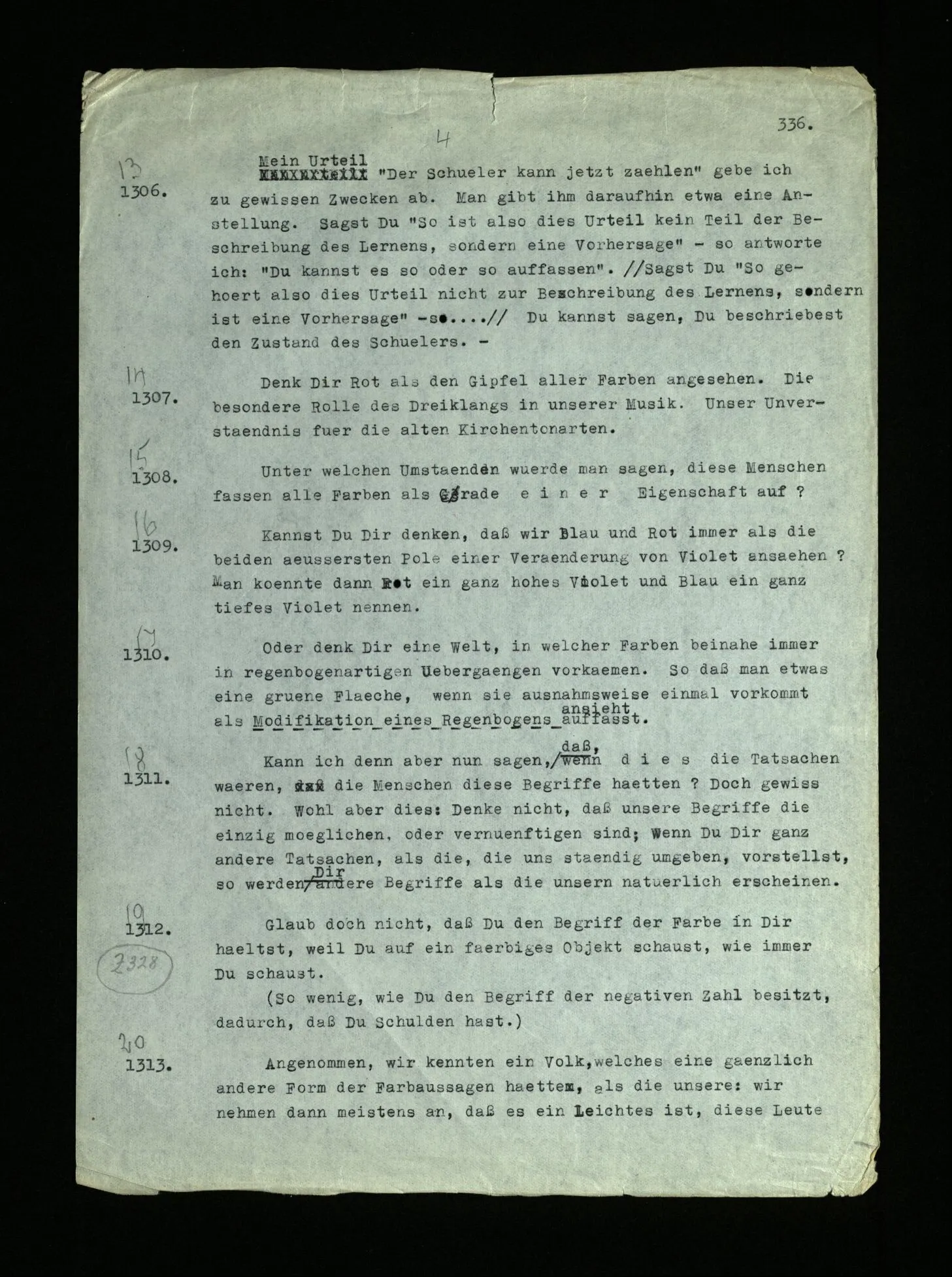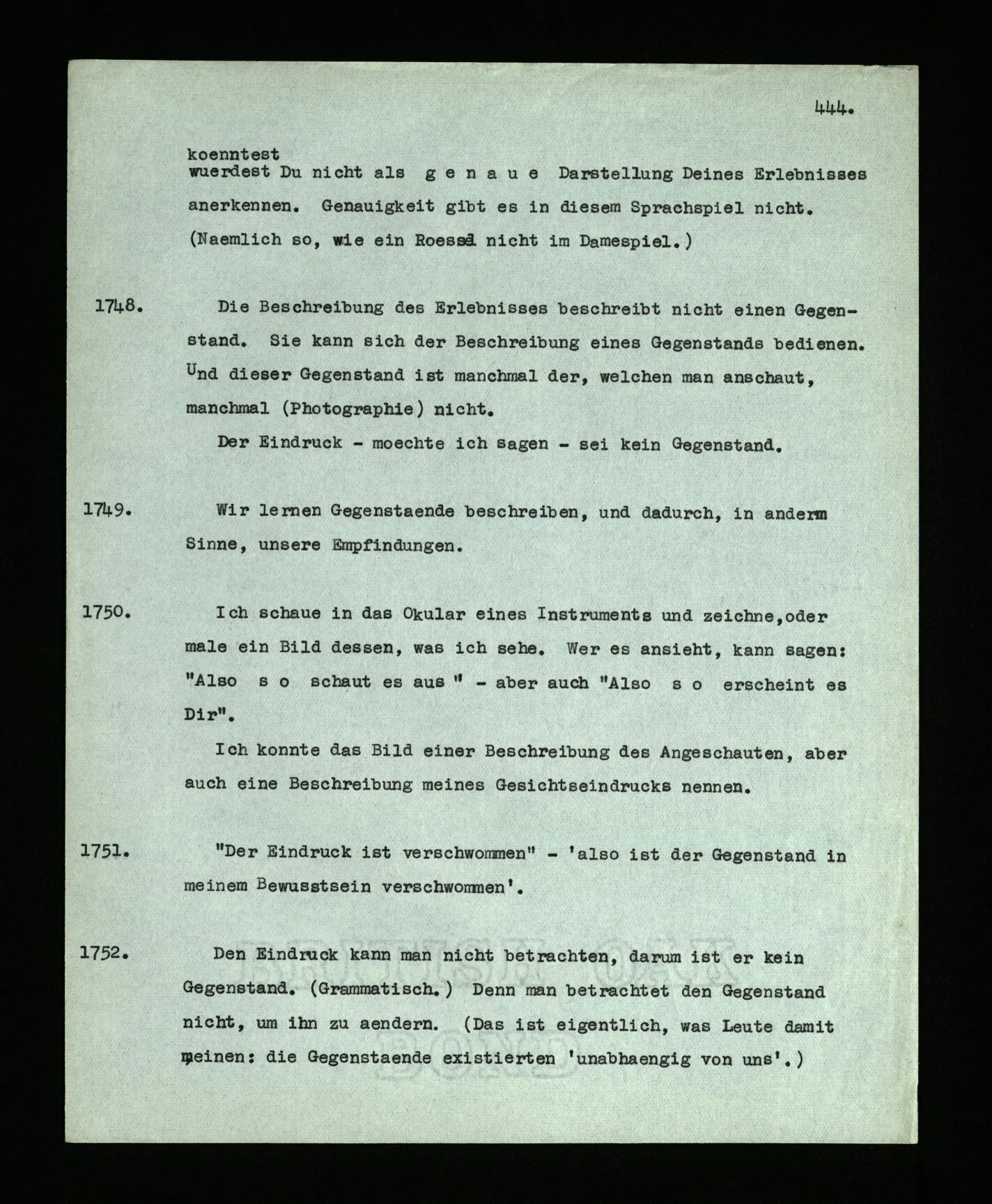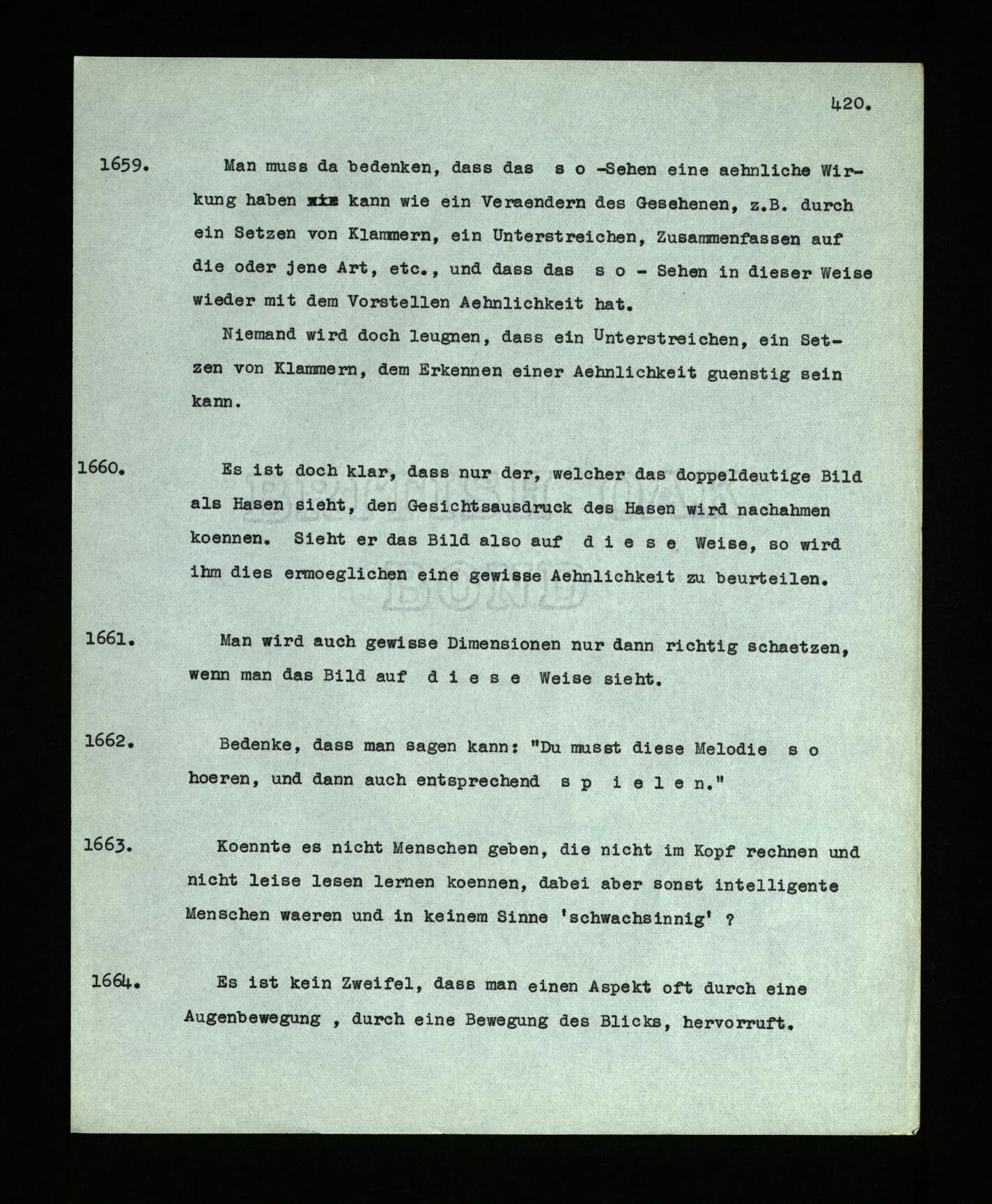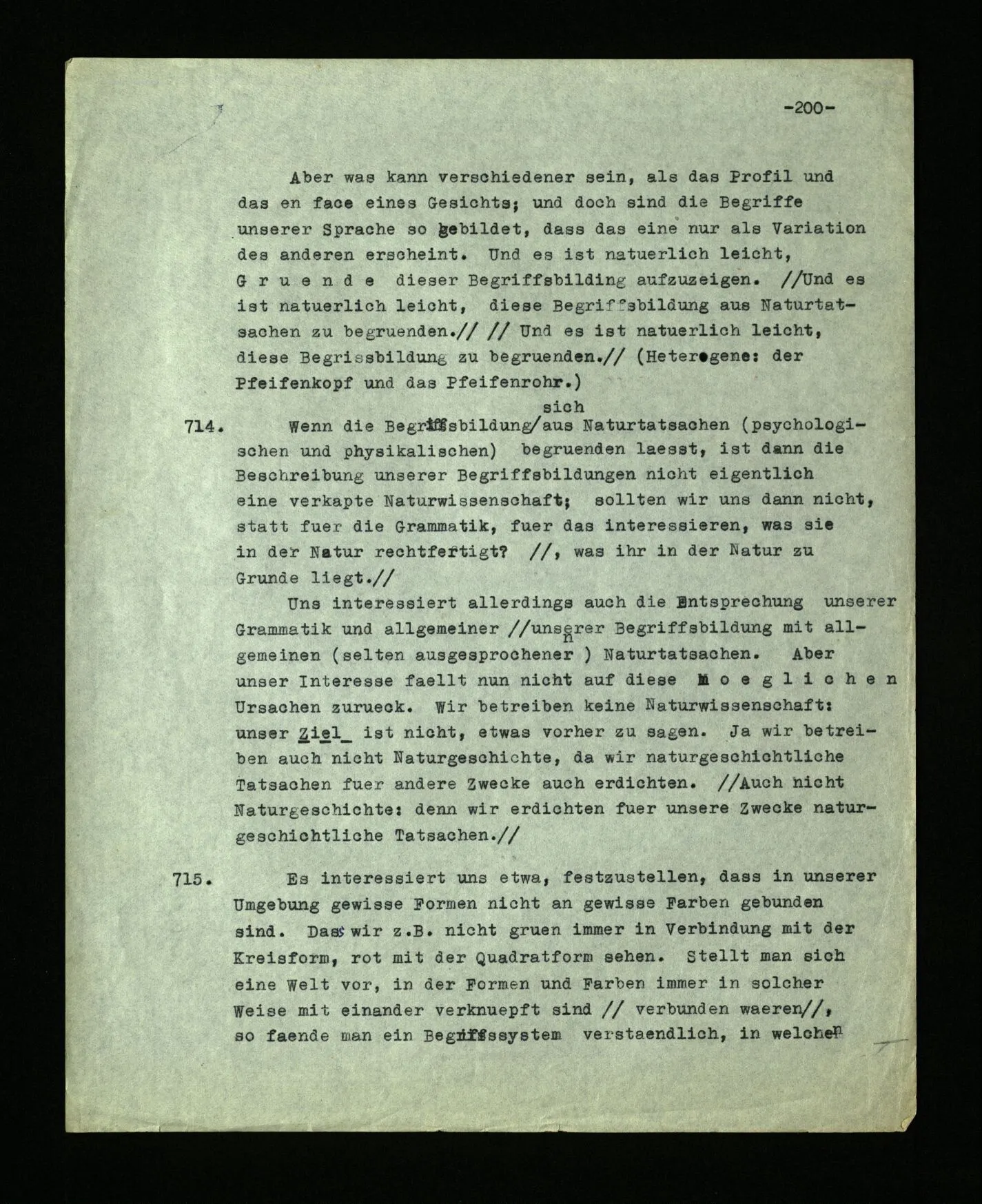 1774. Wenn jemand sagt: Die Form, die Farbe, die Organisation, der Ausdruck, sind doch alle, offenbar, (für jeden Unvoreingenommenen) Eigenschaften, Züge, des subjektiv Gesehenen, des unmittelbaren Gesichtsobjekts, – so verrät ihn hier das Wort “offenbar”. “Offenbar” ist es darum, weil’s Jeder zugibt; und er gibt es nur durch den Sprachgebrauch zu. Man begründet also hier einen Satz durch ein Bild.