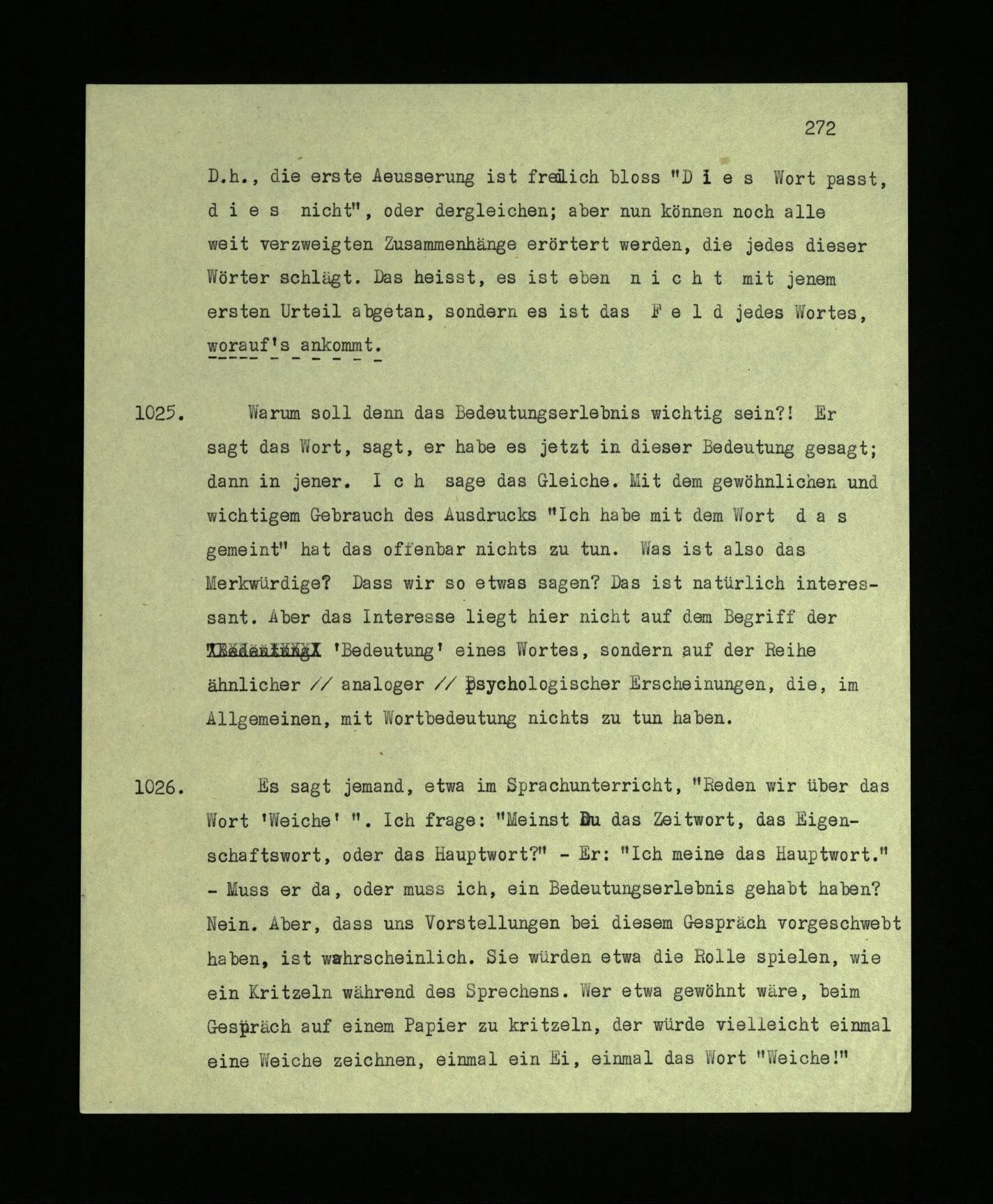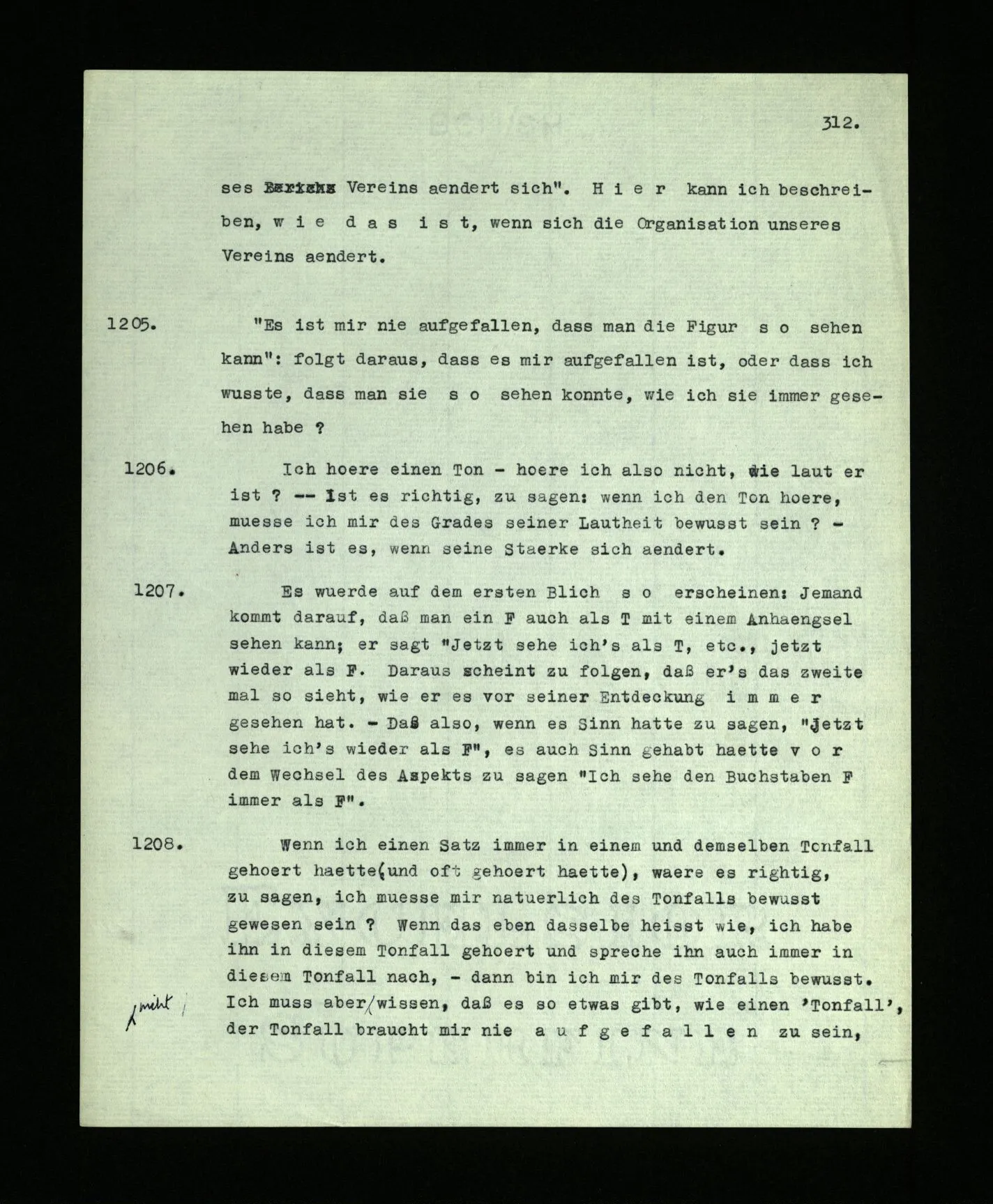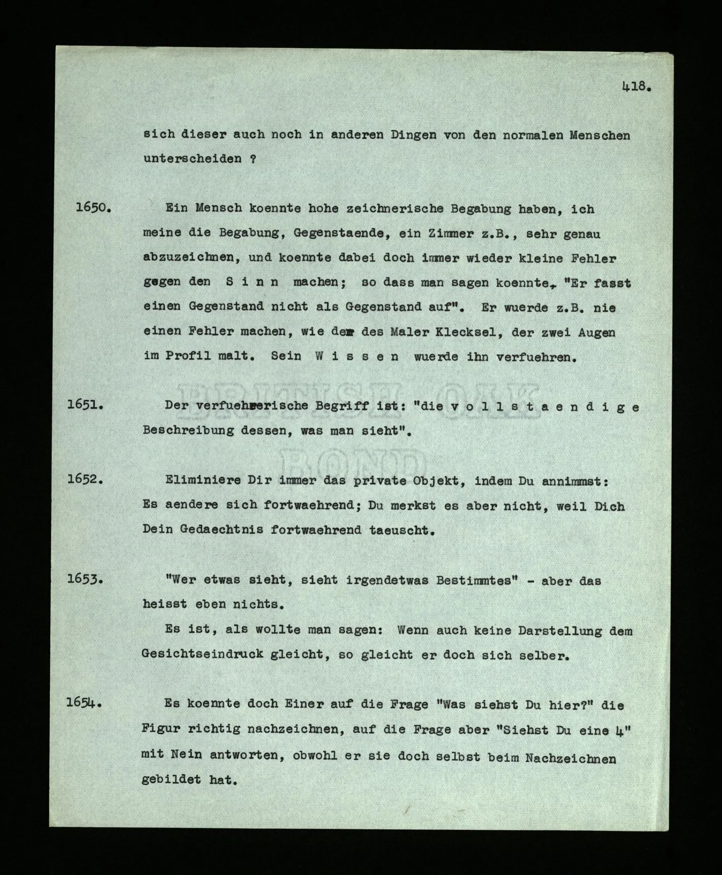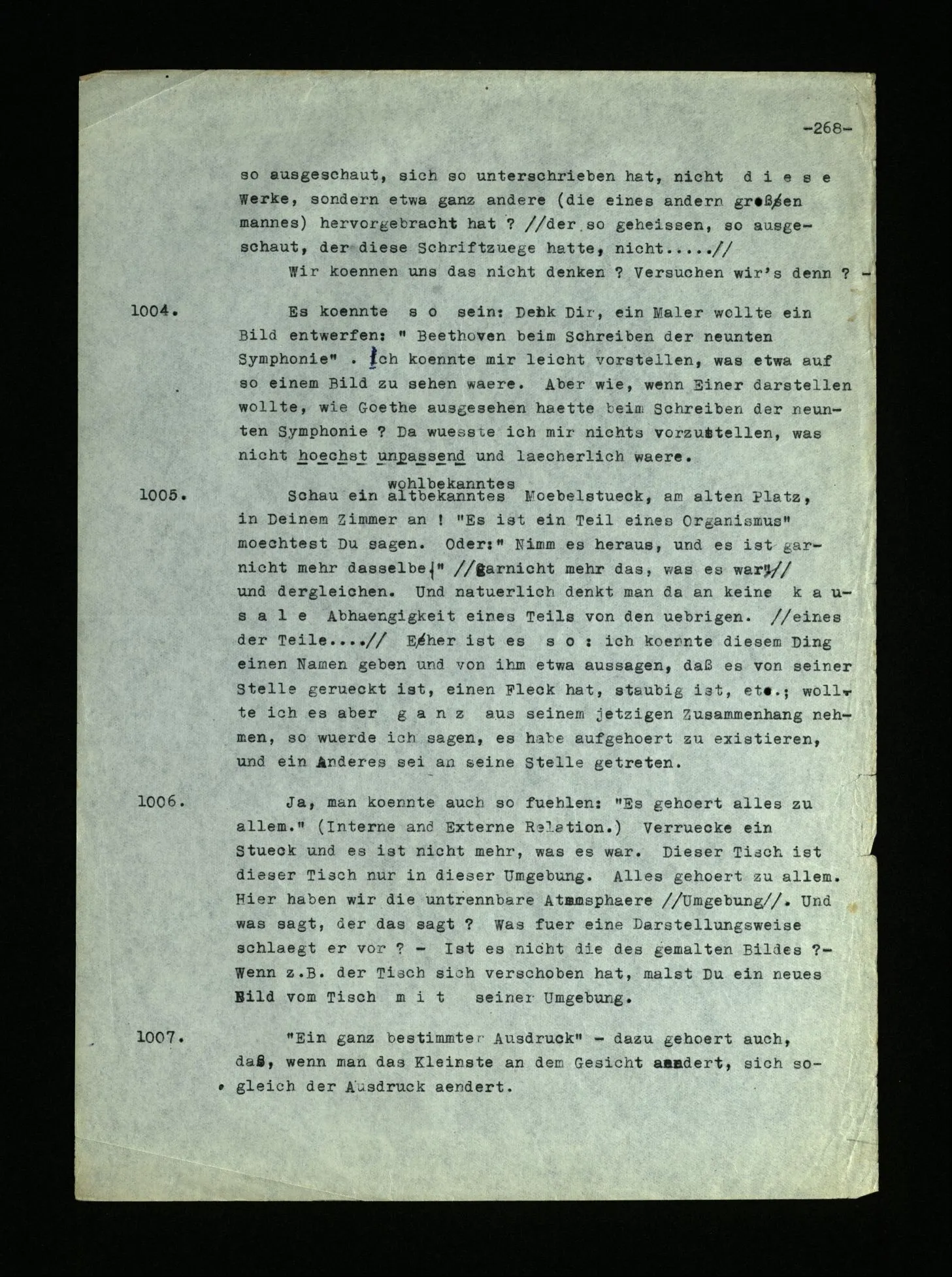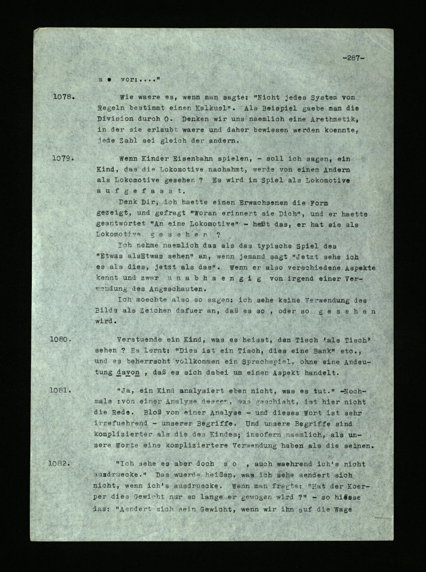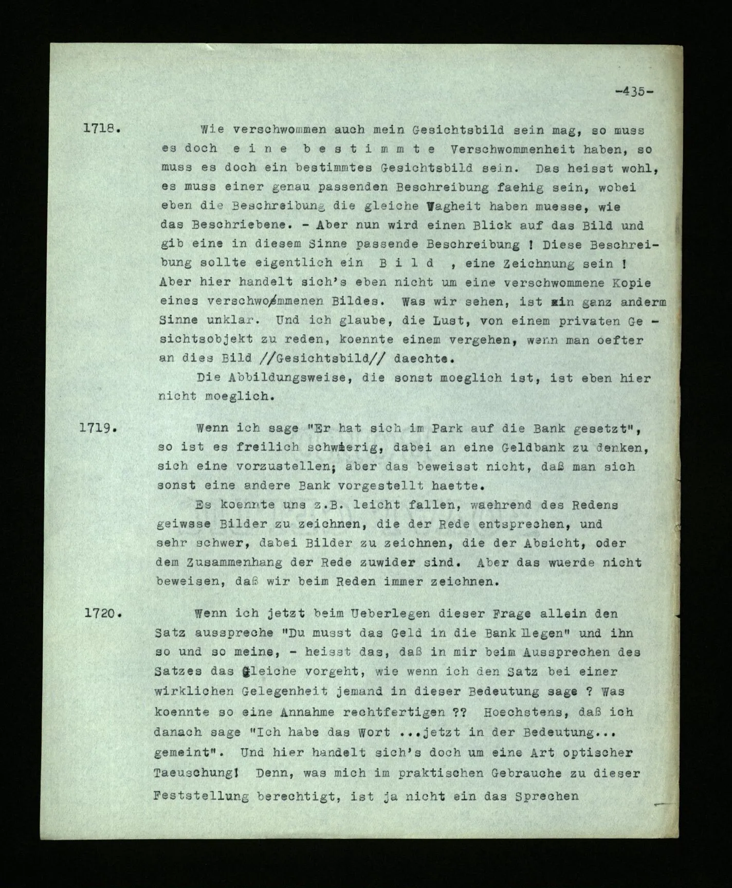 1774. Wenn jemand sagt: Die Form, die Farbe, die Organisation, der Ausdruck, sind doch alle, offenbar, (für jeden Unvoreingenommenen) Eigenschaften, Züge, des subjektiv Gesehenen, des unmittelbaren Gesichtsobjekts, – so verrät ihn hier das Wort “offenbar”. “Offenbar” ist es darum, weil’s Jeder zugibt; und er gibt es nur durch den Sprachgebrauch zu. Man begründet also hier einen Satz durch ein Bild.