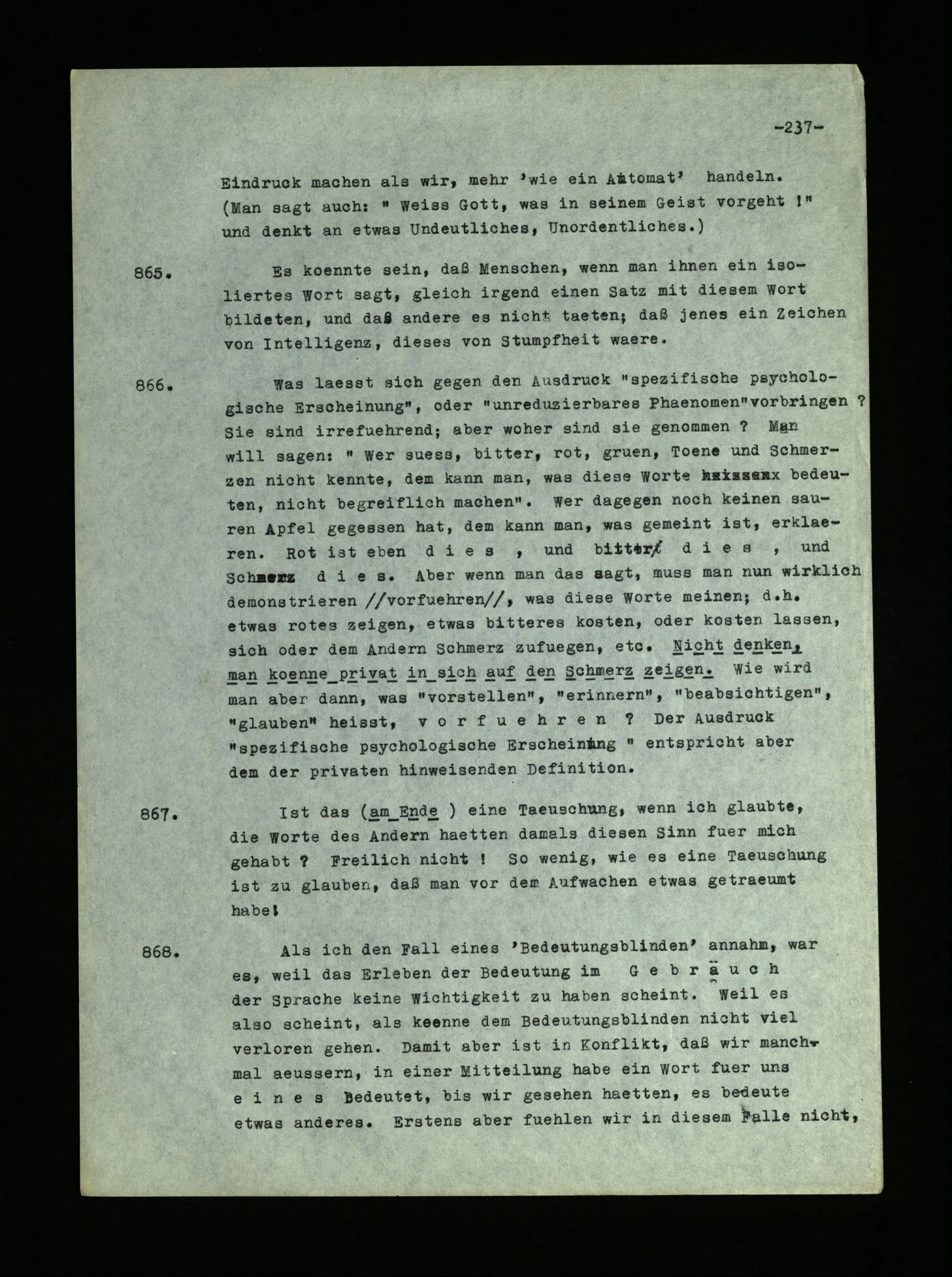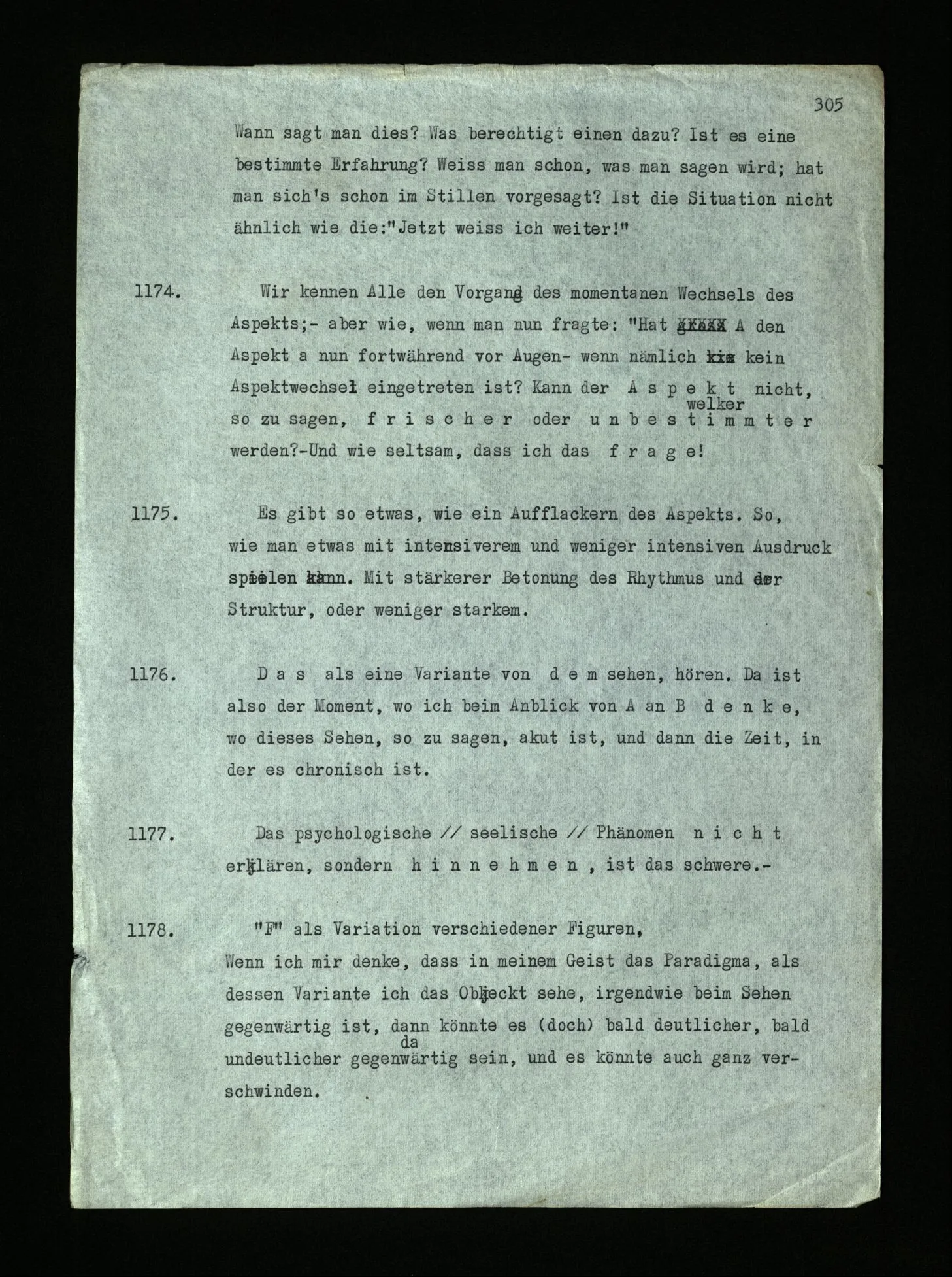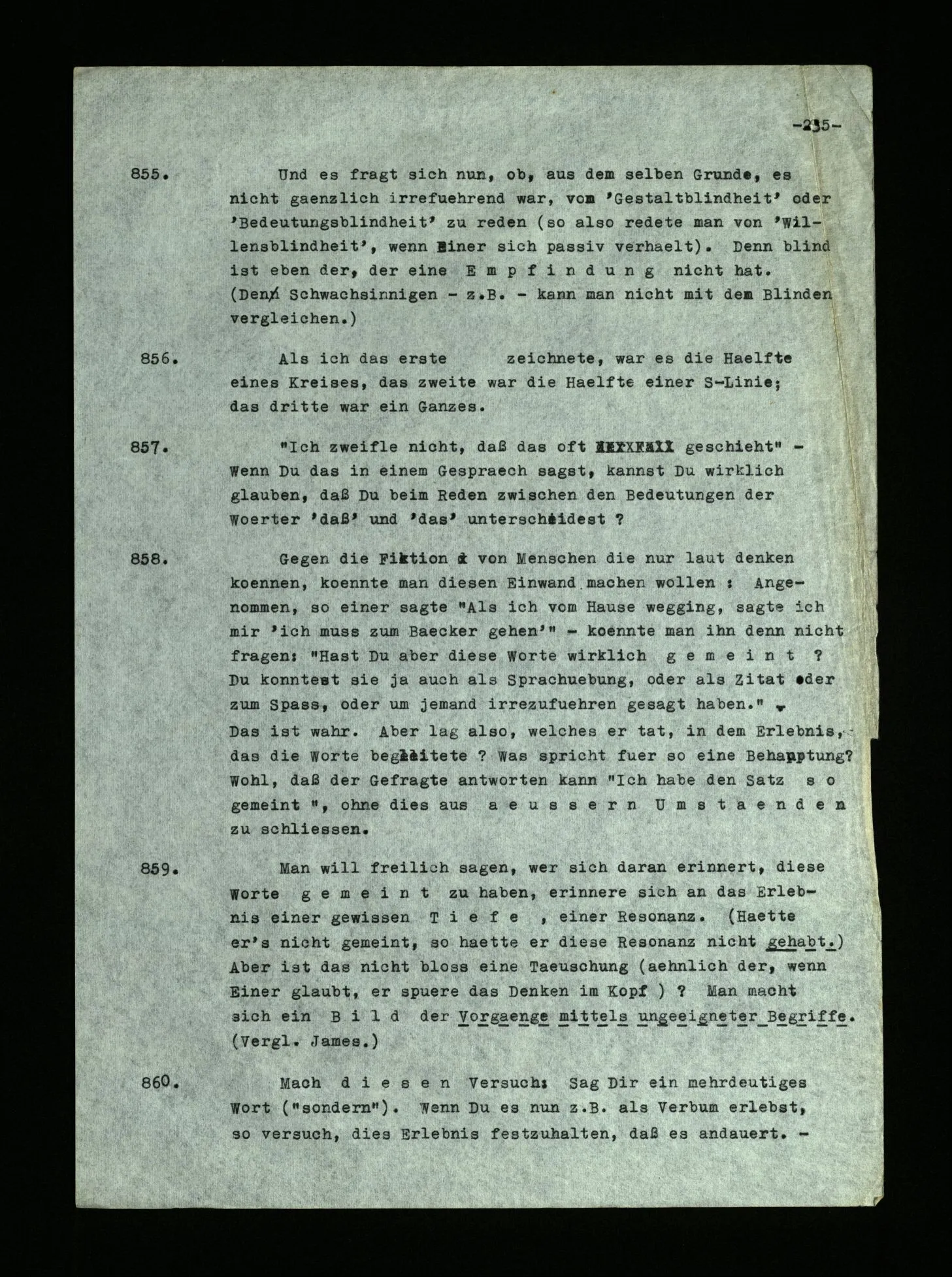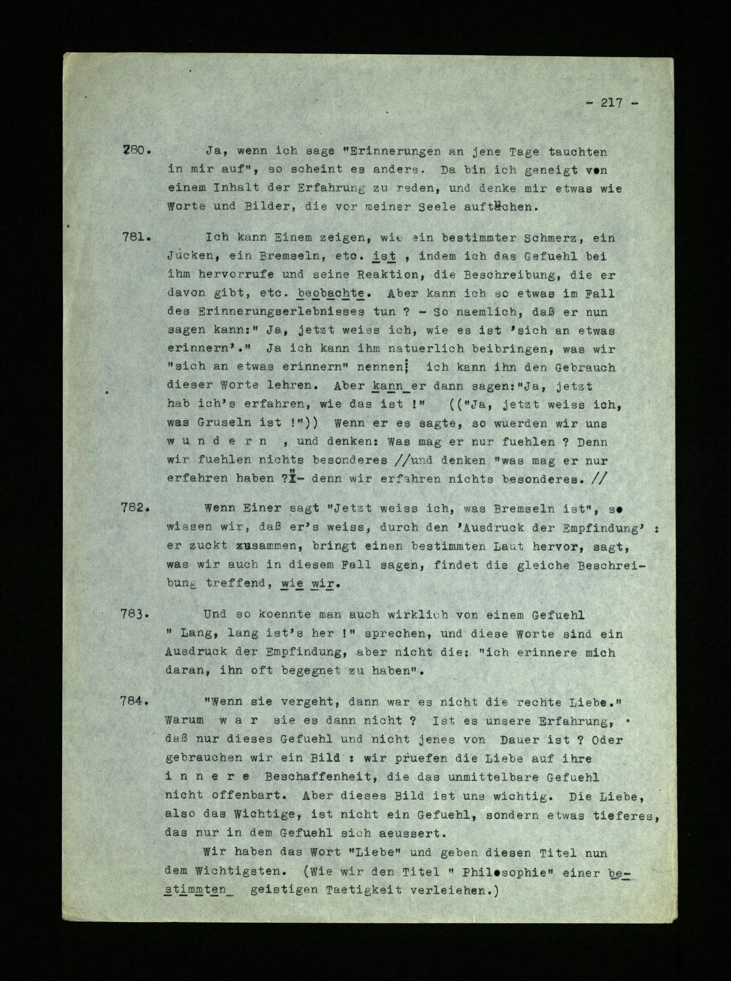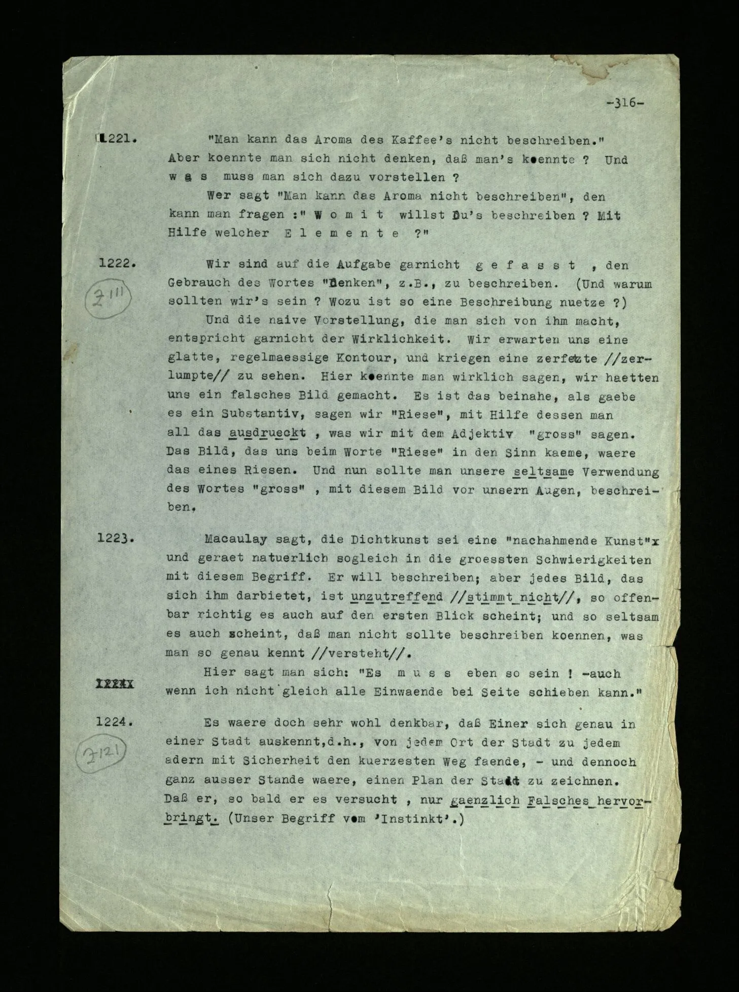 1774. Wenn jemand sagt: Die Form, die Farbe, die Organisation, der Ausdruck, sind doch alle, offenbar, (für jeden Unvoreingenommenen) Eigenschaften, Züge, des subjektiv Gesehenen, des unmittelbaren Gesichtsobjekts, – so verrät ihn hier das Wort “offenbar”. “Offenbar” ist es darum, weil’s Jeder zugibt; und er gibt es nur durch den Sprachgebrauch zu. Man begründet also hier einen Satz durch ein Bild.