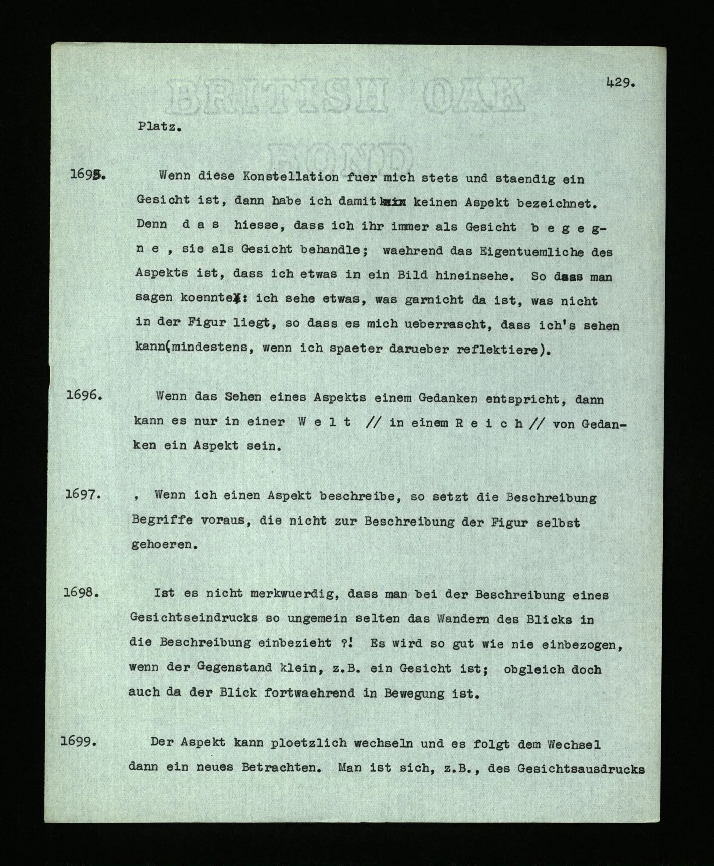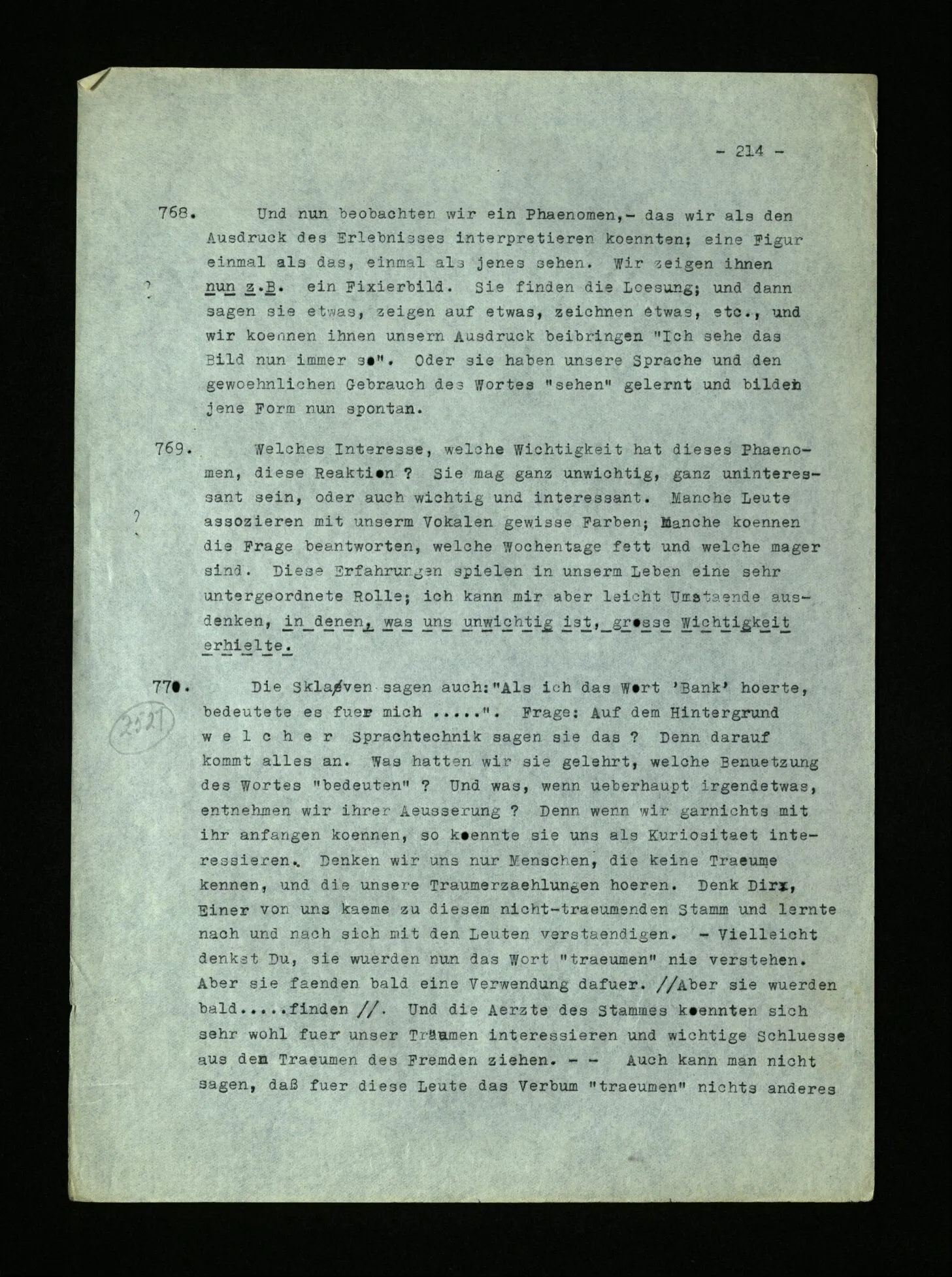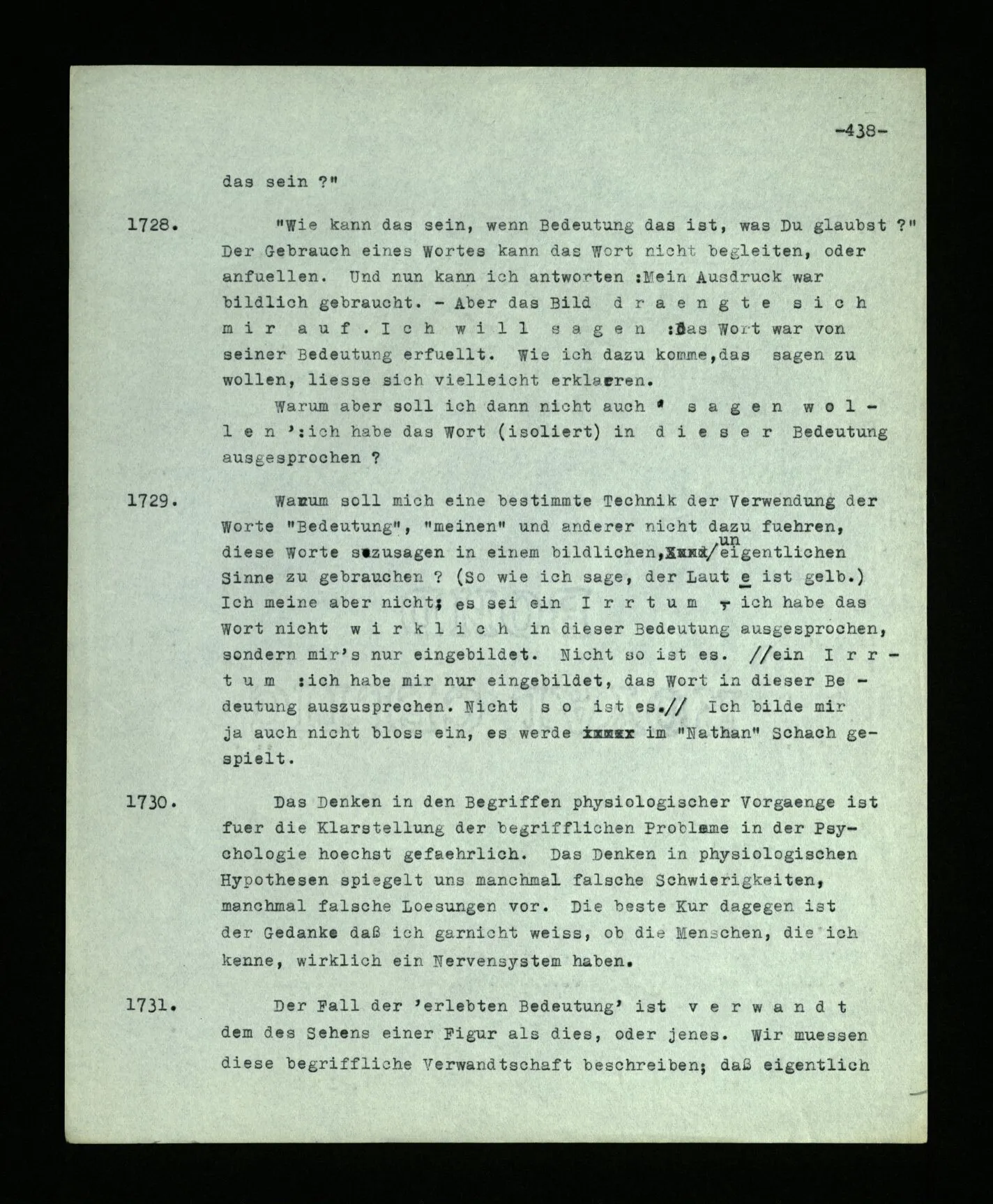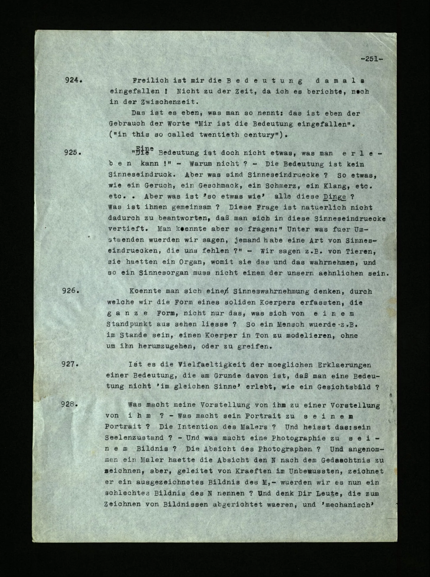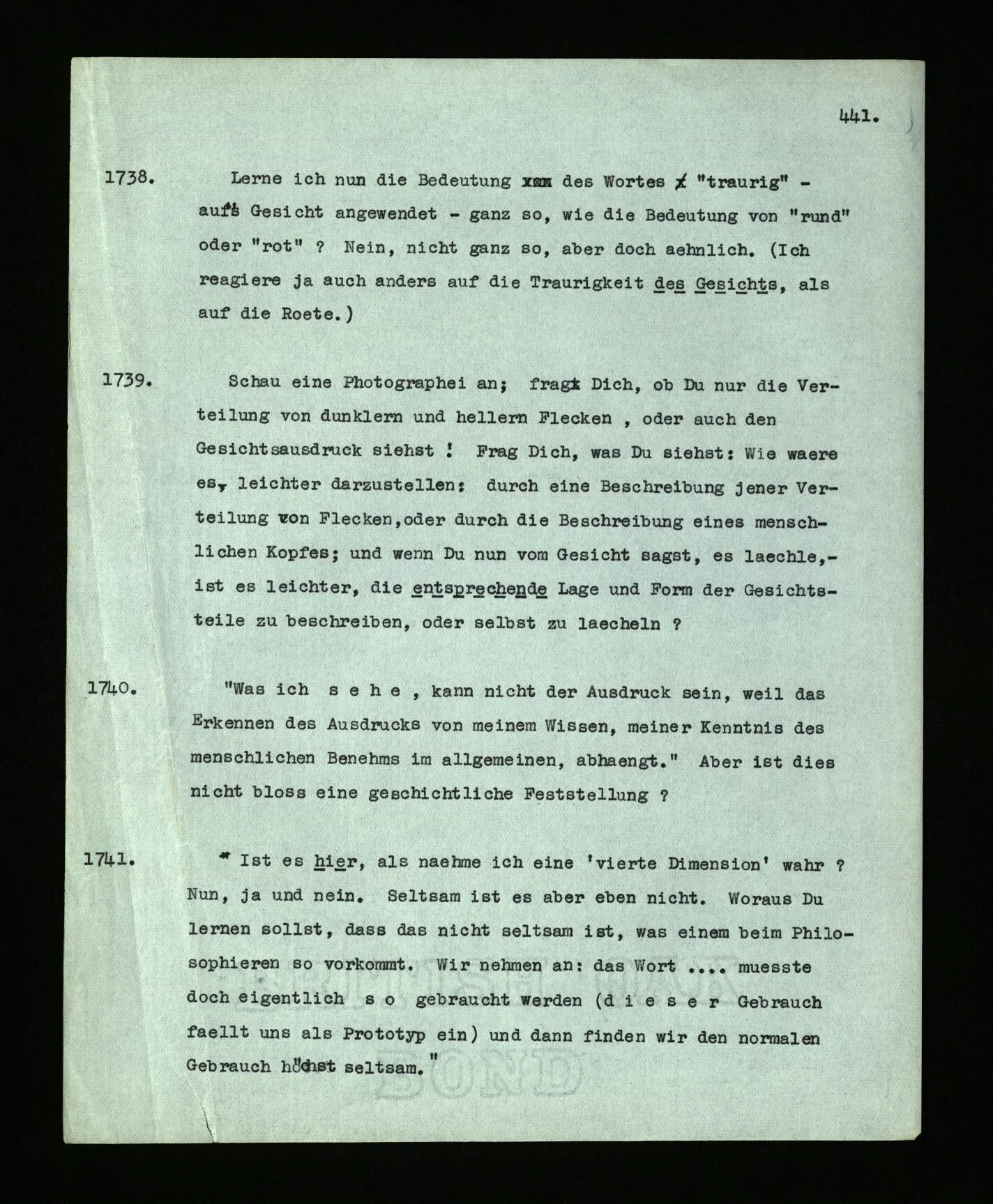 1774. Wenn jemand sagt: Die Form, die Farbe, die Organisation, der Ausdruck, sind doch alle, offenbar, (für jeden Unvoreingenommenen) Eigenschaften, Züge, des subjektiv Gesehenen, des unmittelbaren Gesichtsobjekts, – so verrät ihn hier das Wort “offenbar”. “Offenbar” ist es darum, weil’s Jeder zugibt; und er gibt es nur durch den Sprachgebrauch zu. Man begründet also hier einen Satz durch ein Bild.
