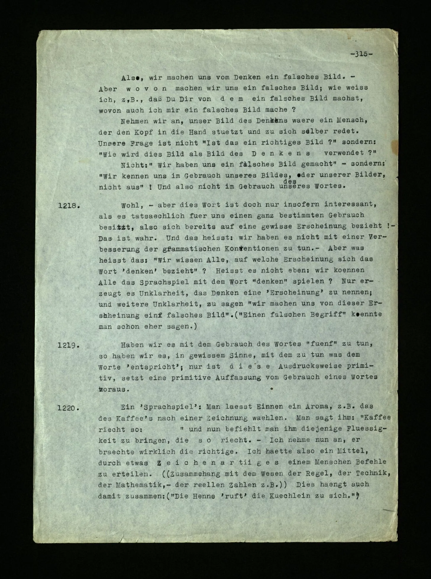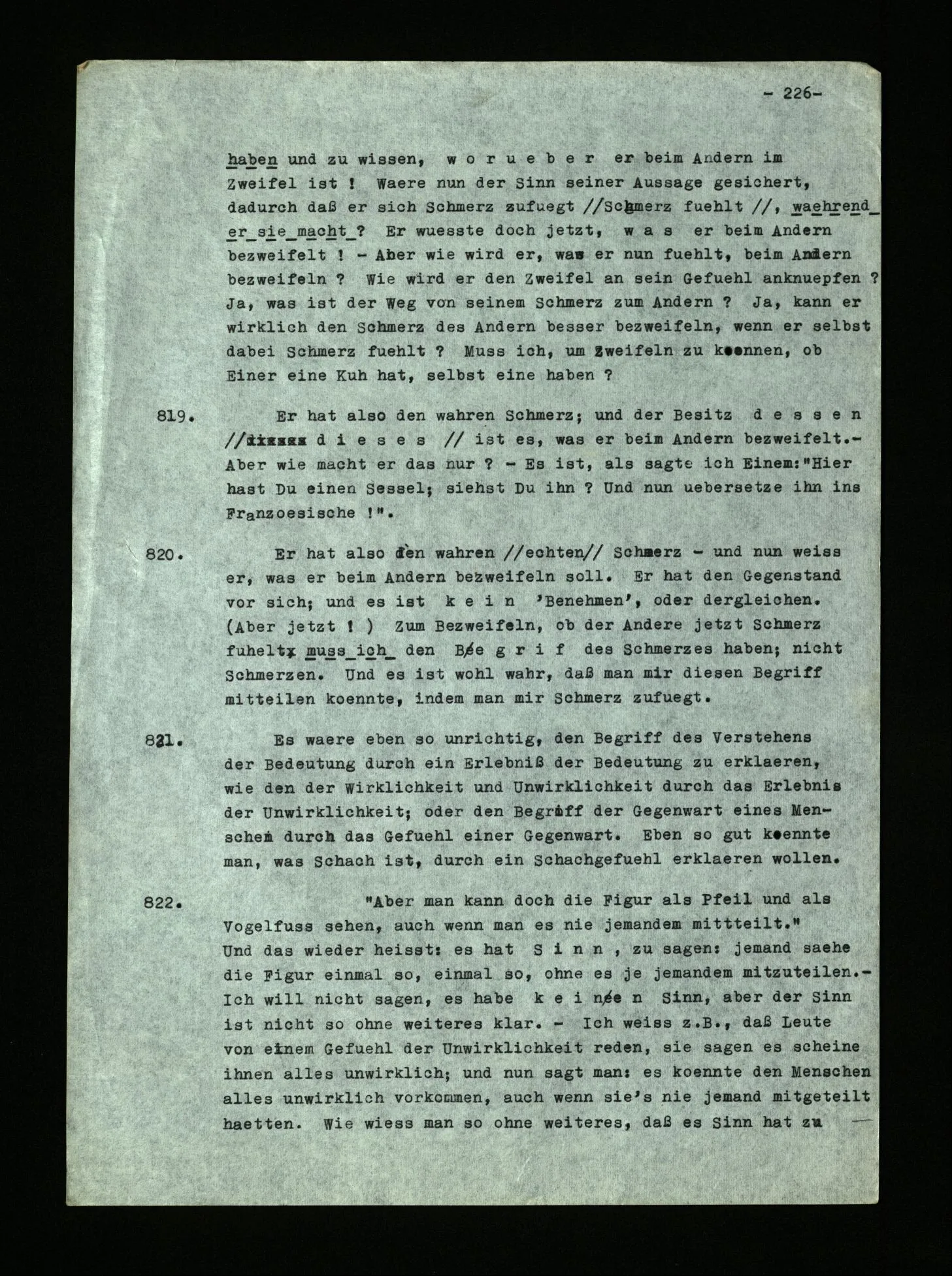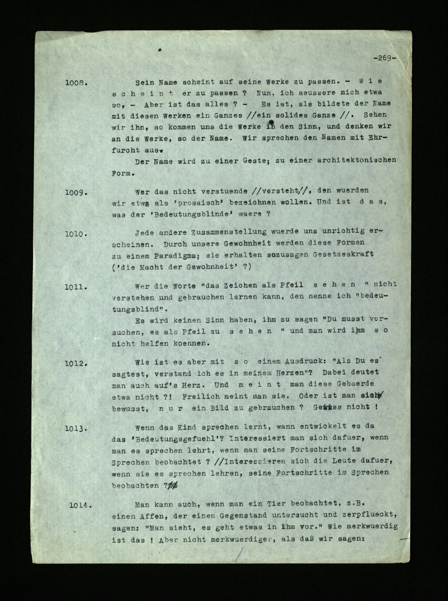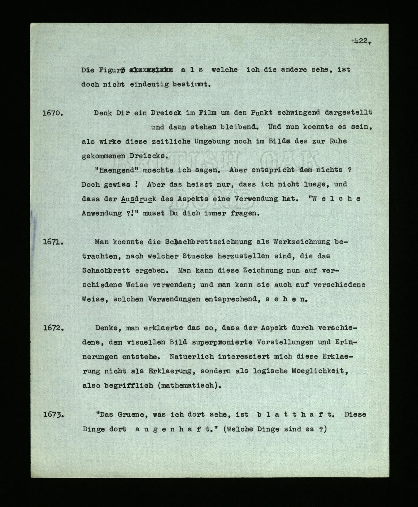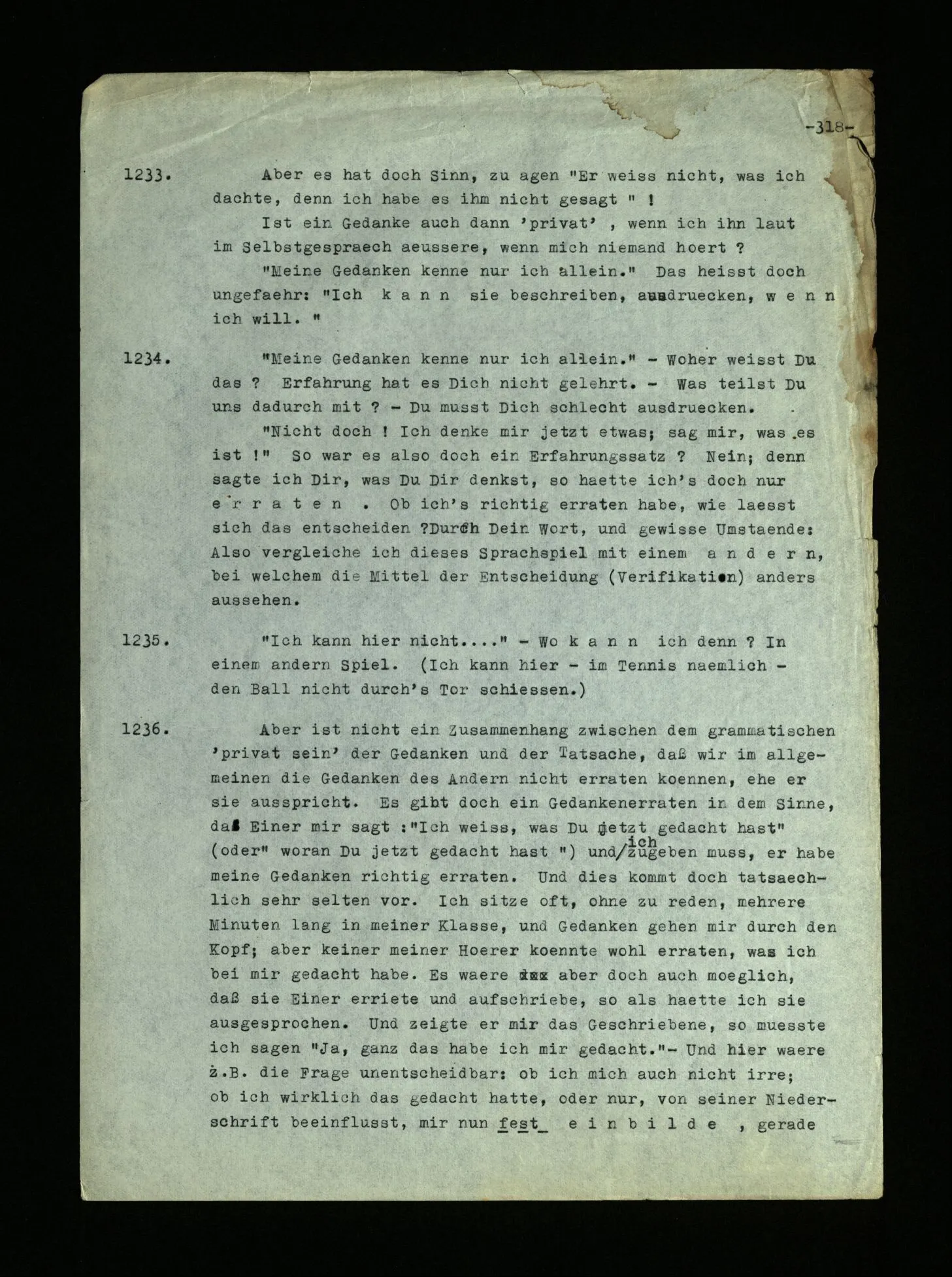 1774. Wenn jemand sagt: Die Form, die Farbe, die Organisation, der Ausdruck, sind doch alle, offenbar, (für jeden Unvoreingenommenen) Eigenschaften, Züge, des subjektiv Gesehenen, des unmittelbaren Gesichtsobjekts, – so verrät ihn hier das Wort “offenbar”. “Offenbar” ist es darum, weil’s Jeder zugibt; und er gibt es nur durch den Sprachgebrauch zu. Man begründet also hier einen Satz durch ein Bild.