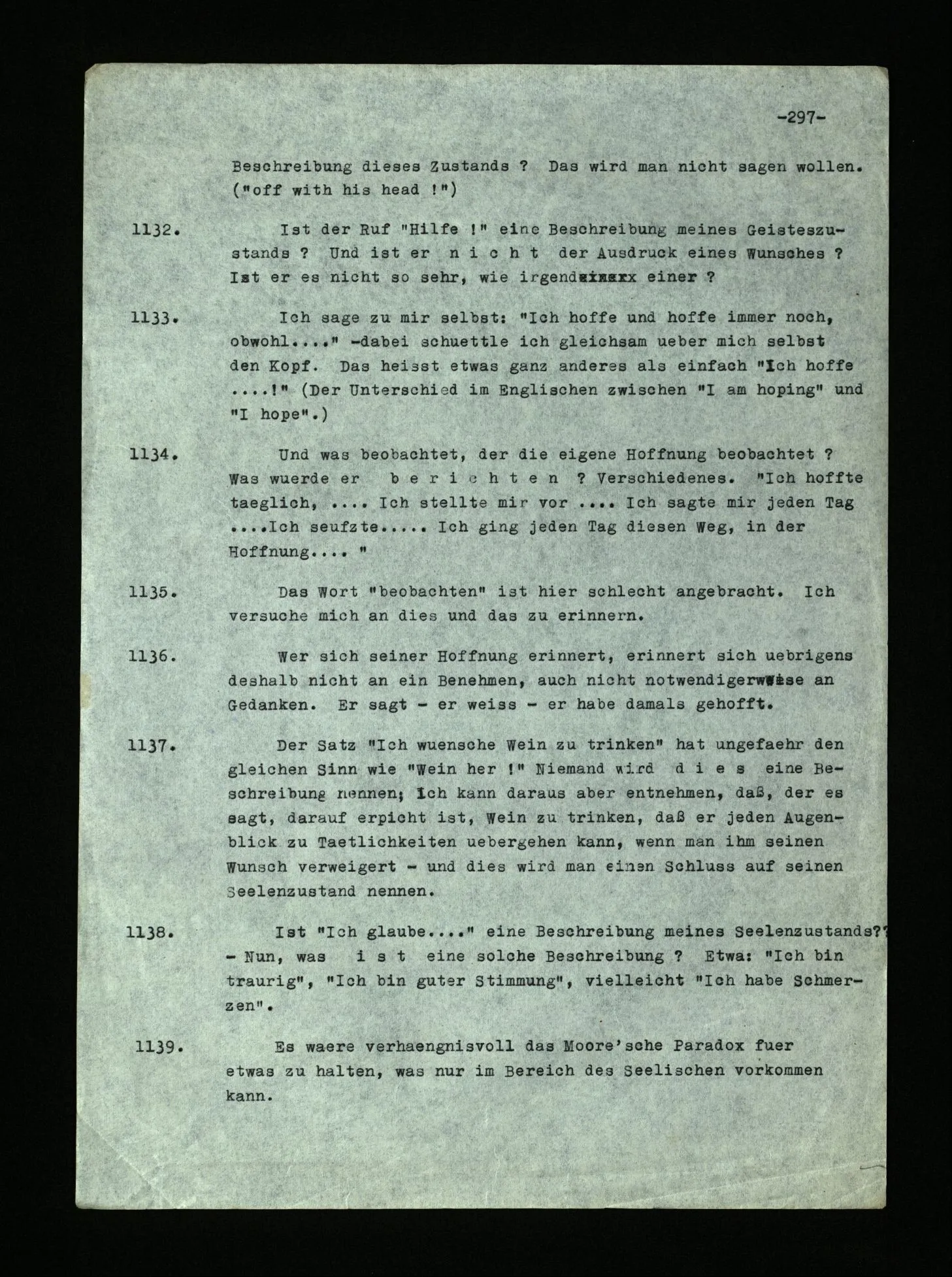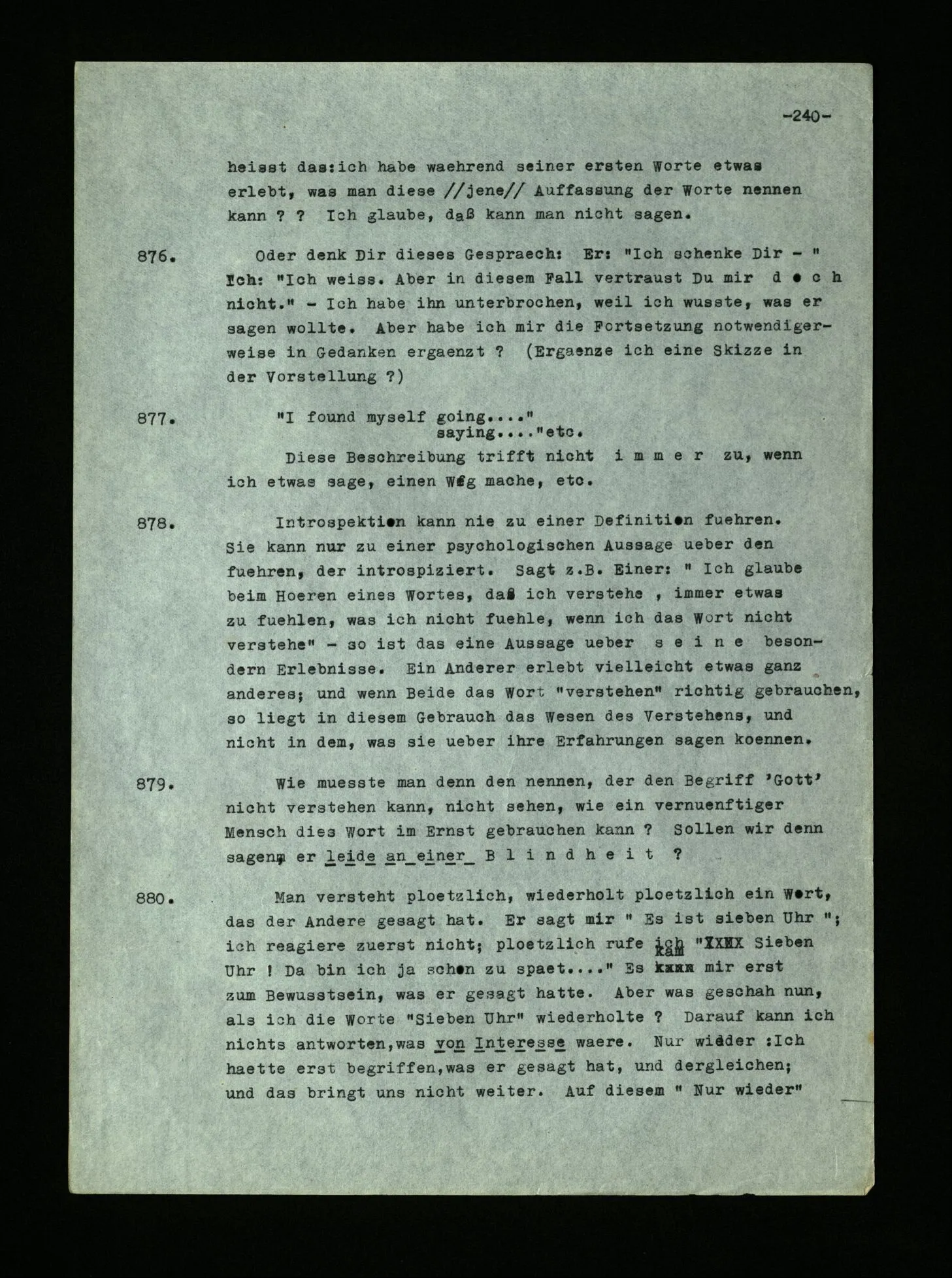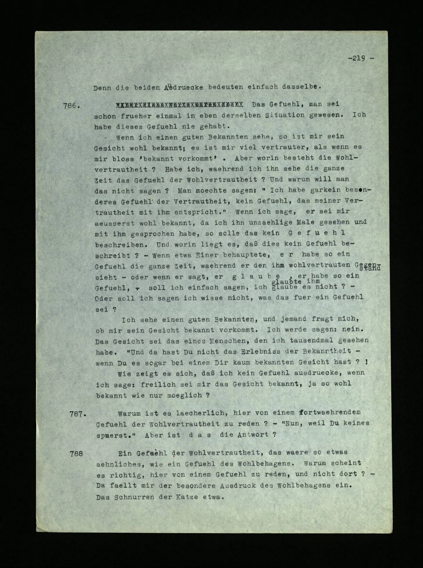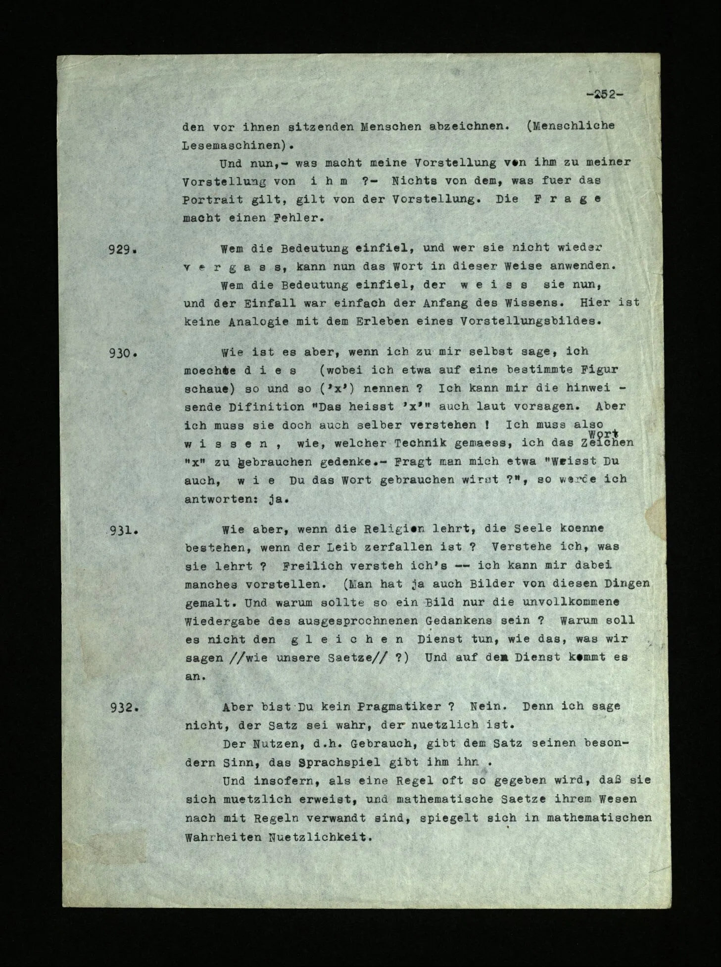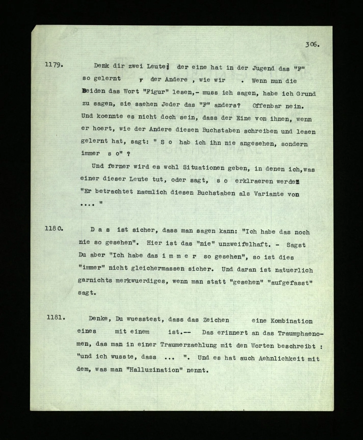 1774. Wenn jemand sagt: Die Form, die Farbe, die Organisation, der Ausdruck, sind doch alle, offenbar, (für jeden Unvoreingenommenen) Eigenschaften, Züge, des subjektiv Gesehenen, des unmittelbaren Gesichtsobjekts, – so verrät ihn hier das Wort “offenbar”. “Offenbar” ist es darum, weil’s Jeder zugibt; und er gibt es nur durch den Sprachgebrauch zu. Man begründet also hier einen Satz durch ein Bild.