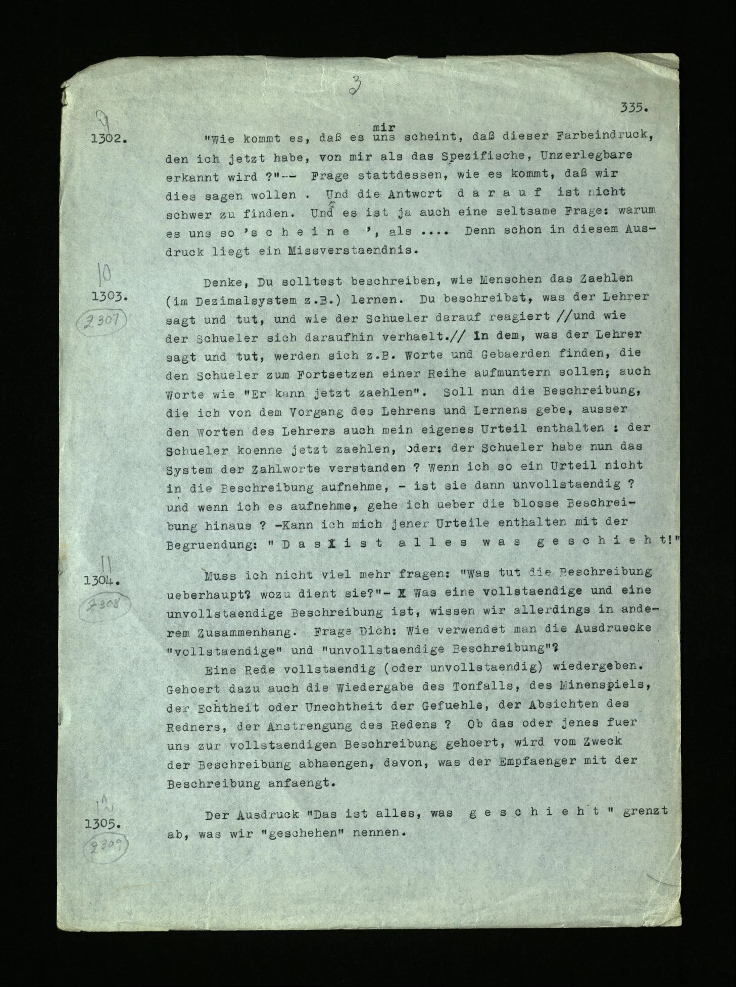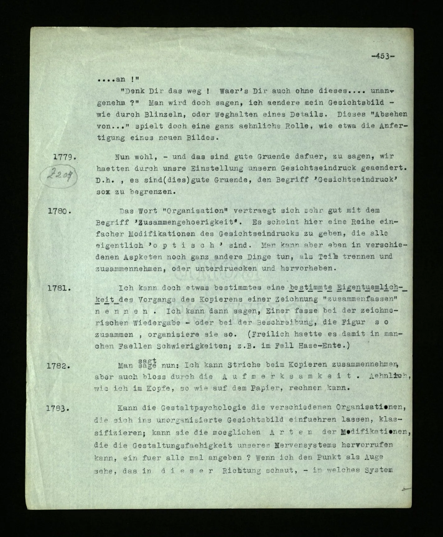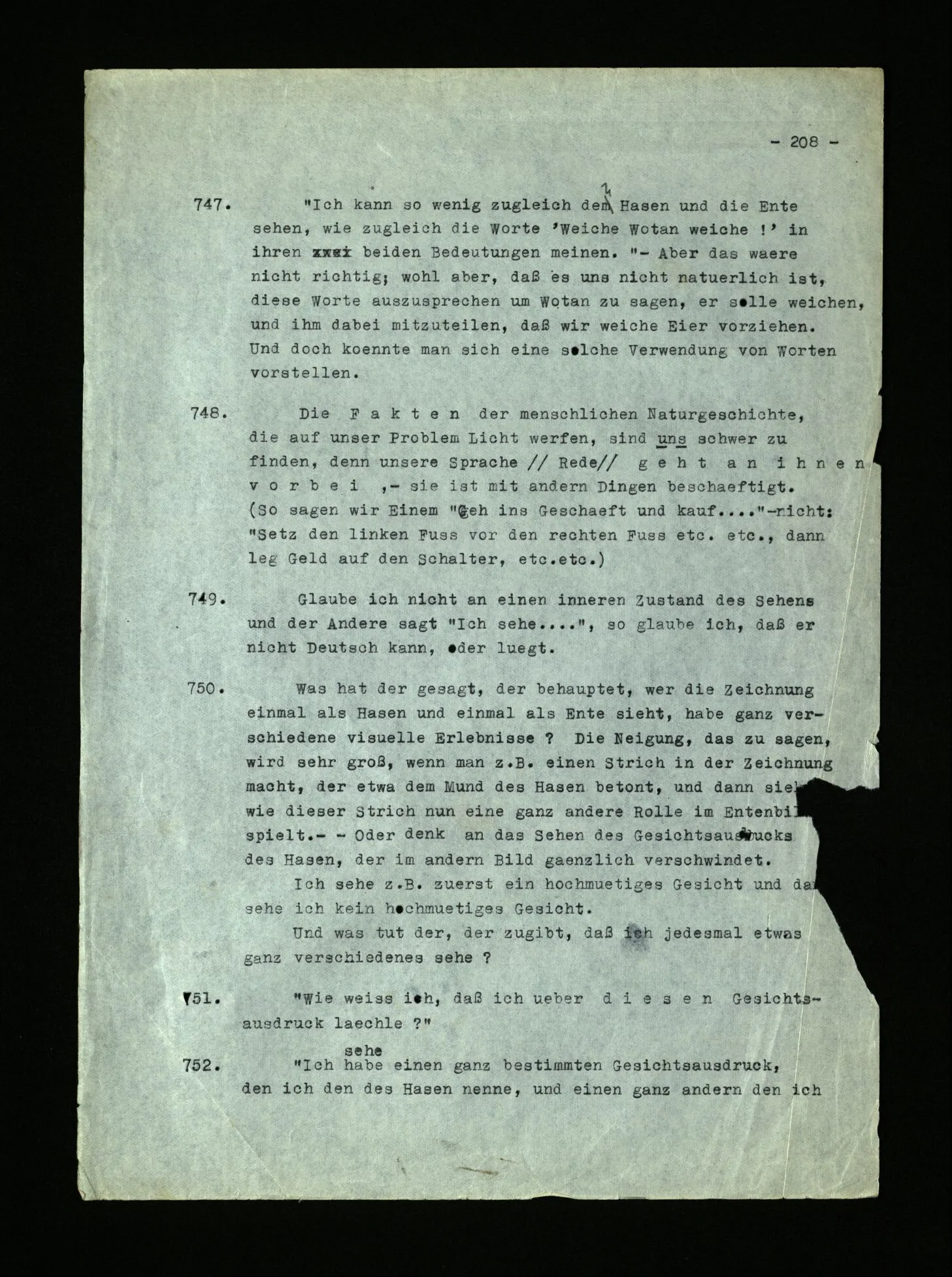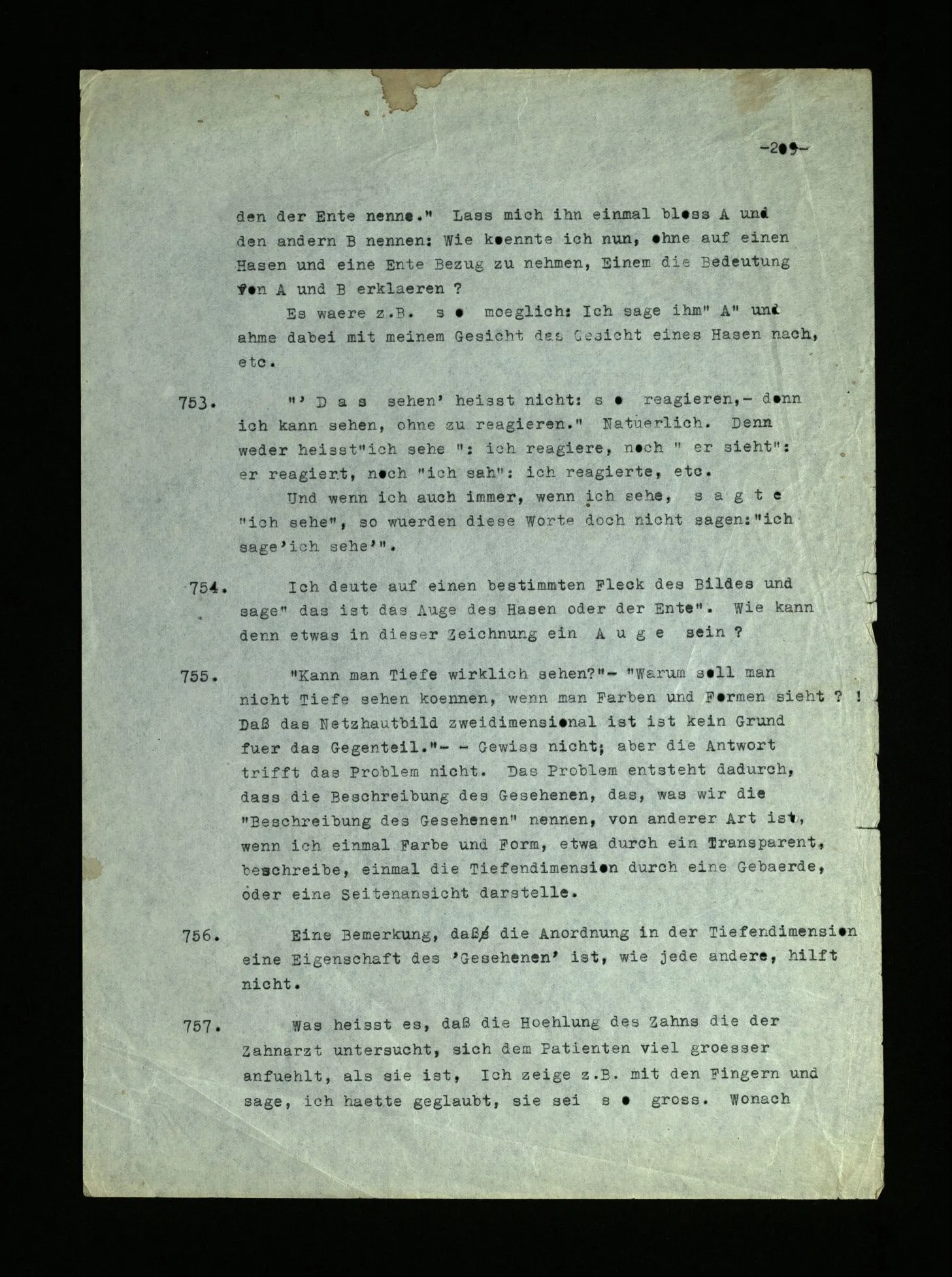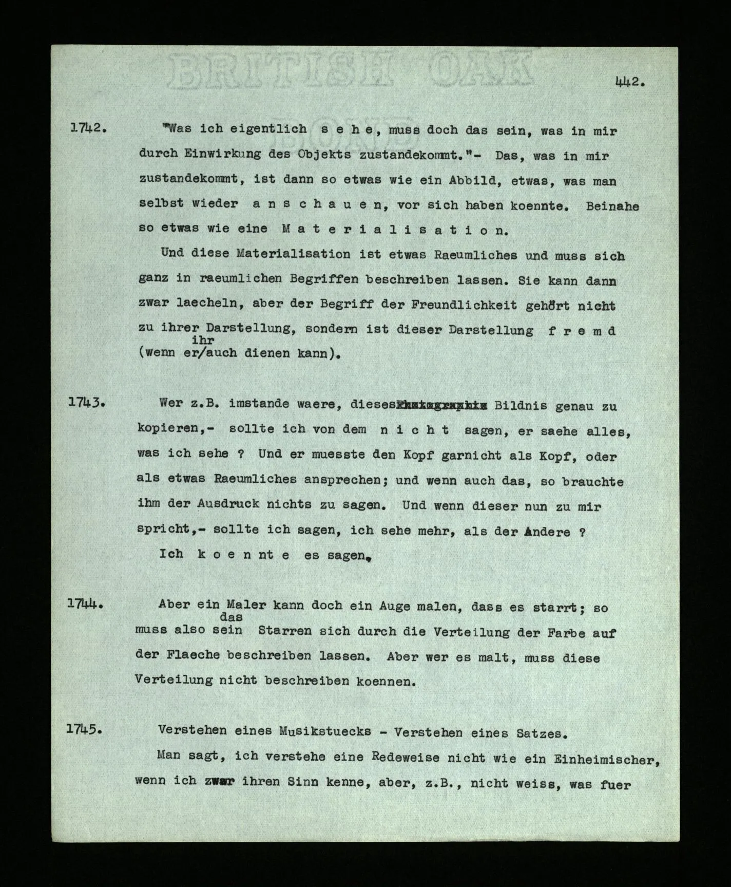 1774. Wenn jemand sagt: Die Form, die Farbe, die Organisation, der Ausdruck, sind doch alle, offenbar, (für jeden Unvoreingenommenen) Eigenschaften, Züge, des subjektiv Gesehenen, des unmittelbaren Gesichtsobjekts, – so verrät ihn hier das Wort “offenbar”. “Offenbar” ist es darum, weil’s Jeder zugibt; und er gibt es nur durch den Sprachgebrauch zu. Man begründet also hier einen Satz durch ein Bild.