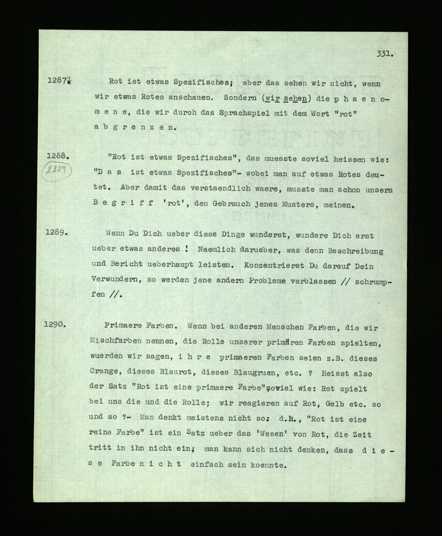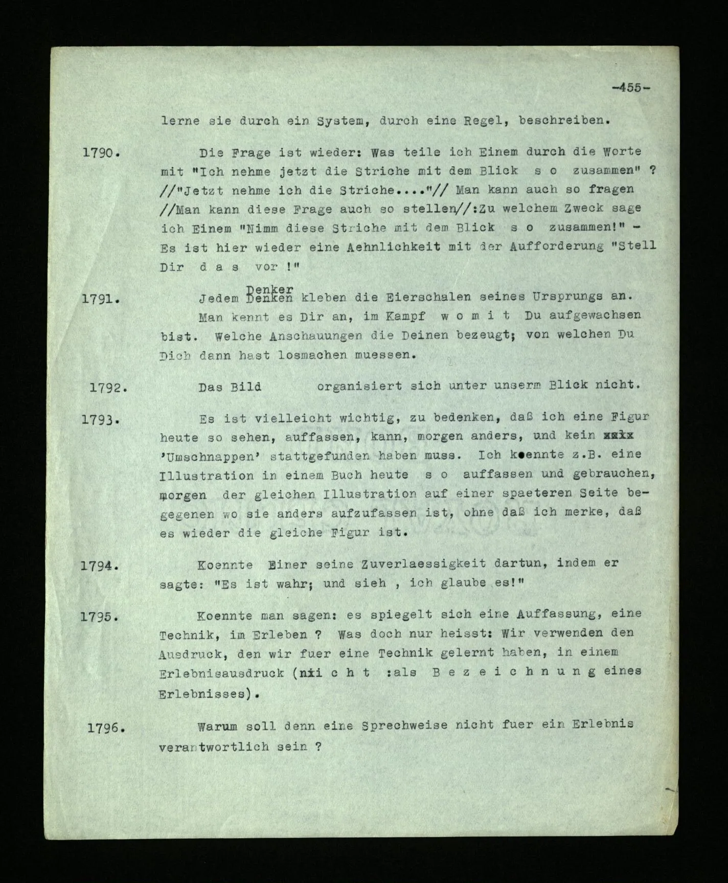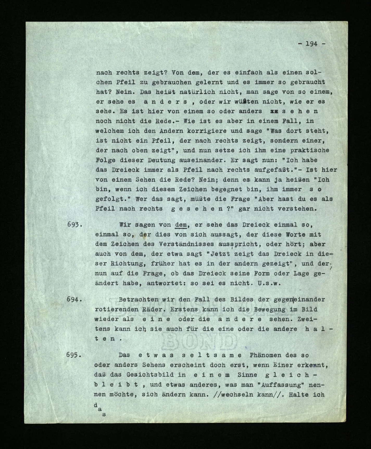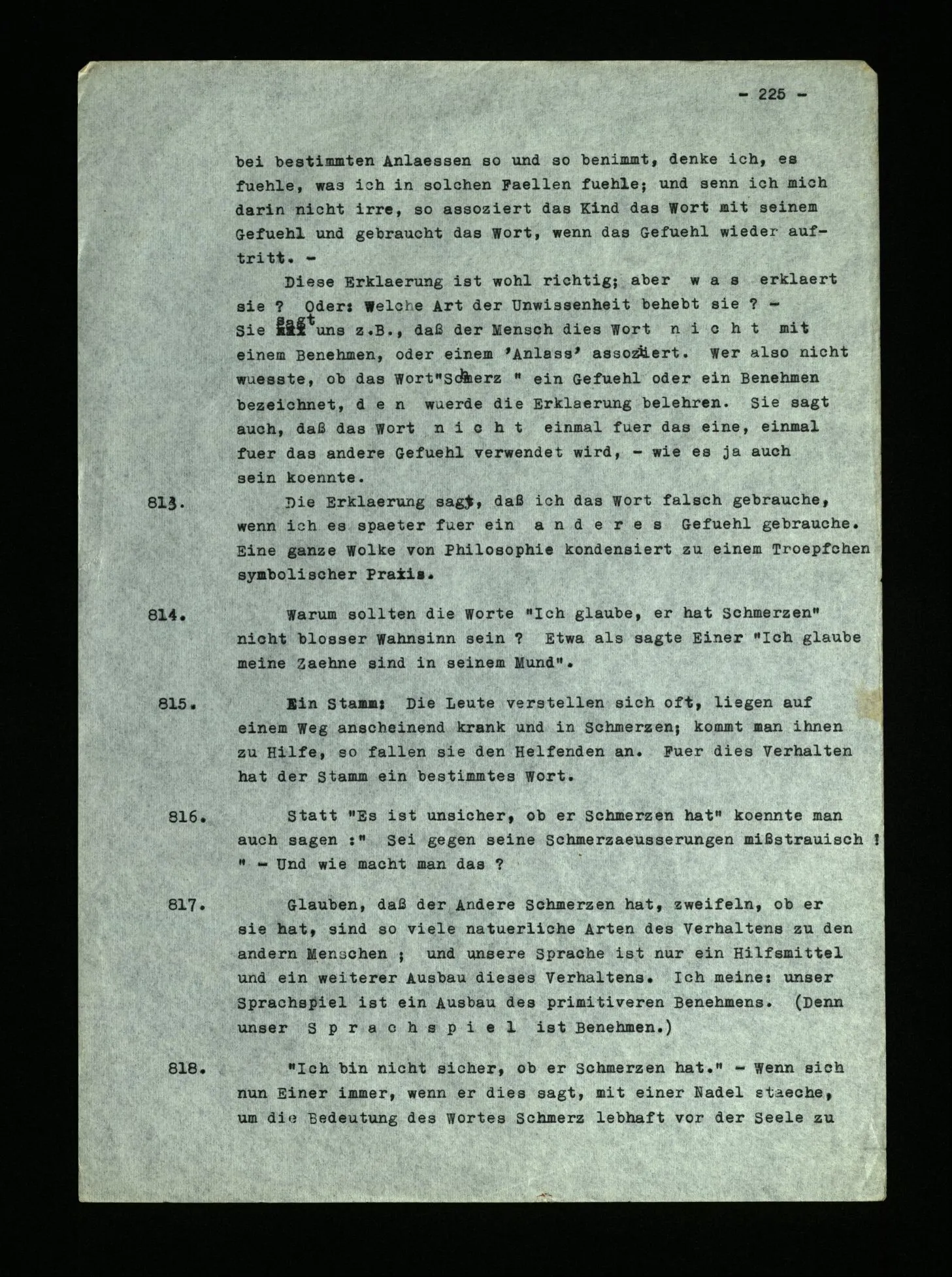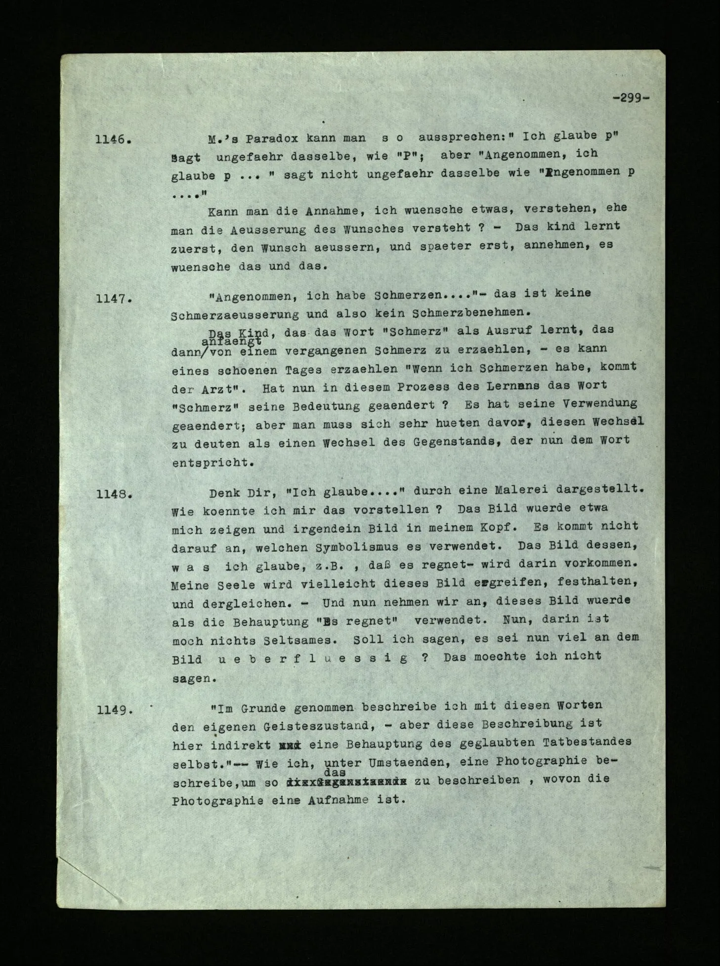 1774. Wenn jemand sagt: Die Form, die Farbe, die Organisation, der Ausdruck, sind doch alle, offenbar, (für jeden Unvoreingenommenen) Eigenschaften, Züge, des subjektiv Gesehenen, des unmittelbaren Gesichtsobjekts, – so verrät ihn hier das Wort “offenbar”. “Offenbar” ist es darum, weil’s Jeder zugibt; und er gibt es nur durch den Sprachgebrauch zu. Man begründet also hier einen Satz durch ein Bild.