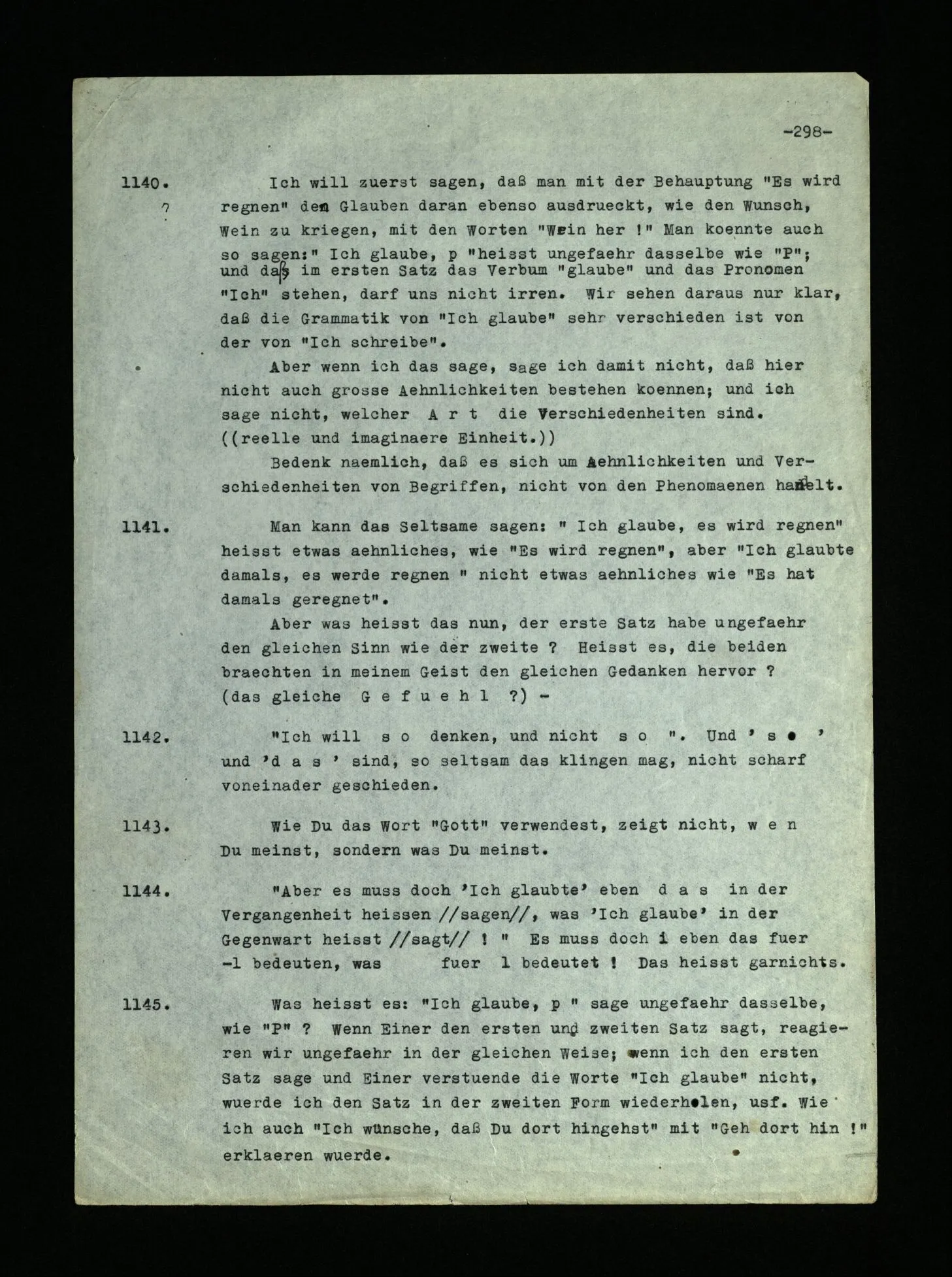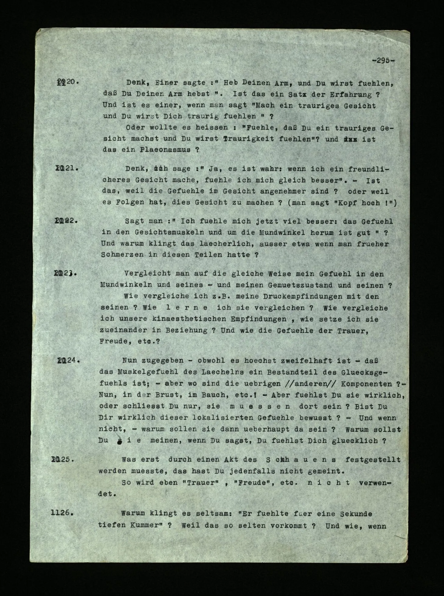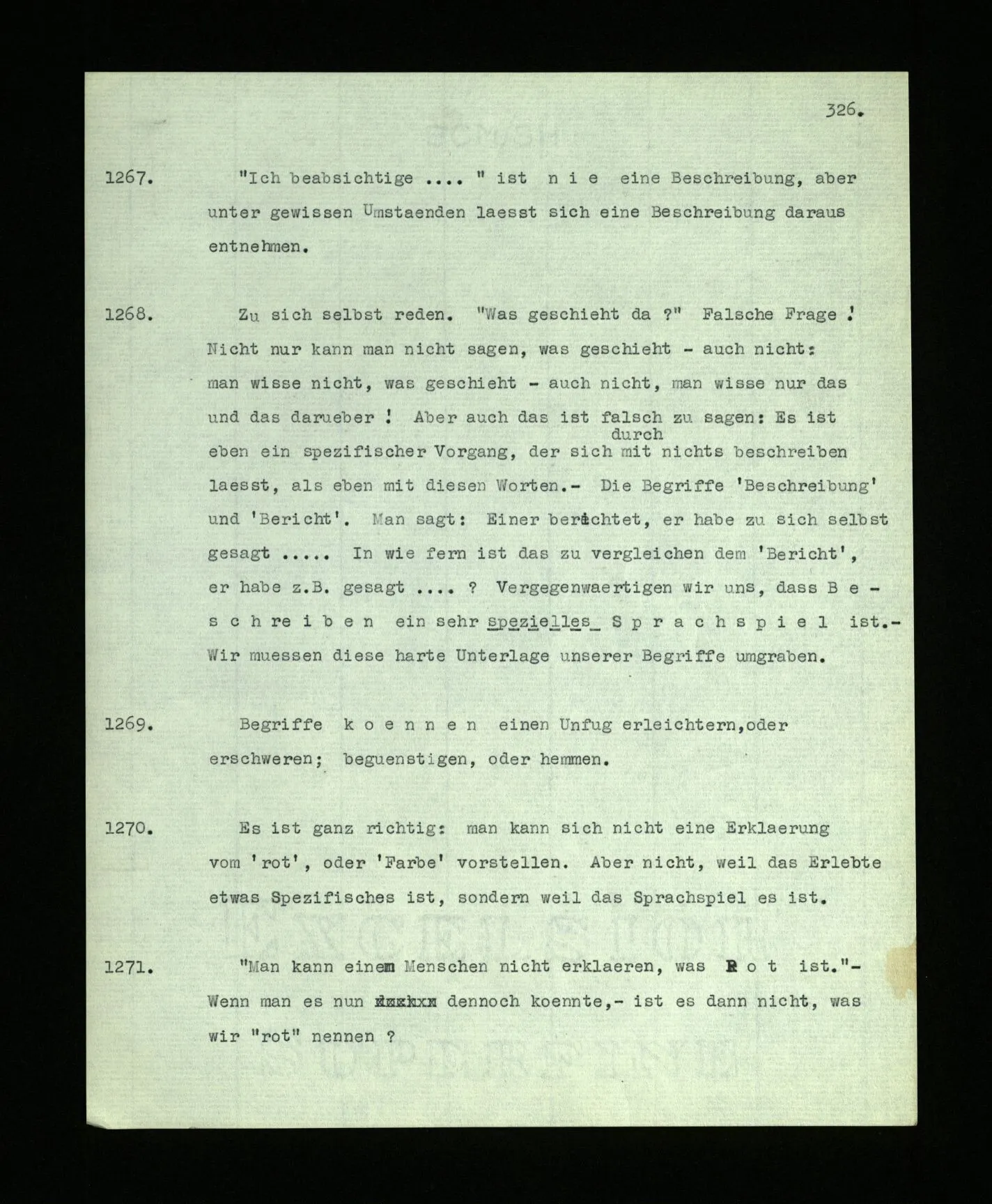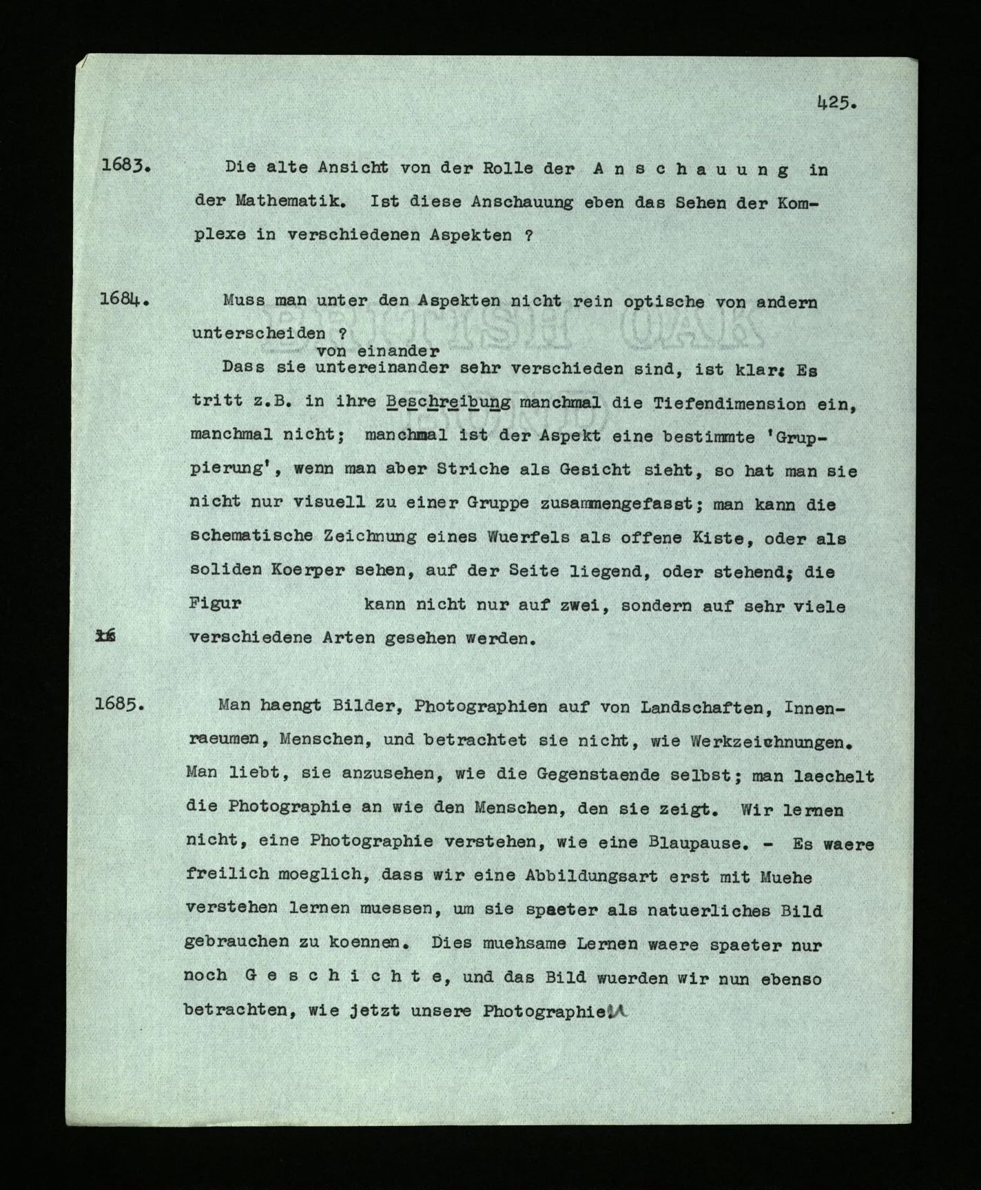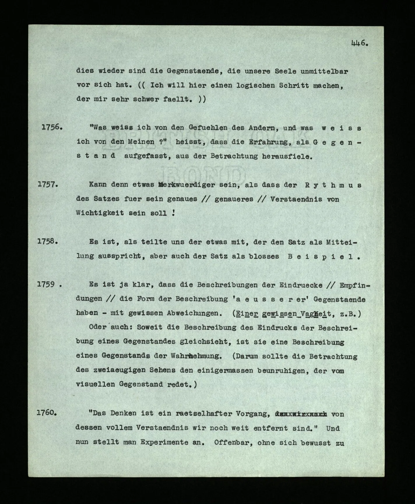 1774. Wenn jemand sagt: Die Form, die Farbe, die Organisation, der Ausdruck, sind doch alle, offenbar, (für jeden Unvoreingenommenen) Eigenschaften, Züge, des subjektiv Gesehenen, des unmittelbaren Gesichtsobjekts, – so verrät ihn hier das Wort “offenbar”. “Offenbar” ist es darum, weil’s Jeder zugibt; und er gibt es nur durch den Sprachgebrauch zu. Man begründet also hier einen Satz durch ein Bild.