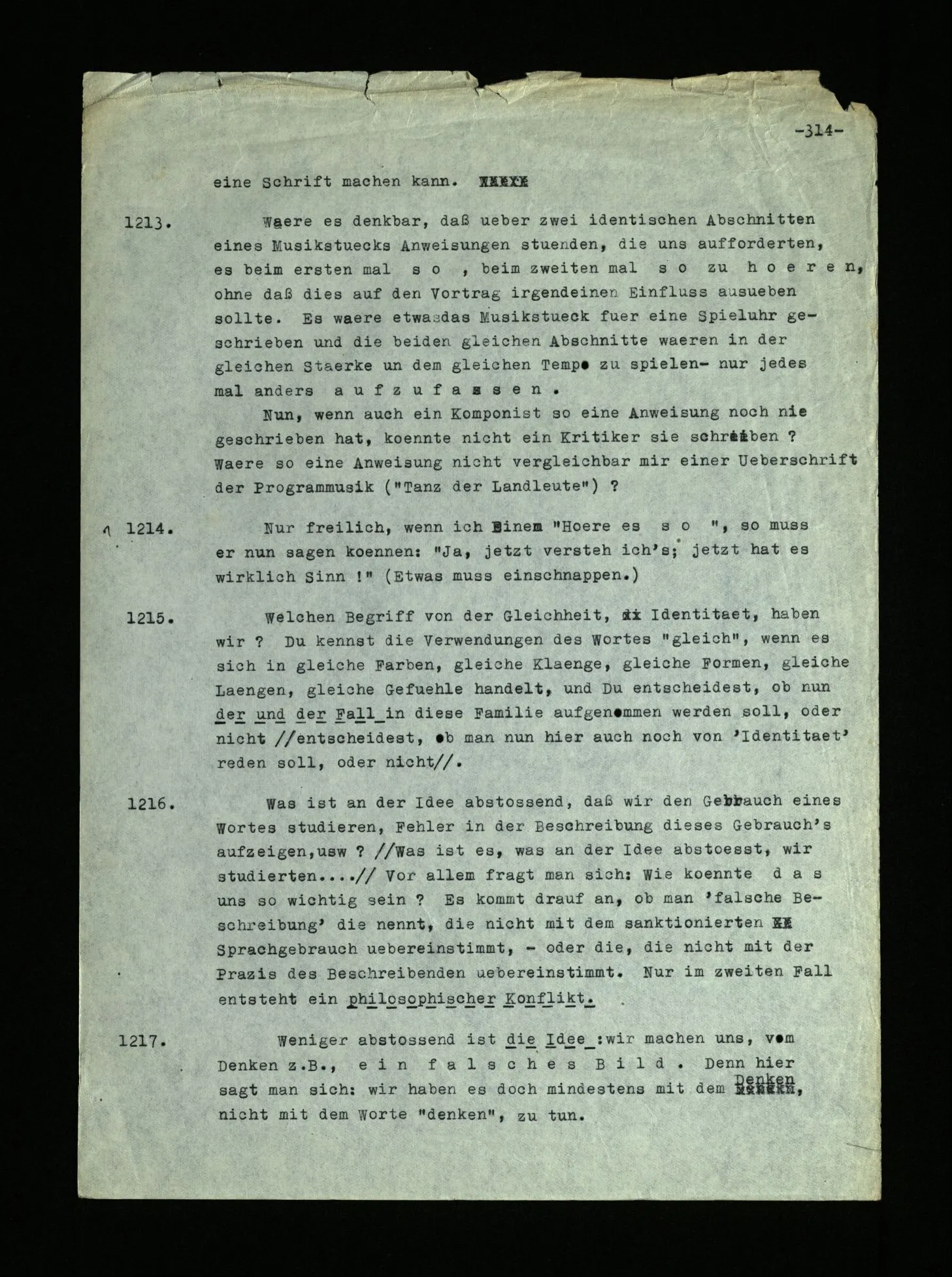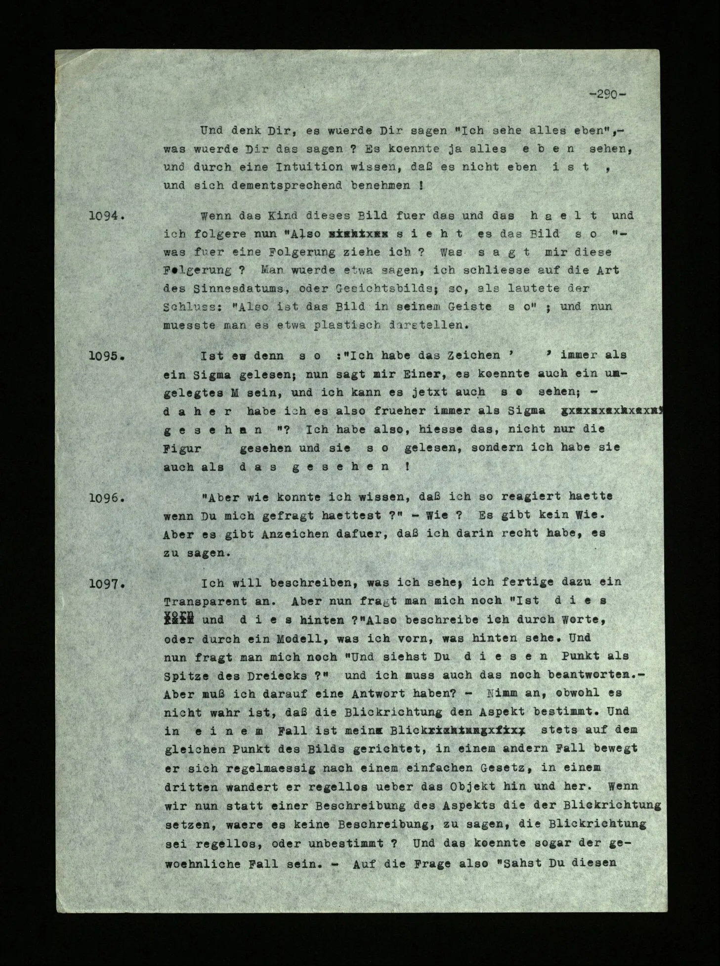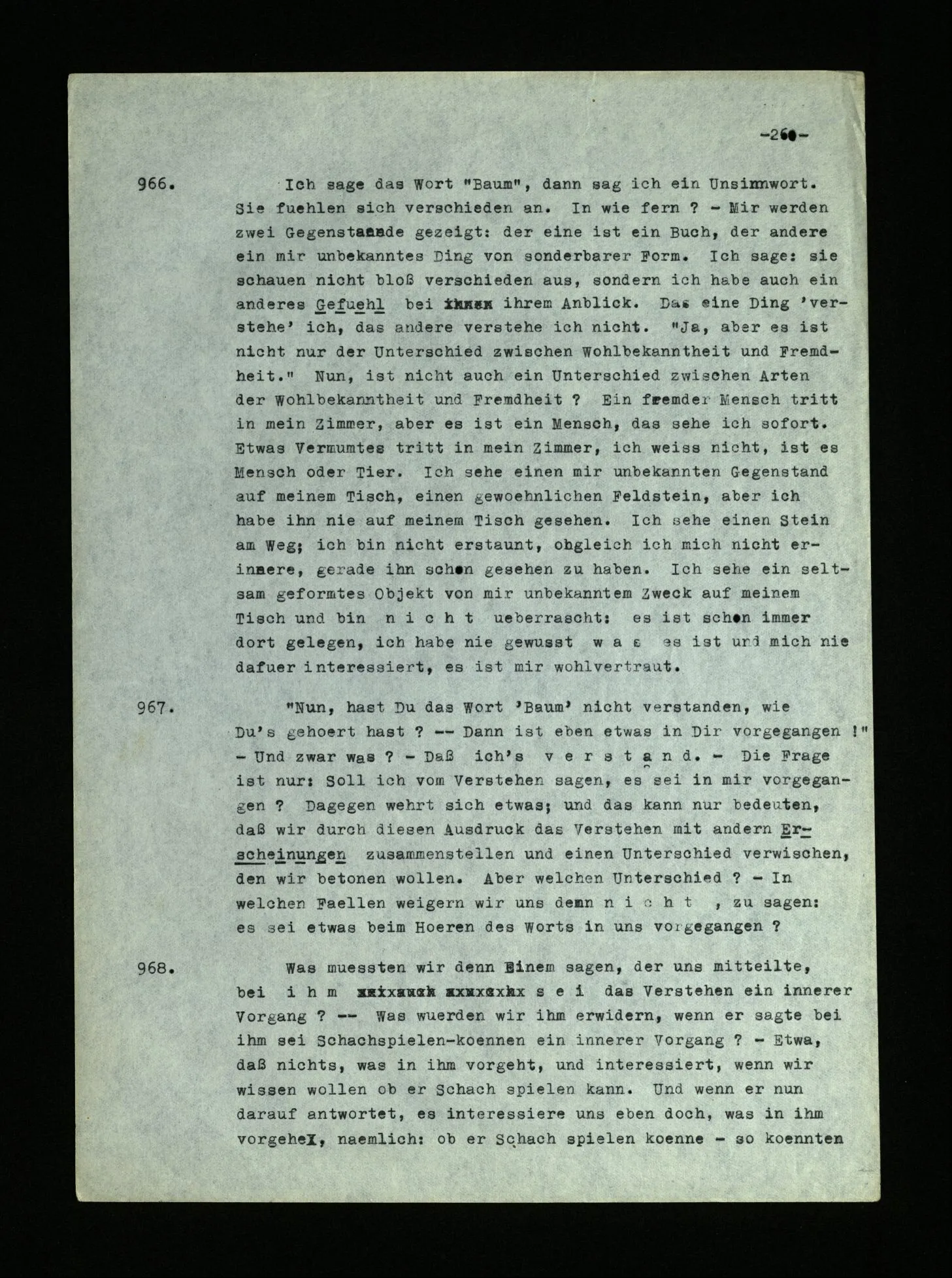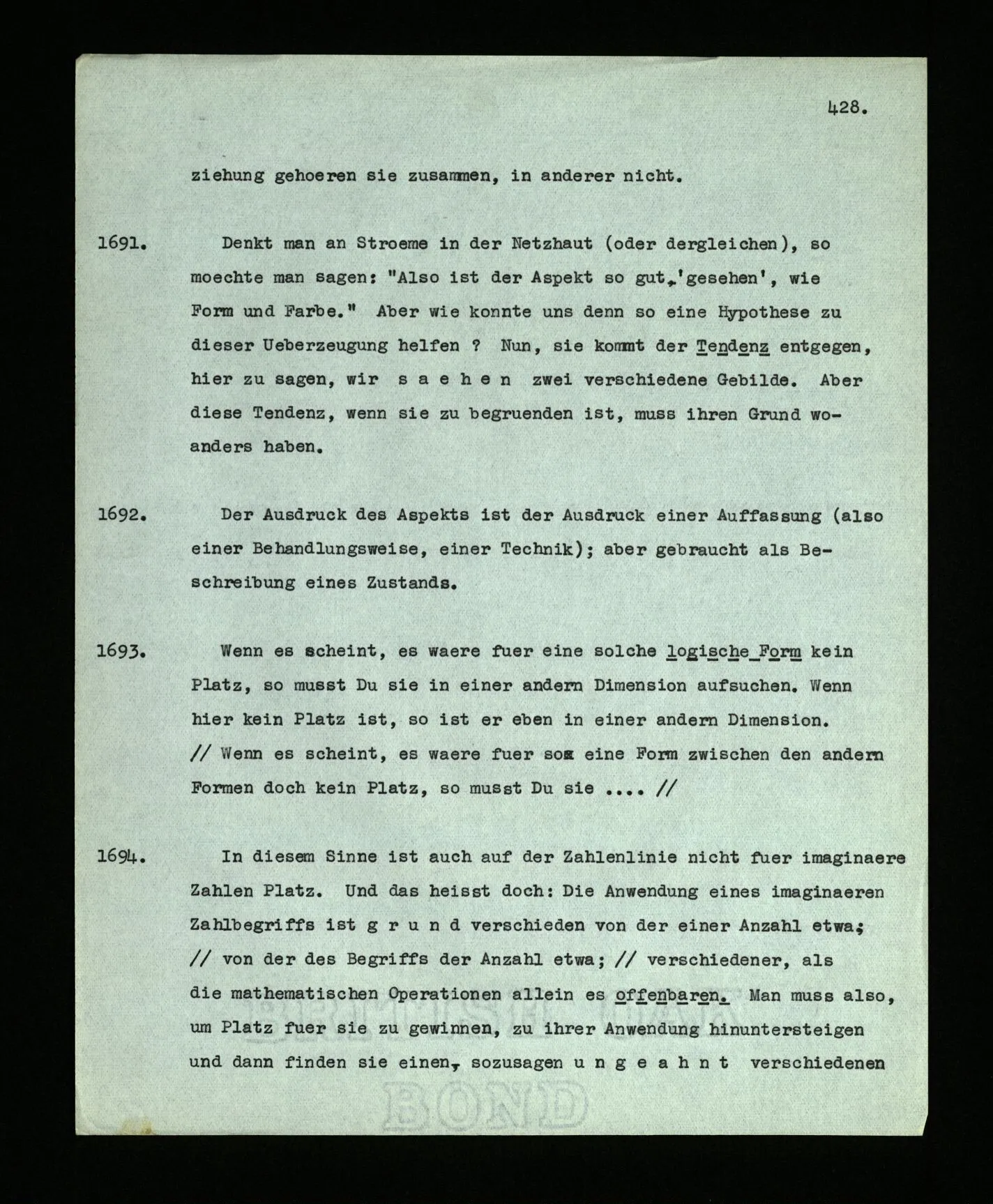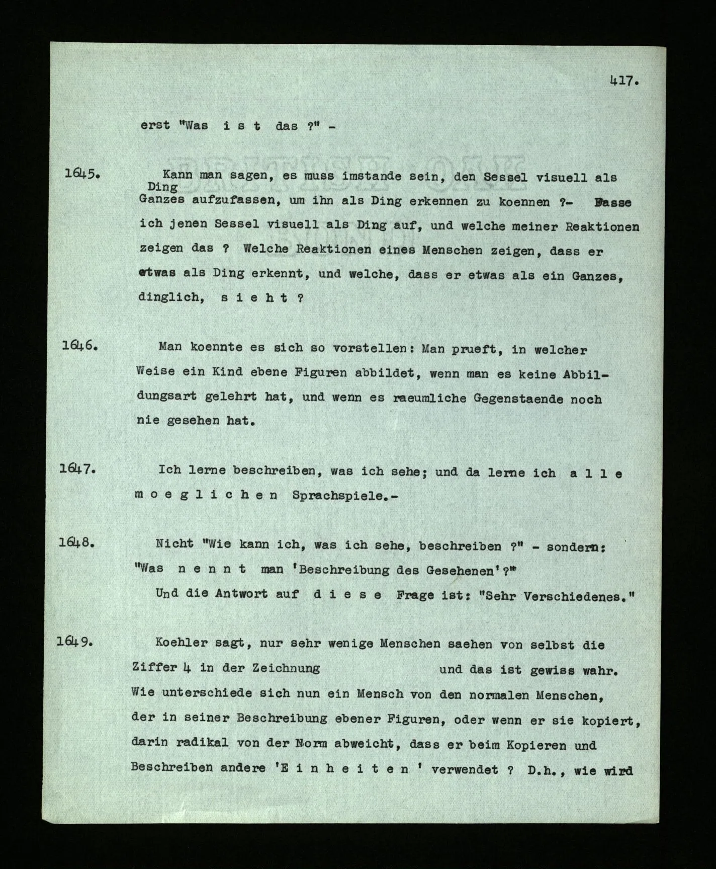 1774. Wenn jemand sagt: Die Form, die Farbe, die Organisation, der Ausdruck, sind doch alle, offenbar, (für jeden Unvoreingenommenen) Eigenschaften, Züge, des subjektiv Gesehenen, des unmittelbaren Gesichtsobjekts, – so verrät ihn hier das Wort “offenbar”. “Offenbar” ist es darum, weil’s Jeder zugibt; und er gibt es nur durch den Sprachgebrauch zu. Man begründet also hier einen Satz durch ein Bild.