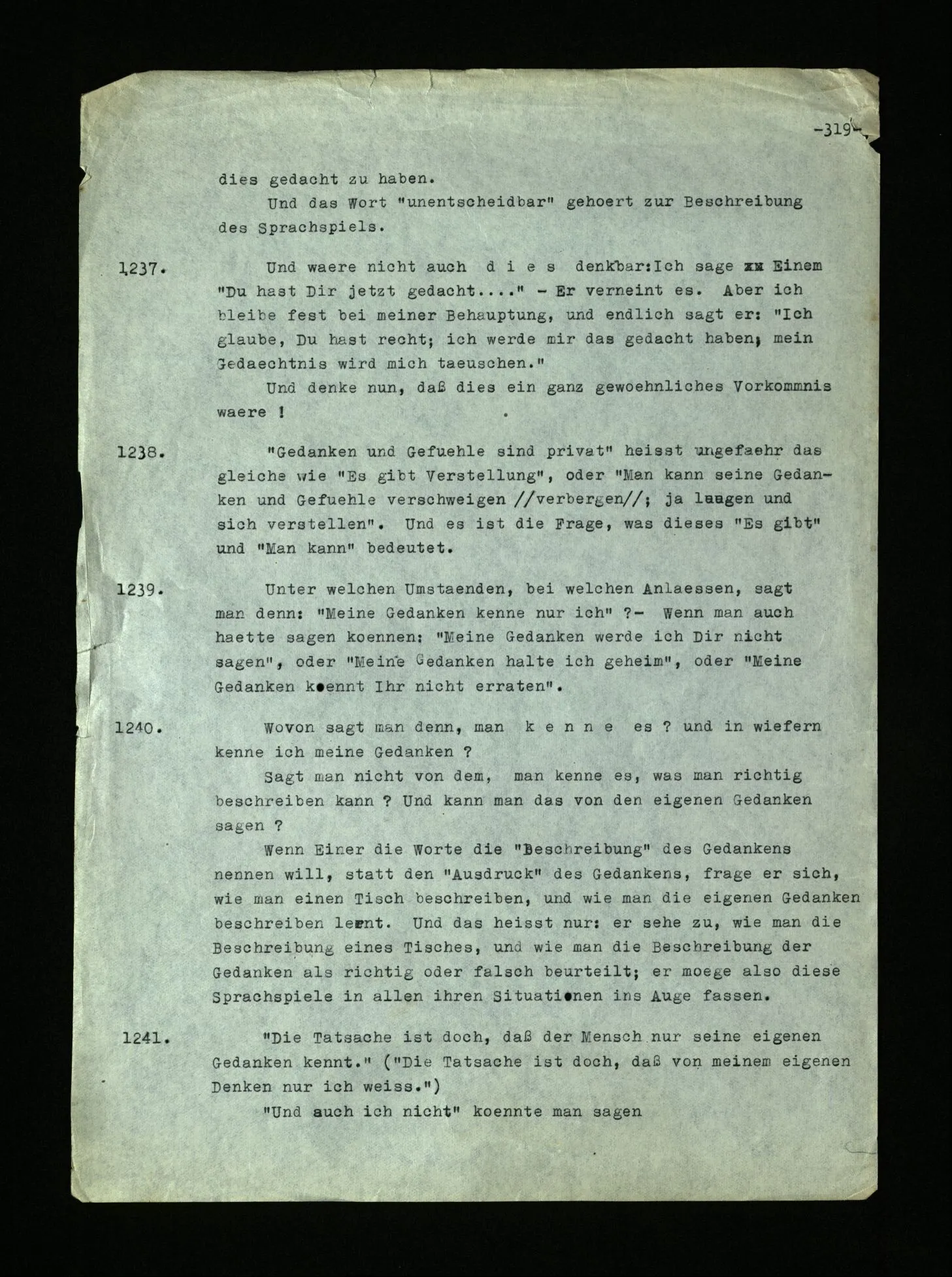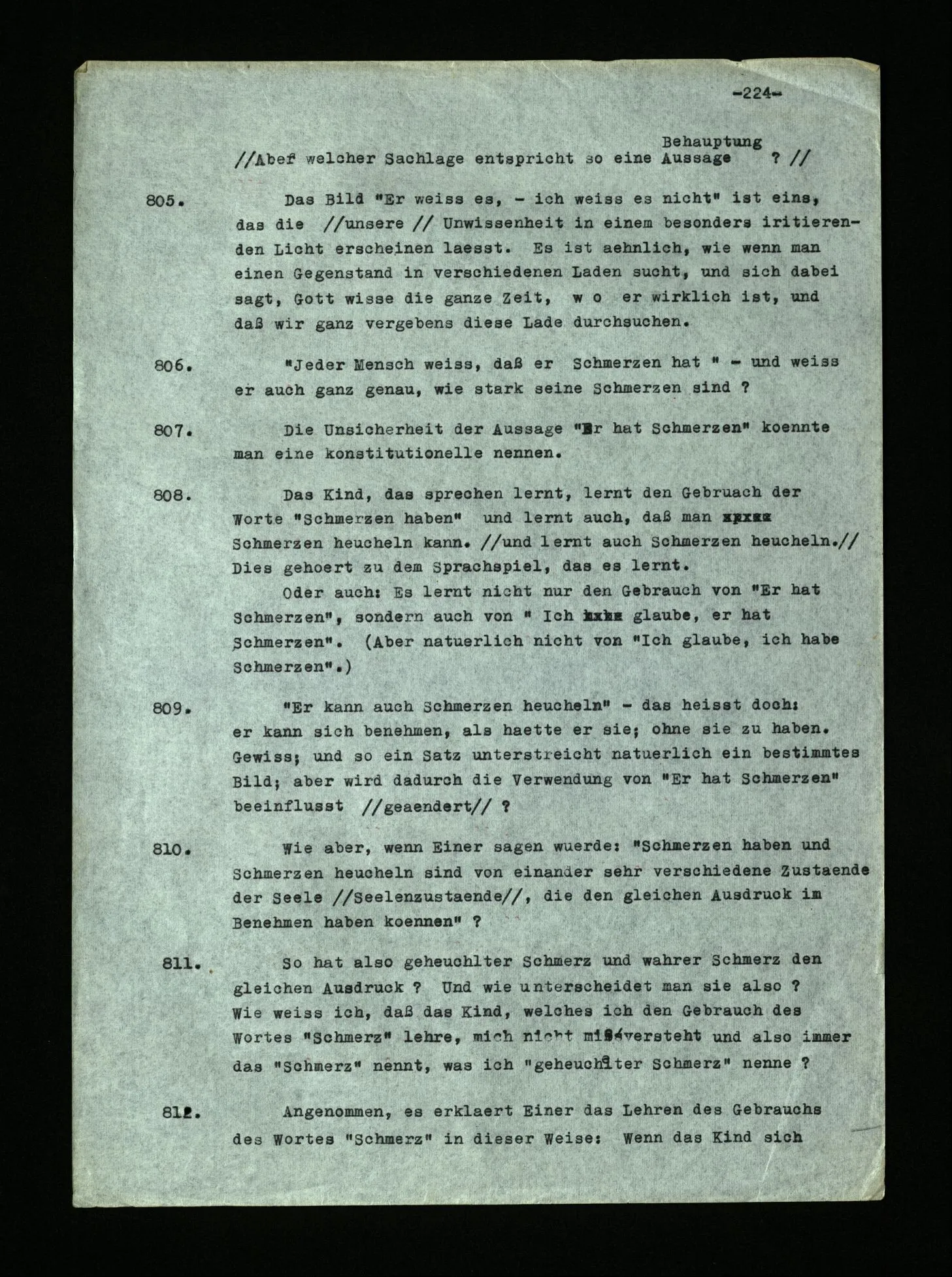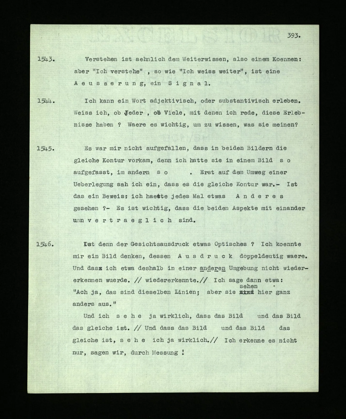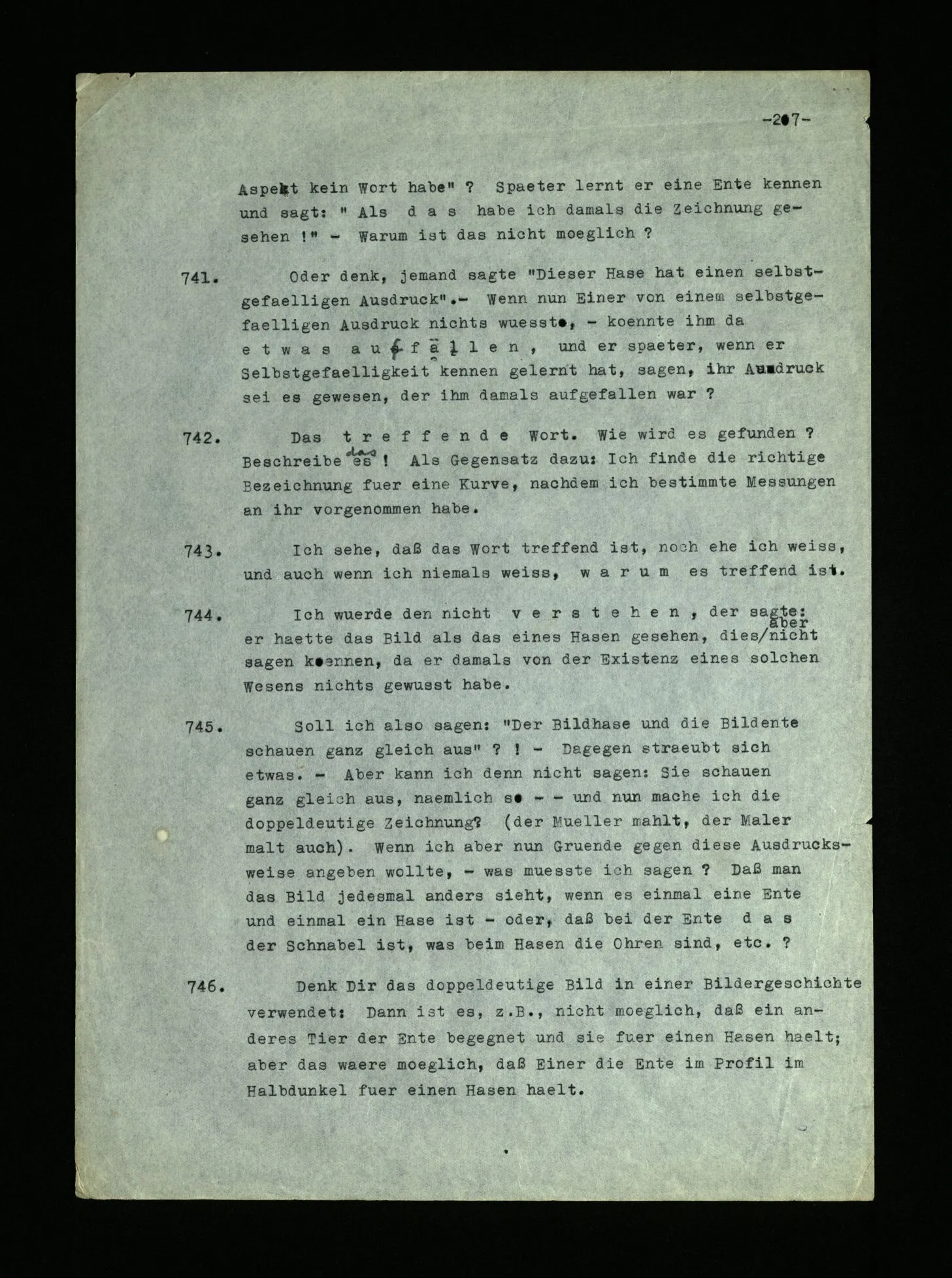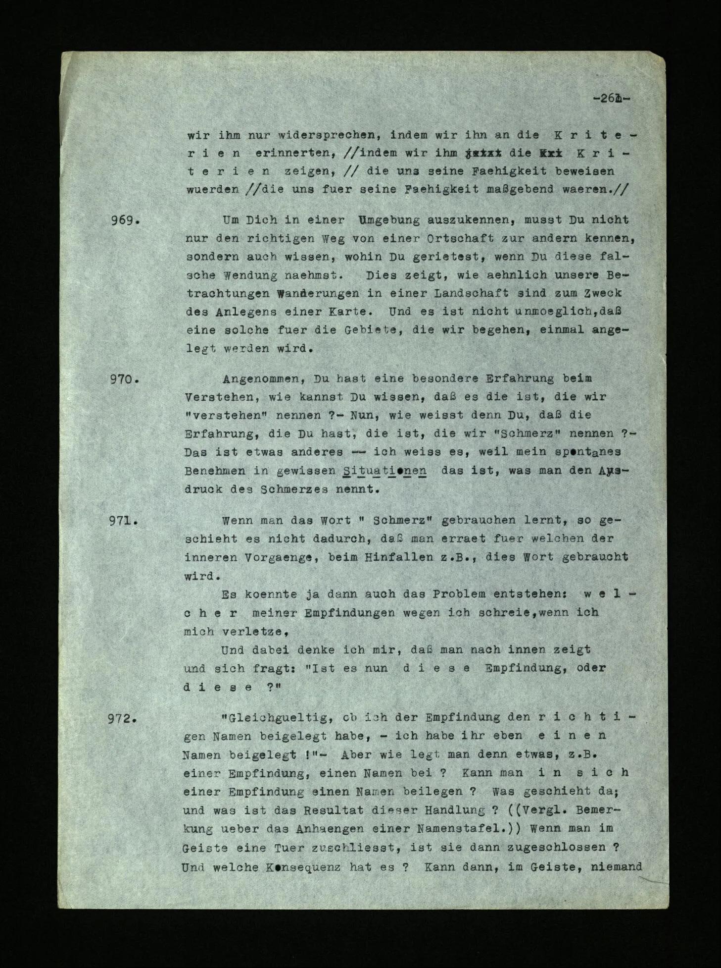 1774. Wenn jemand sagt: Die Form, die Farbe, die Organisation, der Ausdruck, sind doch alle, offenbar, (für jeden Unvoreingenommenen) Eigenschaften, Züge, des subjektiv Gesehenen, des unmittelbaren Gesichtsobjekts, – so verrät ihn hier das Wort “offenbar”. “Offenbar” ist es darum, weil’s Jeder zugibt; und er gibt es nur durch den Sprachgebrauch zu. Man begründet also hier einen Satz durch ein Bild.