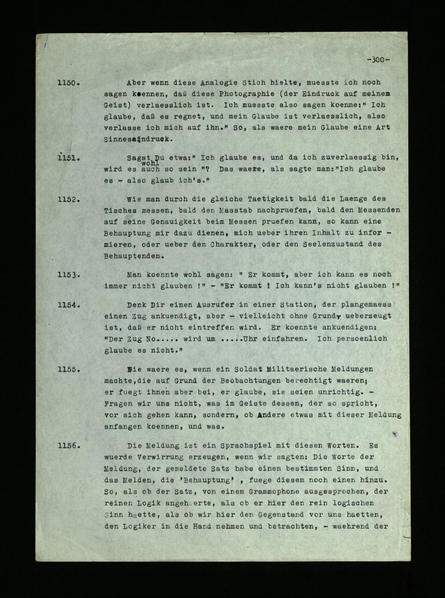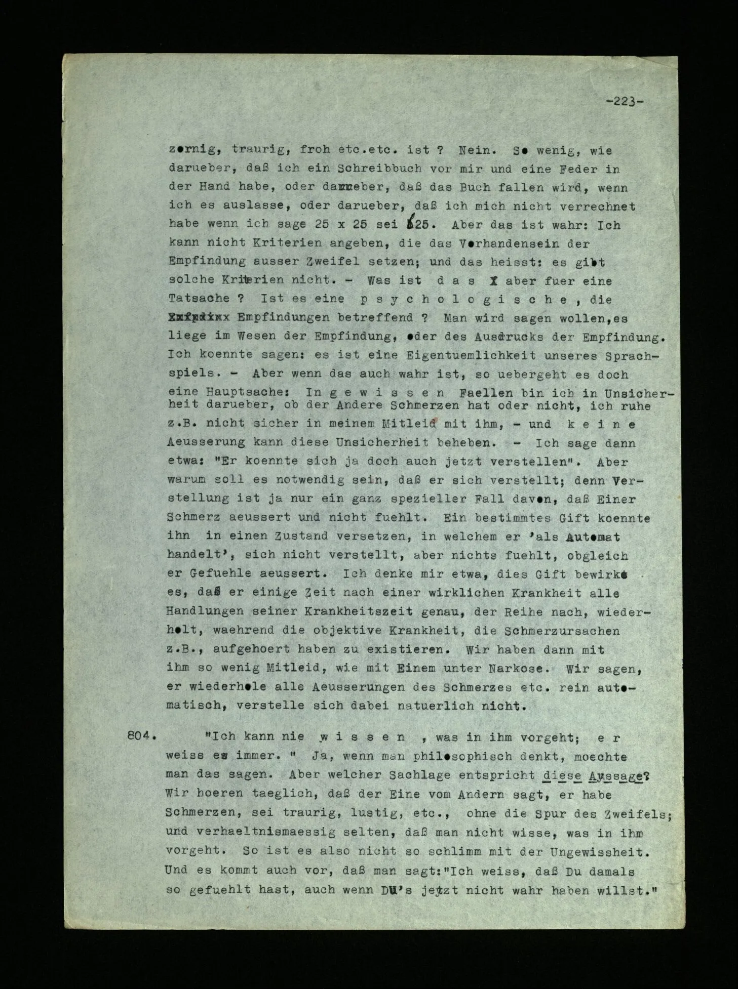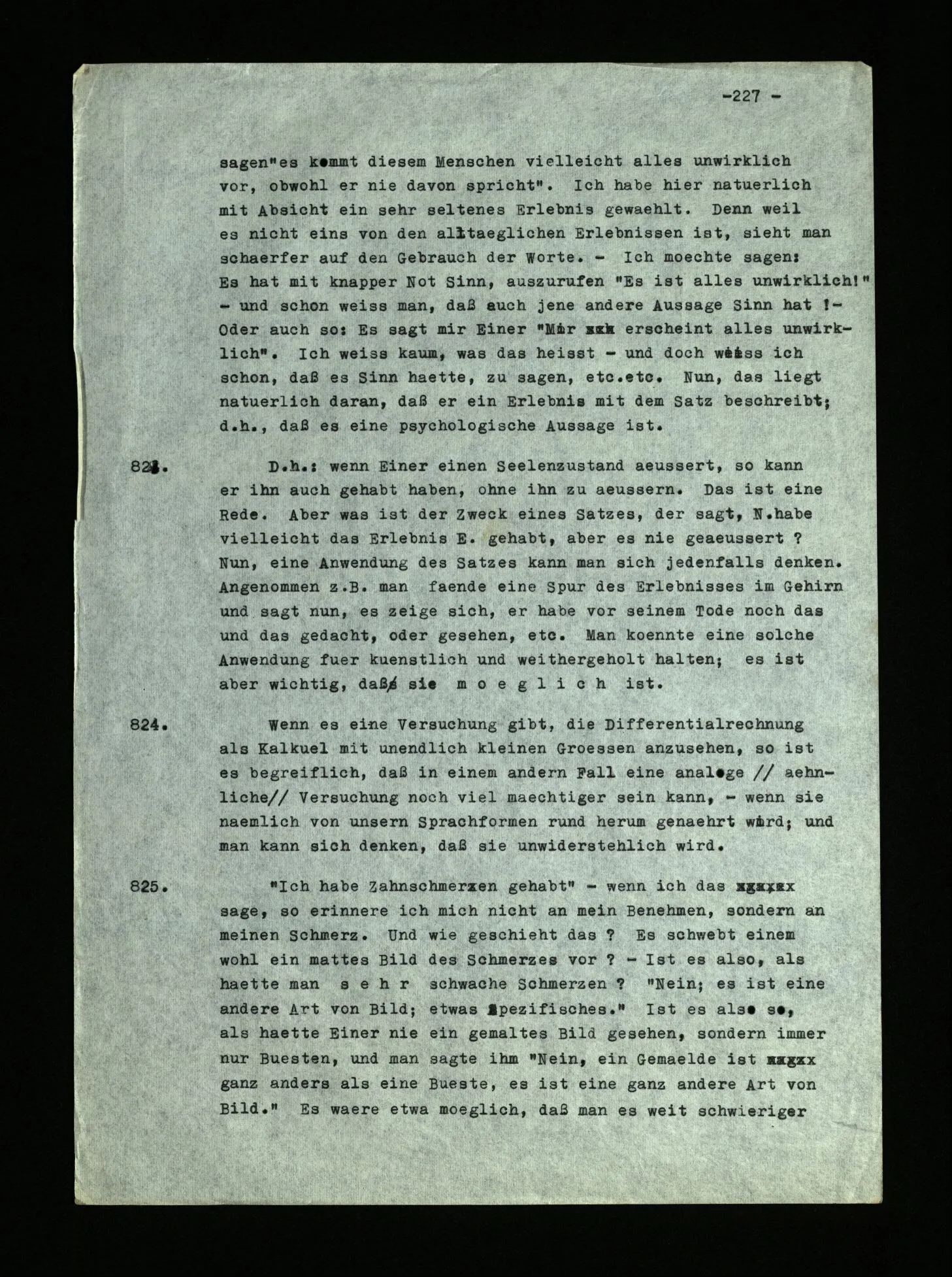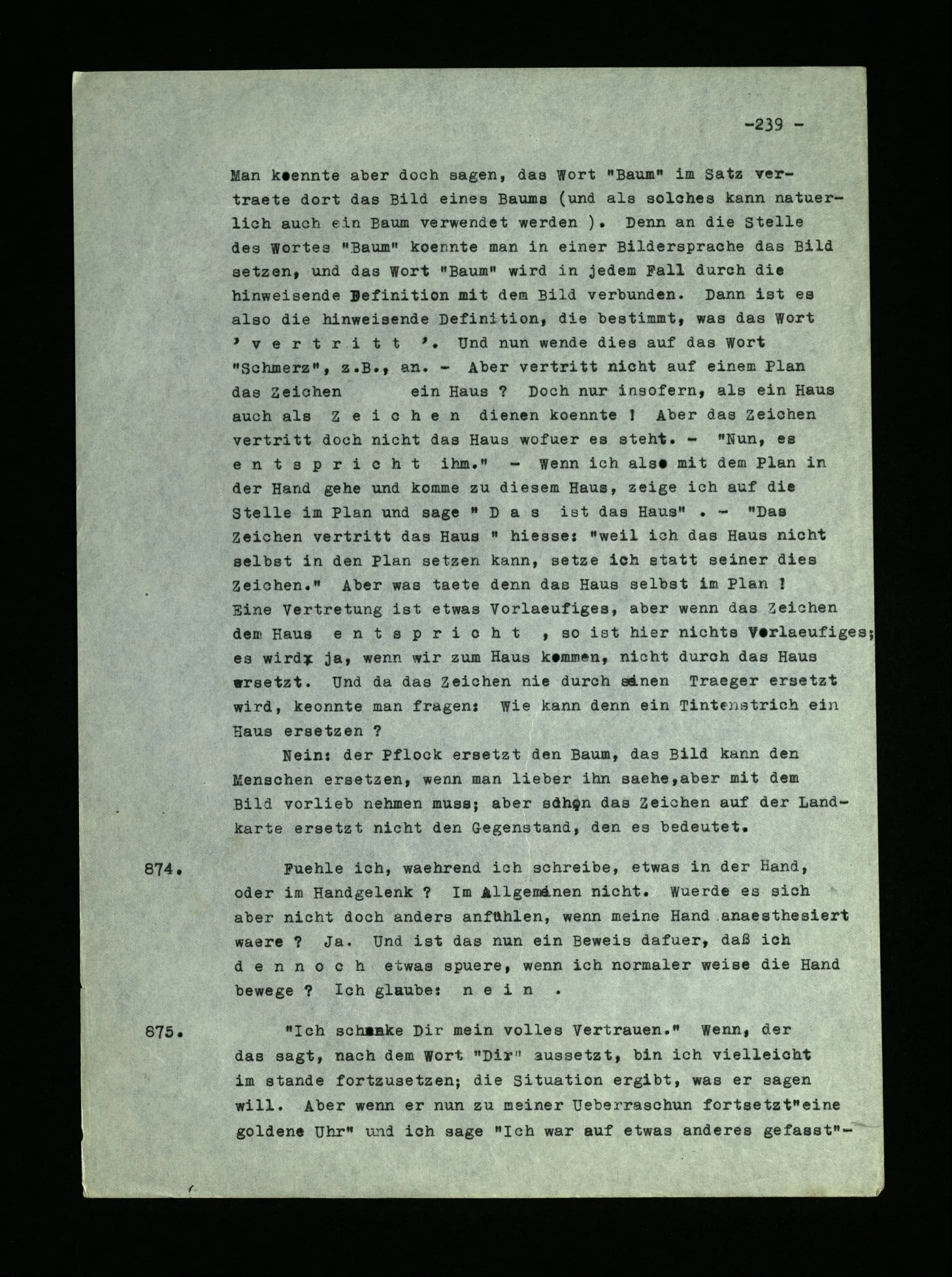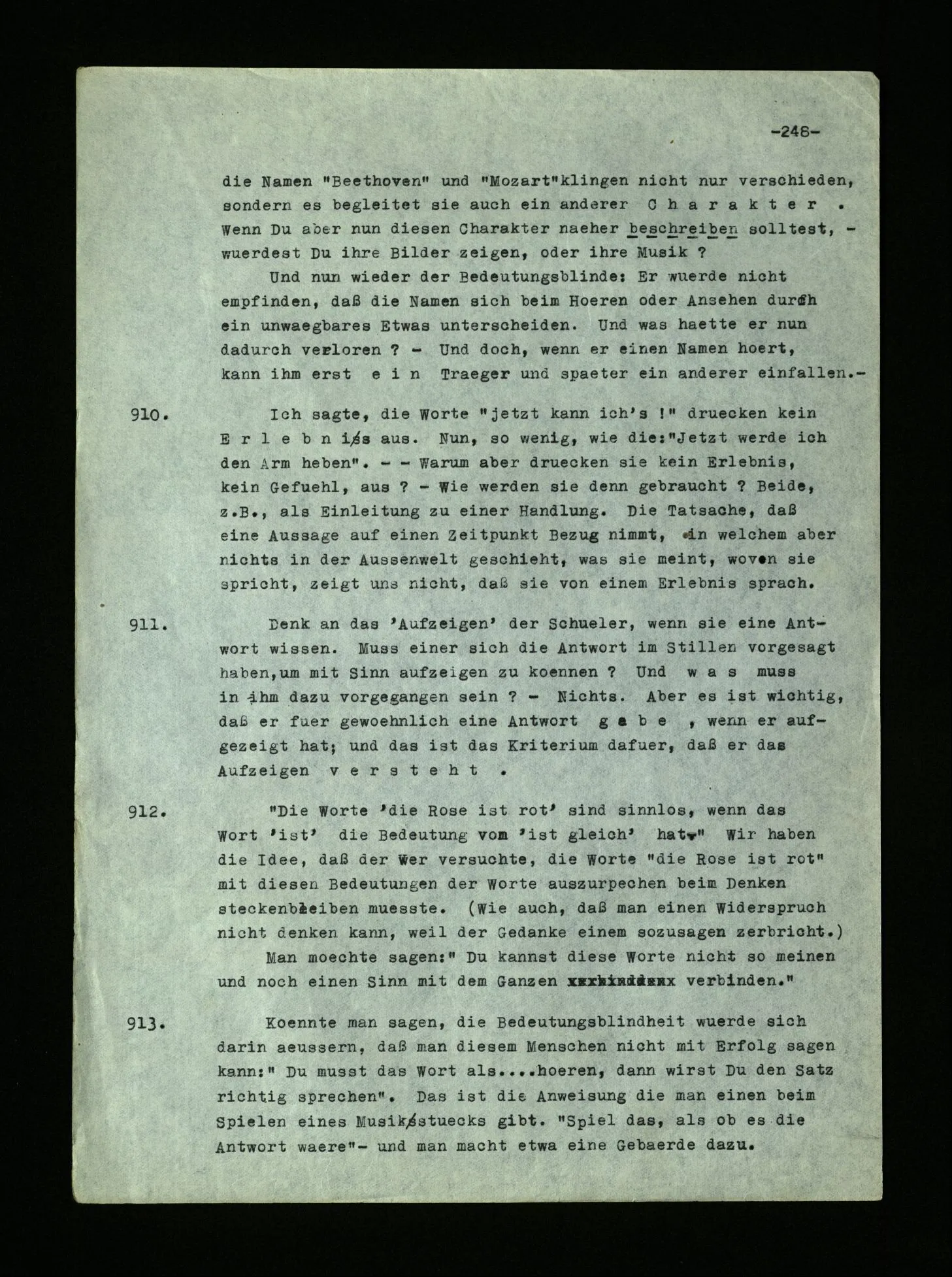 1774. Wenn jemand sagt: Die Form, die Farbe, die Organisation, der Ausdruck, sind doch alle, offenbar, (für jeden Unvoreingenommenen) Eigenschaften, Züge, des subjektiv Gesehenen, des unmittelbaren Gesichtsobjekts, – so verrät ihn hier das Wort “offenbar”. “Offenbar” ist es darum, weil’s Jeder zugibt; und er gibt es nur durch den Sprachgebrauch zu. Man begründet also hier einen Satz durch ein Bild.
