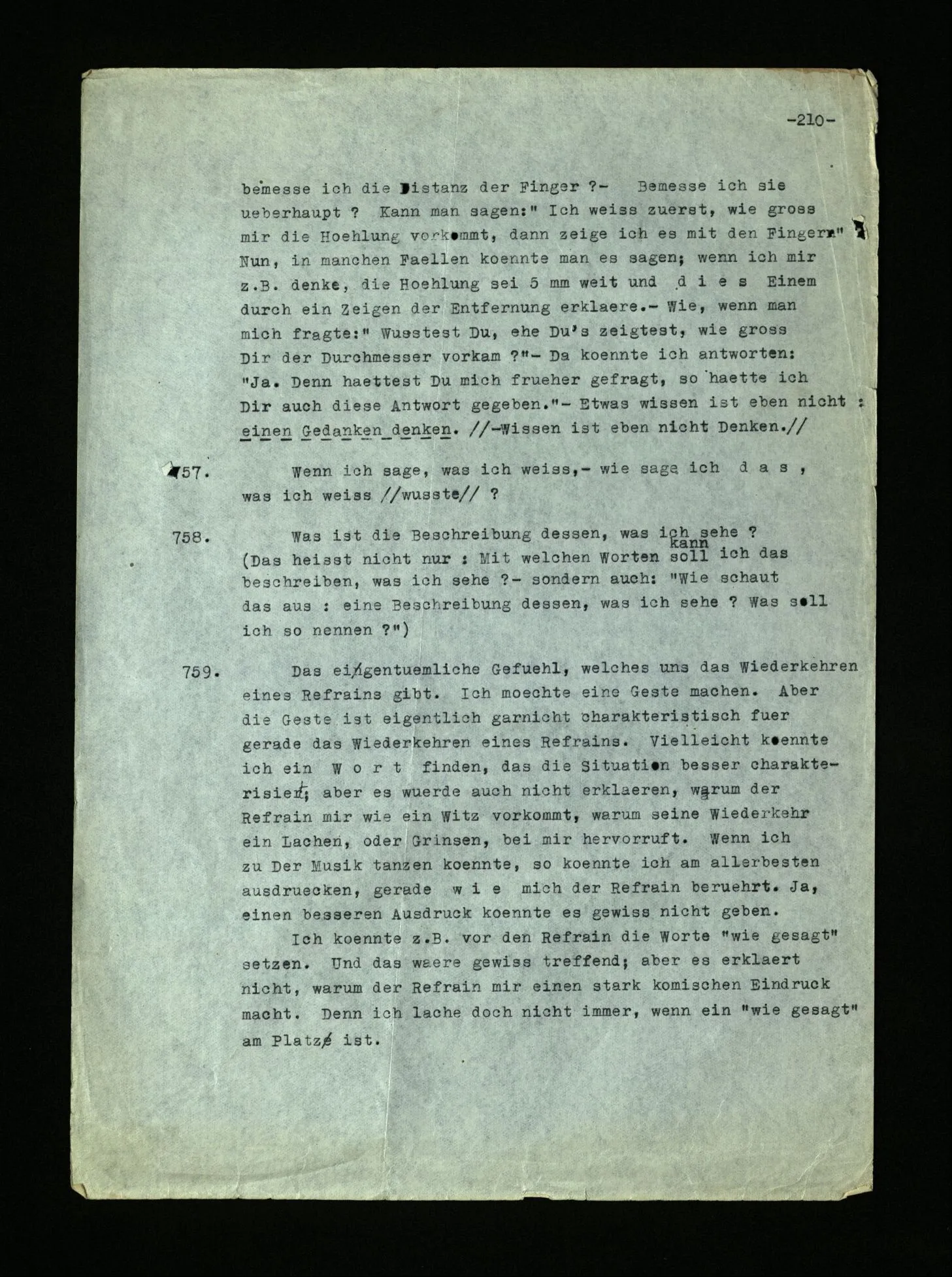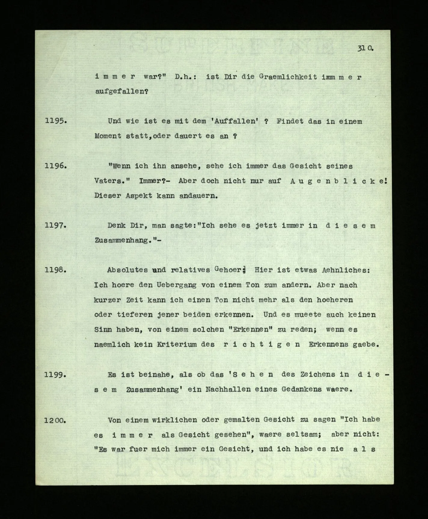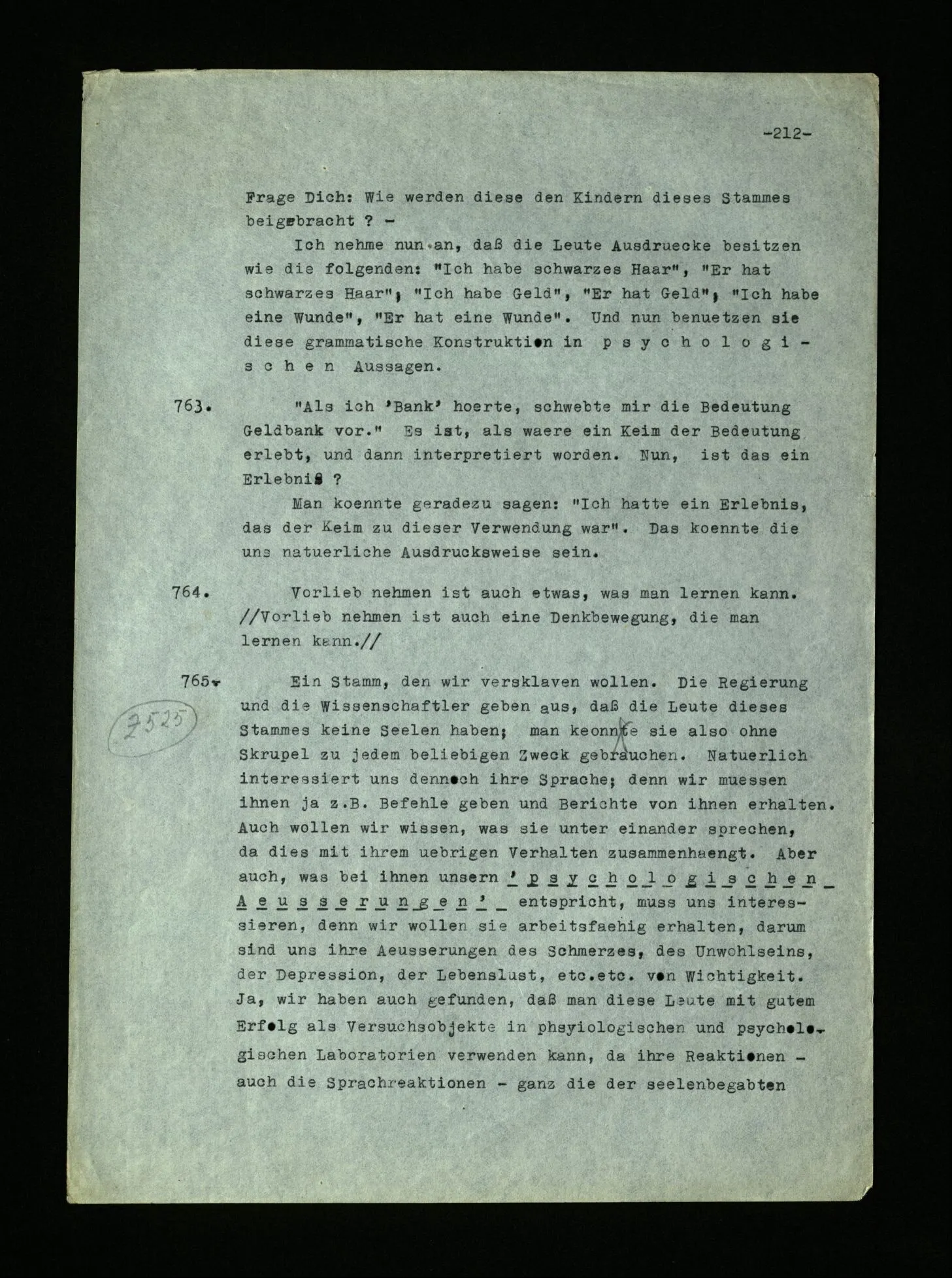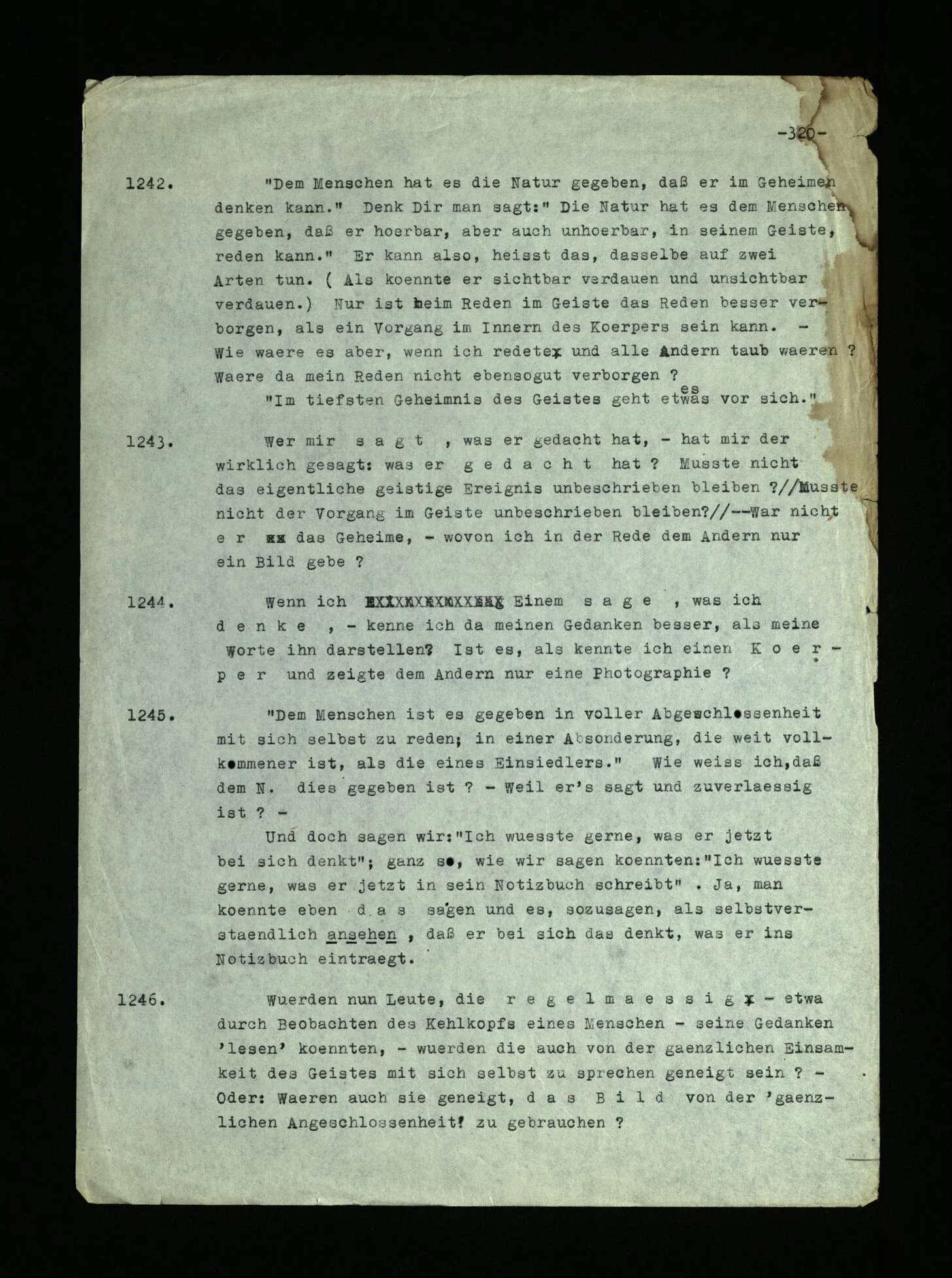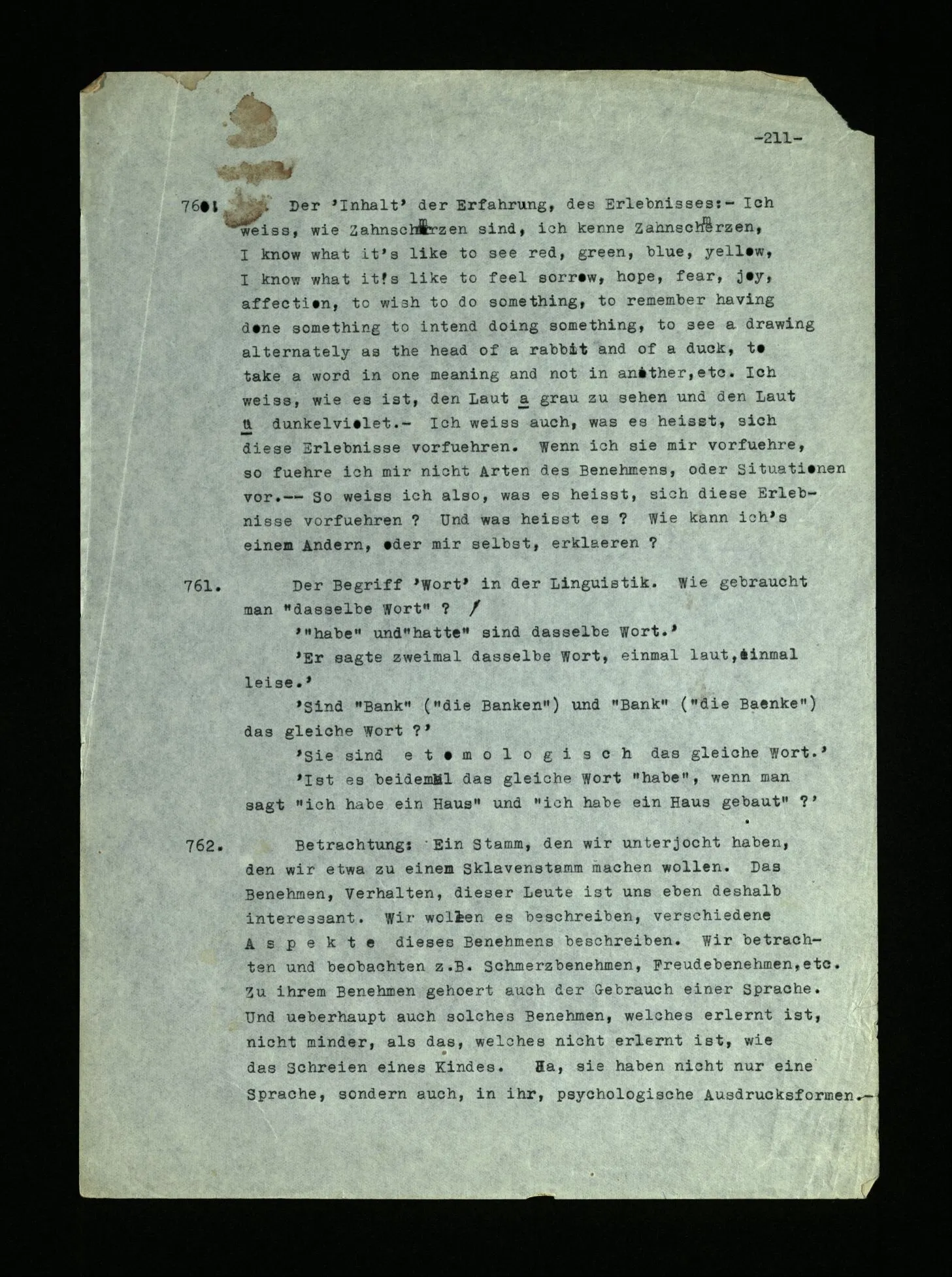1774. Wenn jemand sagt: Die Form, die Farbe, die Organisation, der Ausdruck, sind doch alle, offenbar, (für jeden Unvoreingenommenen) Eigenschaften, Züge, des subjektiv Gesehenen, des unmittelbaren Gesichtsobjekts, – so verrät ihn hier das Wort “offenbar”. “Offenbar” ist es darum, weil’s Jeder zugibt; und er gibt es nur durch den Sprachgebrauch zu. Man begründet also hier einen Satz durch ein Bild.