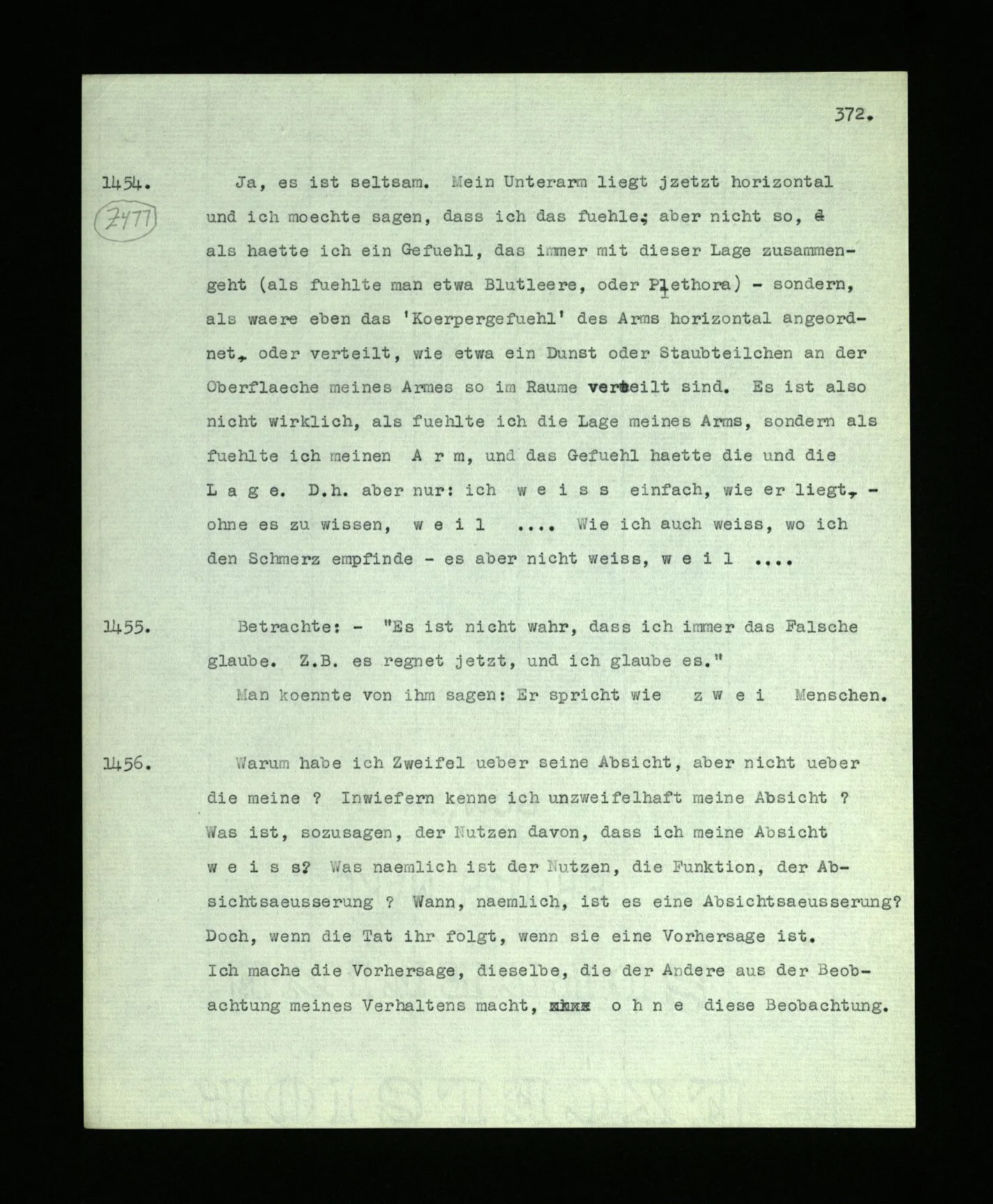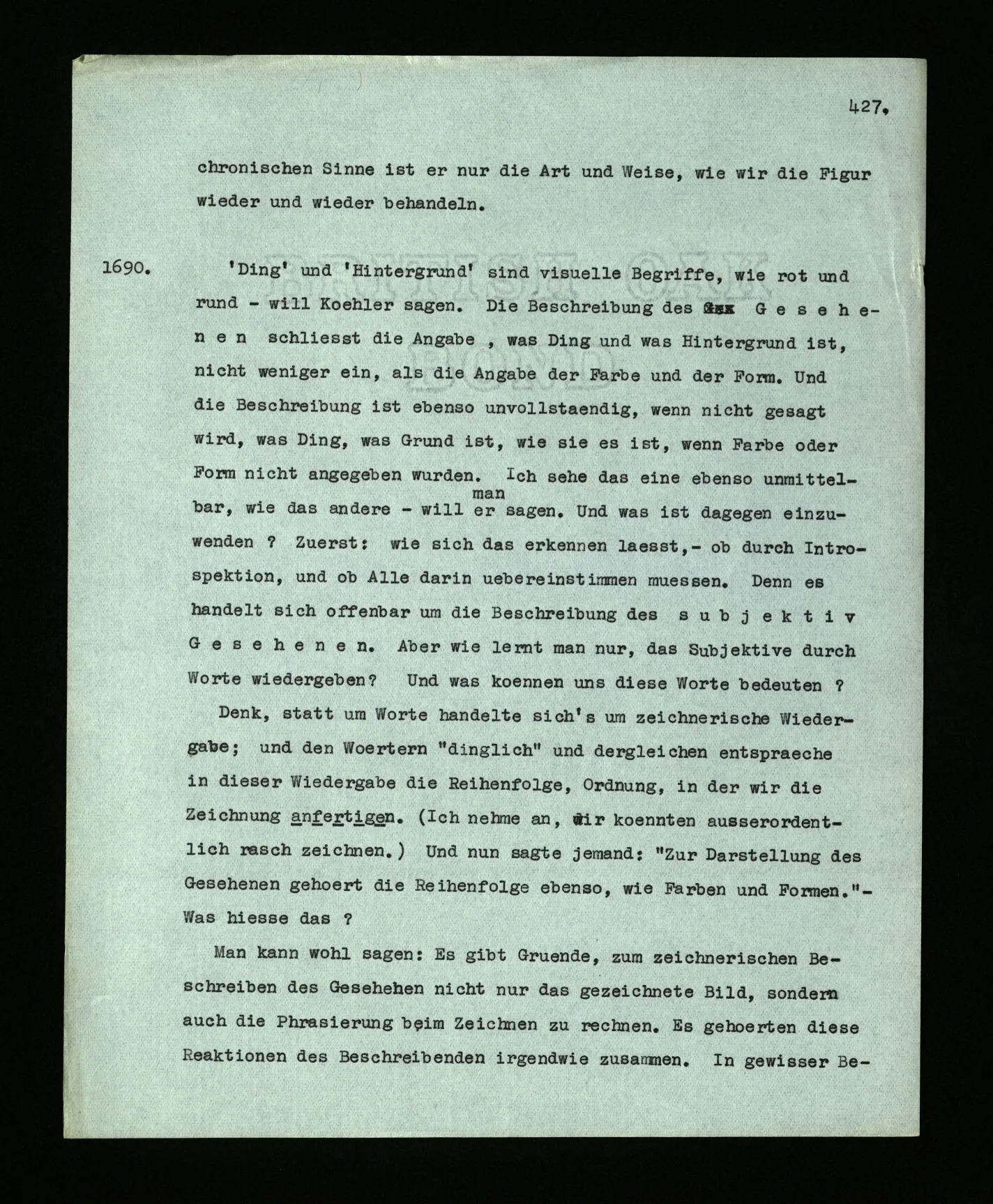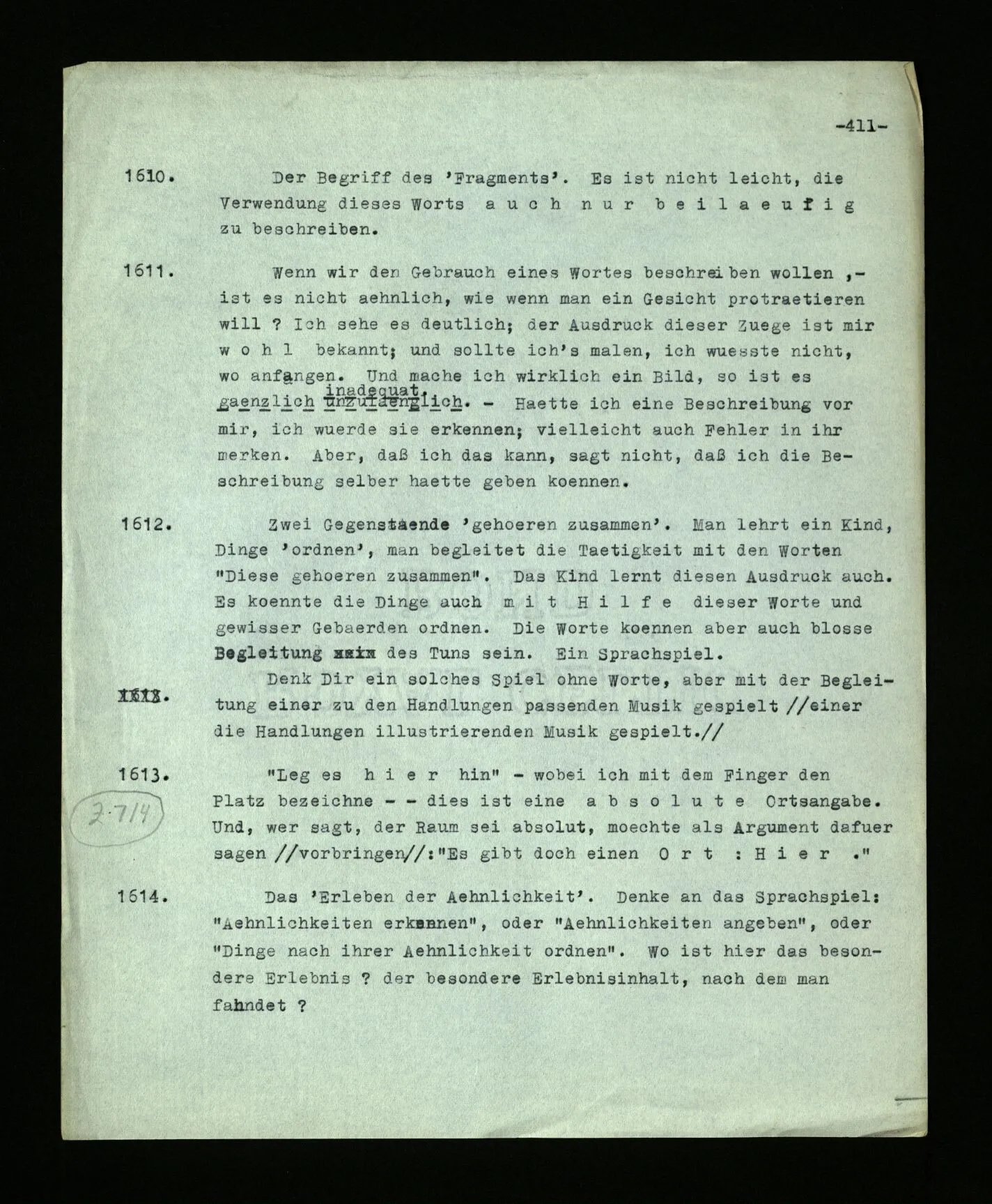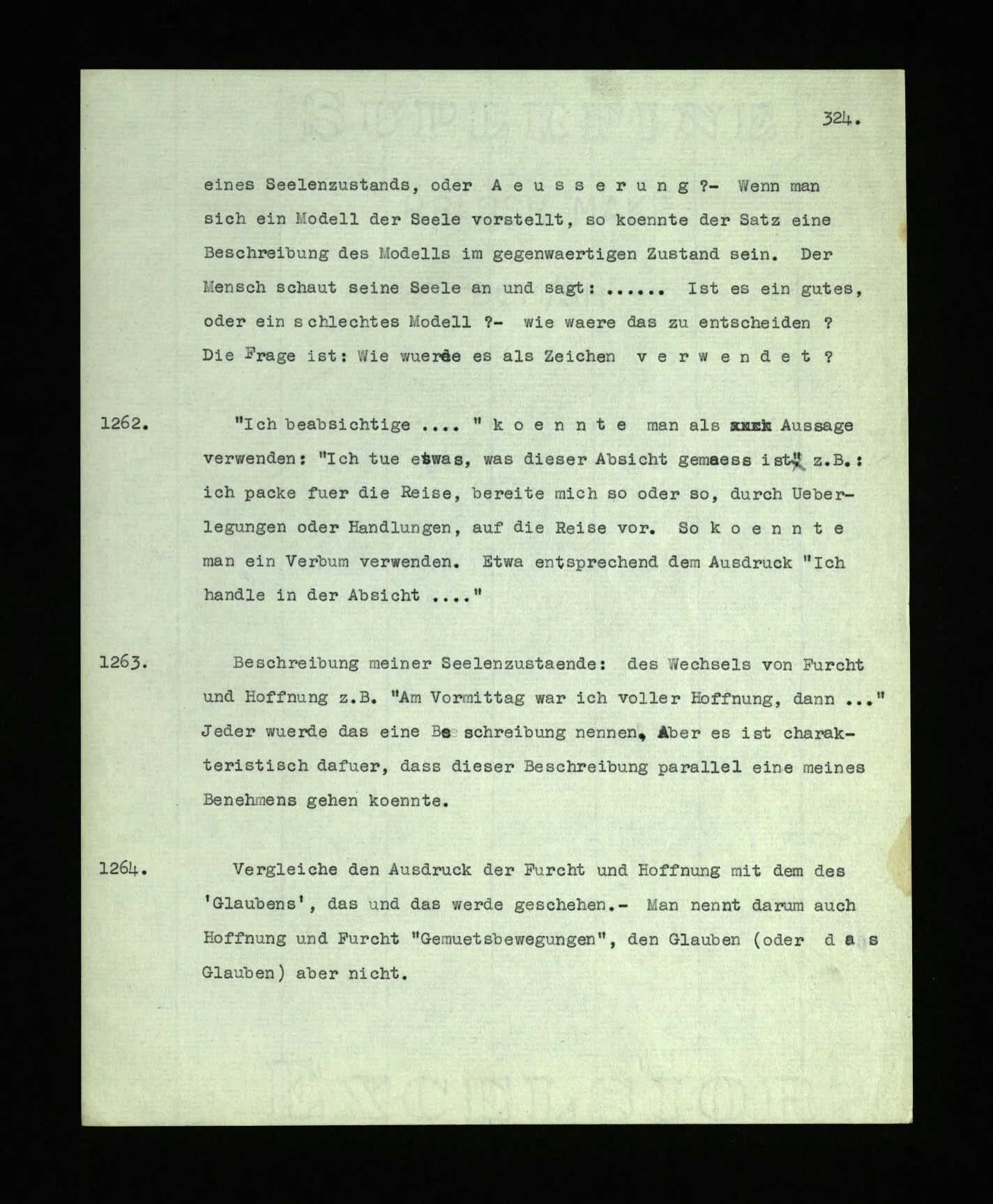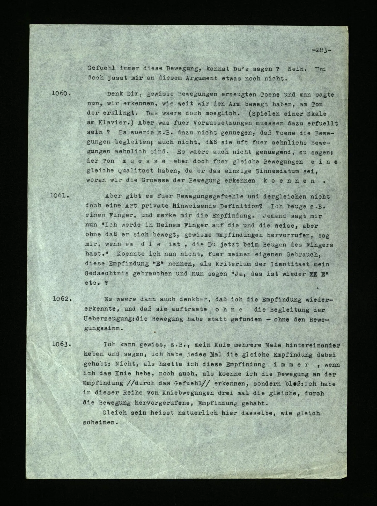 1774. Wenn jemand sagt: Die Form, die Farbe, die Organisation, der Ausdruck, sind doch alle, offenbar, (für jeden Unvoreingenommenen) Eigenschaften, Züge, des subjektiv Gesehenen, des unmittelbaren Gesichtsobjekts, – so verrät ihn hier das Wort “offenbar”. “Offenbar” ist es darum, weil’s Jeder zugibt; und er gibt es nur durch den Sprachgebrauch zu. Man begründet also hier einen Satz durch ein Bild.