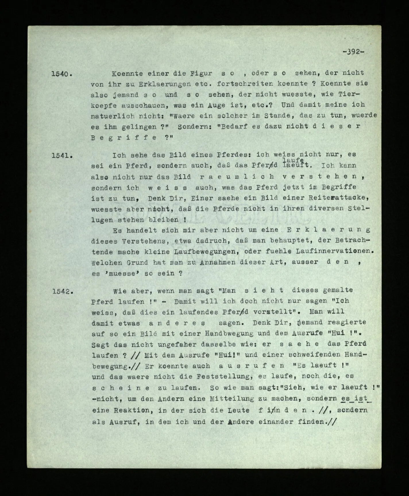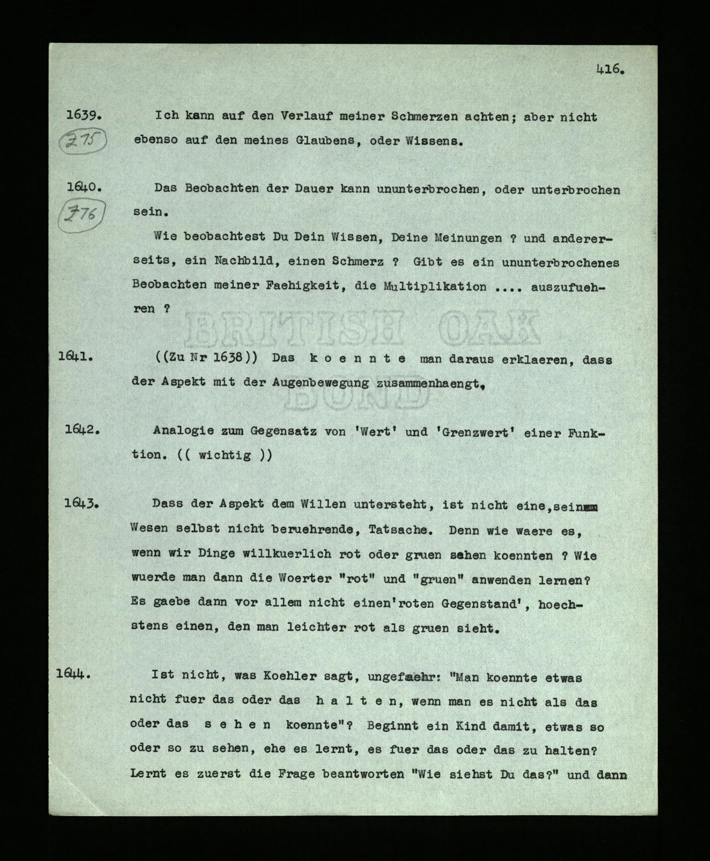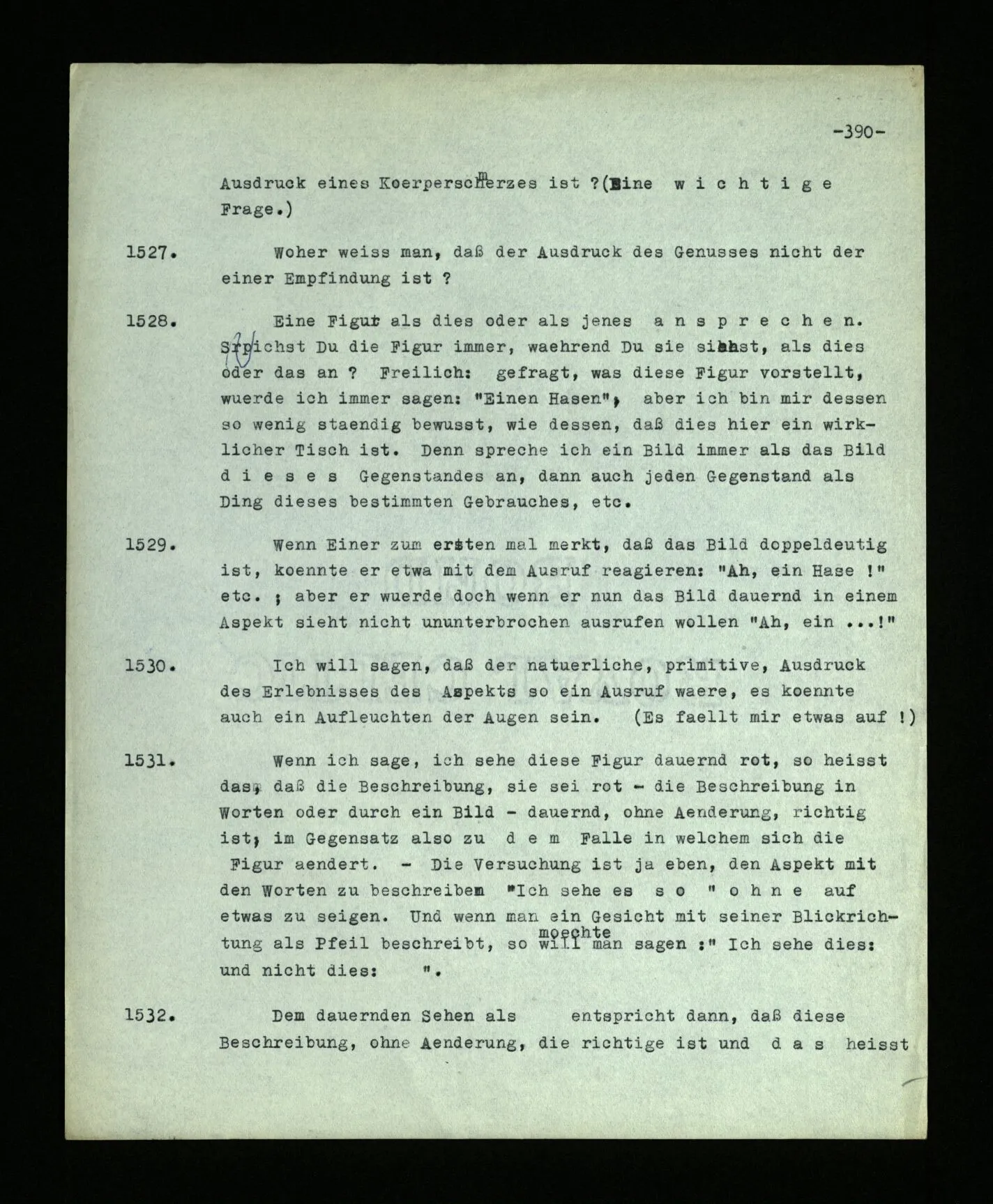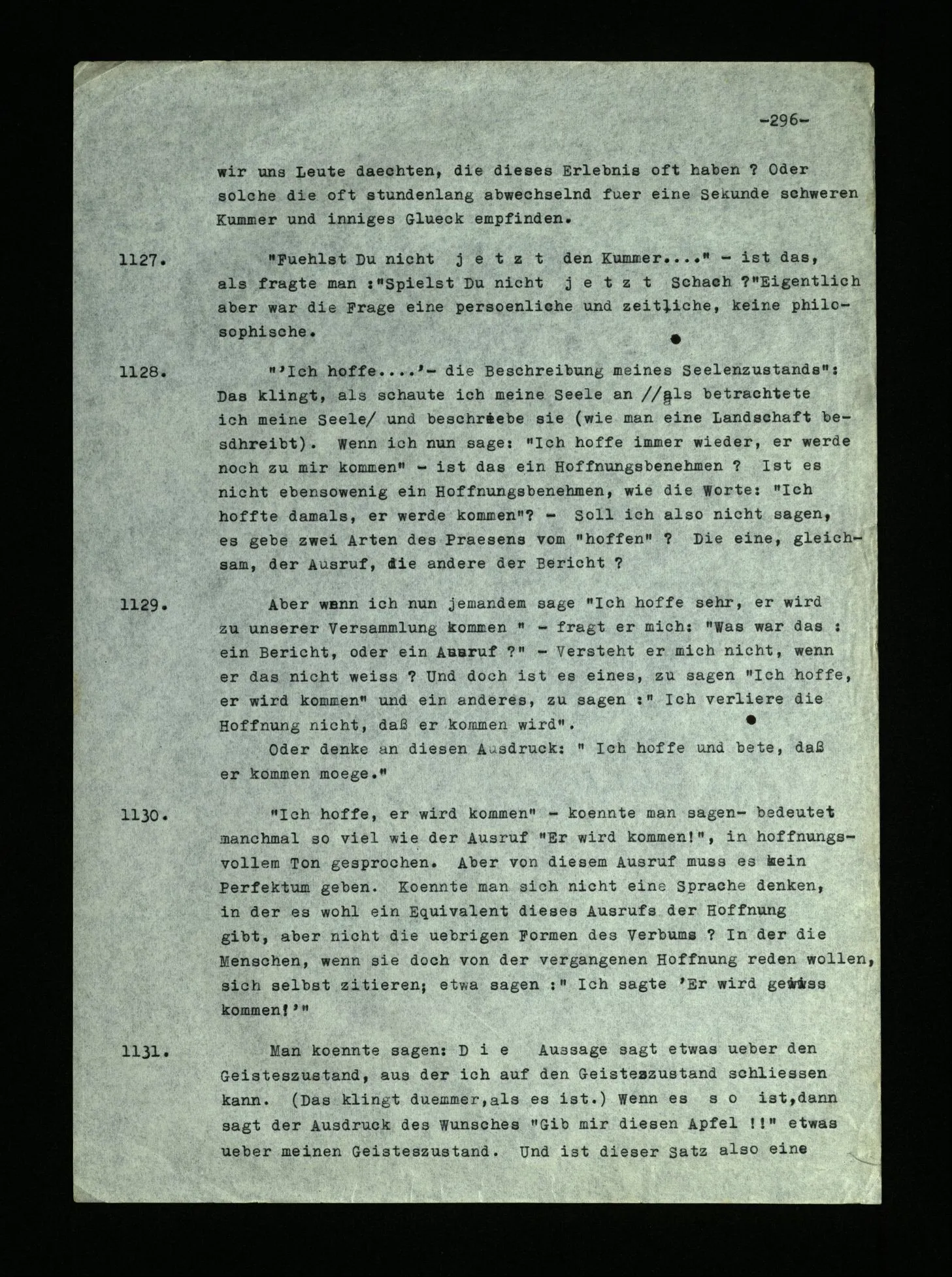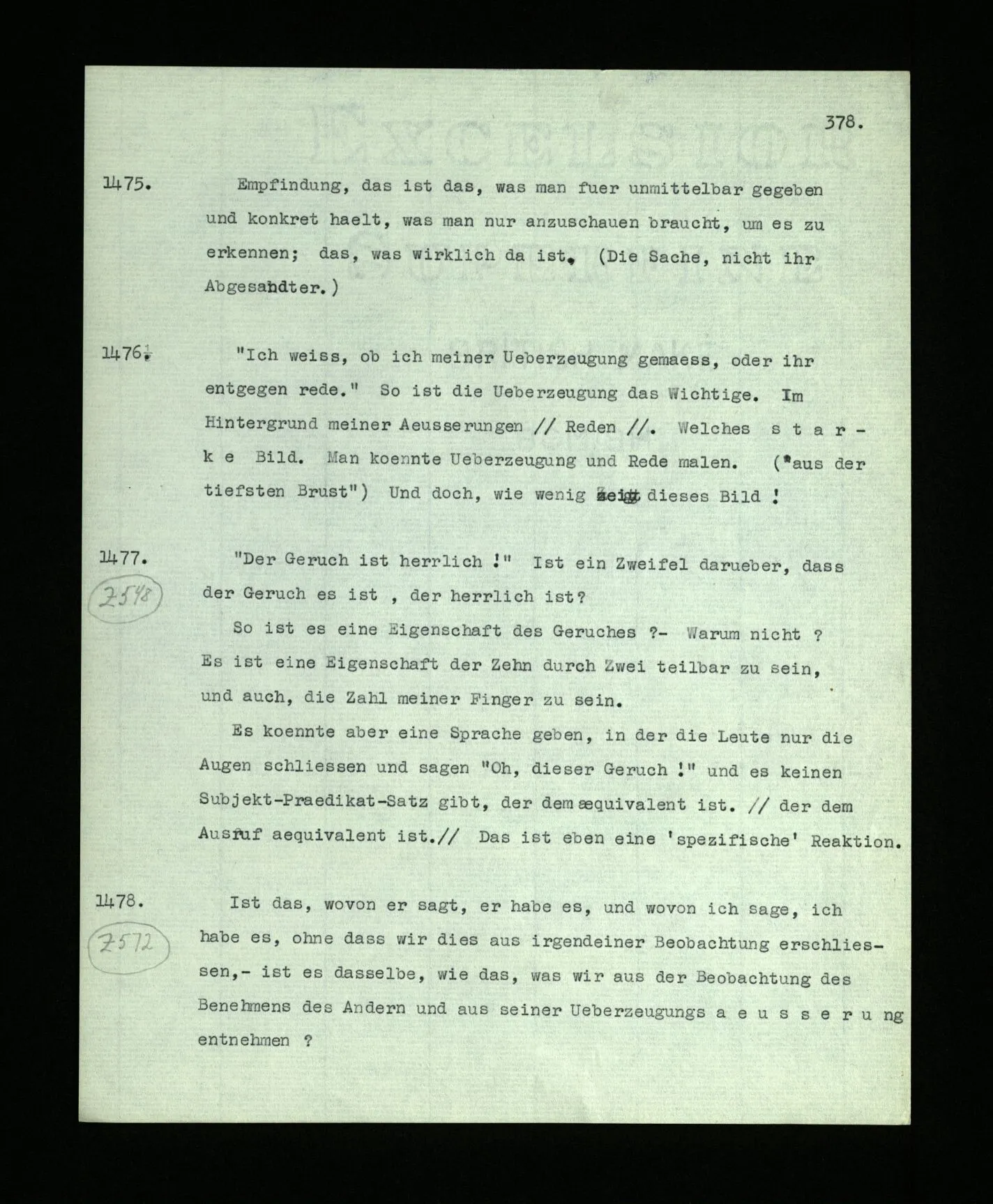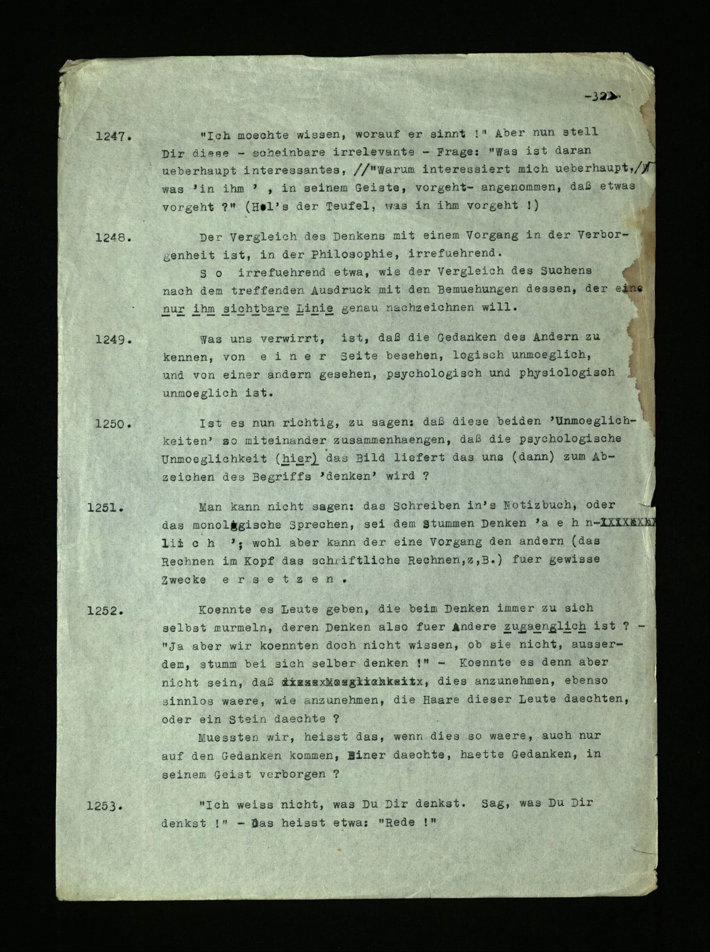 1774. Wenn jemand sagt: Die Form, die Farbe, die Organisation, der Ausdruck, sind doch alle, offenbar, (für jeden Unvoreingenommenen) Eigenschaften, Züge, des subjektiv Gesehenen, des unmittelbaren Gesichtsobjekts, – so verrät ihn hier das Wort “offenbar”. “Offenbar” ist es darum, weil’s Jeder zugibt; und er gibt es nur durch den Sprachgebrauch zu. Man begründet also hier einen Satz durch ein Bild.