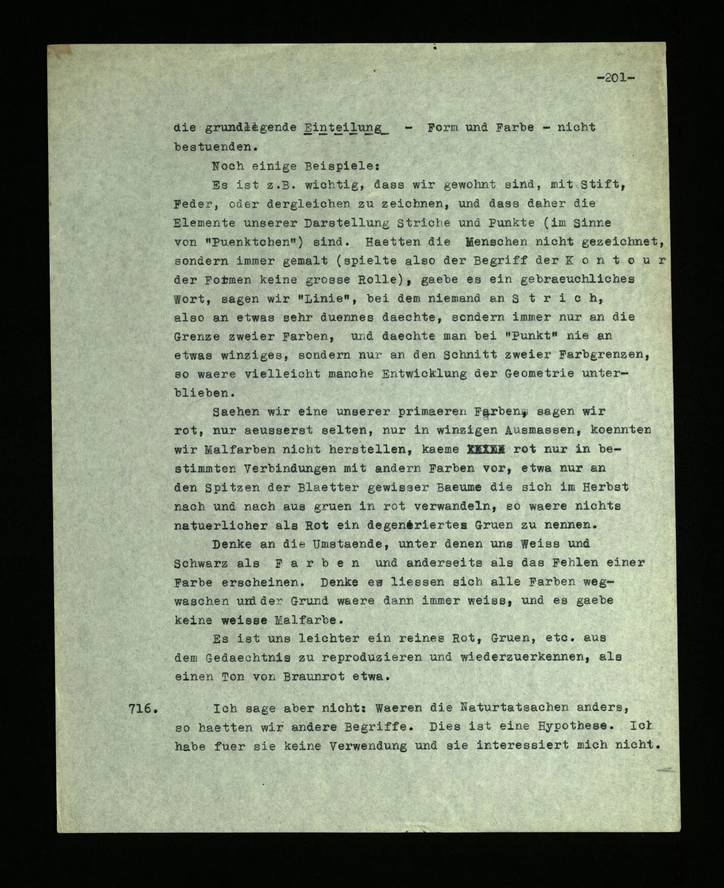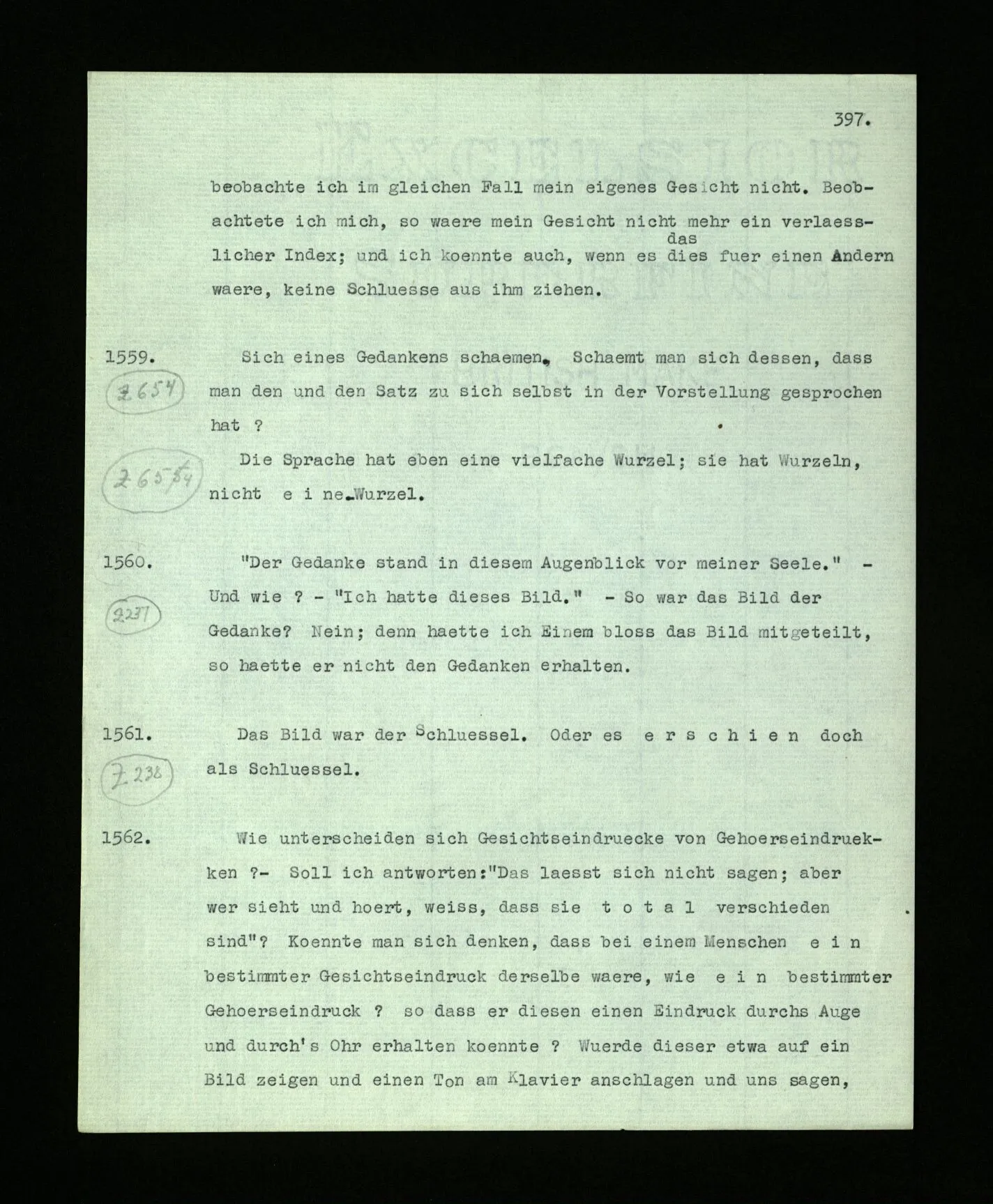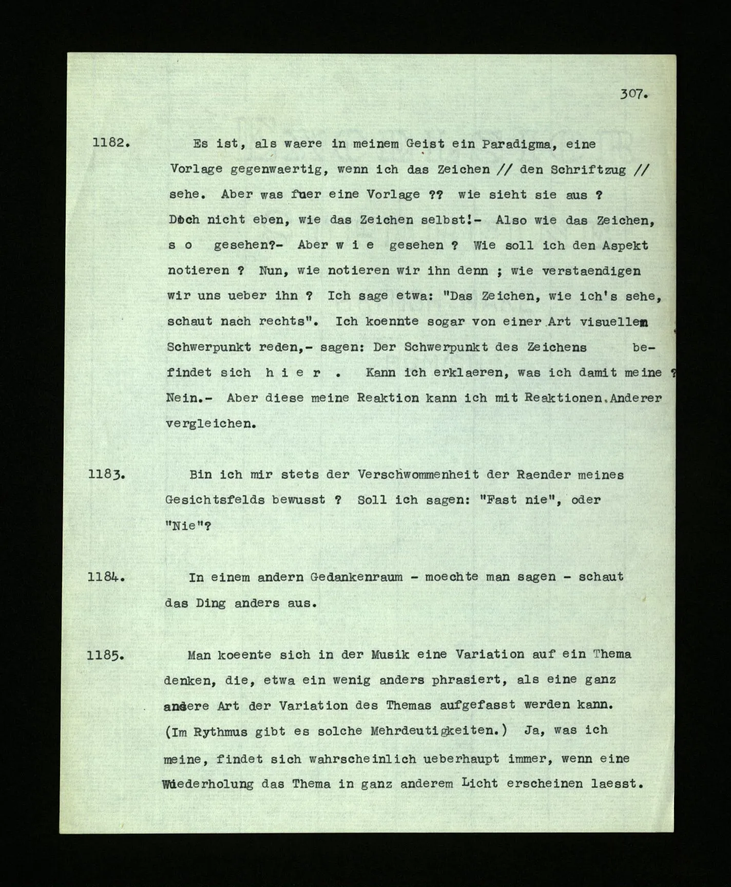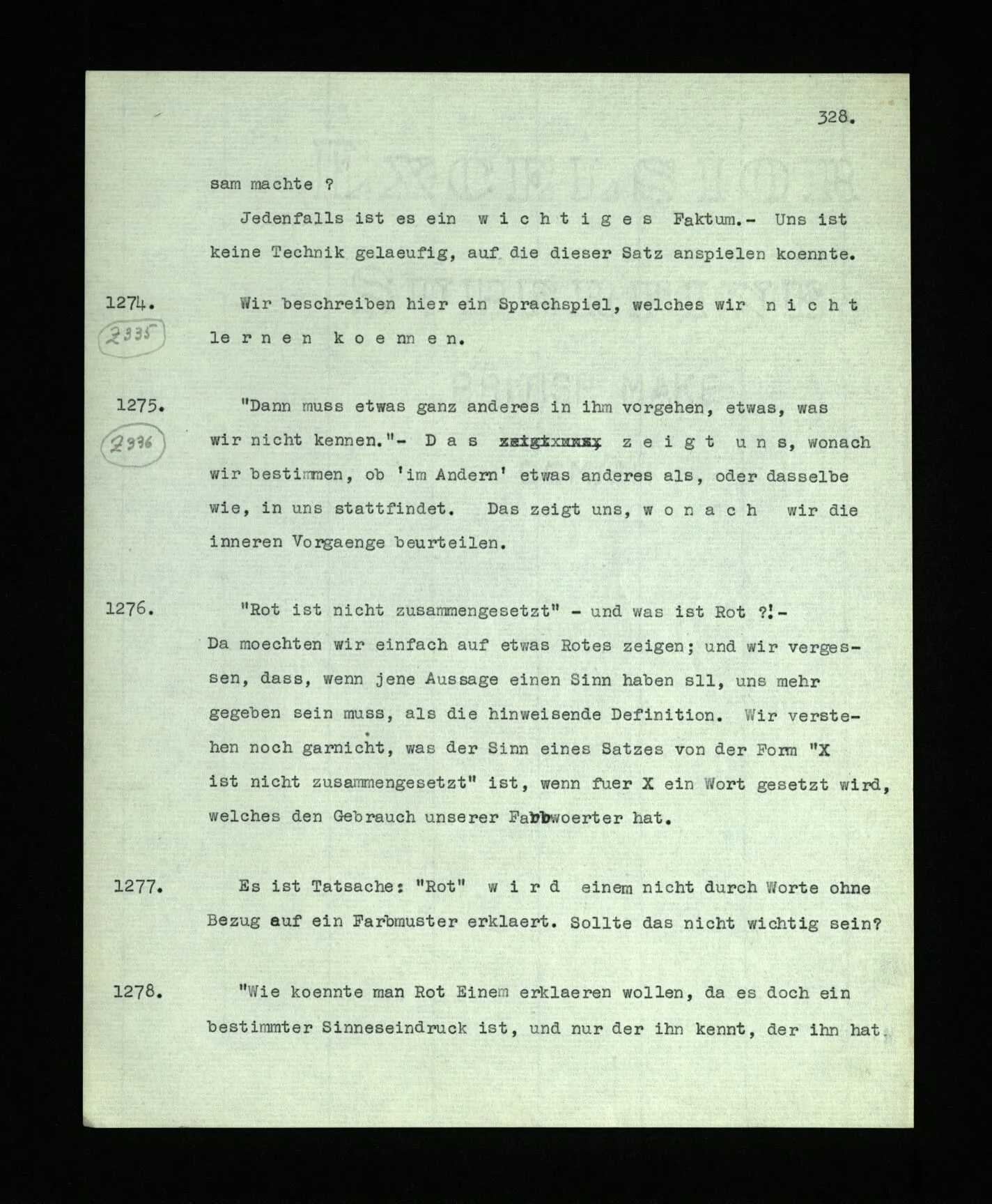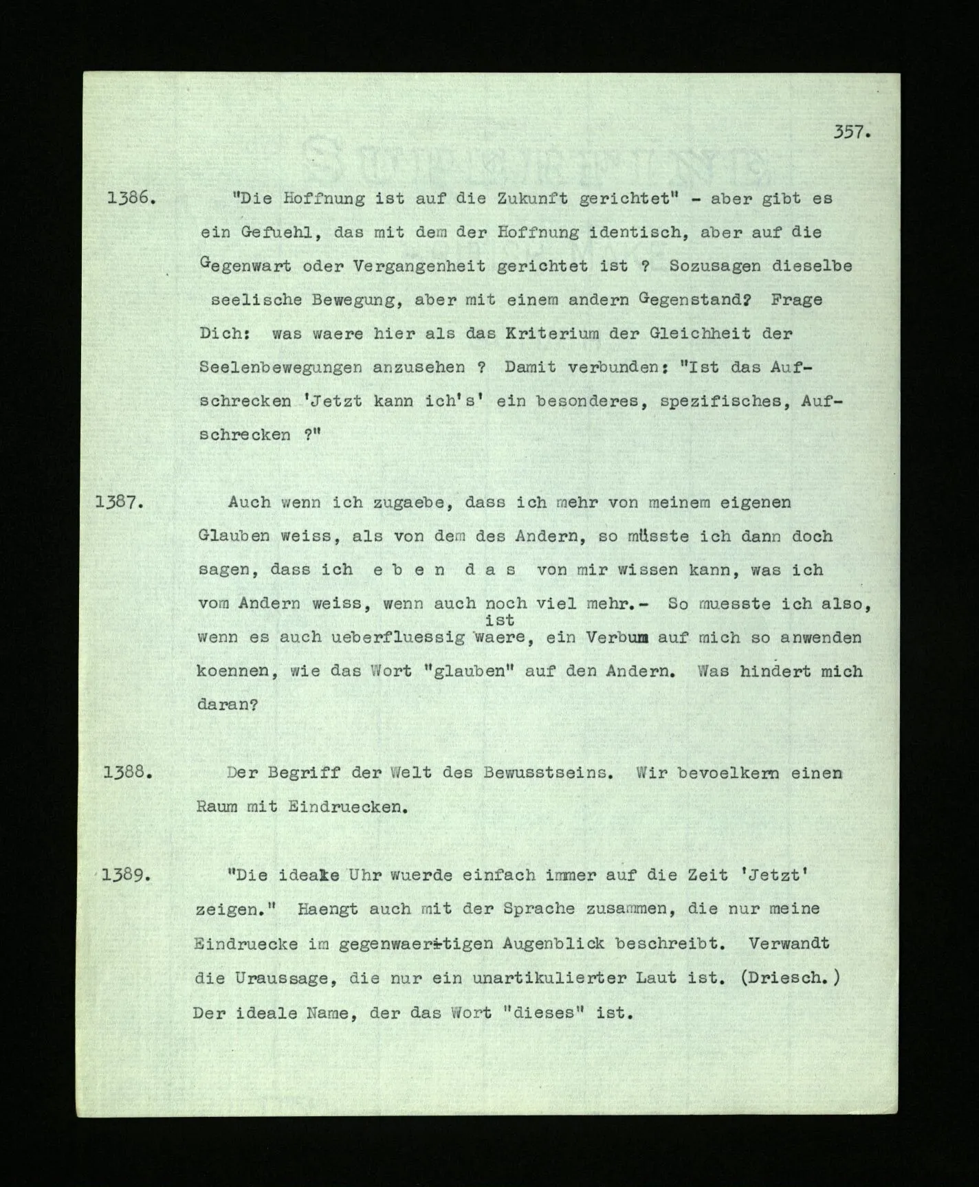 1774. Wenn jemand sagt: Die Form, die Farbe, die Organisation, der Ausdruck, sind doch alle, offenbar, (für jeden Unvoreingenommenen) Eigenschaften, Züge, des subjektiv Gesehenen, des unmittelbaren Gesichtsobjekts, – so verrät ihn hier das Wort “offenbar”. “Offenbar” ist es darum, weil’s Jeder zugibt; und er gibt es nur durch den Sprachgebrauch zu. Man begründet also hier einen Satz durch ein Bild.