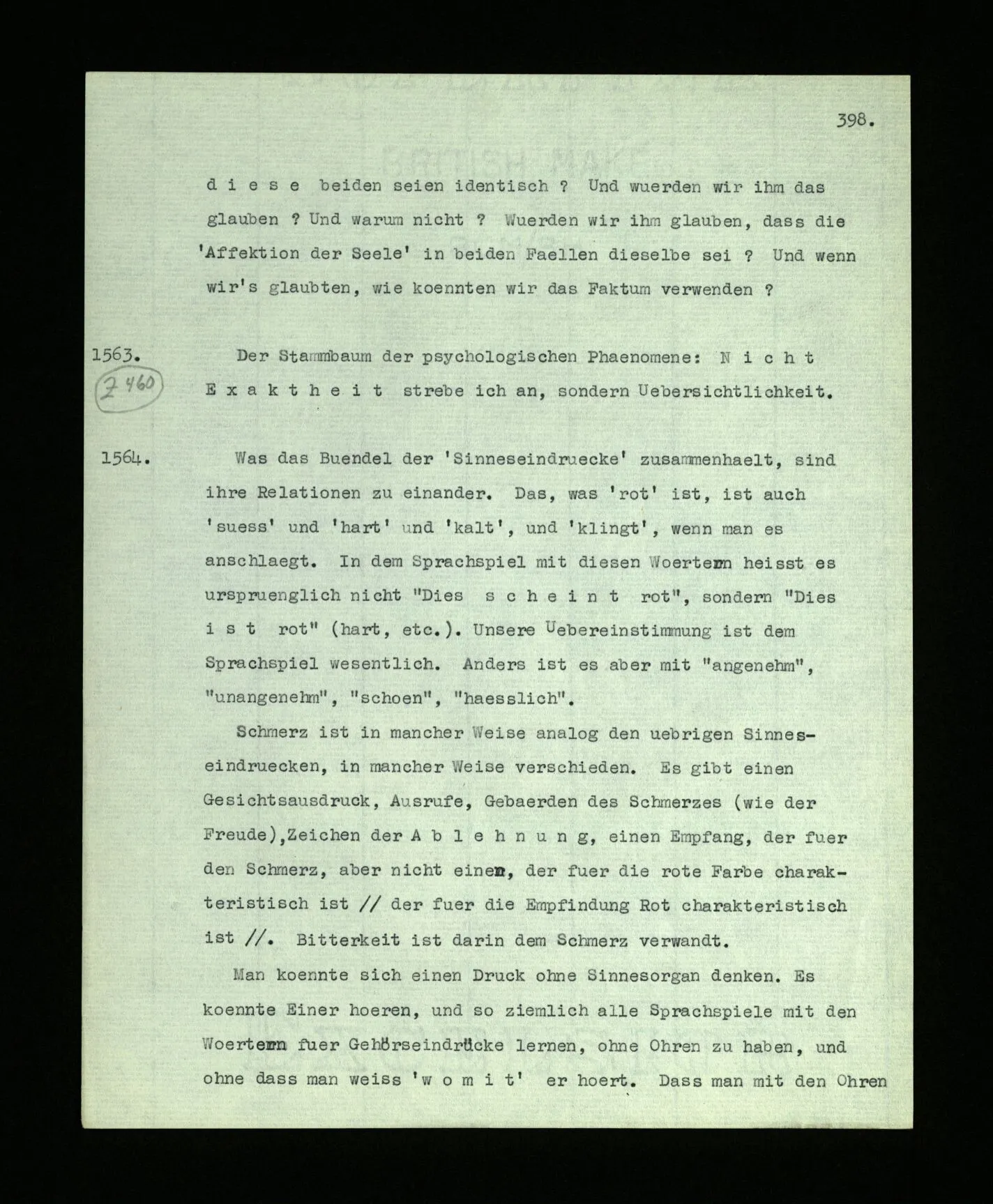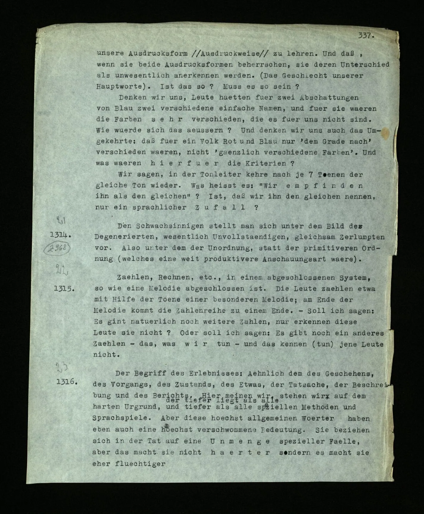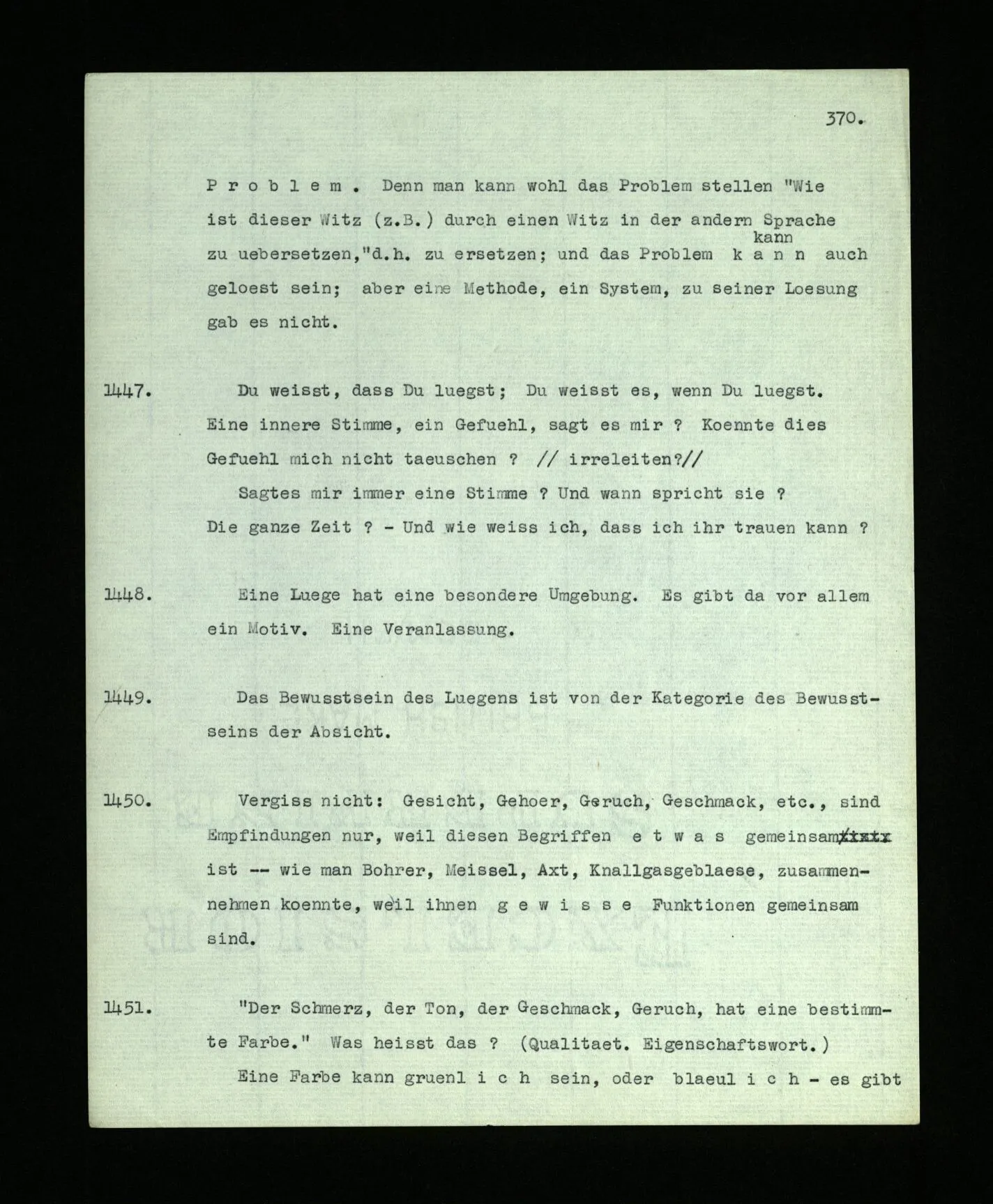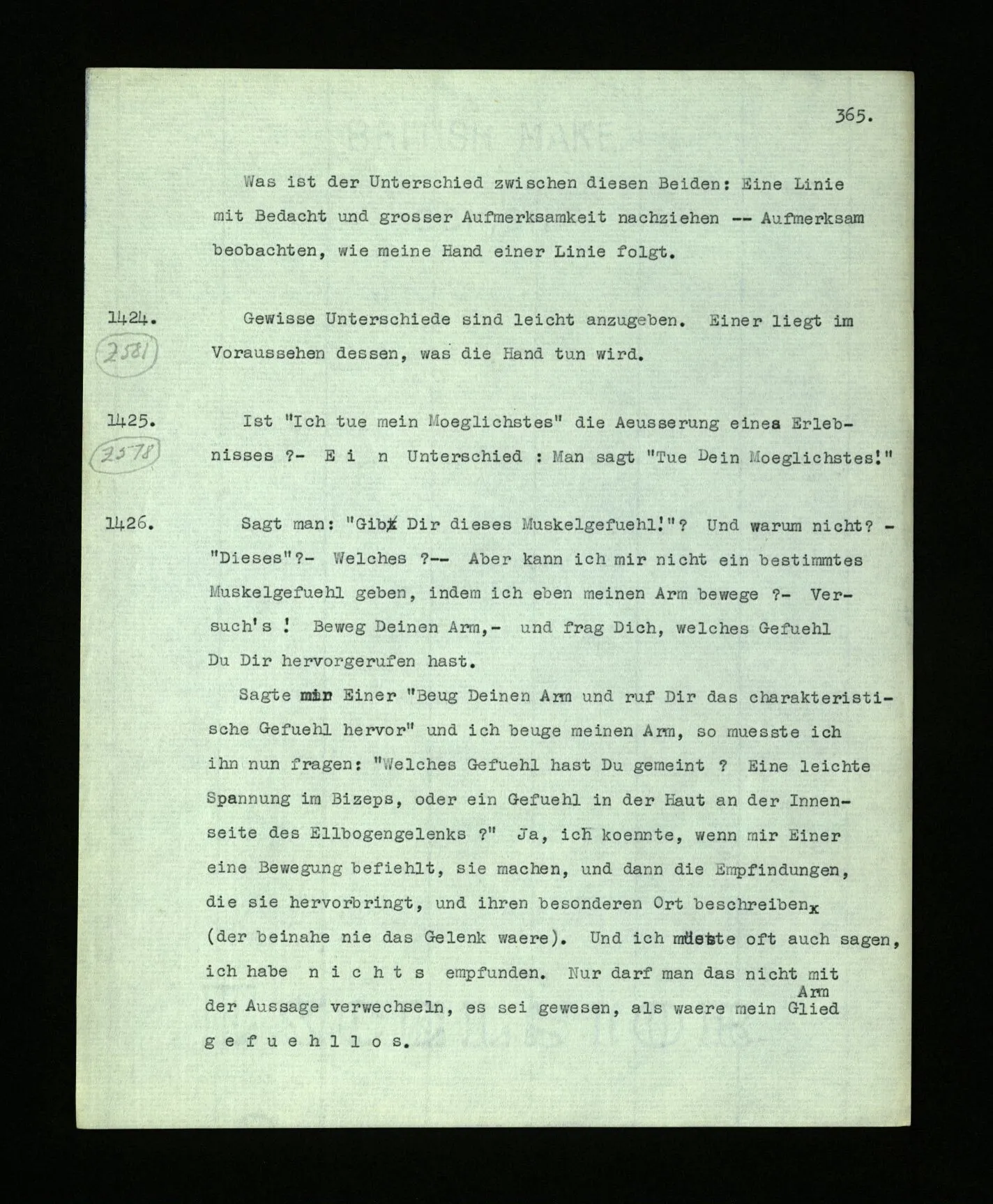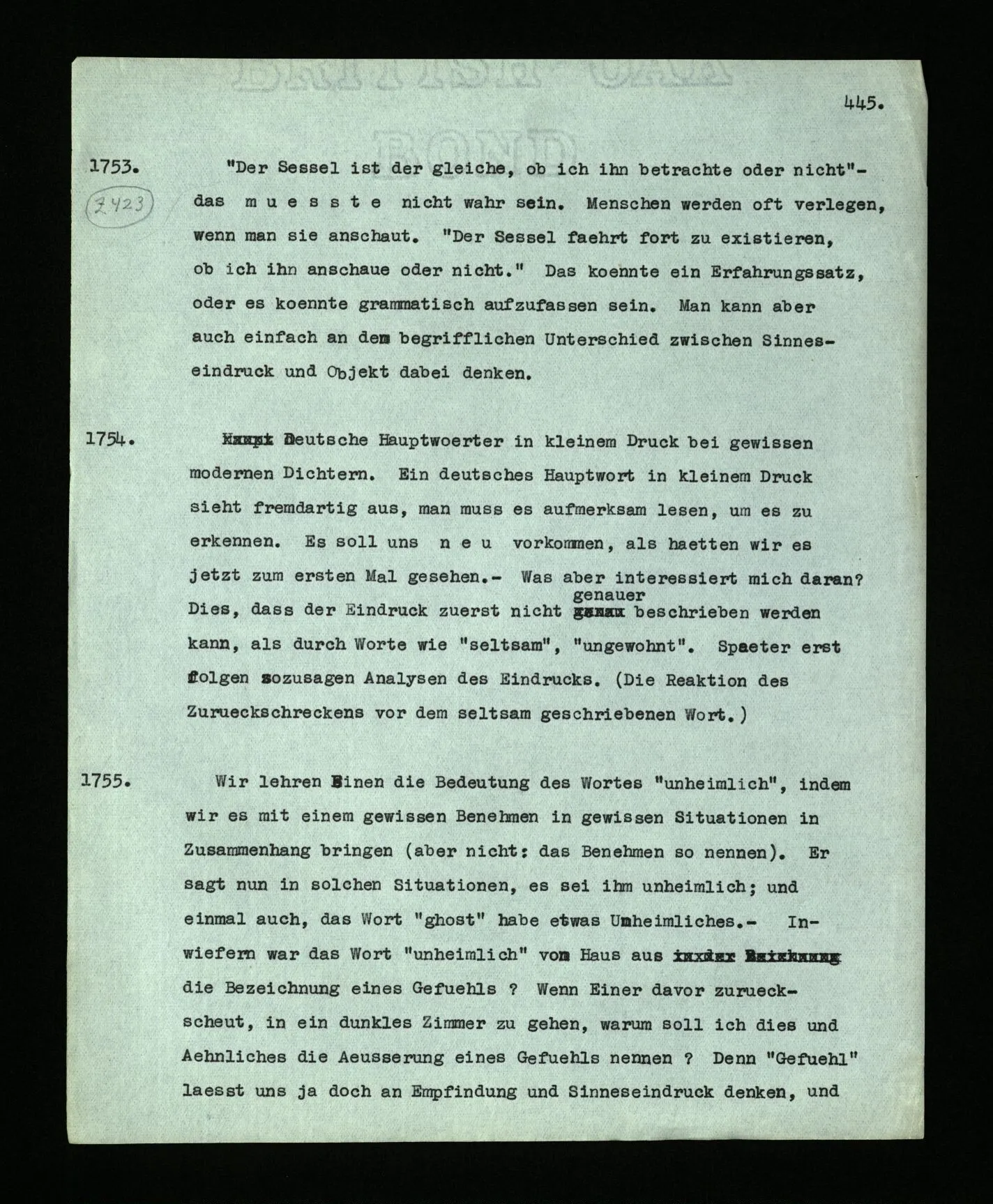 1774. Wenn jemand sagt: Die Form, die Farbe, die Organisation, der Ausdruck, sind doch alle, offenbar, (für jeden Unvoreingenommenen) Eigenschaften, Züge, des subjektiv Gesehenen, des unmittelbaren Gesichtsobjekts, – so verrät ihn hier das Wort “offenbar”. “Offenbar” ist es darum, weil’s Jeder zugibt; und er gibt es nur durch den Sprachgebrauch zu. Man begründet also hier einen Satz durch ein Bild.