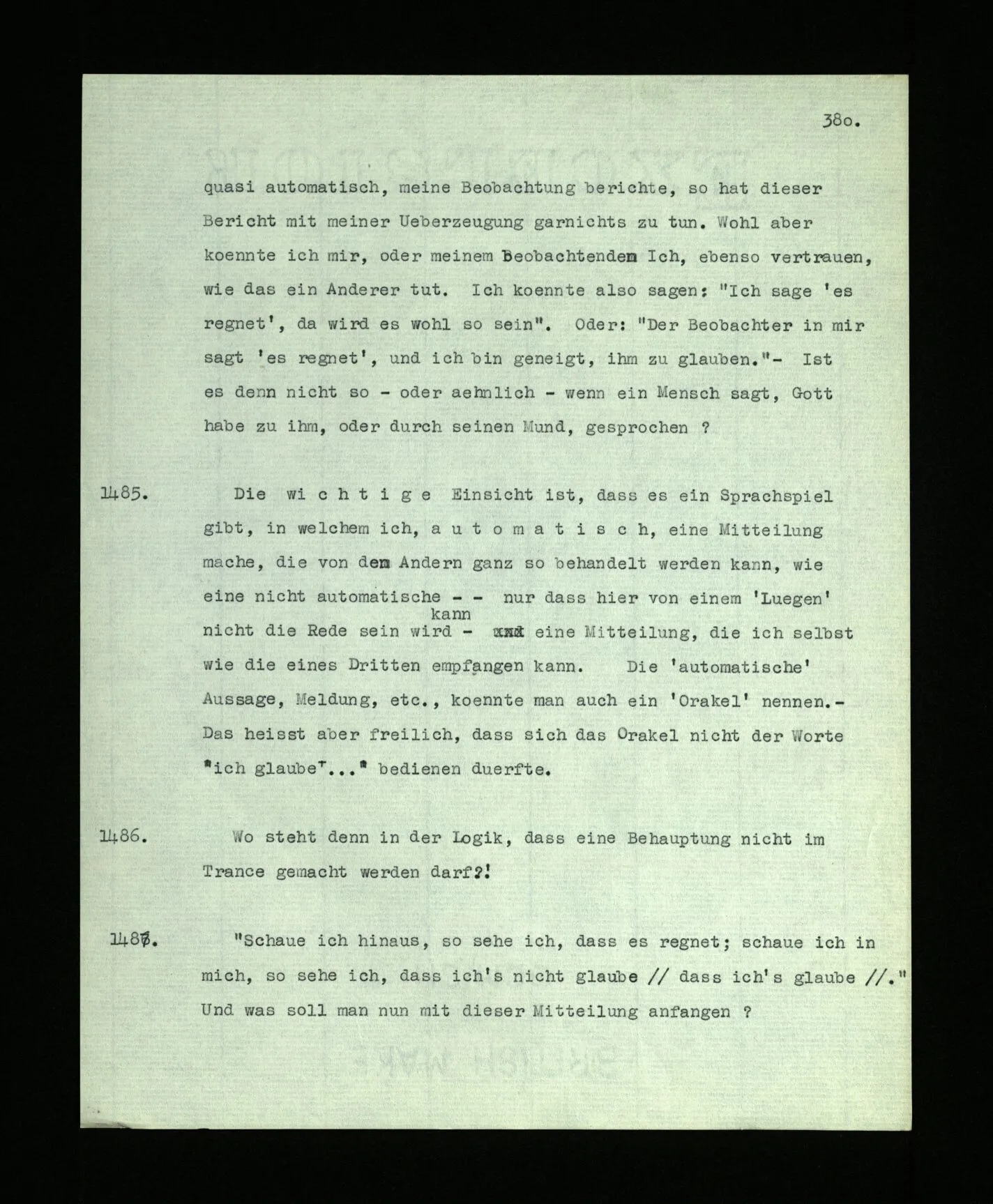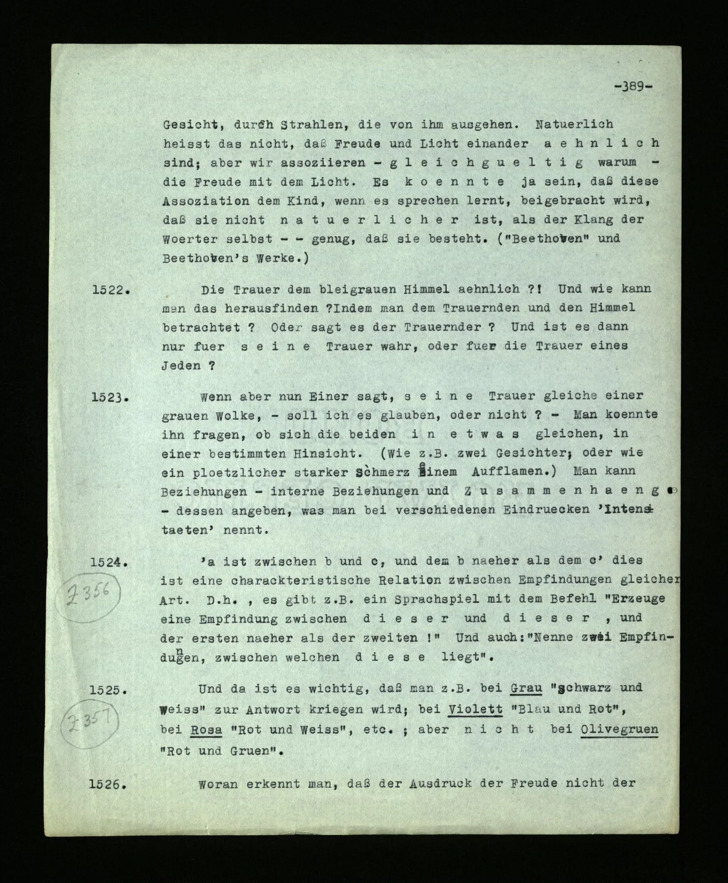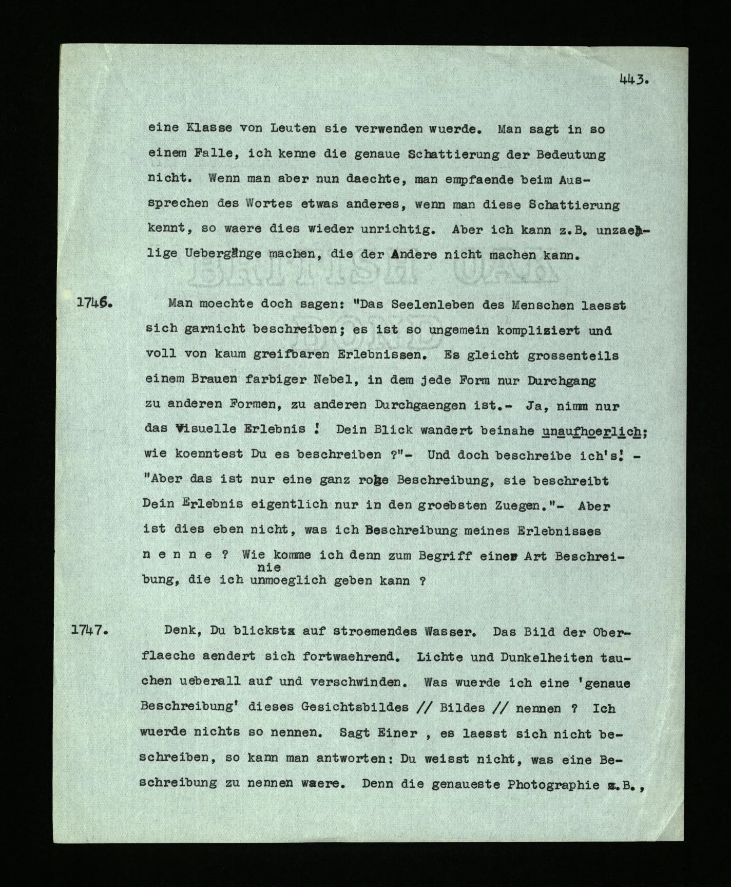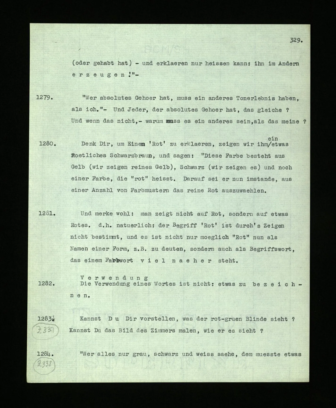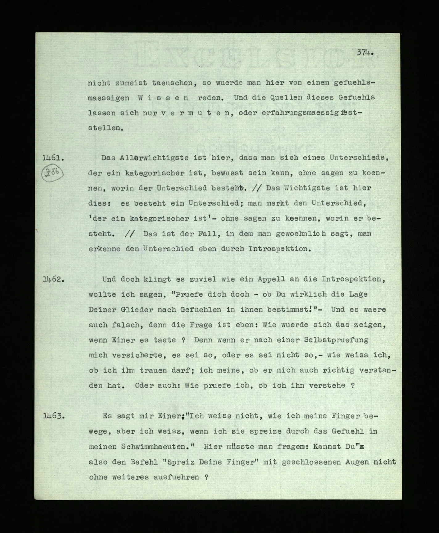 1774. Wenn jemand sagt: Die Form, die Farbe, die Organisation, der Ausdruck, sind doch alle, offenbar, (für jeden Unvoreingenommenen) Eigenschaften, Züge, des subjektiv Gesehenen, des unmittelbaren Gesichtsobjekts, – so verrät ihn hier das Wort “offenbar”. “Offenbar” ist es darum, weil’s Jeder zugibt; und er gibt es nur durch den Sprachgebrauch zu. Man begründet also hier einen Satz durch ein Bild.