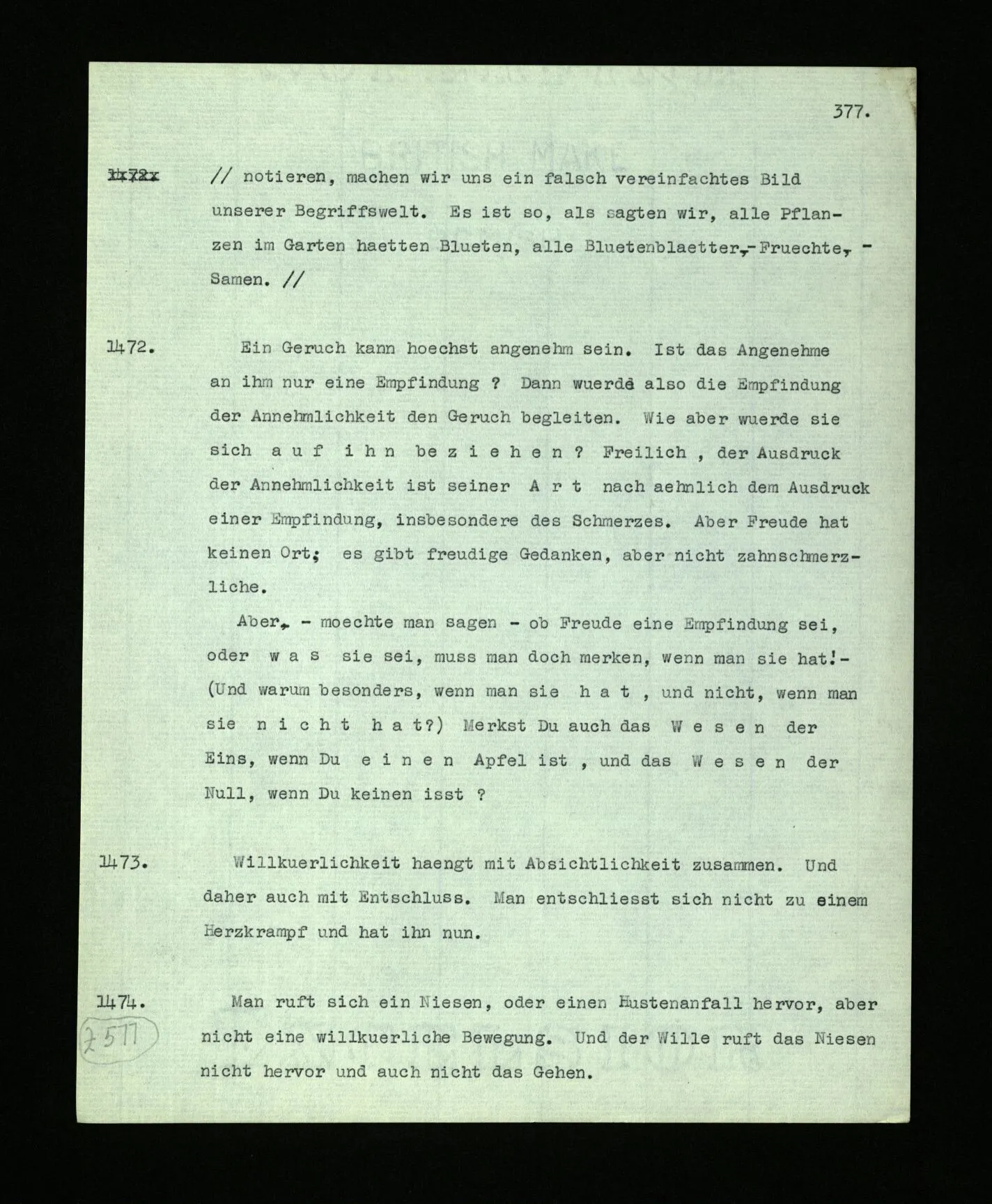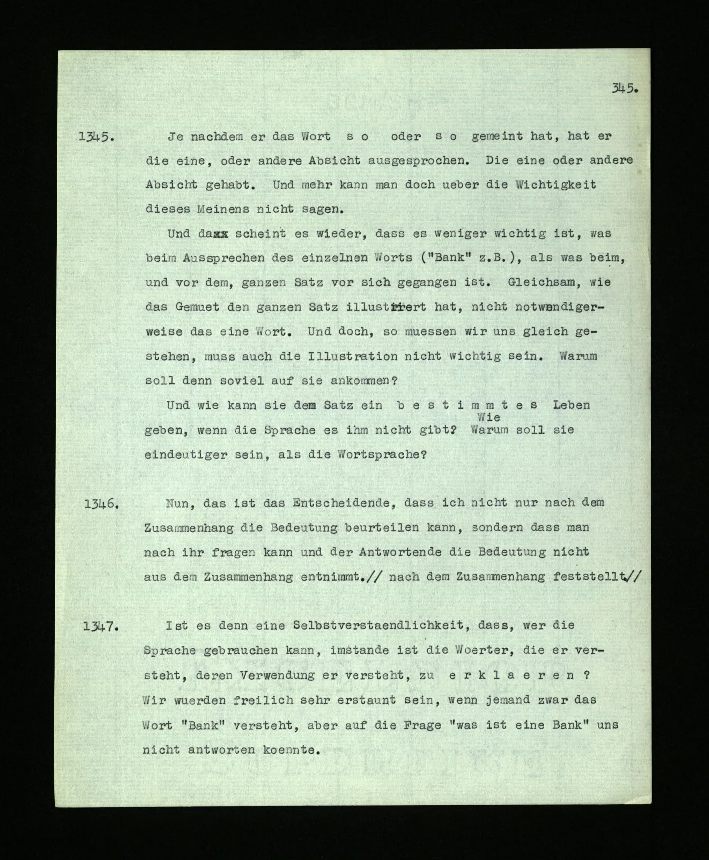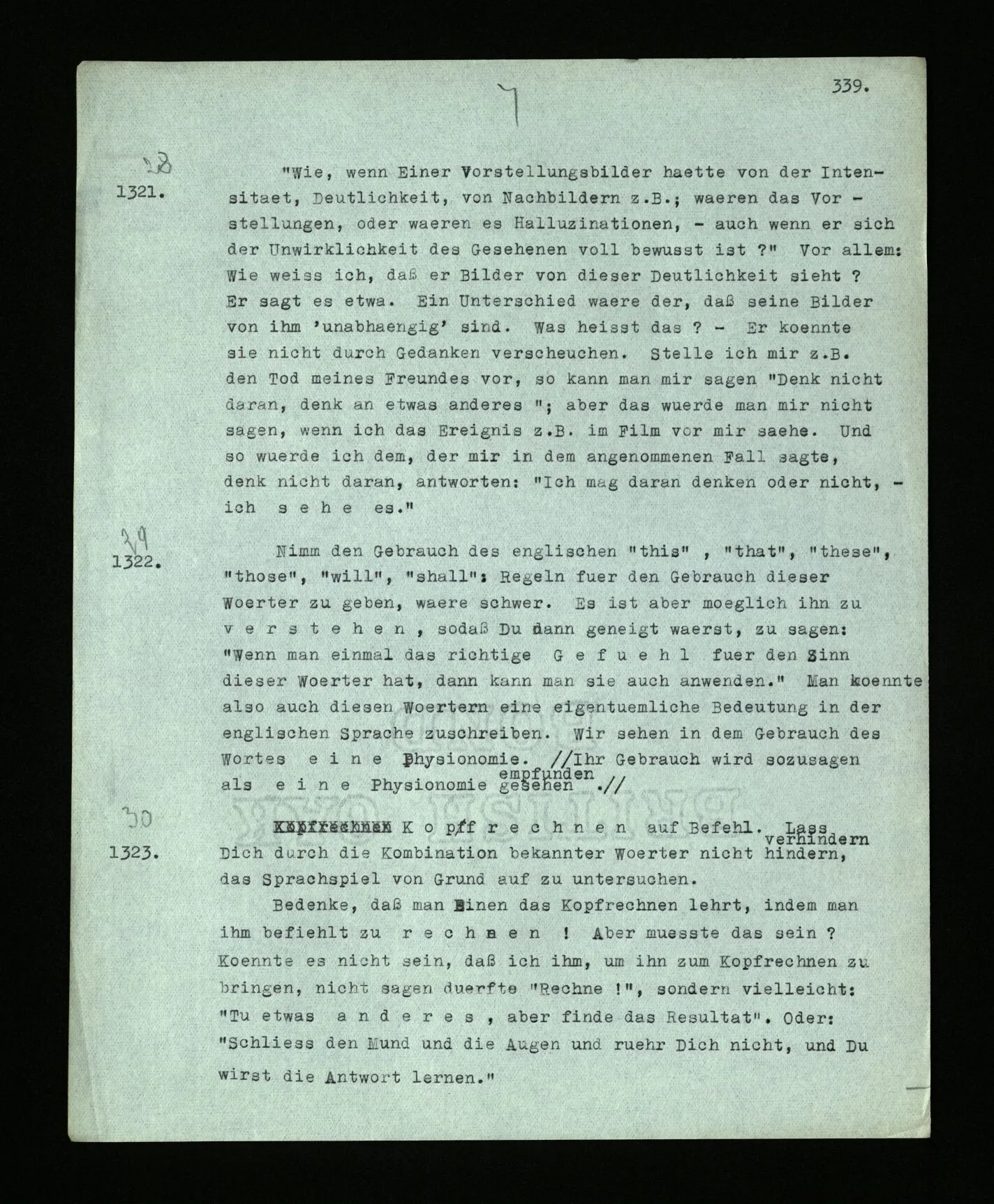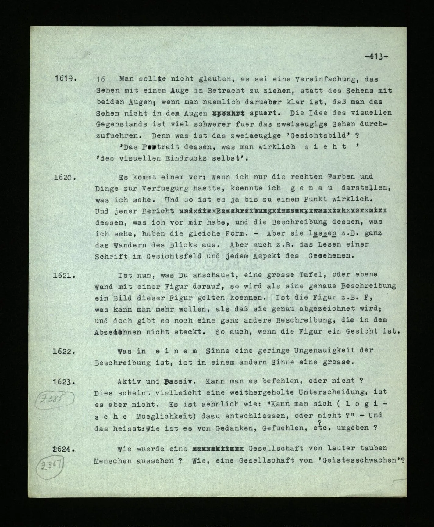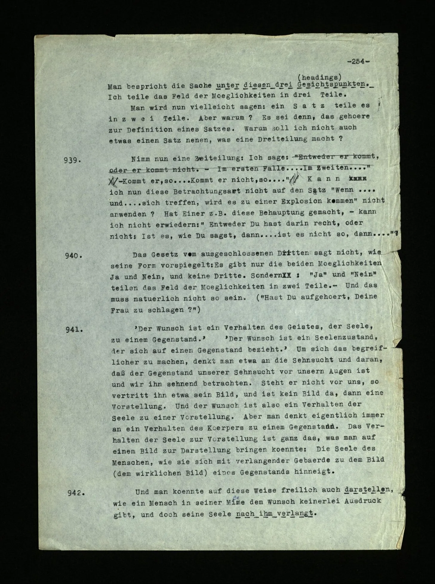 1774. Wenn jemand sagt: Die Form, die Farbe, die Organisation, der Ausdruck, sind doch alle, offenbar, (für jeden Unvoreingenommenen) Eigenschaften, Züge, des subjektiv Gesehenen, des unmittelbaren Gesichtsobjekts, – so verrät ihn hier das Wort “offenbar”. “Offenbar” ist es darum, weil’s Jeder zugibt; und er gibt es nur durch den Sprachgebrauch zu. Man begründet also hier einen Satz durch ein Bild.
