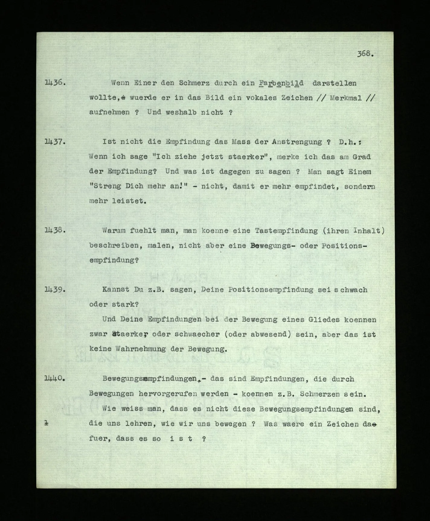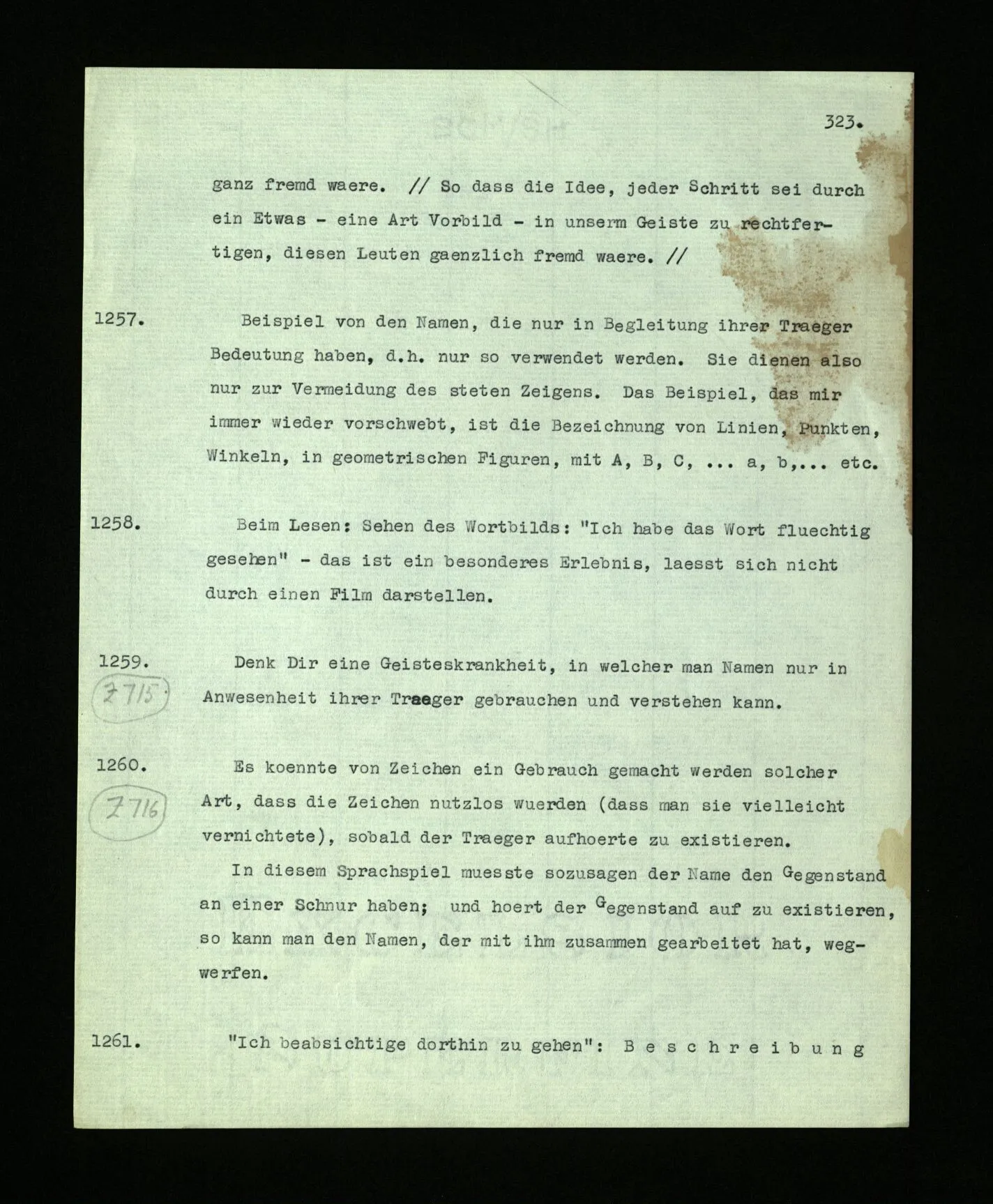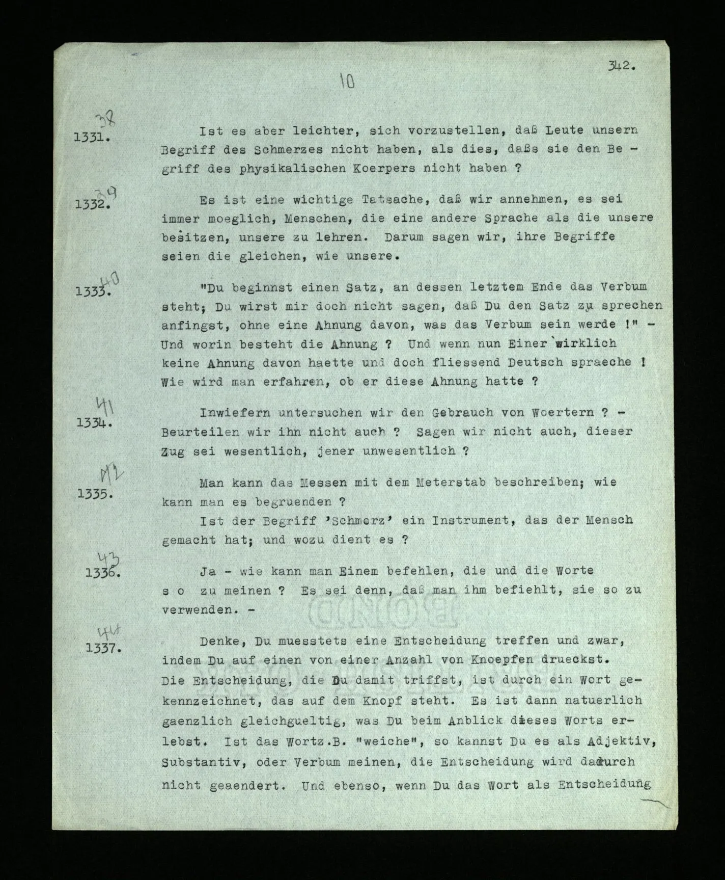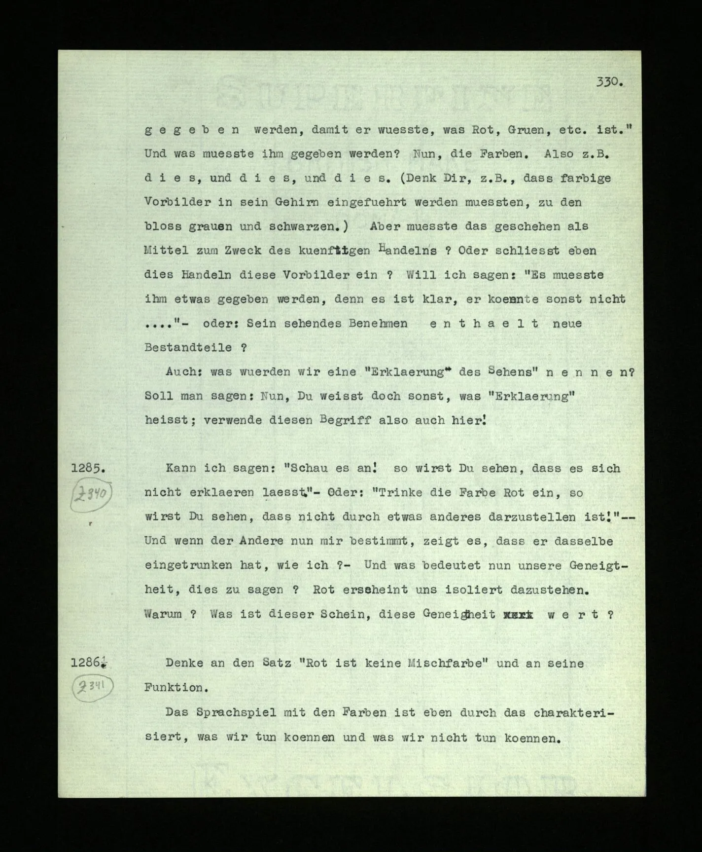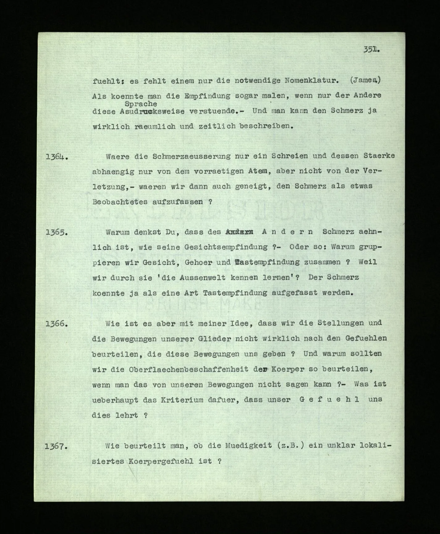 1774. Wenn jemand sagt: Die Form, die Farbe, die Organisation, der Ausdruck, sind doch alle, offenbar, (für jeden Unvoreingenommenen) Eigenschaften, Züge, des subjektiv Gesehenen, des unmittelbaren Gesichtsobjekts, – so verrät ihn hier das Wort “offenbar”. “Offenbar” ist es darum, weil’s Jeder zugibt; und er gibt es nur durch den Sprachgebrauch zu. Man begründet also hier einen Satz durch ein Bild.