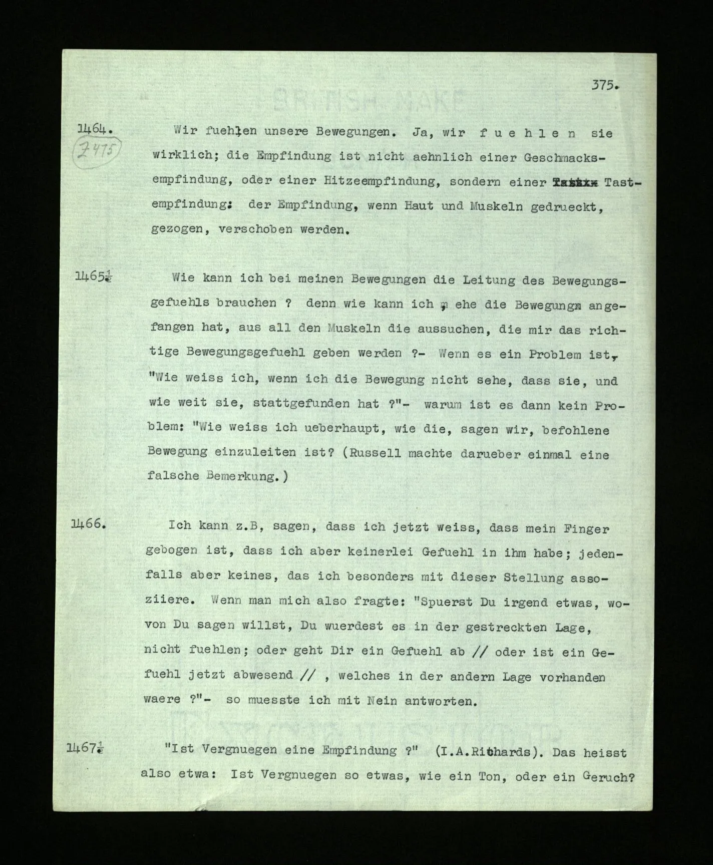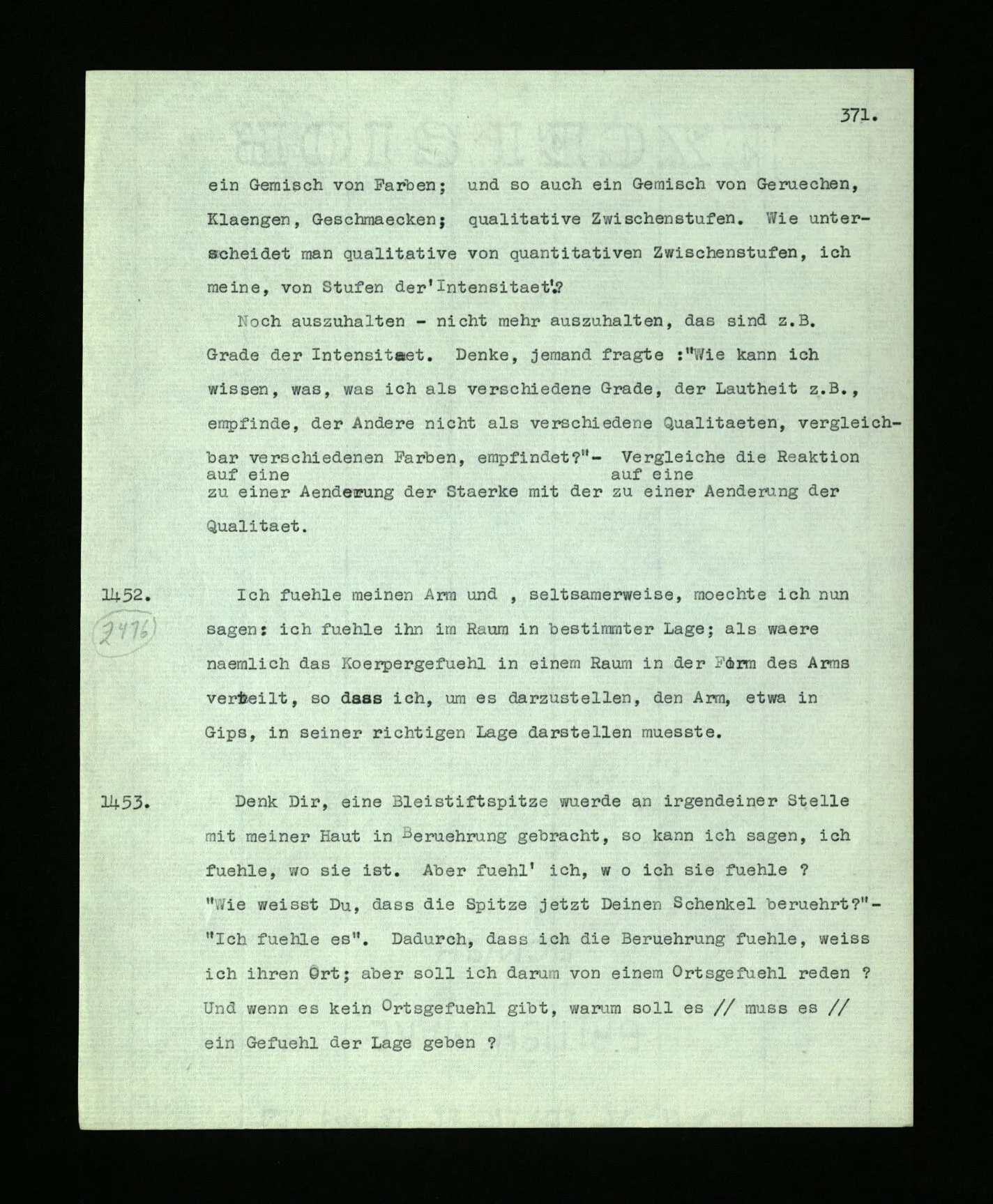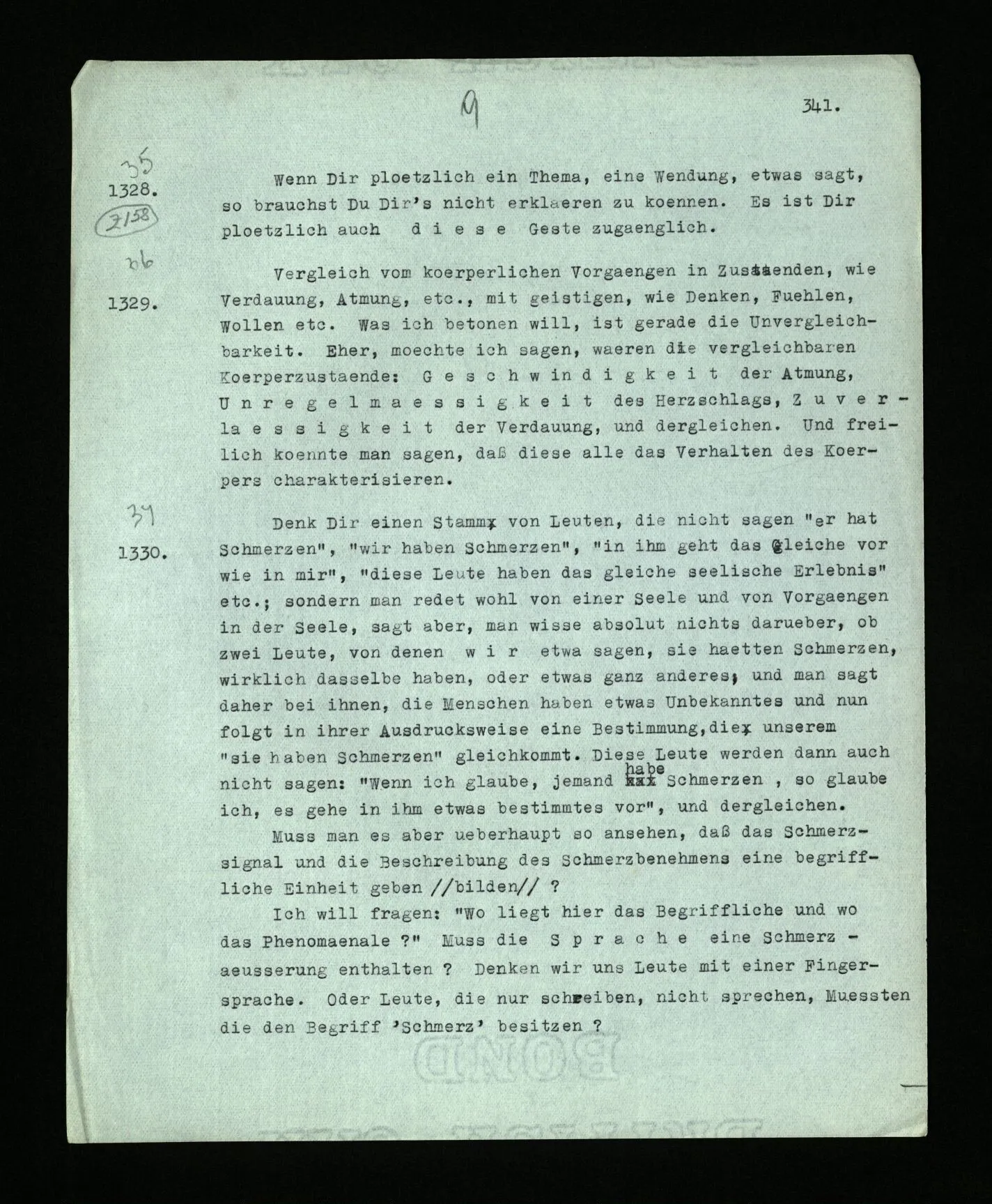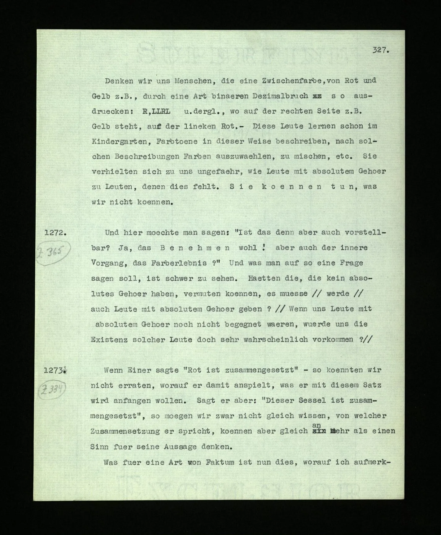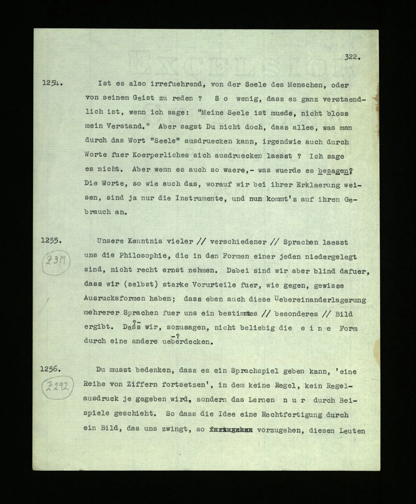 1774. Wenn jemand sagt: Die Form, die Farbe, die Organisation, der Ausdruck, sind doch alle, offenbar, (für jeden Unvoreingenommenen) Eigenschaften, Züge, des subjektiv Gesehenen, des unmittelbaren Gesichtsobjekts, – so verrät ihn hier das Wort “offenbar”. “Offenbar” ist es darum, weil’s Jeder zugibt; und er gibt es nur durch den Sprachgebrauch zu. Man begründet also hier einen Satz durch ein Bild.