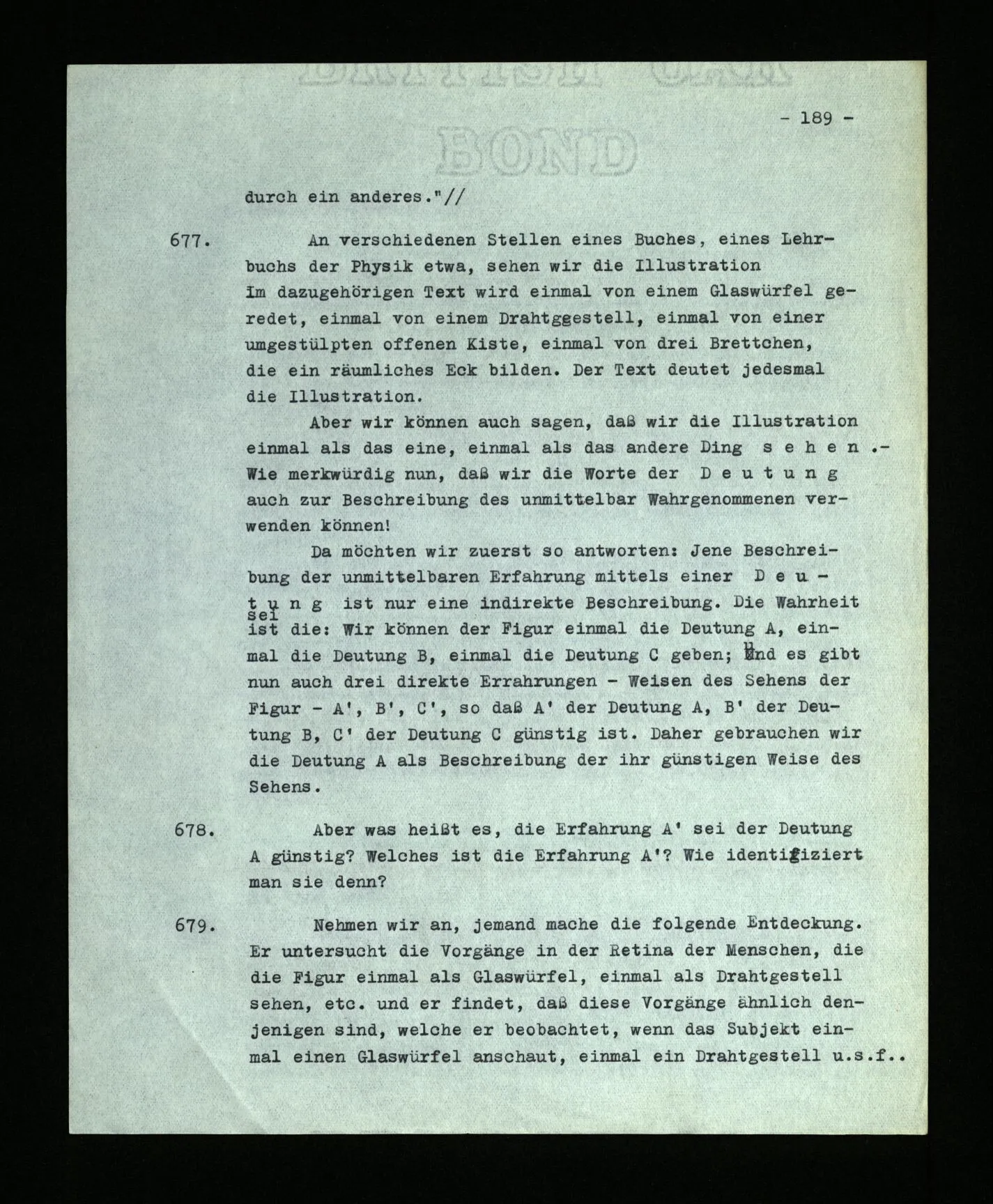 677. An verschieden Stellen eines Buches, eines Lehrbuchs der Physik etwa, sehen wir die Illustration 🖵. Im dazugehörigen Text wird einmal von einem Glaswürfel geredet, einmal von einem Drahtgestell, einmal von einer umgestülpten offenen Kiste, einmal von drei Brettchen, die ein räumliches Eck bilden. Der Text deutet jedesmal die Illustration. Aber wir können auch sagen, daß wir die Illustration einmal als das eine, einmal als das andere Ding sehen. – Wie merkwürdig nun, daß wir die Worte der Deutung auch zur Beschreibung des unmittelbar Wahrgenommenen verwenden können! Da möchten wir zuerst so antworten: Jene Beschreibung der unmittelbaren Erfahrung mittels einer Deutung ist nur eine indirekte Beschreibung. Die Wahrheit ist die: Wir können die Figur einmal die Deutung A, einmal die Deutung B, einmal die Deutung C geben; und es gibt nun auch drei direkte Erfahrungen – Weisen des Sehens der Figur – A’, B’, C’, so daß A’ der Deutung A, B’ der Deutung B, C’ der Deutung C günstig ist. Daher gebrauchen wir die Deutung A als Beschreibung der ihr günstigen Weise des Sehens.