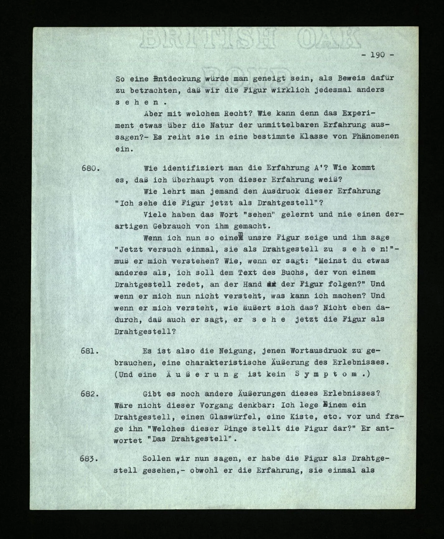 680. Wie identifiziert man die Erfahrung A’? Wie kommt es, daß ich überhaupt von dieser Erfahrung weiß? Wie lehrt man jemand den Ausdruck dieser Erfahrung “Ich sehe die Figur jetzt als Drahtgestell”? Viele haben das Wort “sehen” gelernt und nie einen derartigen Gebrauch von ihm gemacht. Wenn ich nun so einem unsre Figur zeige und ihm sage “Jetzt versuch einmal, sie als Drahtgestell zu sehen!” –muß er mich verstehen? Wie, wenn er sagt: “Meinst du etwas anderes als, ich soll dem Text des Buchs, der von einem Drahtgestell redet, an der Hand der Figur folgen?” Und wenn er mich nun nicht versteht, was kann ich machen? Und wenn er mich versteht, wie äußert sich das? Nicht eben dadurch, daß auch er sagt, er sehe jetzt die Figur als Drahtgestell?