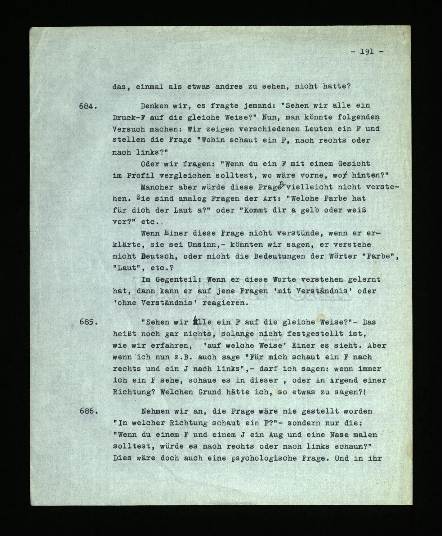 684. Denken wir, es fragte jemand: “Sehen wir alle ein Druck-F auf die gleiche Weise?” Nun, man könnte folgenden Versuch machen: Wir zeigen verschiedenen Leuten ein F und stellen die Frage “Wohin schaut ein F, nach rechts oder nach links?” Oder wir fragen: “Wenn du ein F mit einem Gesicht im Profil vergleichen solltest, wo wäre vorne, wo hinten?” Mancher aber würde diese Fragen vielleicht nicht verstehen. Sie sind analog Fragen der Art: “Welche Farbe hat für dich der Laut a?” oder “Kommt dir a gelb oder weiß vor?” etc. Wenn Einer diese Frage nicht verstünde, wenn er erklärte, sie sei Unsinn, – könnten wir sagen, er verstehe nicht Deutsch, oder nicht die Bedeutungen der Wörter “Farbe”, “Laut”, etc.? Im Gegenteil: Wenn er diese Worte verstehen gelernt hat, dann kann er auf jene Fragen ‘mit Verständnis’ oder ‘ohne Verständnis’ reagieren.
