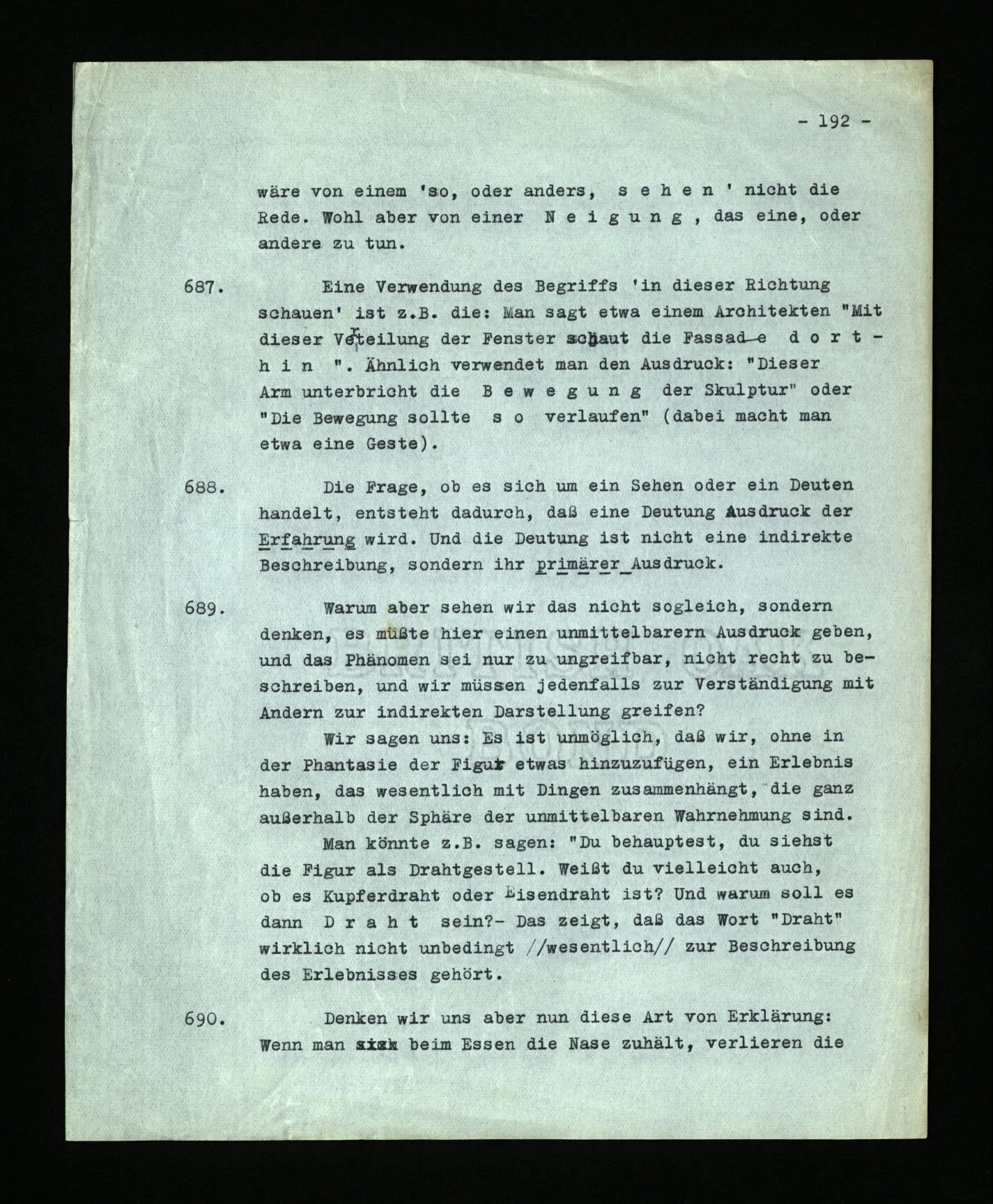 688. Die Frage, ob es sich um ein Sehen oder ein Deuten handelt, entsteht dadurch, daß eine Deutung Ausdruck der Erfahrung wird. Und die Deutung ist nicht eine indirekte Beschreibung, sondern ihr primärer Ausdruck.