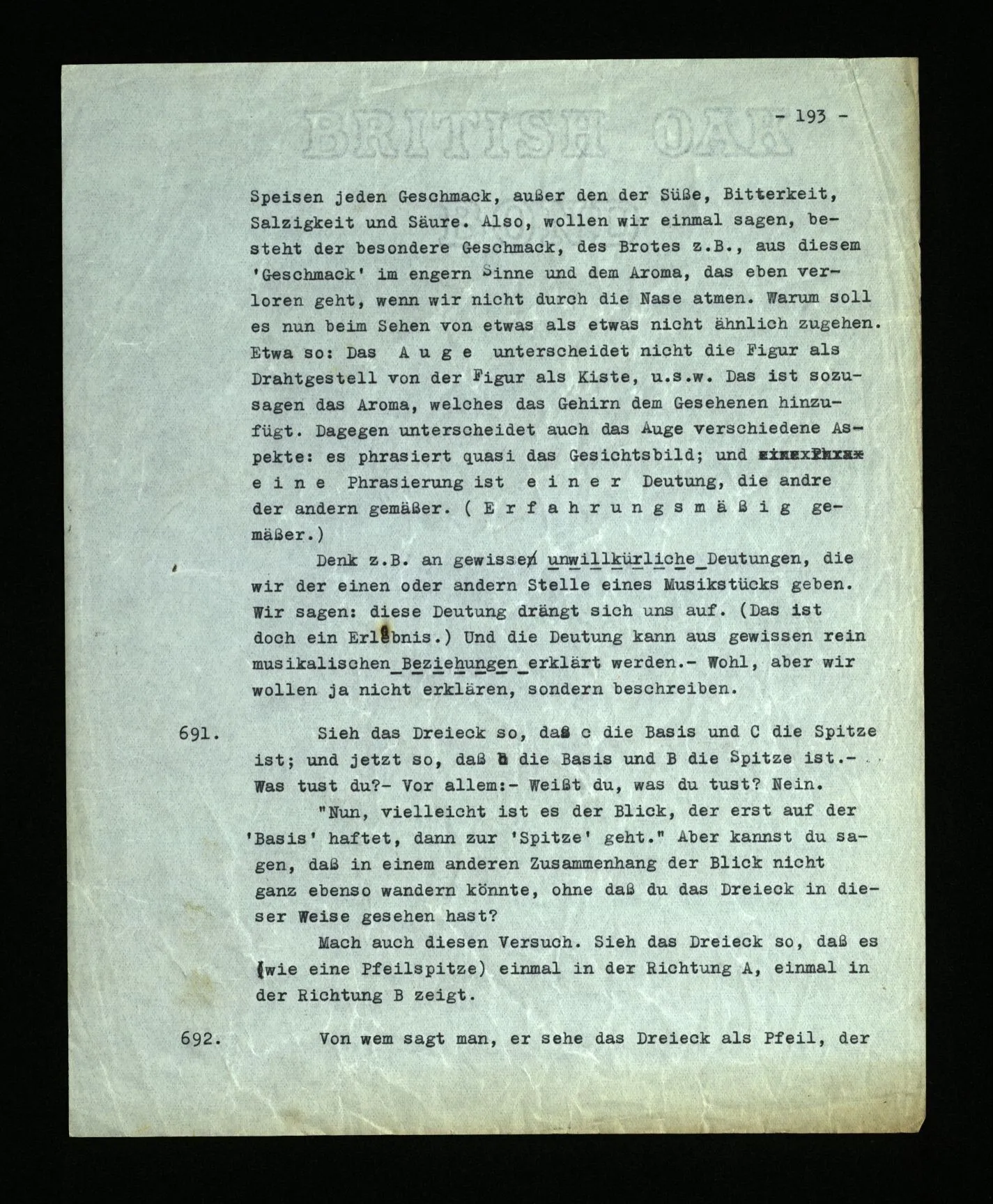 690. Denken wir uns aber nun diese Art von Erklärung: Wenn man beim Essen die Nase zuhält, verlieren die Speisen jeden Geschmack, außer den der Süße, Bitterkeit, Salzigkeit und Säure. Also, wollen wir einmal sagen, besteht der besondere Geschmack, des Brotes z.B., aus diesem ‘Geschmack’ im engern Sinne und dem Aroma, das eben verloren geht, wenn wir nicht durch die Nase atmen. Warum soll es nun beim Sehen von etwas als etwas nicht ähnlich zugehen. Etwa so: Das Auge unterscheidet nicht die Figur als Drahtgestell von der Figur als Kiste, u.s.w. Das ist sozusagen das Aroma, welches das Gehirn dem Gesehenen hinzufügt. Dagegen unterscheidet auch das Auge verschiedene Aspekte: es phrasiert quasi das Gesichtsbild; und eine Phrasierung ist einer Deutung, die andre der andern gemäßer. (Erfahrungsmäßig gemäßer.) Denk z.B. an gewisse unwillkürliche Deutungen, die wir der einen oder andern Stelle eines Musikstücks geben. Wir sagen: diese Deutung drängt sich uns auf. (Das ist doch ein Erlebnis.) Und die Deutung kann aus gewissen rein musikalischen Beziehungen erklärt werden. – Wohl, aber wir wollen ja nicht erklären, sondern beschreiben.