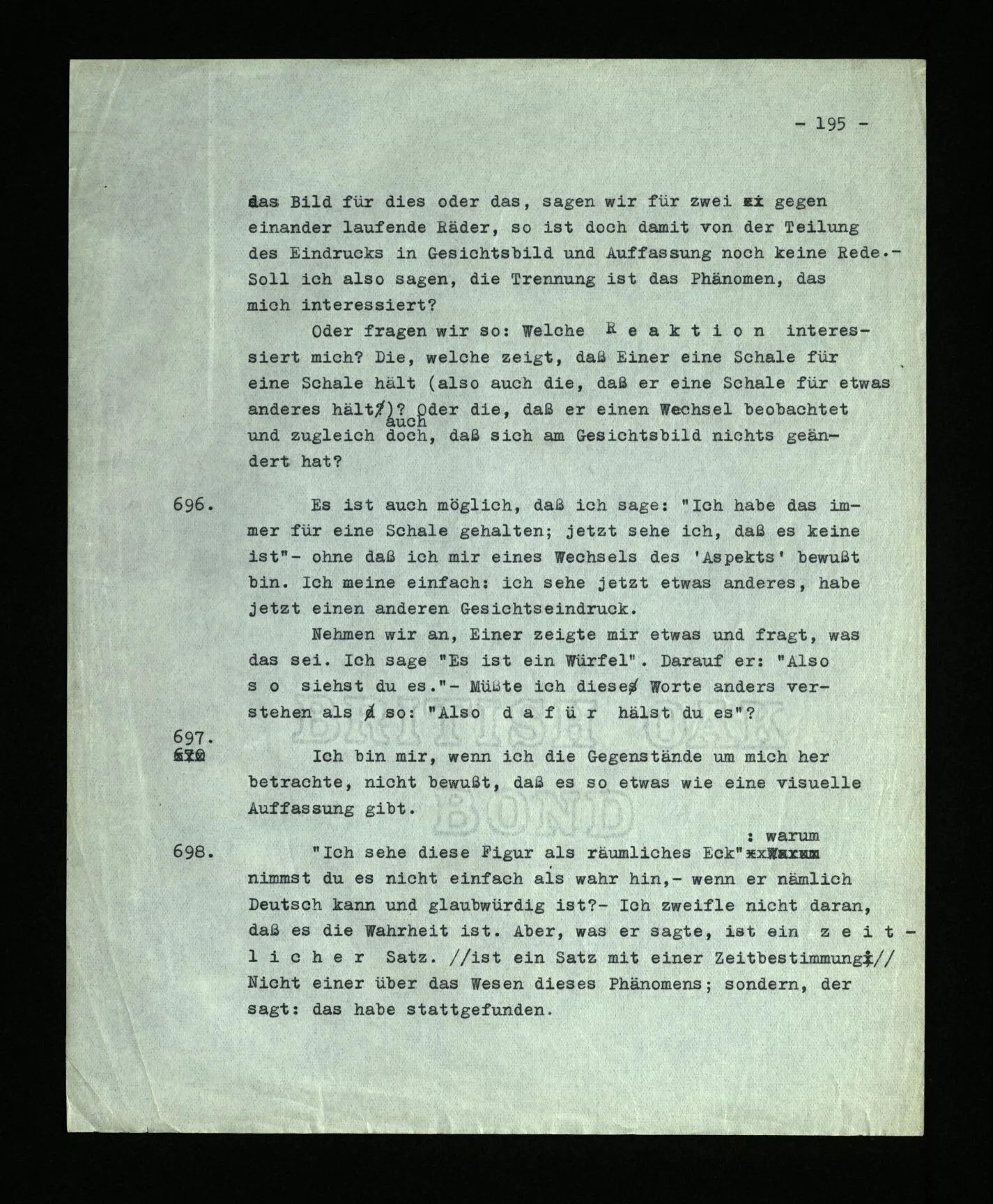 697. Ich bin mir, wenn ich die Gegenstände um mich her betrachte, nicht bewußt, daß es so etwas wie eine visuelle Auffassung gibt.