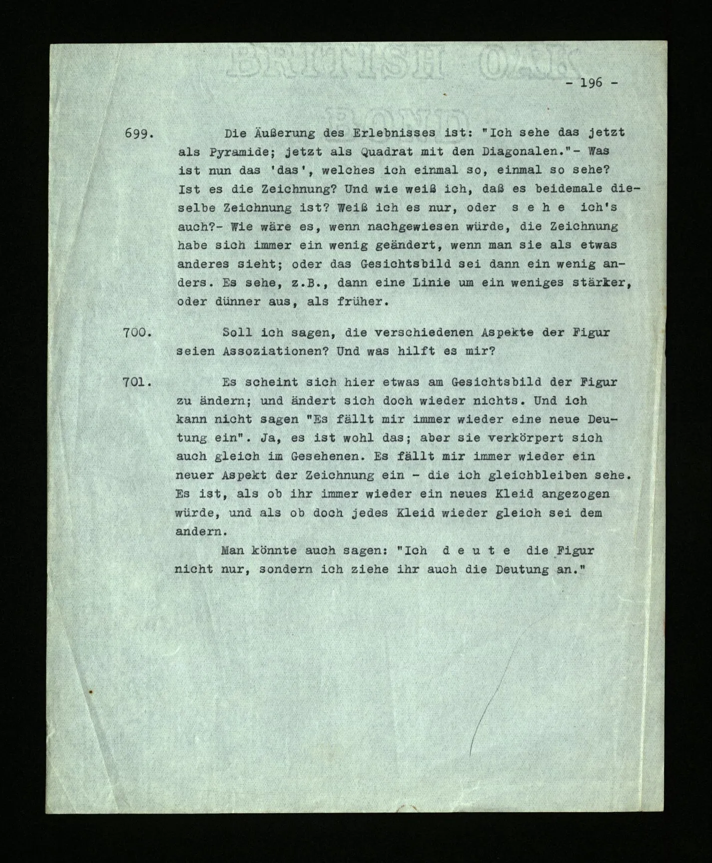 701. Es scheint sich hier etwas am Gesichtsbild der Figur zu ändern; und ändert sich doch wieder nichts. Und ich kann nicht sagen “Es fällt mir immer wieder eine neue Deutung ein”. Ja, es ist wohl das, aber sie verkörpert sich auch gleich im Gesehenen. Es fällt mir immer wieder ein neuer Aspekt der Zeichnung ein – die ich gleichbleiben sehe. Es ist, als ob ihr immer wieder ein neues Kleid angezogen würde, und als ob doch jedes Kleid wieder gleich sei dem andern. Man könnte auch sagen: “Ich deute die Figur nicht nur, sondern ich ziehe ihr auch die Deutung an.”