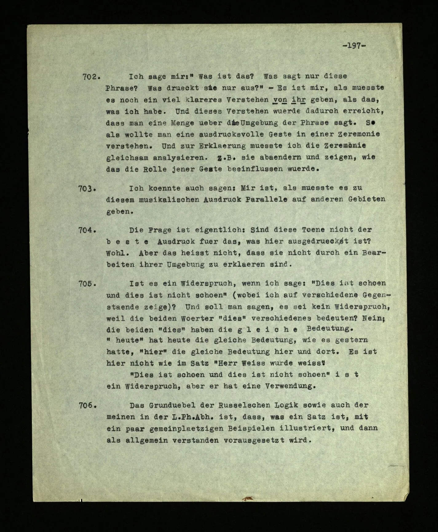 702. Ich sage mir: “Was ist das? Was sagt nur diese Phrase? Was drückt sie nur aus?” – Es ist mir, als müßte es noch ein viel klareres Verstehen von ihr geben, als das, was ich habe. Und dieses Verstehen würde dadurch erreicht, daß man eine Menge über die Umgebung der Phrase sagt. So als wollte man eine ausdrucksvolle Geste in einer Zeremonie verstehen. Und zur Erklärung müßte ich die Zeremonie gleichsam analysieren. Z.B. sie abändern und zeigen, wie das die Rolle jener Geste beeinflussen würde.
