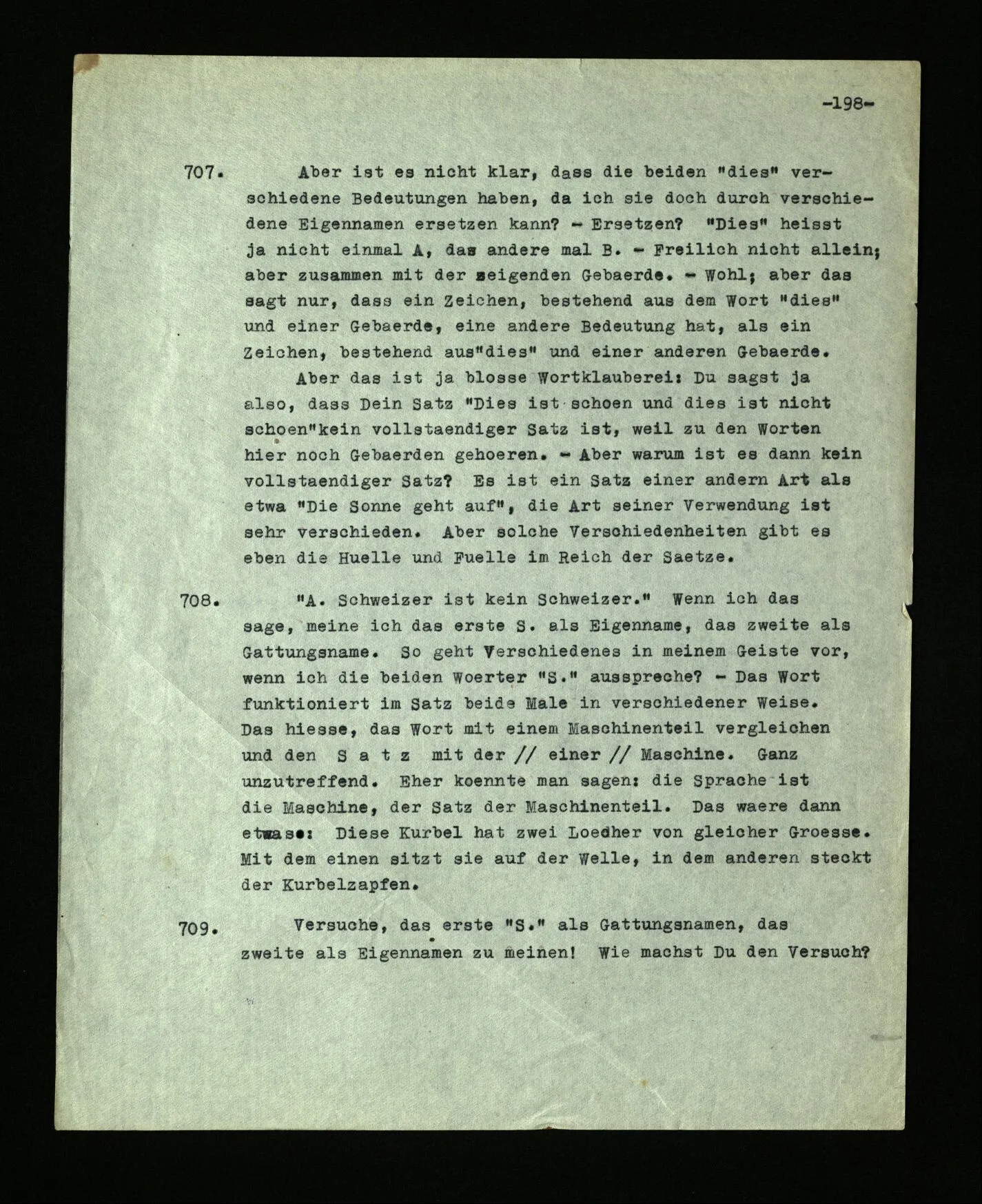 708. “A. Schweitzer ist kein Schweizer.” Wenn ich das sage, meine ich das erste S. als Eigenname, das zweite als Gattungsname. So geht Verschiedenes in meinem Geiste vor, wenn ich die beiden Wörter “S.” ausspreche? – Das Wort funktioniert im Satz beide Male in verschiedener Weise. Das hieße, das Wort mit einem Maschinenteil vergleichen und den Satz mit der Maschine. Ganz unzutreffend. Eher könnte man sagen: die Sprache ist die Maschine, der Satz der Maschinenteil. Das wäre dann etwa so: Diese Kurbel hat zwei Löcher von gleicher Größe. Mit dem einen sitzt sie auf der Welle, in dem anderen steckt der Kurbelzapfen.