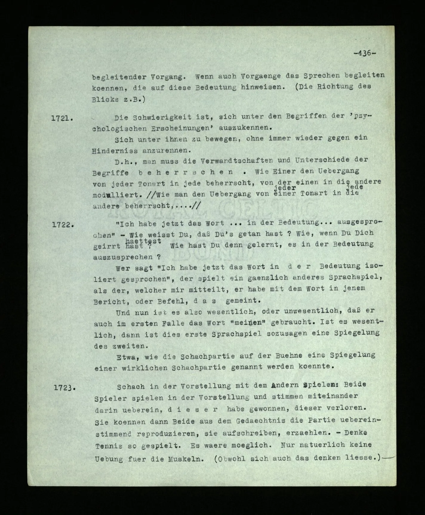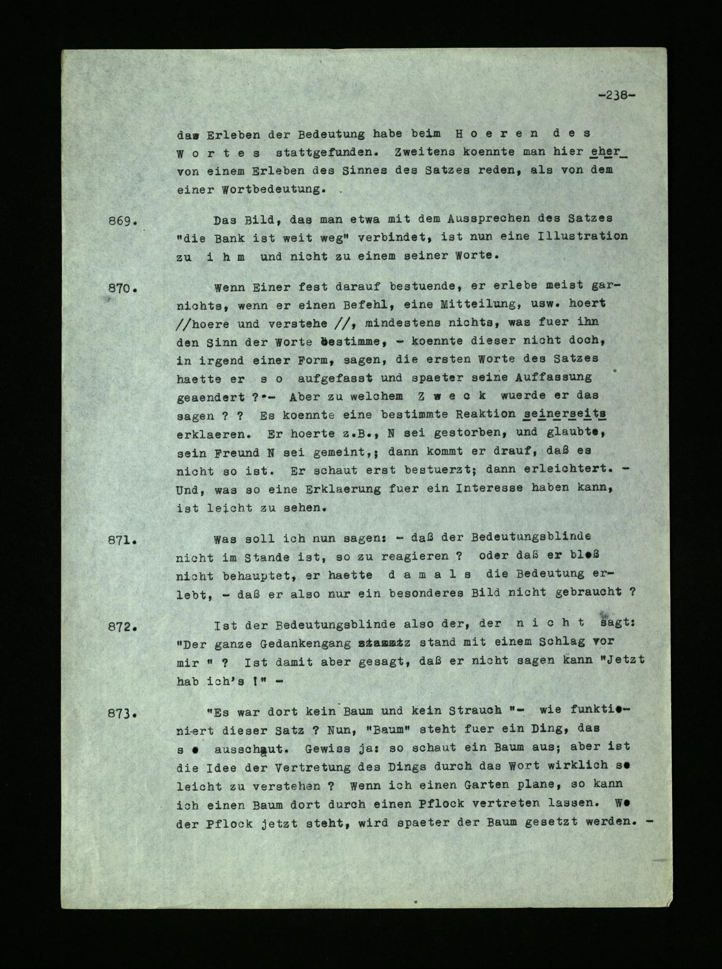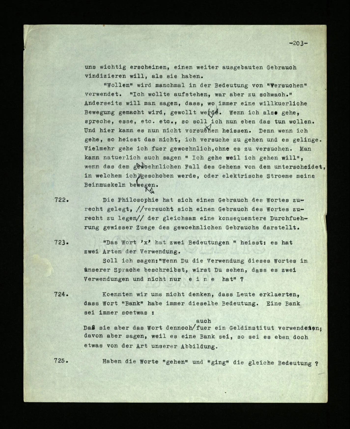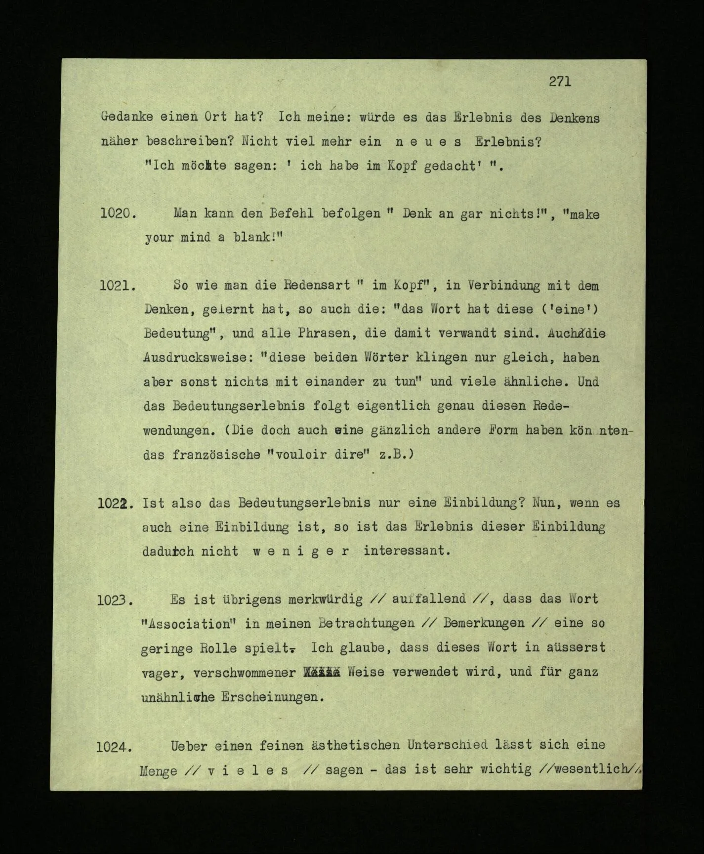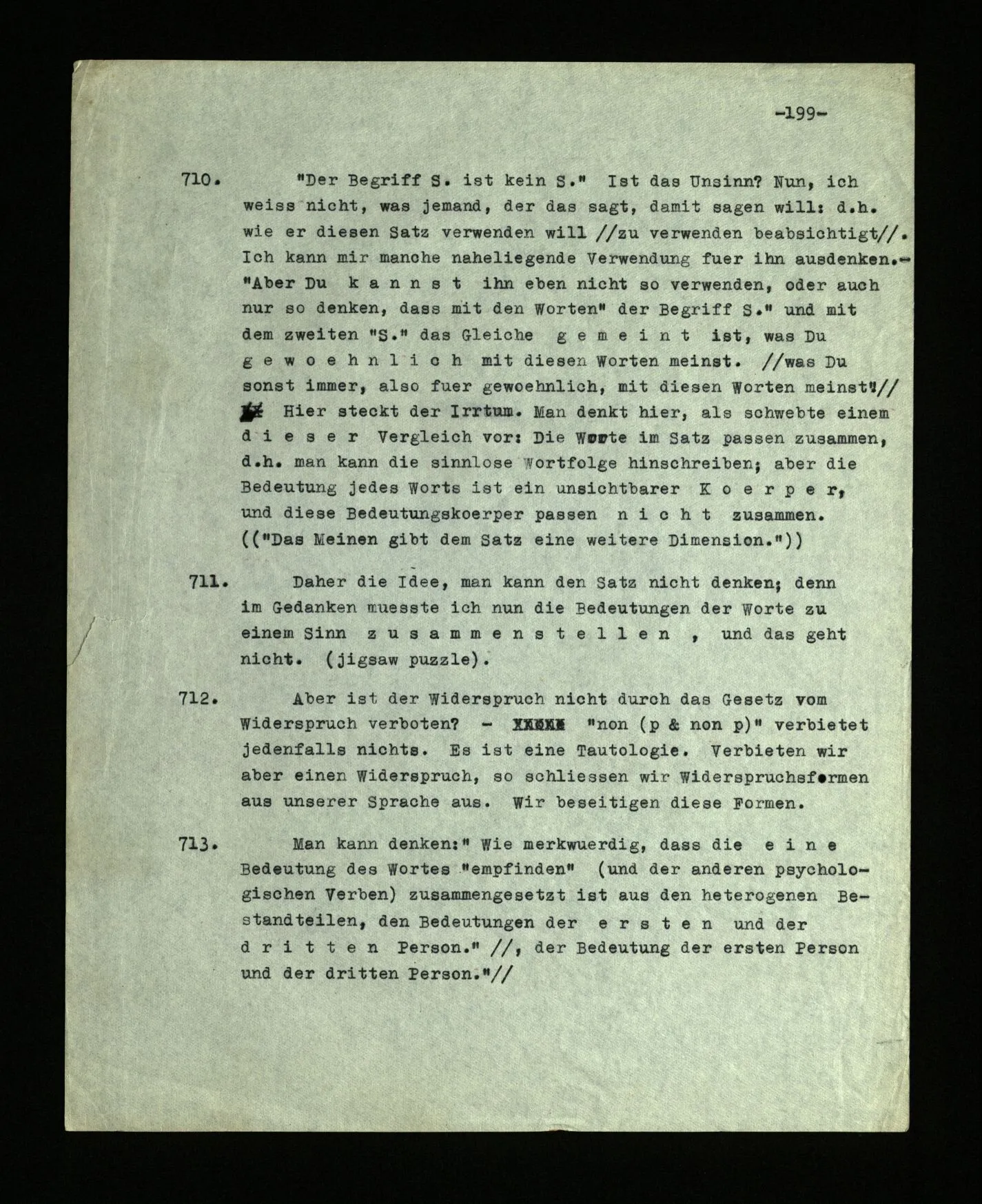 710. “Der Begriff S. ist kein S.” Ist das Unsinn? Nun, ich weiß nicht, was jemand, der das sagt, damit sagen will: d.h. wie er diesen Satz verwenden will. Ich kann mir manche naheliegende Verwendung für ihn ausdenken. – “Aber du kannst ihn eben nicht so verwenden, oder auch nur so denken, daß mit den Worten “der Begriff S.” und mit dem zweiten “S.” das Gleiche gemeint ist, was Du gewöhnlich mit diesen Worten meinst.” Hier steckt der Irrtum. Man denkt hier, als schwebte einem dieser Vergleich vor: Die Worte im Satz passen zusammen, d.h. man kann die sinnlose Wortfolge hinschreiben, aber die Bedeutung jedes Worts ist ein unsichtbarer Körper, und diese Bedeutungskörper passen nicht zusammen. ((“Das Meinen gibt dem Satz eine weitere Dimension.”))