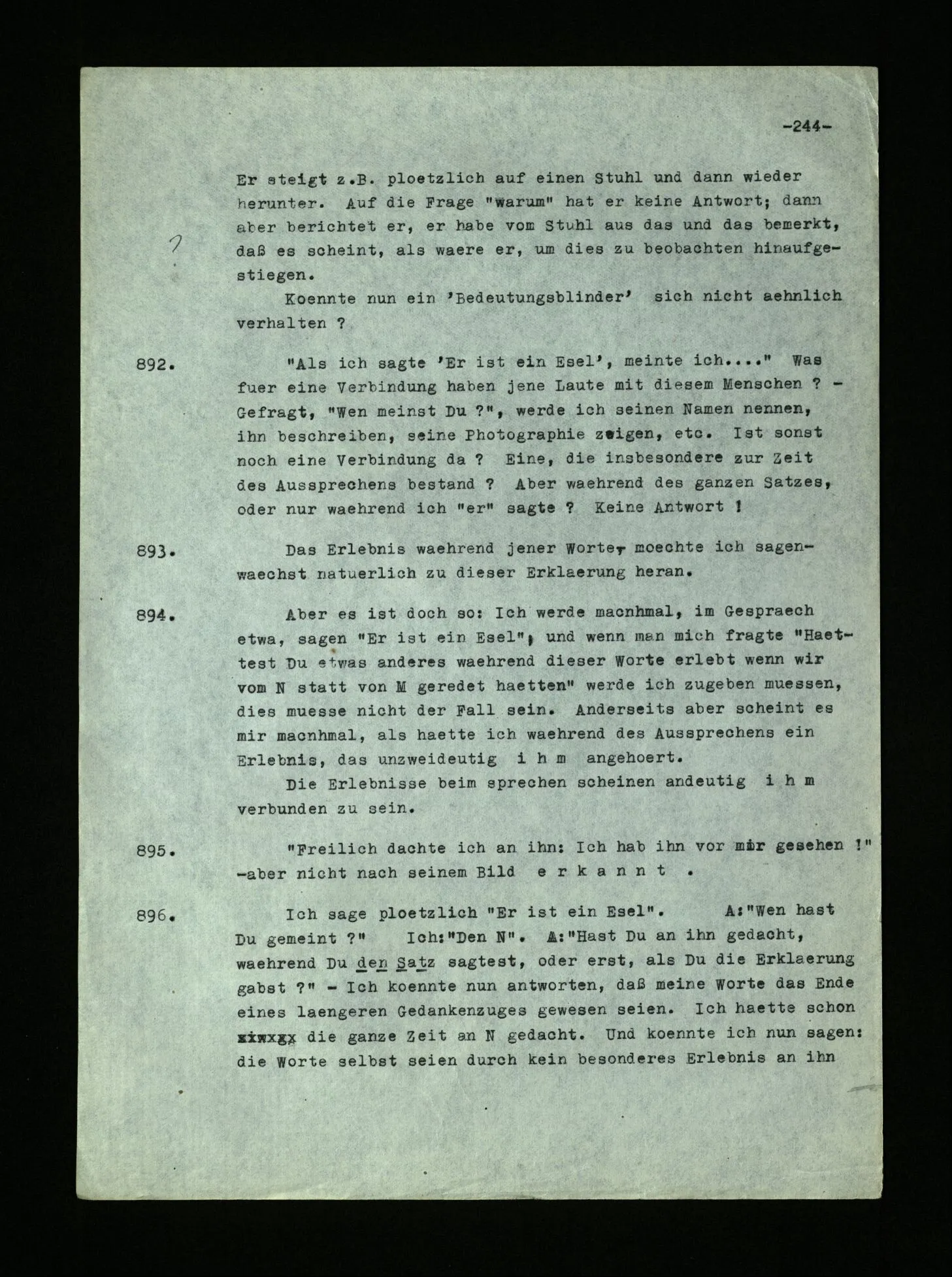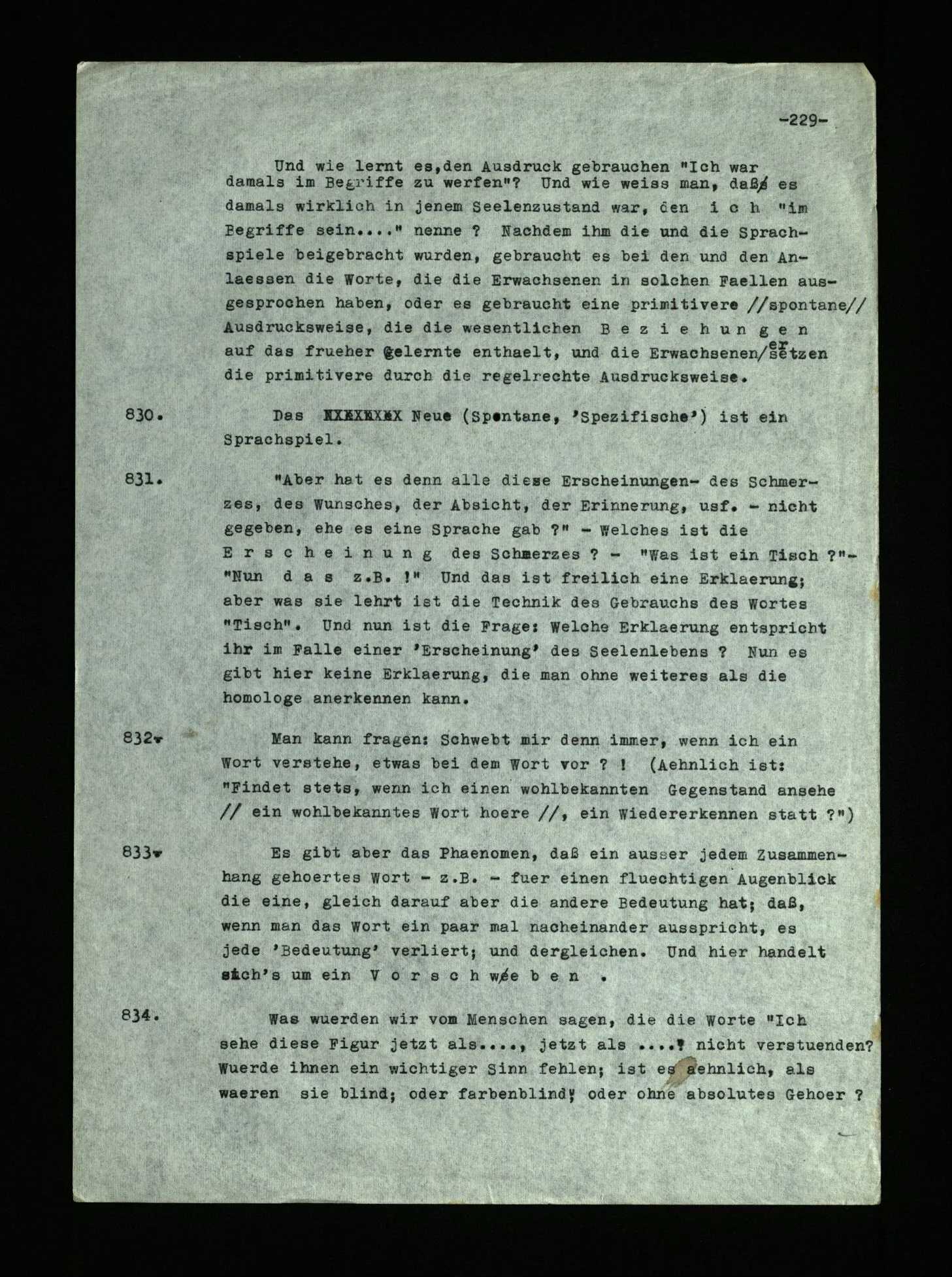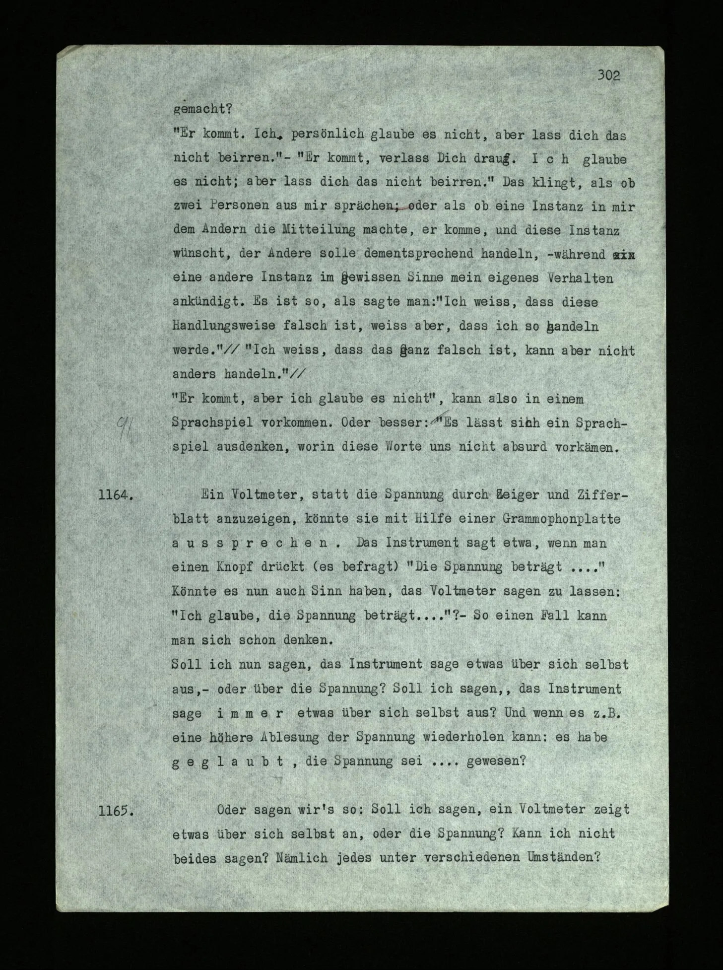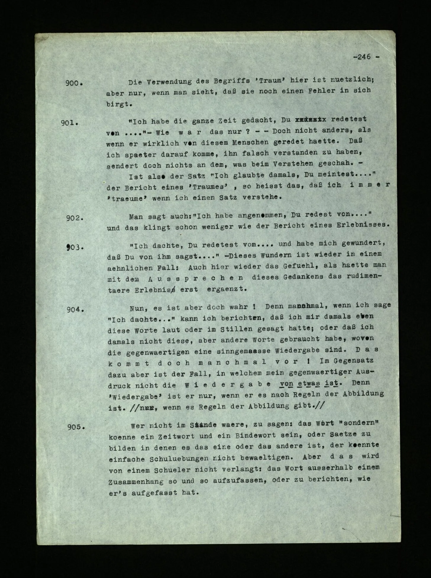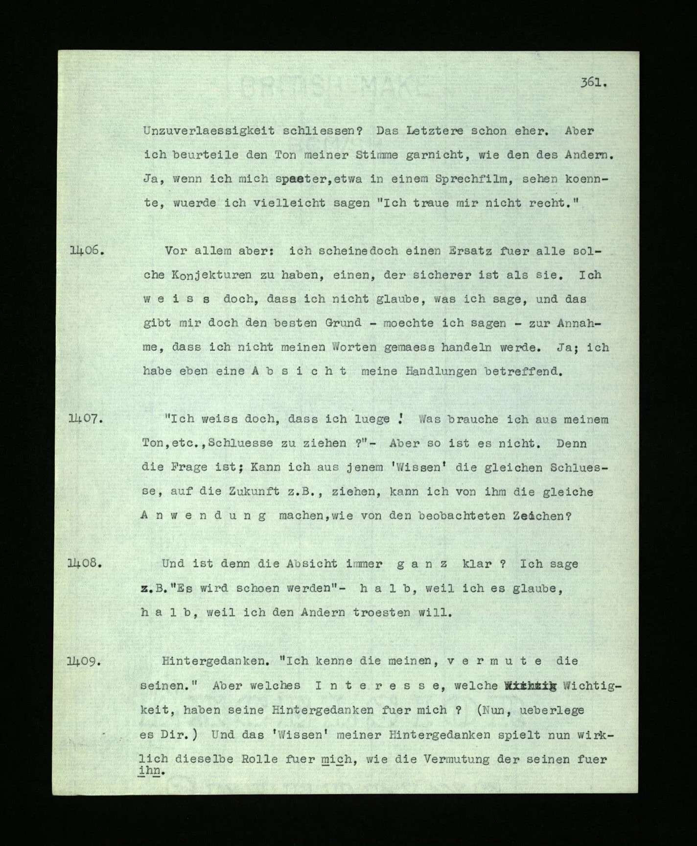 1801. Er fragt “Was hast Du mit dem Wort gemeint?” – Ich beantworte die Frage und setze hinzu: “Hättest Du mich früher gefragt, so hätte ich das gleiche geantwortet; meine Antwort war nicht eine Deutung, die mir jetzt eingefallen ist.” So war sie mir schon früher eingefallen? Nein. – Und wie konnte ich dann sagen: “Hättest Du mich früher gefragt, so hätte ich ‥‥ ”? Woraus schloß ich das? Aus garnichts. Was teile ich ihm mit, wenn ich diesen Konditional ausspreche? Etwas, was manchmal von Wichtigkeit sein kann.