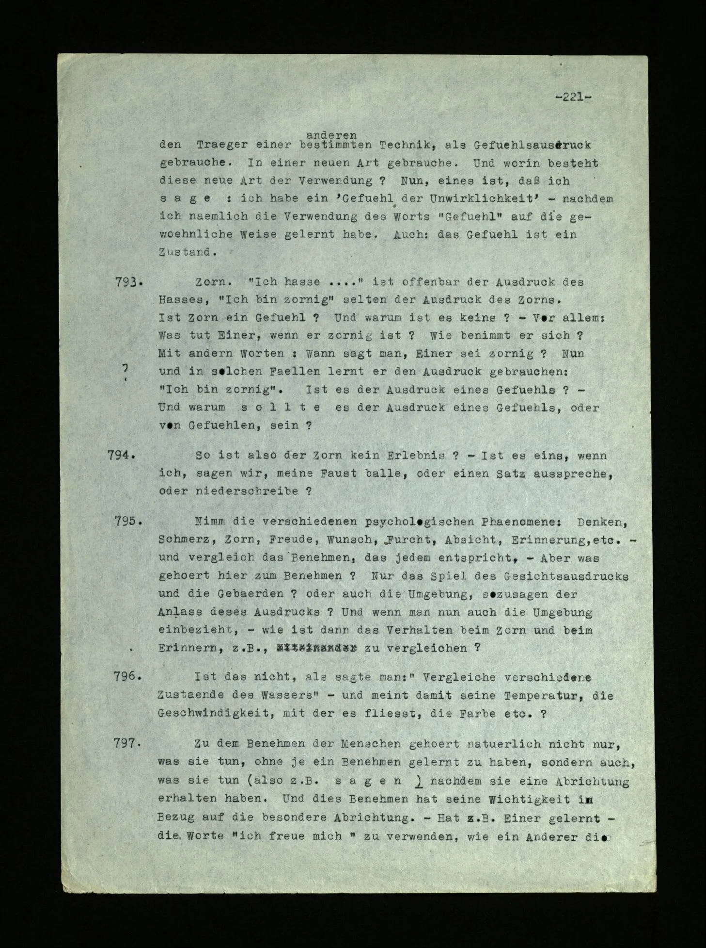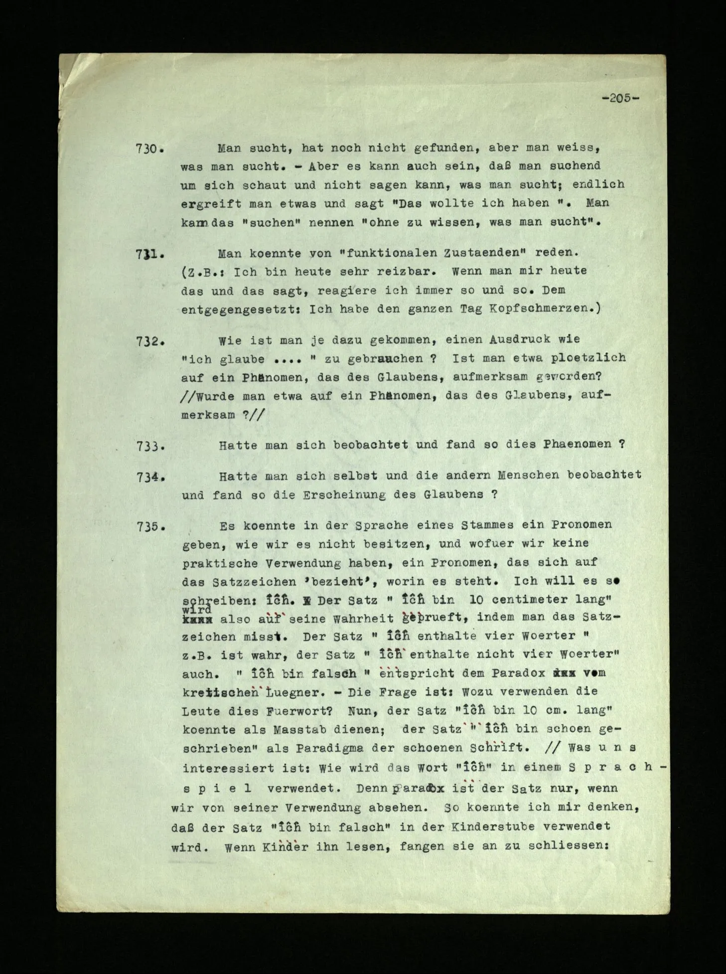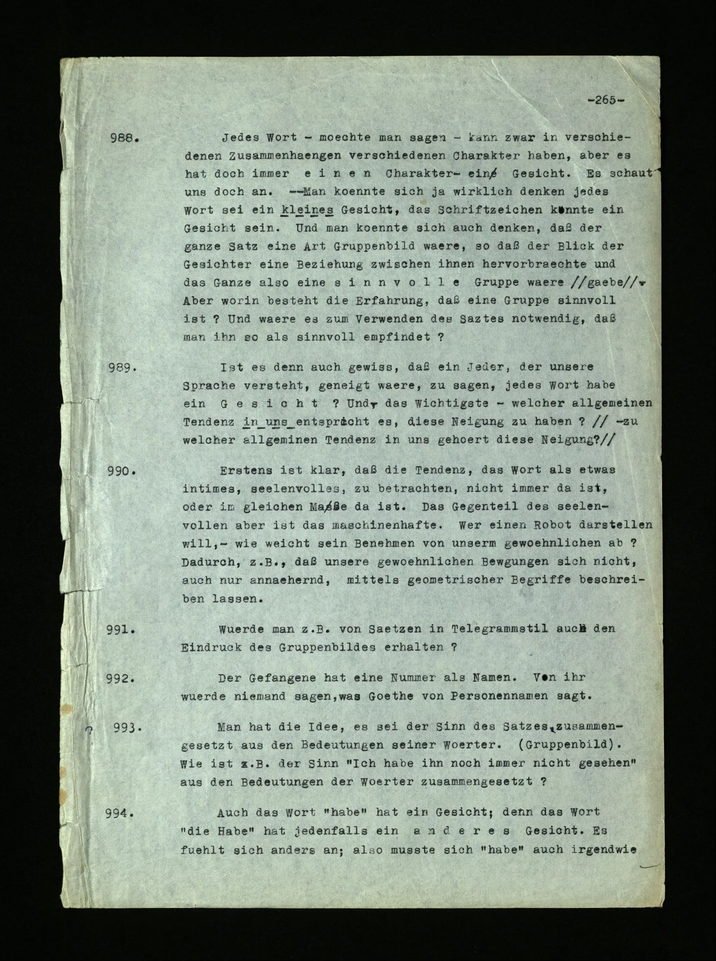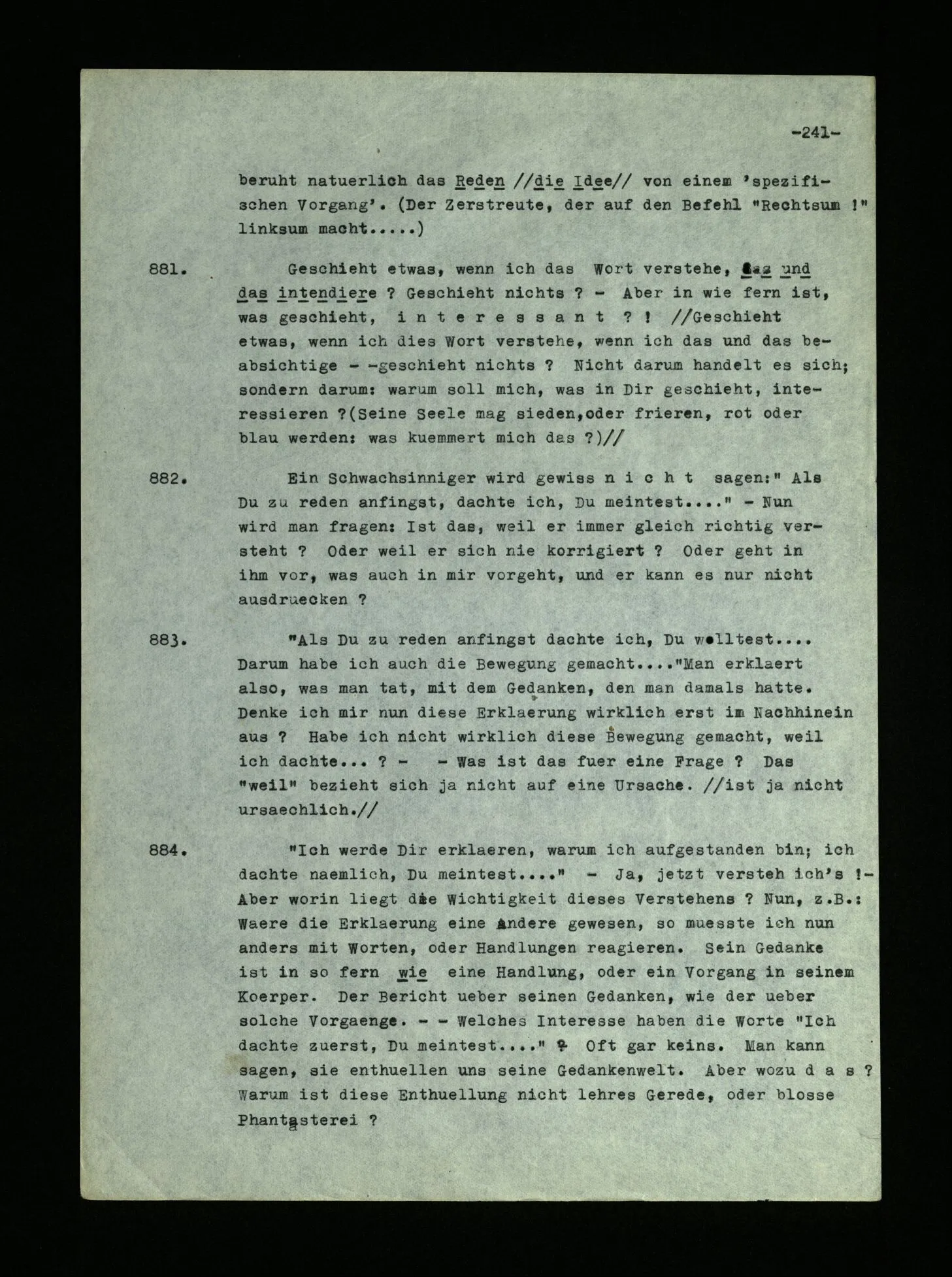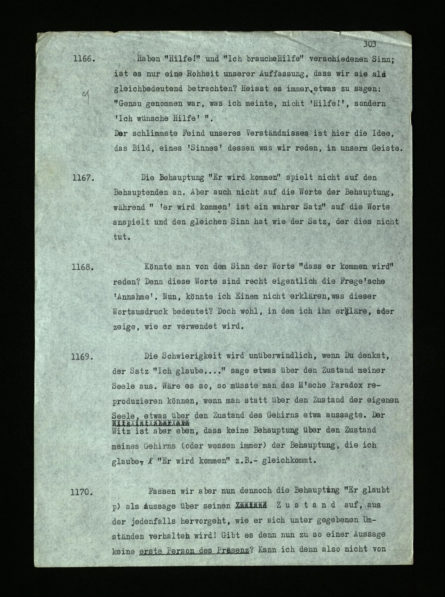 1801. Er fragt “Was hast Du mit dem Wort gemeint?” – Ich beantworte die Frage und setze hinzu: “Hättest Du mich früher gefragt, so hätte ich das gleiche geantwortet; meine Antwort war nicht eine Deutung, die mir jetzt eingefallen ist.” So war sie mir schon früher eingefallen? Nein. – Und wie konnte ich dann sagen: “Hättest Du mich früher gefragt, so hätte ich ‥‥ ”? Woraus schloß ich das? Aus garnichts. Was teile ich ihm mit, wenn ich diesen Konditional ausspreche? Etwas, was manchmal von Wichtigkeit sein kann.
