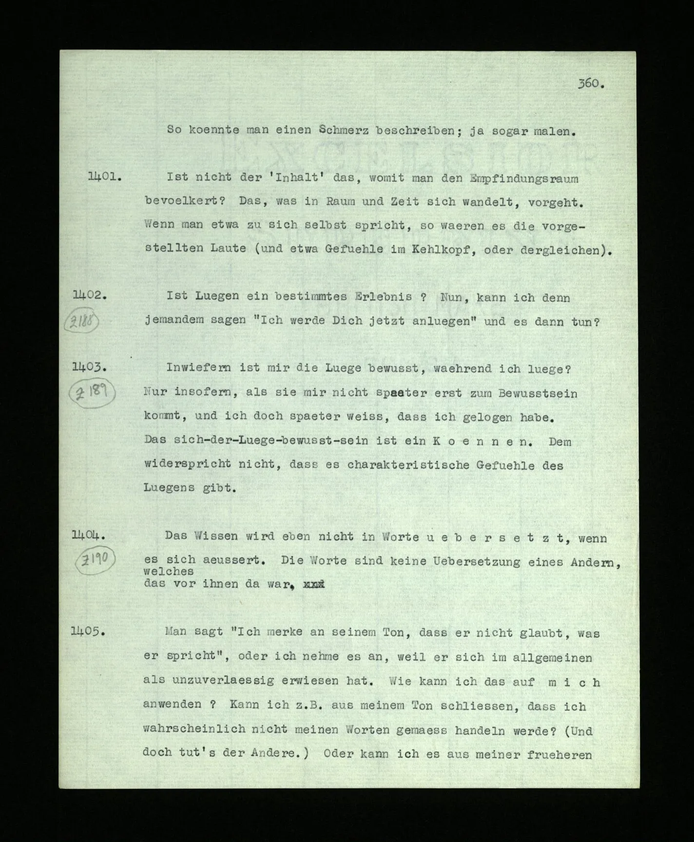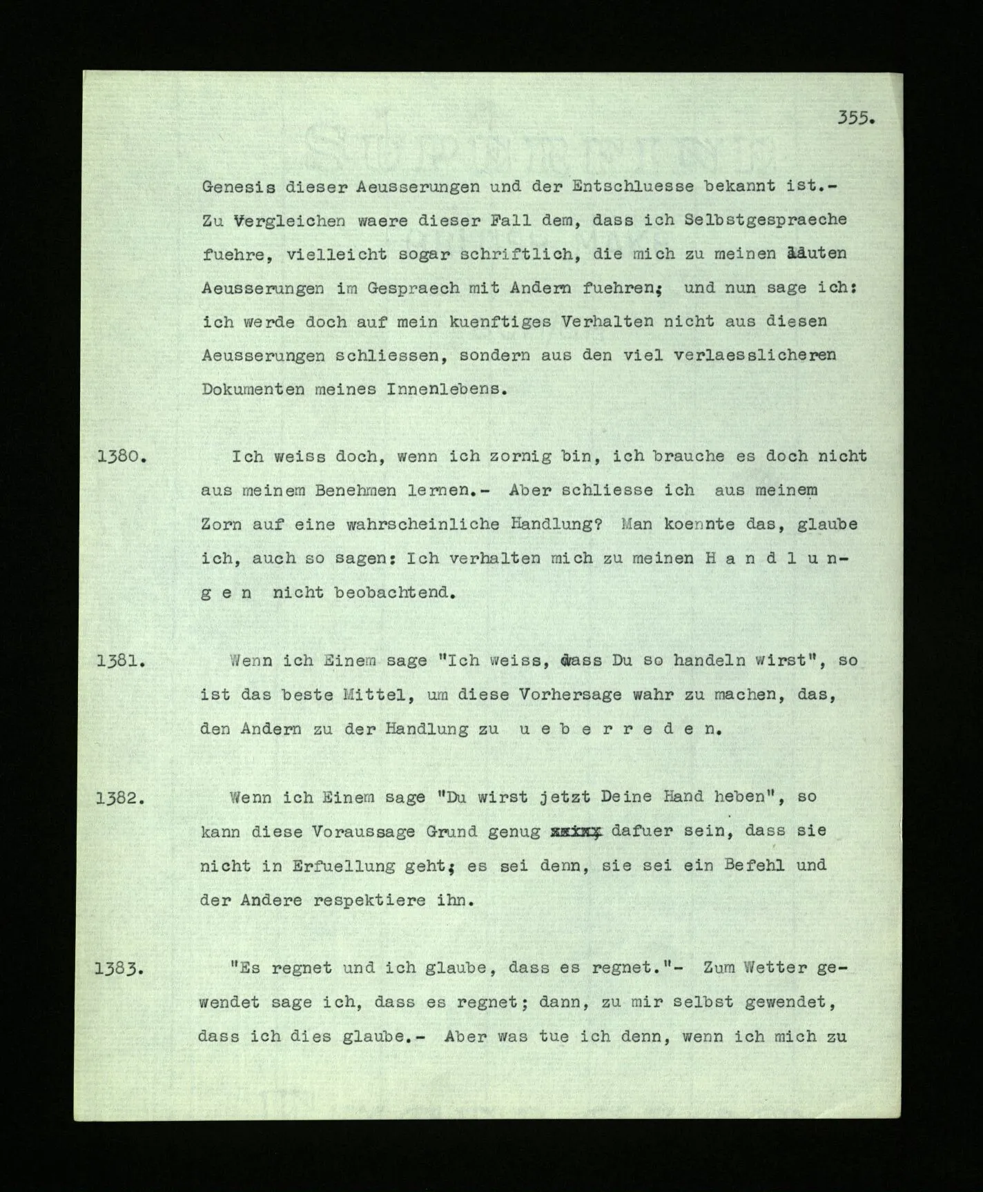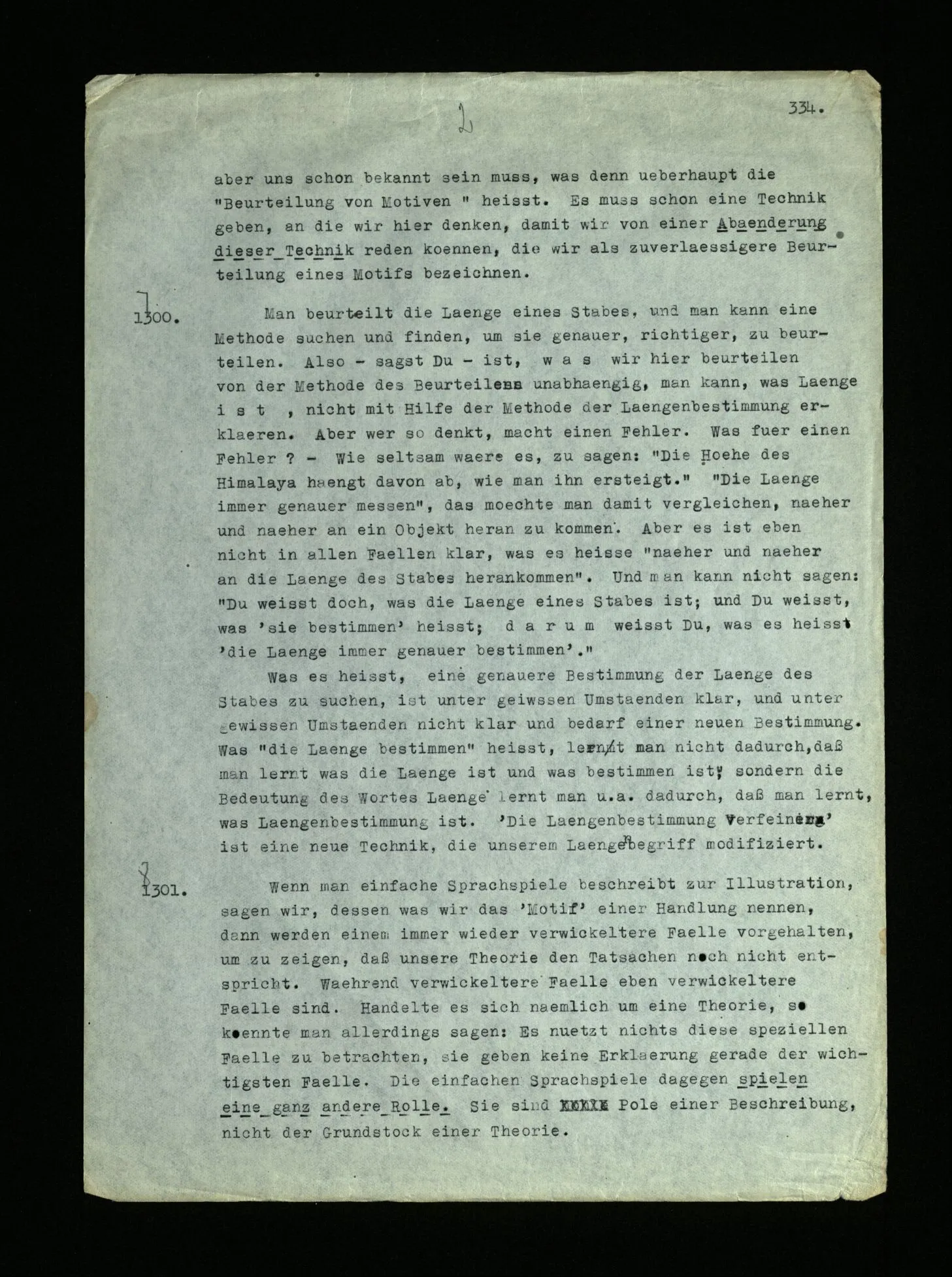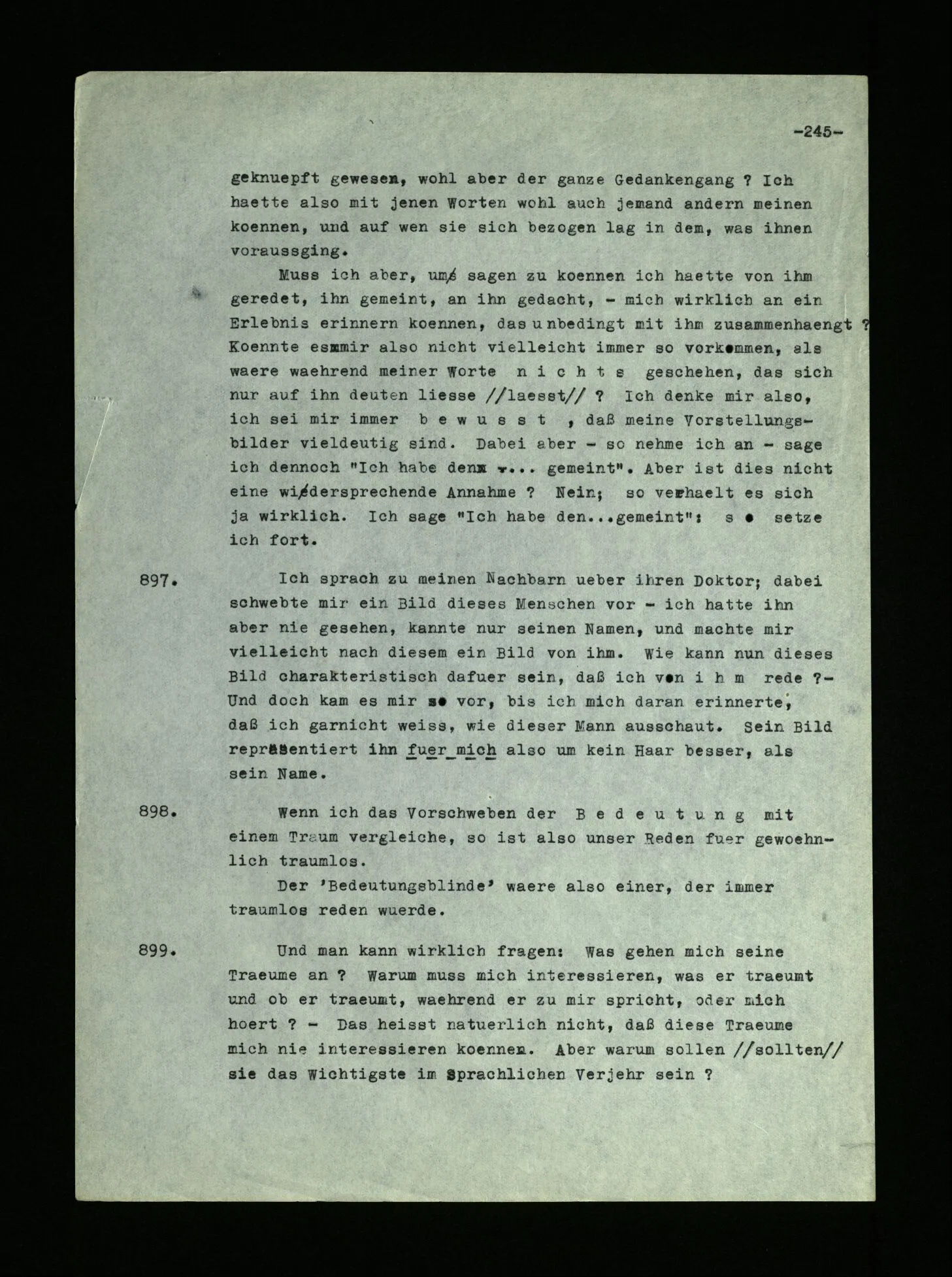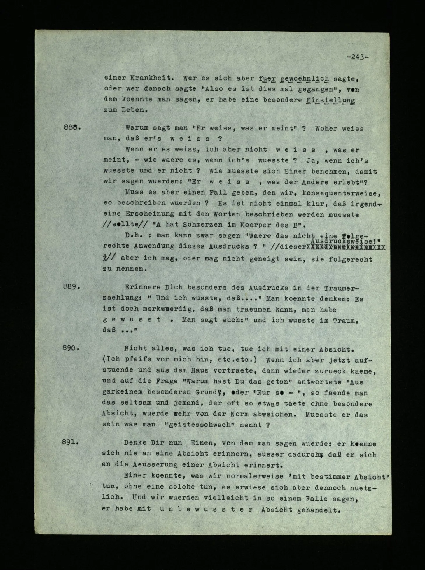 1801. Er fragt “Was hast Du mit dem Wort gemeint?” – Ich beantworte die Frage und setze hinzu: “Hättest Du mich früher gefragt, so hätte ich das gleiche geantwortet; meine Antwort war nicht eine Deutung, die mir jetzt eingefallen ist.” So war sie mir schon früher eingefallen? Nein. – Und wie konnte ich dann sagen: “Hättest Du mich früher gefragt, so hätte ich ‥‥ ”? Woraus schloß ich das? Aus garnichts. Was teile ich ihm mit, wenn ich diesen Konditional ausspreche? Etwas, was manchmal von Wichtigkeit sein kann.