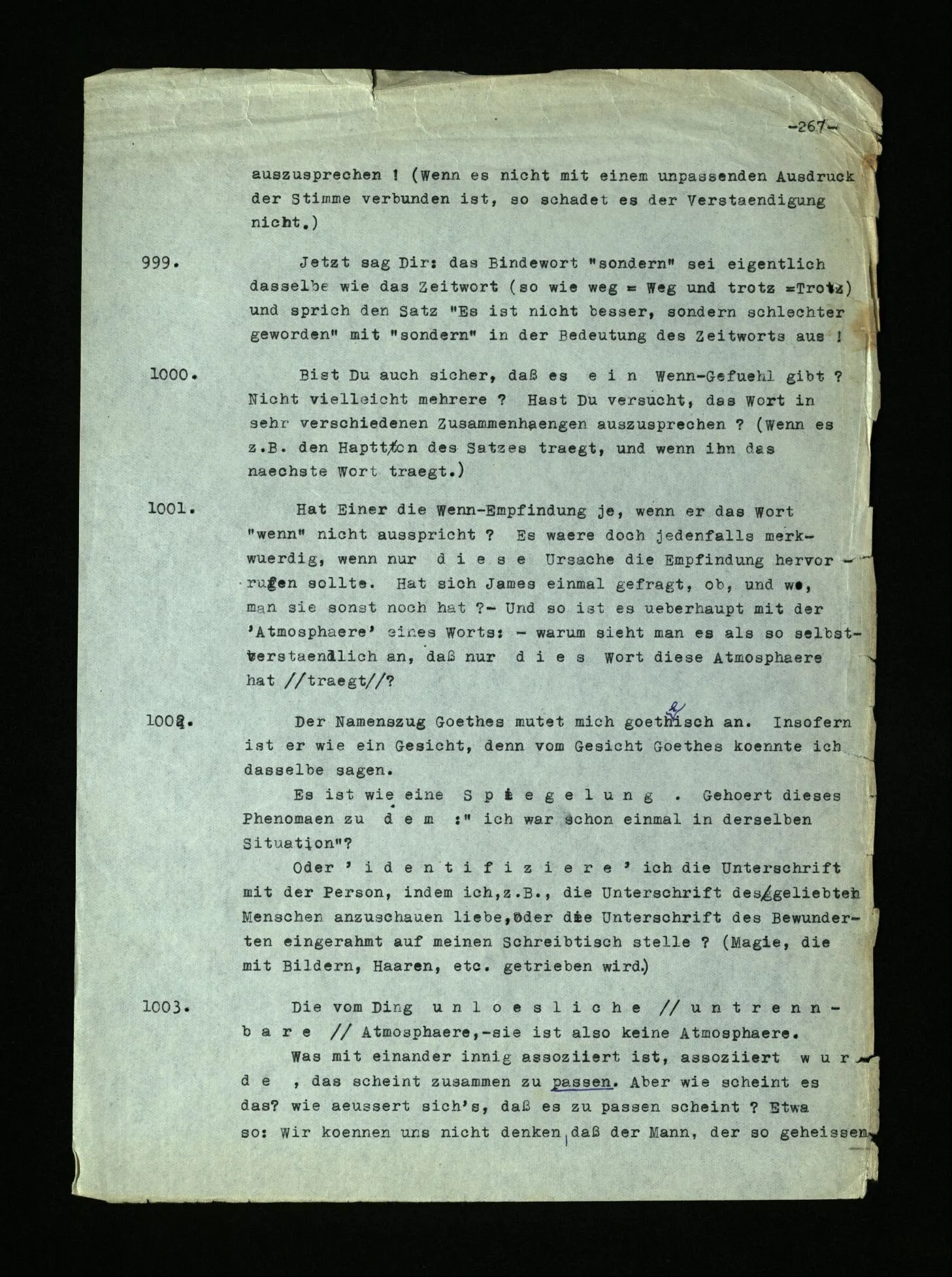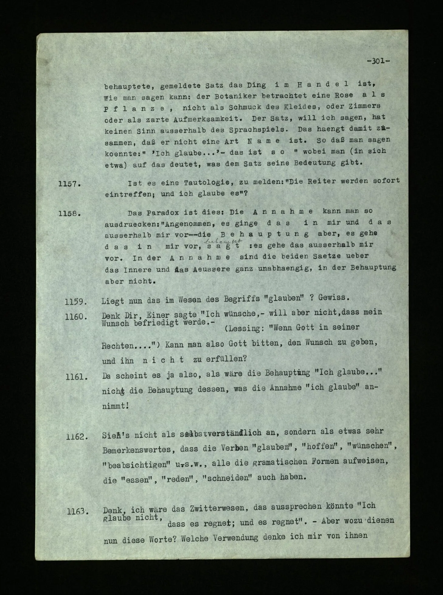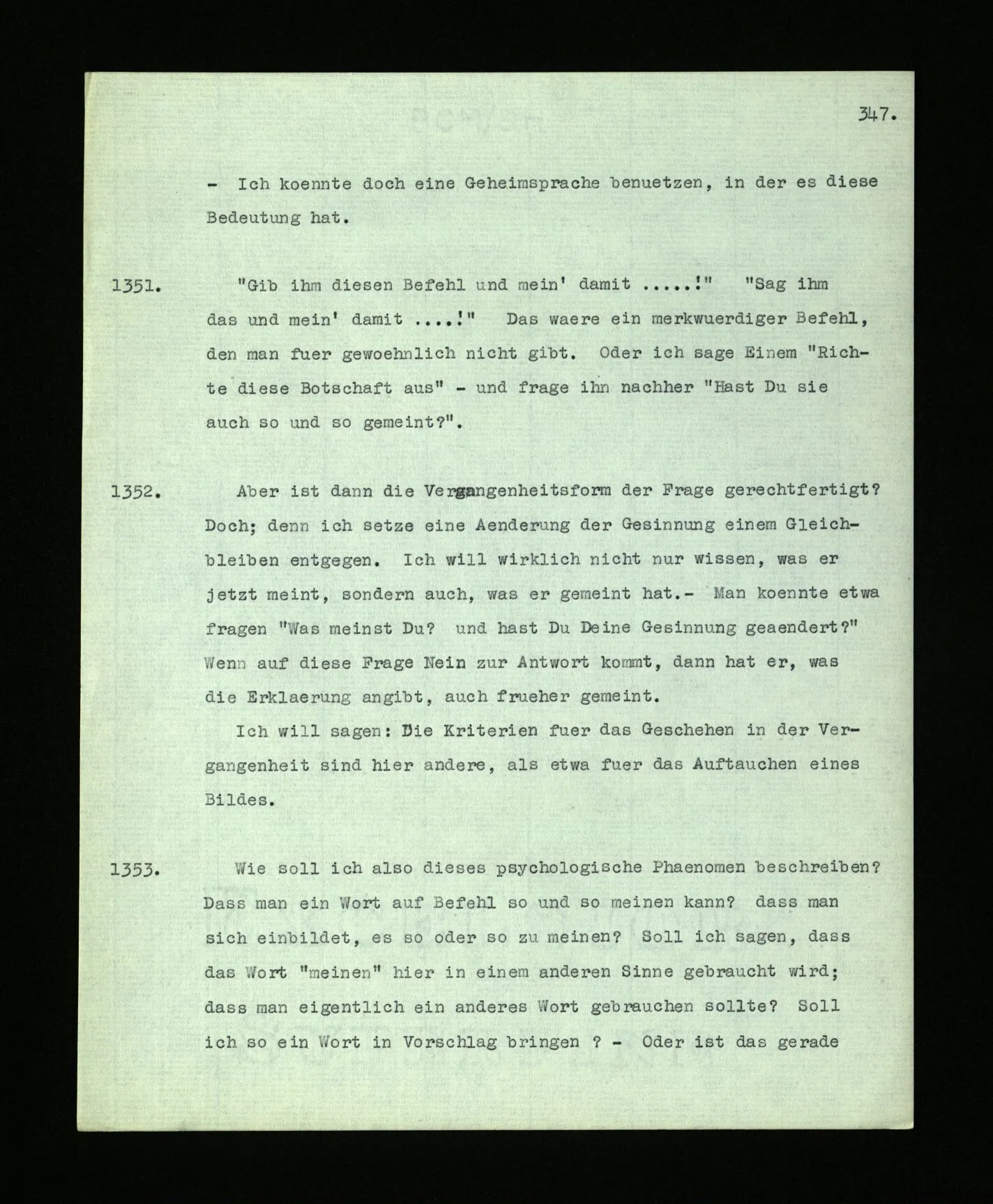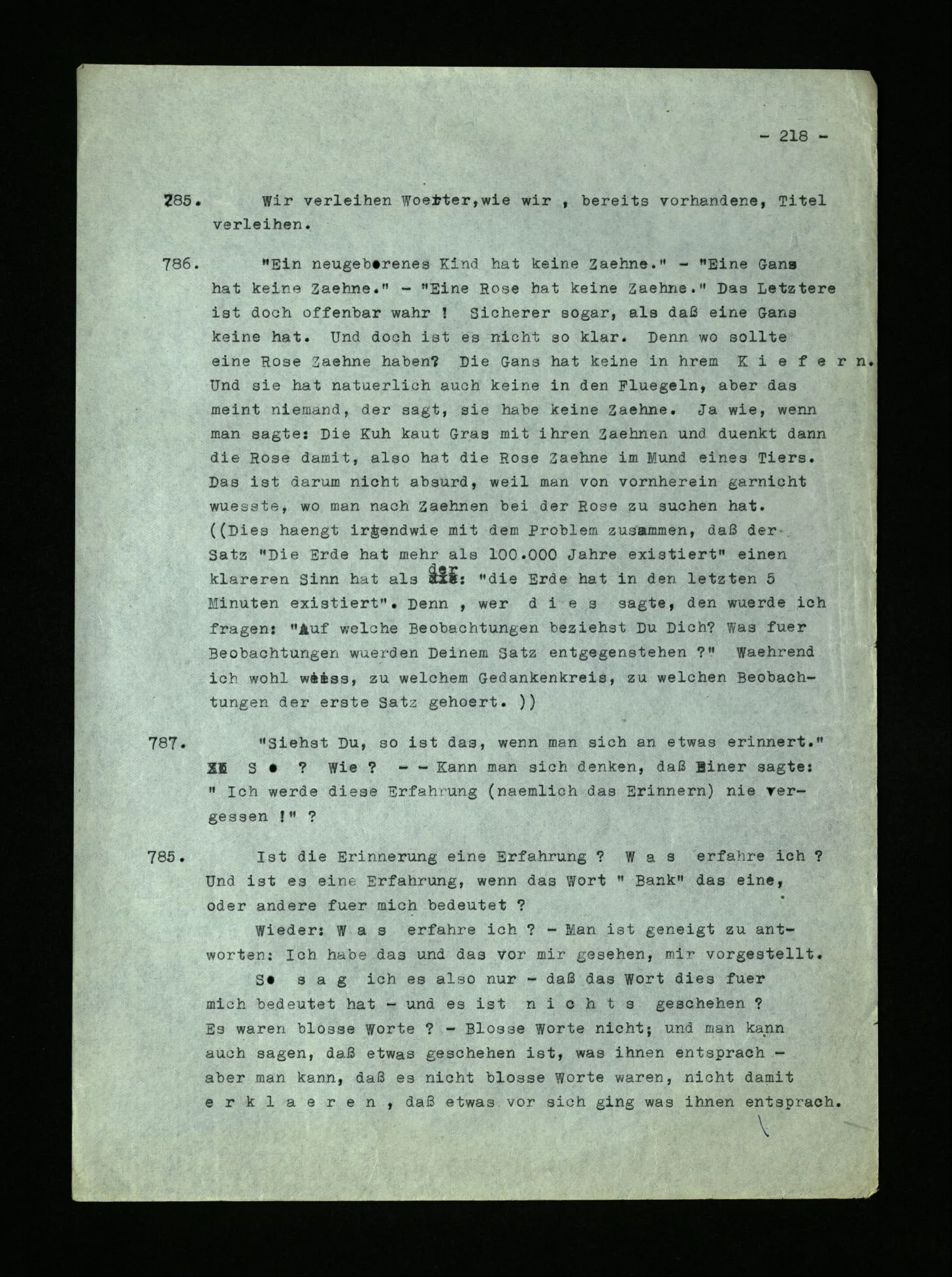 1801. Er fragt “Was hast Du mit dem Wort gemeint?” – Ich beantworte die Frage und setze hinzu: “Hättest Du mich früher gefragt, so hätte ich das gleiche geantwortet; meine Antwort war nicht eine Deutung, die mir jetzt eingefallen ist.” So war sie mir schon früher eingefallen? Nein. – Und wie konnte ich dann sagen: “Hättest Du mich früher gefragt, so hätte ich ‥‥ ”? Woraus schloß ich das? Aus garnichts. Was teile ich ihm mit, wenn ich diesen Konditional ausspreche? Etwas, was manchmal von Wichtigkeit sein kann.