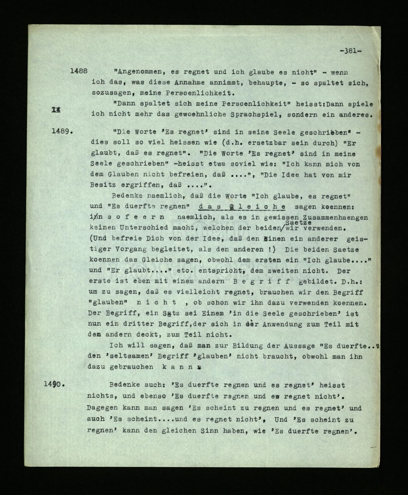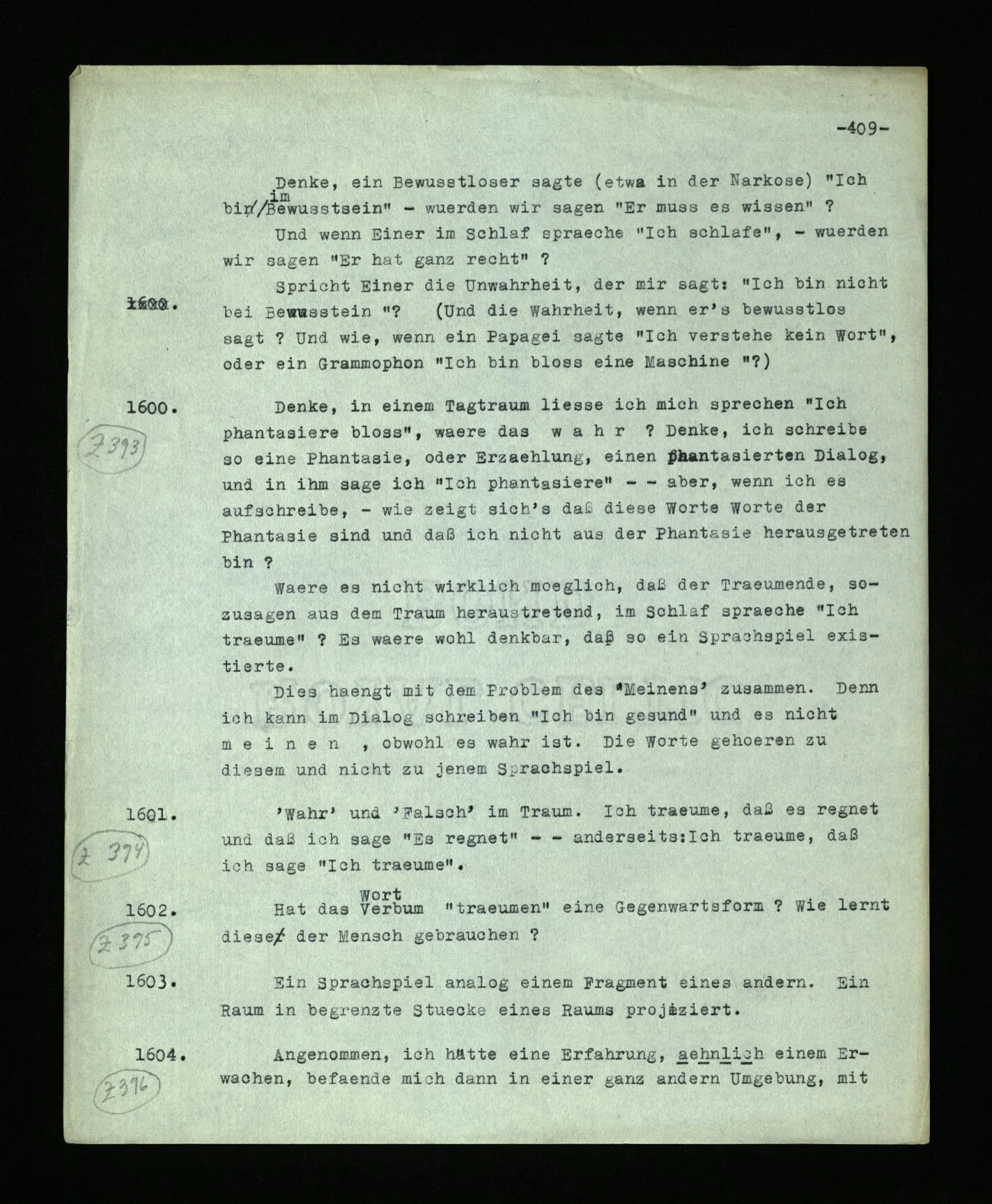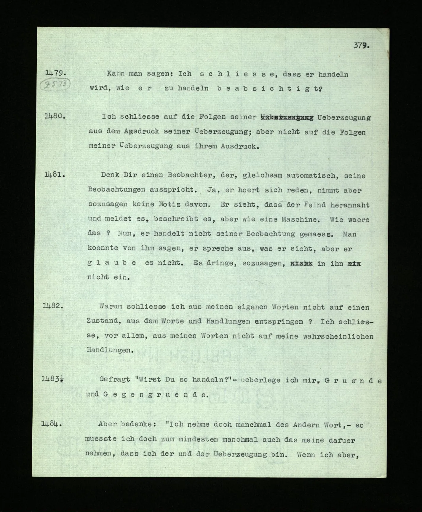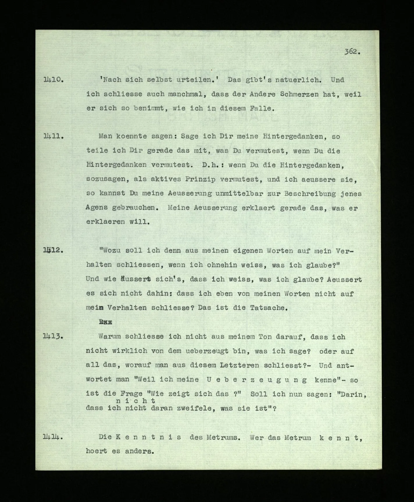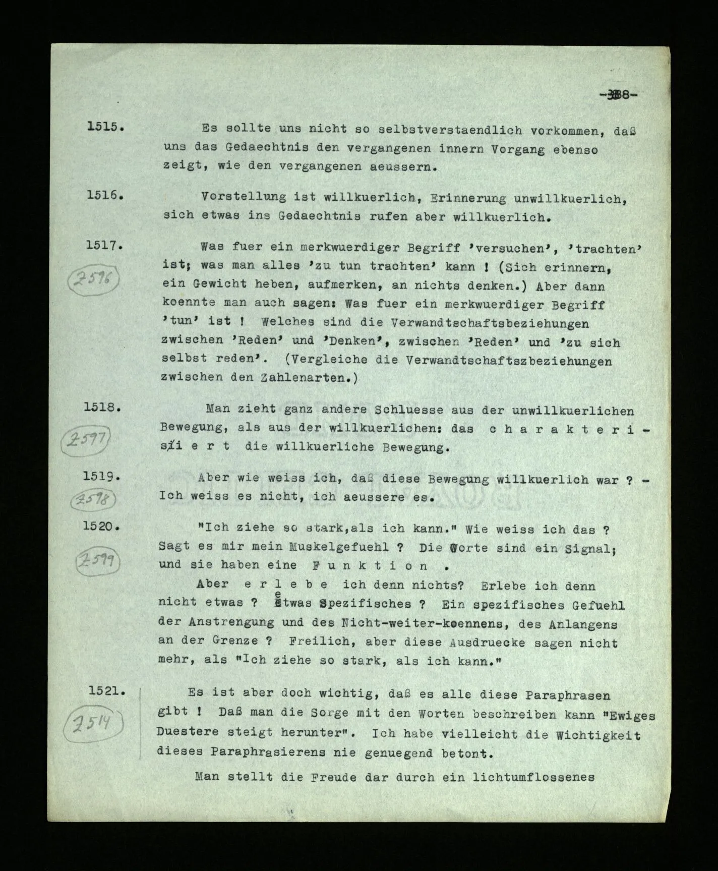 1801. Er fragt “Was hast Du mit dem Wort gemeint?” – Ich beantworte die Frage und setze hinzu: “Hättest Du mich früher gefragt, so hätte ich das gleiche geantwortet; meine Antwort war nicht eine Deutung, die mir jetzt eingefallen ist.” So war sie mir schon früher eingefallen? Nein. – Und wie konnte ich dann sagen: “Hättest Du mich früher gefragt, so hätte ich ‥‥ ”? Woraus schloß ich das? Aus garnichts. Was teile ich ihm mit, wenn ich diesen Konditional ausspreche? Etwas, was manchmal von Wichtigkeit sein kann.