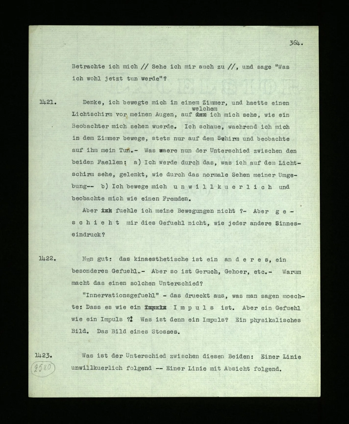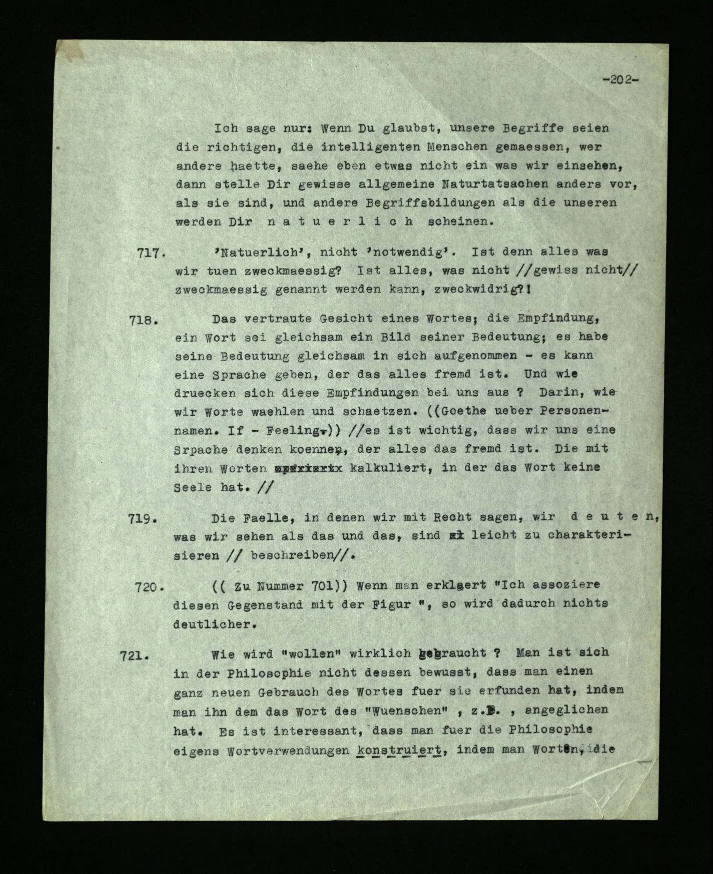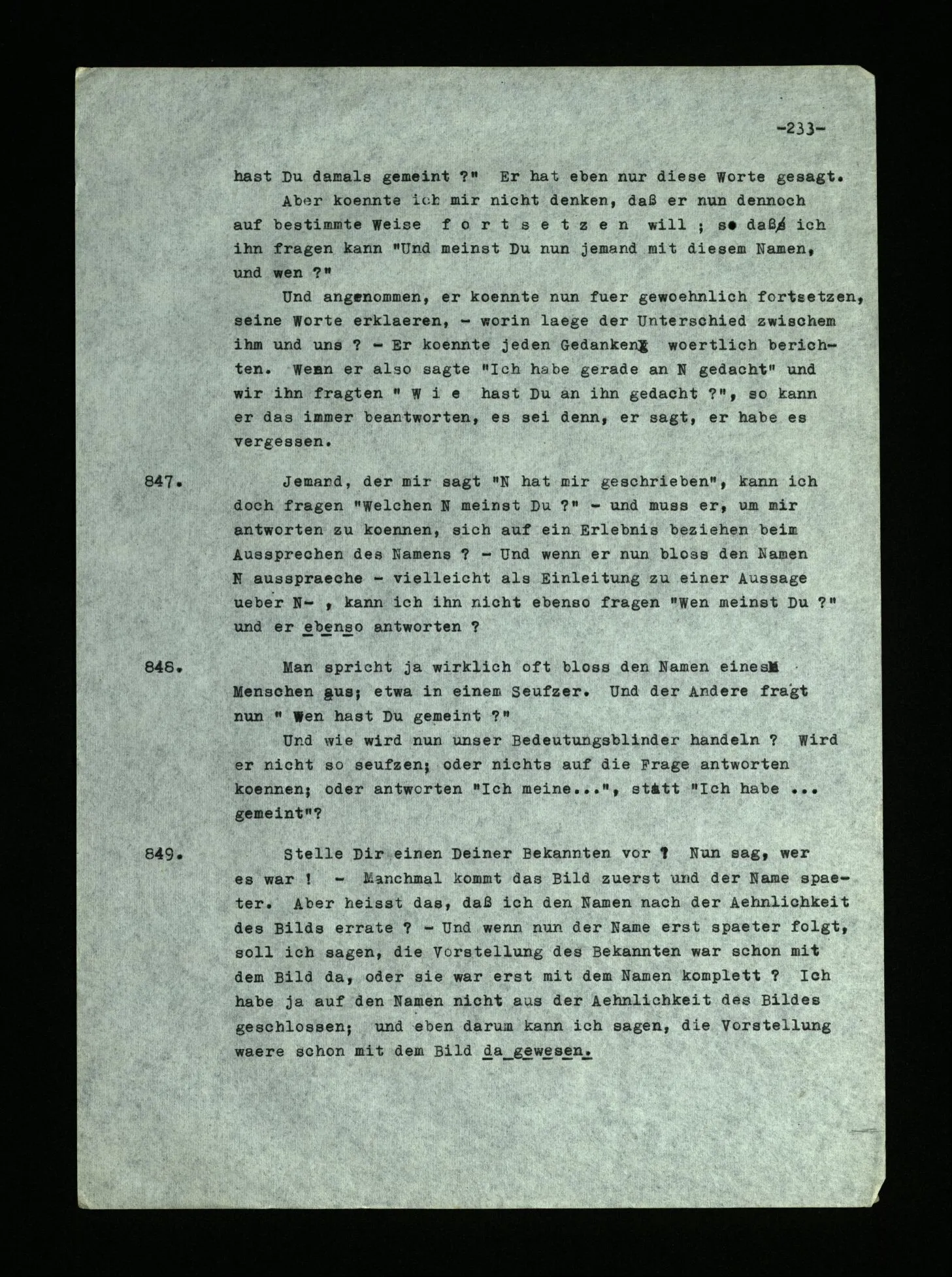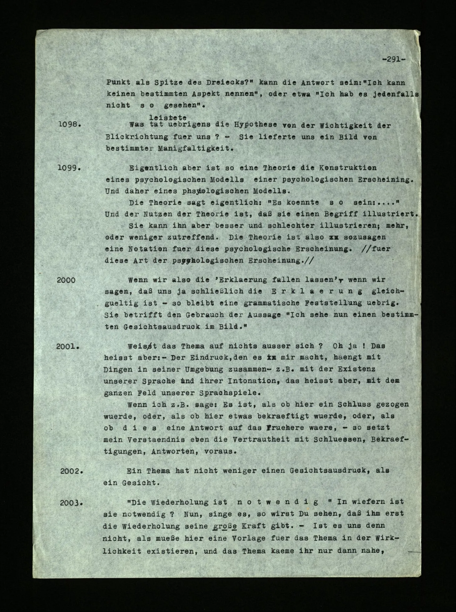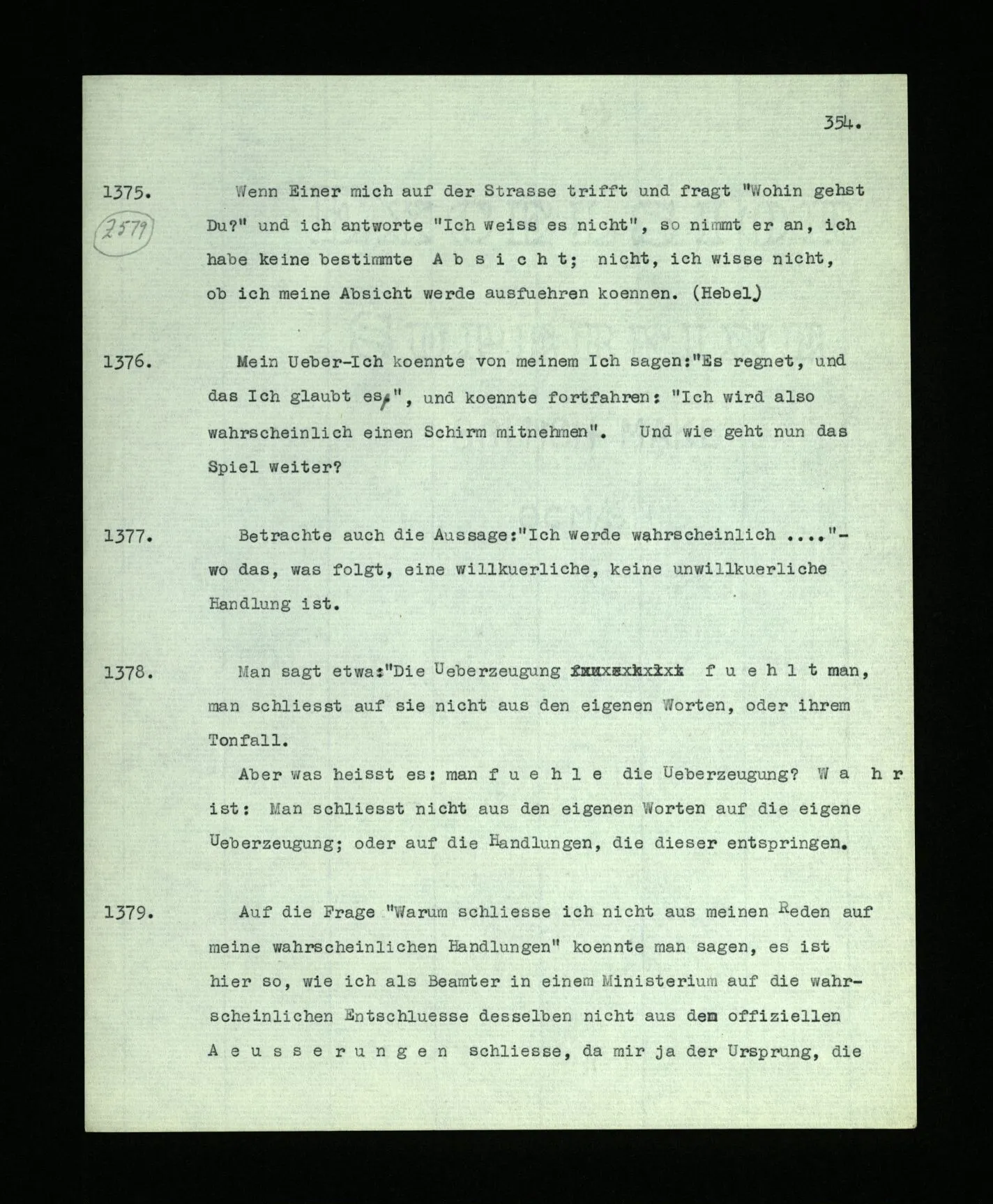 1801. Er fragt “Was hast Du mit dem Wort gemeint?” – Ich beantworte die Frage und setze hinzu: “Hättest Du mich früher gefragt, so hätte ich das gleiche geantwortet; meine Antwort war nicht eine Deutung, die mir jetzt eingefallen ist.” So war sie mir schon früher eingefallen? Nein. – Und wie konnte ich dann sagen: “Hättest Du mich früher gefragt, so hätte ich ‥‥ ”? Woraus schloß ich das? Aus garnichts. Was teile ich ihm mit, wenn ich diesen Konditional ausspreche? Etwas, was manchmal von Wichtigkeit sein kann.