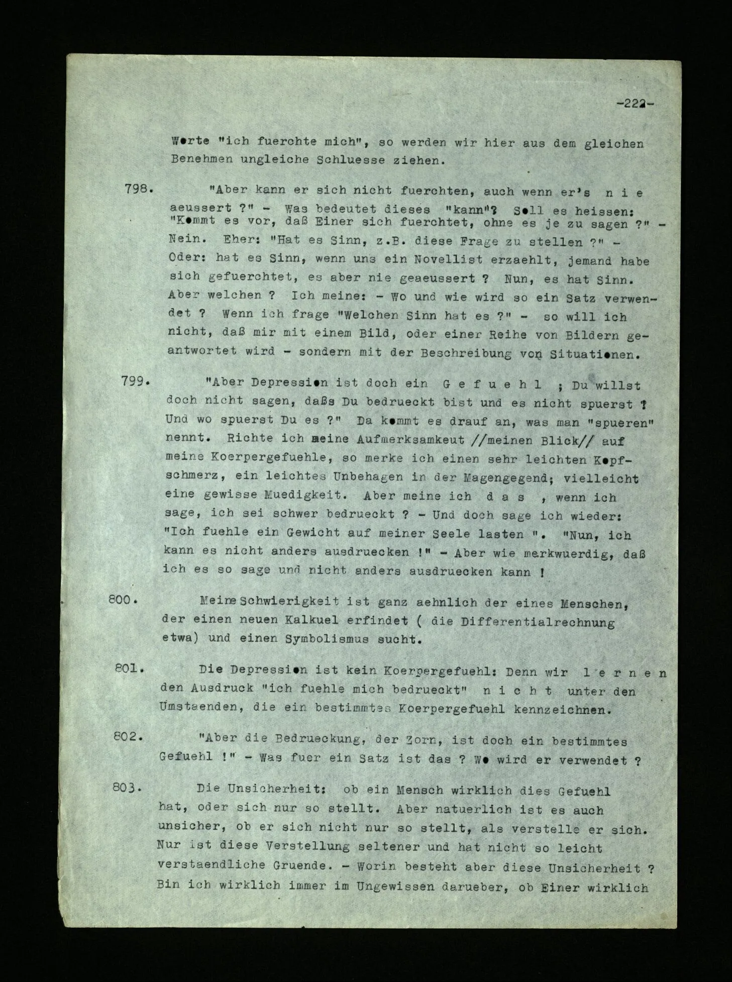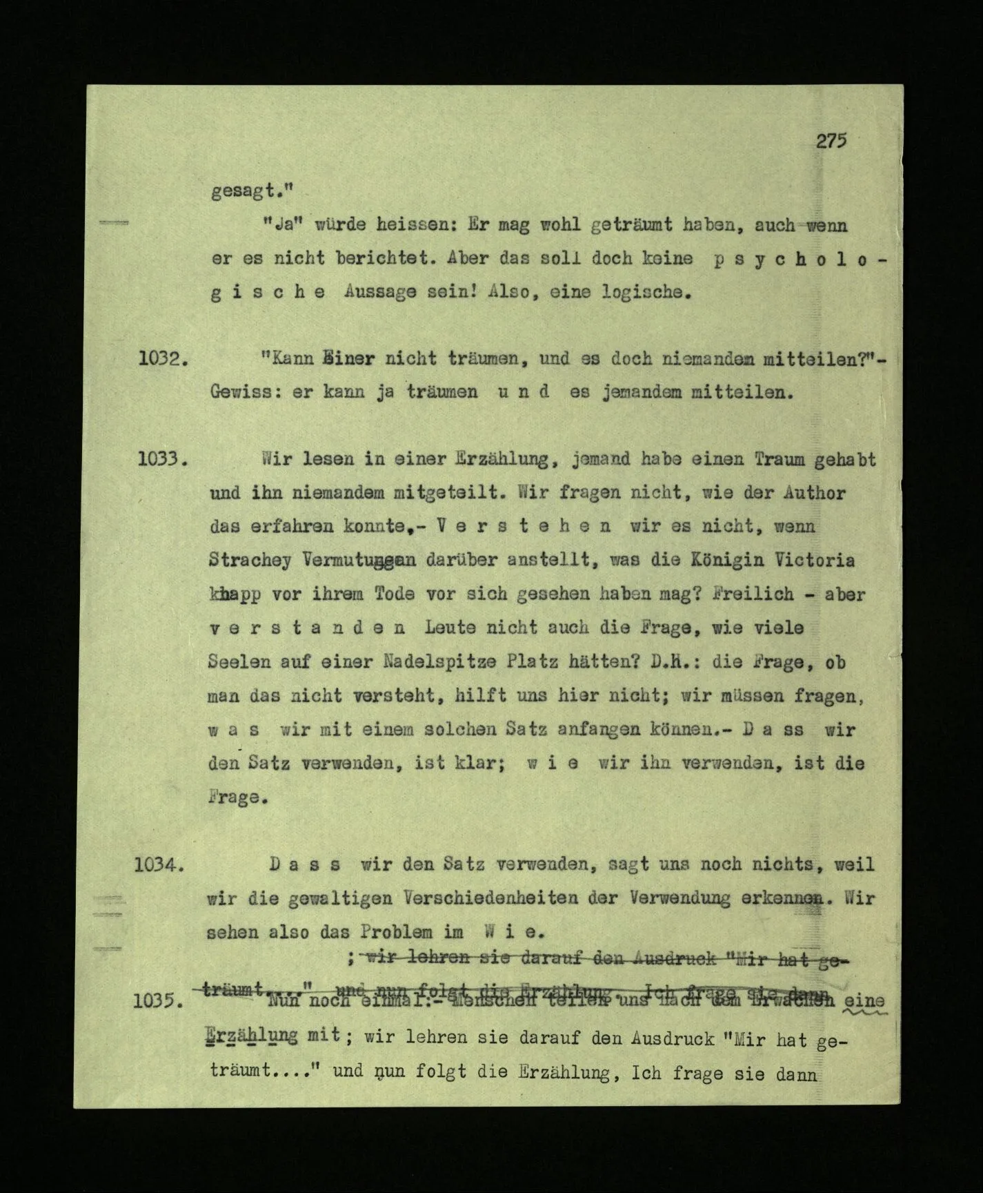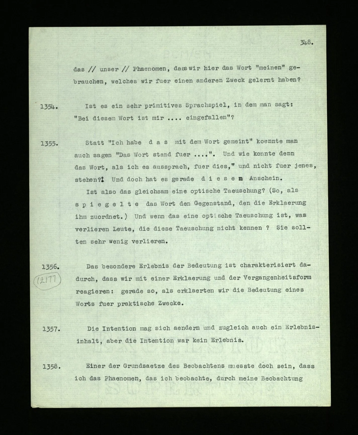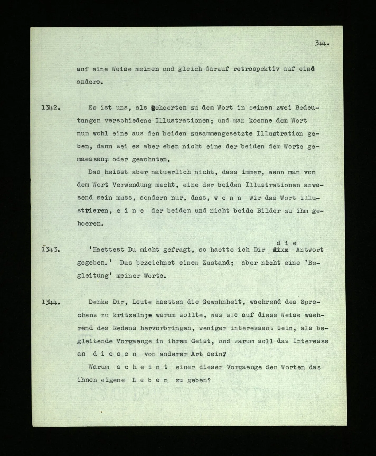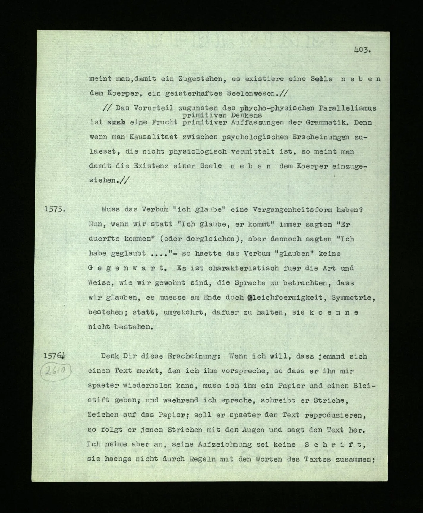 1801. Er fragt “Was hast Du mit dem Wort gemeint?” – Ich beantworte die Frage und setze hinzu: “Hättest Du mich früher gefragt, so hätte ich das gleiche geantwortet; meine Antwort war nicht eine Deutung, die mir jetzt eingefallen ist.” So war sie mir schon früher eingefallen? Nein. – Und wie konnte ich dann sagen: “Hättest Du mich früher gefragt, so hätte ich ‥‥ ”? Woraus schloß ich das? Aus garnichts. Was teile ich ihm mit, wenn ich diesen Konditional ausspreche? Etwas, was manchmal von Wichtigkeit sein kann.