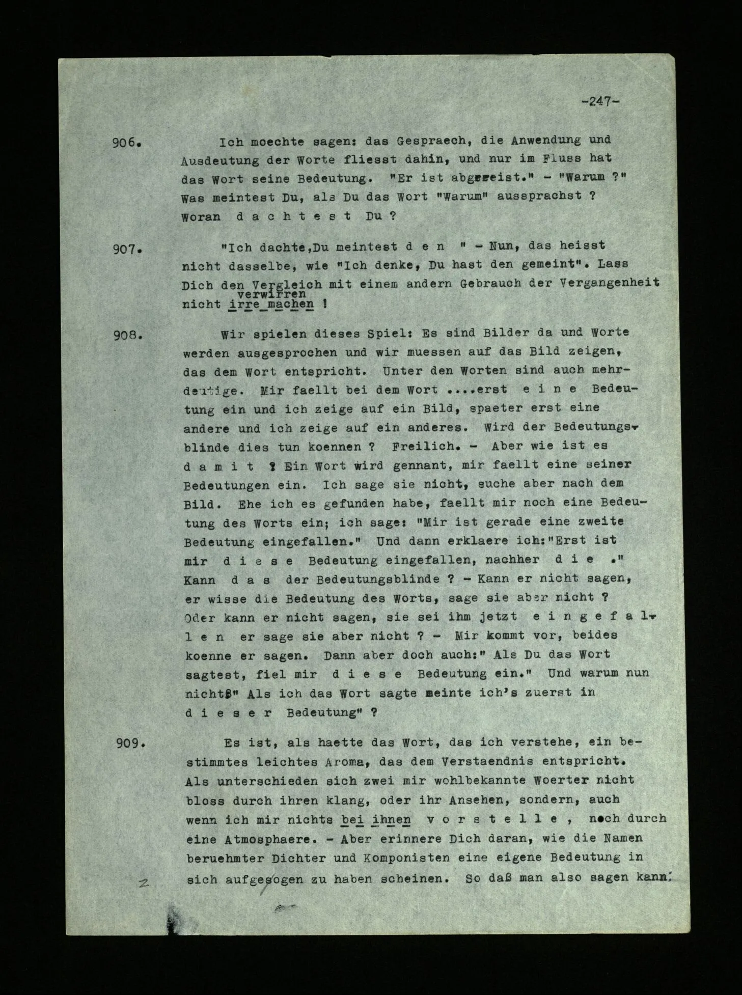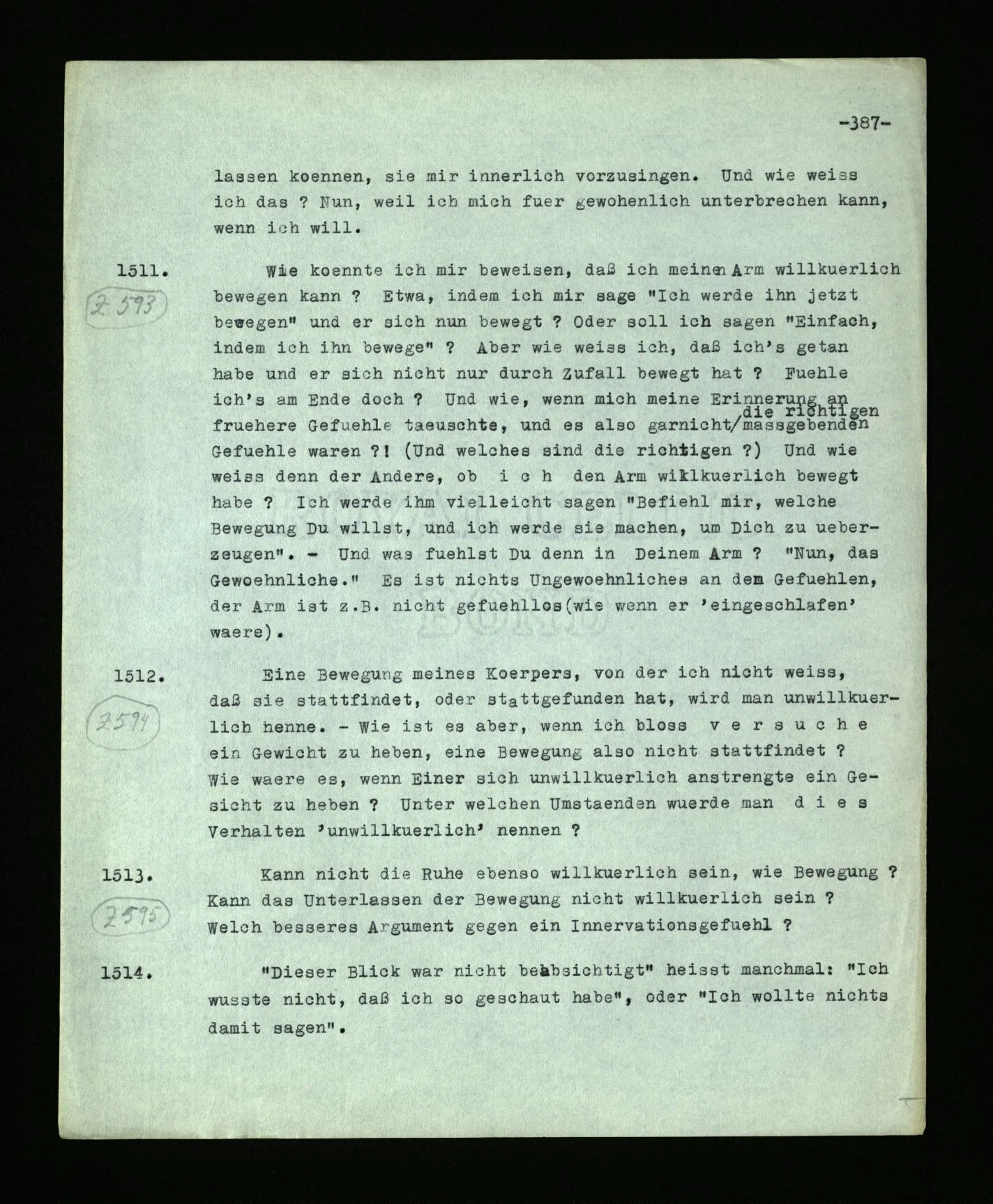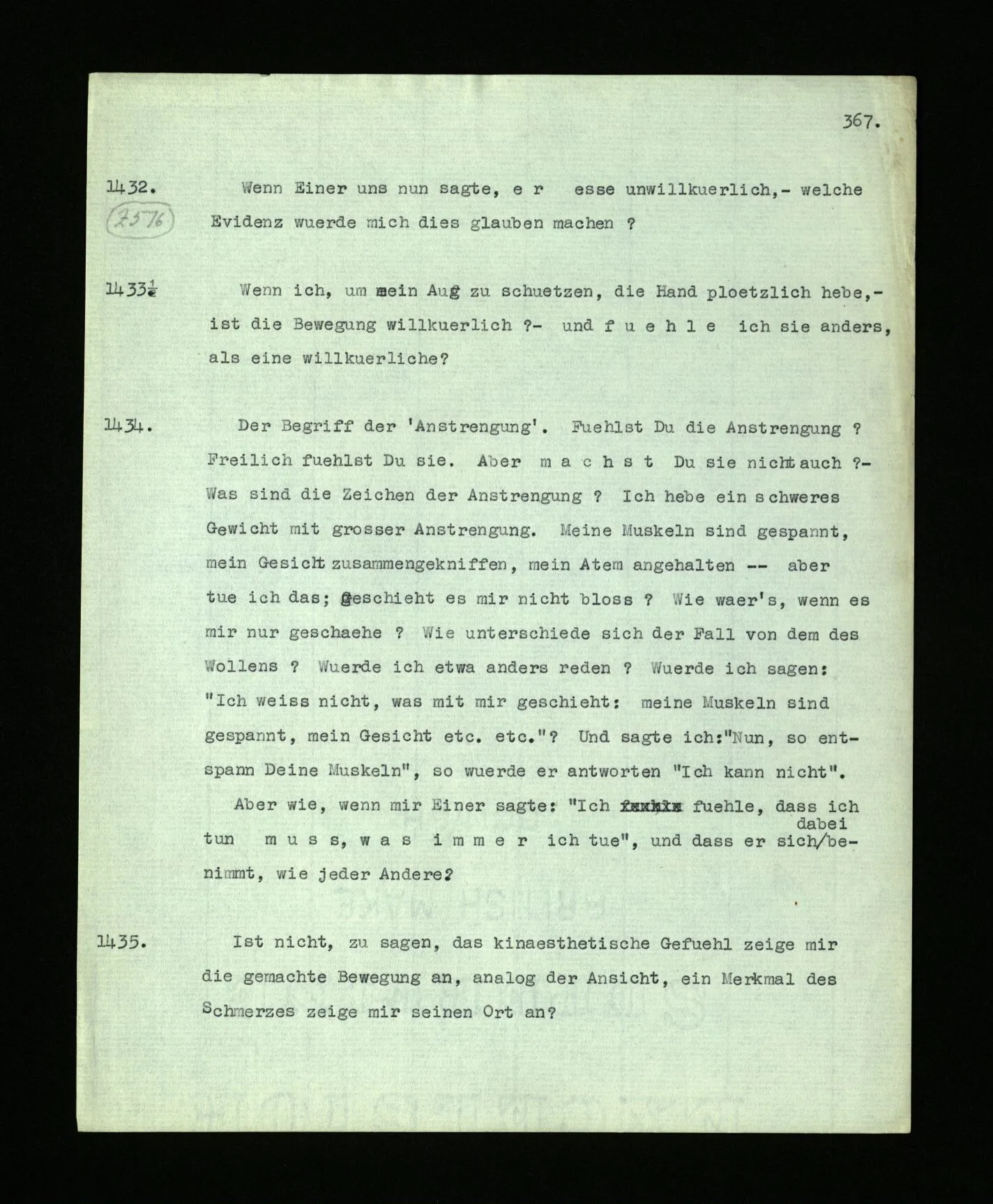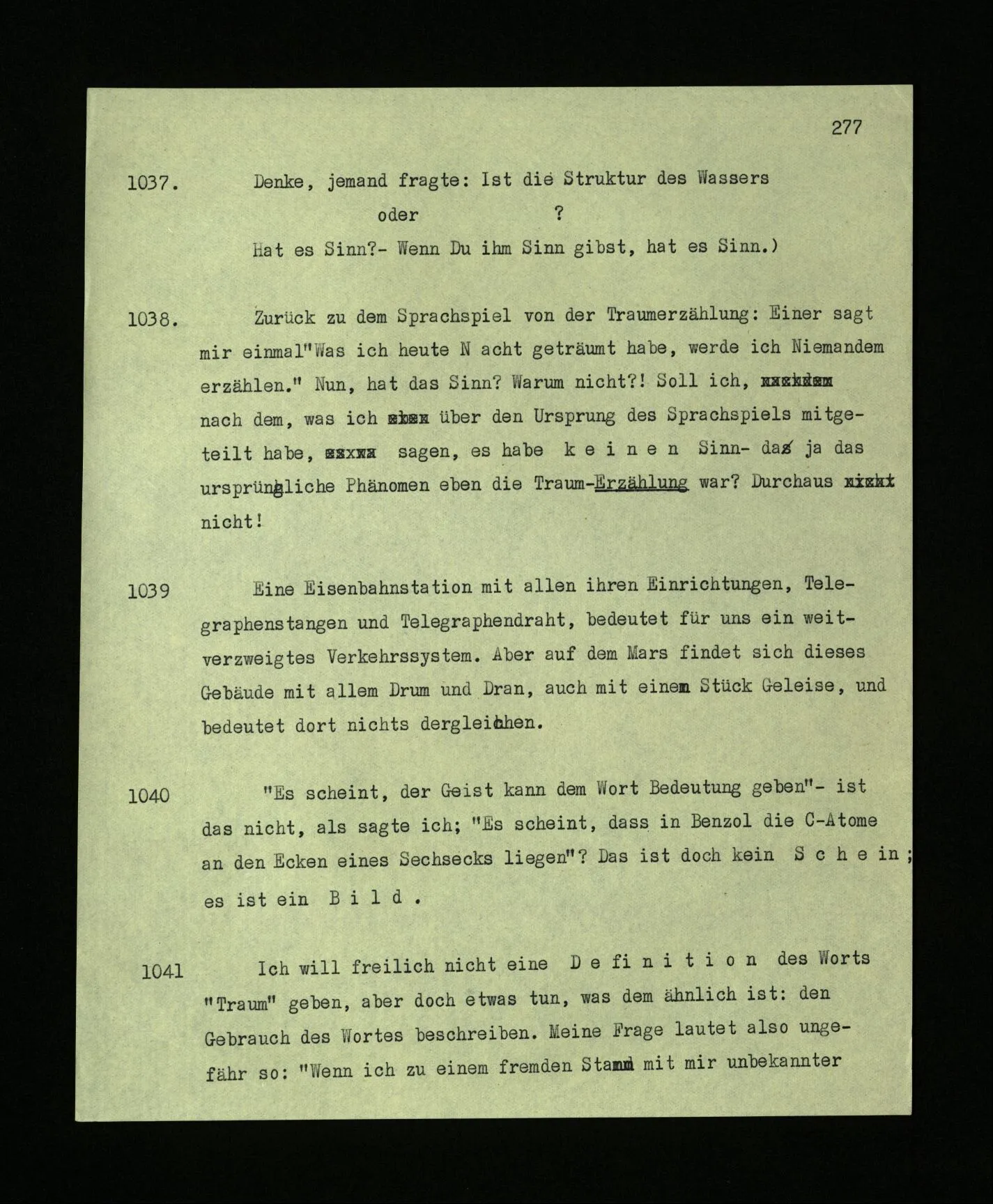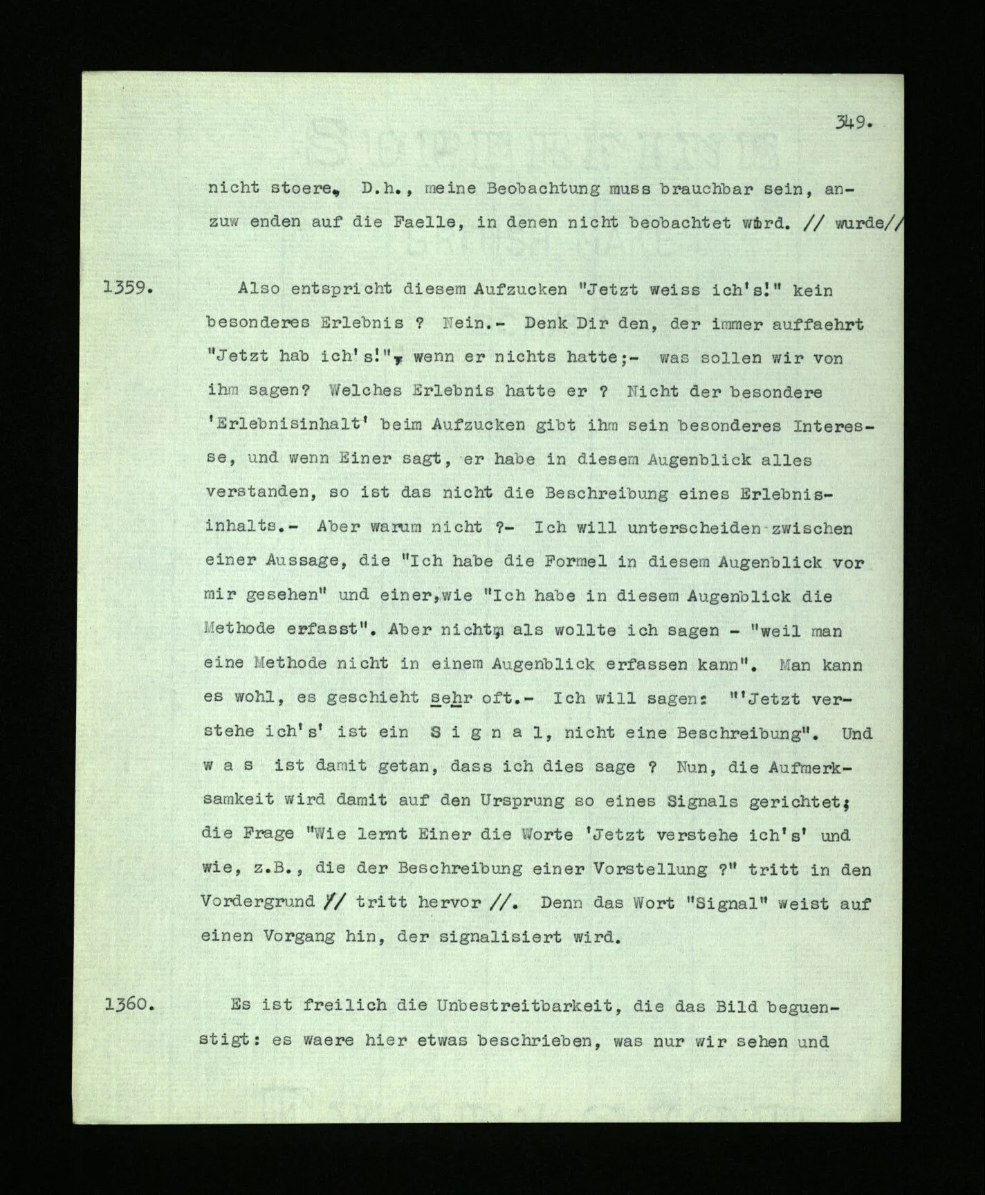 1801. Er fragt “Was hast Du mit dem Wort gemeint?” – Ich beantworte die Frage und setze hinzu: “Hättest Du mich früher gefragt, so hätte ich das gleiche geantwortet; meine Antwort war nicht eine Deutung, die mir jetzt eingefallen ist.” So war sie mir schon früher eingefallen? Nein. – Und wie konnte ich dann sagen: “Hättest Du mich früher gefragt, so hätte ich ‥‥ ”? Woraus schloß ich das? Aus garnichts. Was teile ich ihm mit, wenn ich diesen Konditional ausspreche? Etwas, was manchmal von Wichtigkeit sein kann.