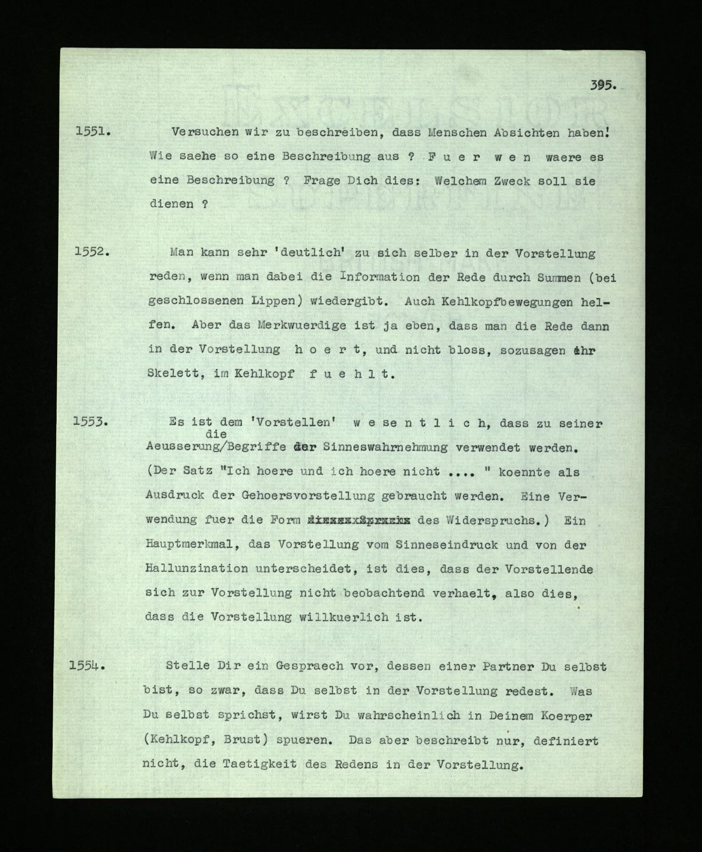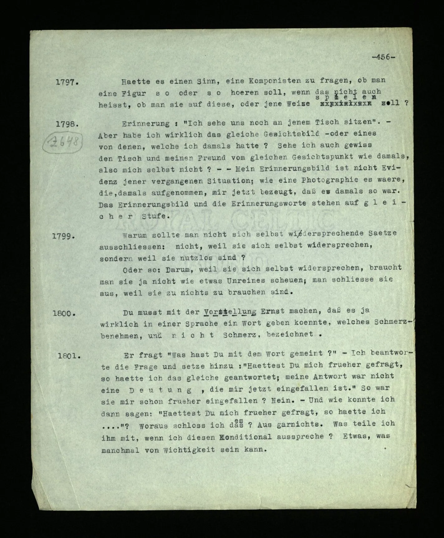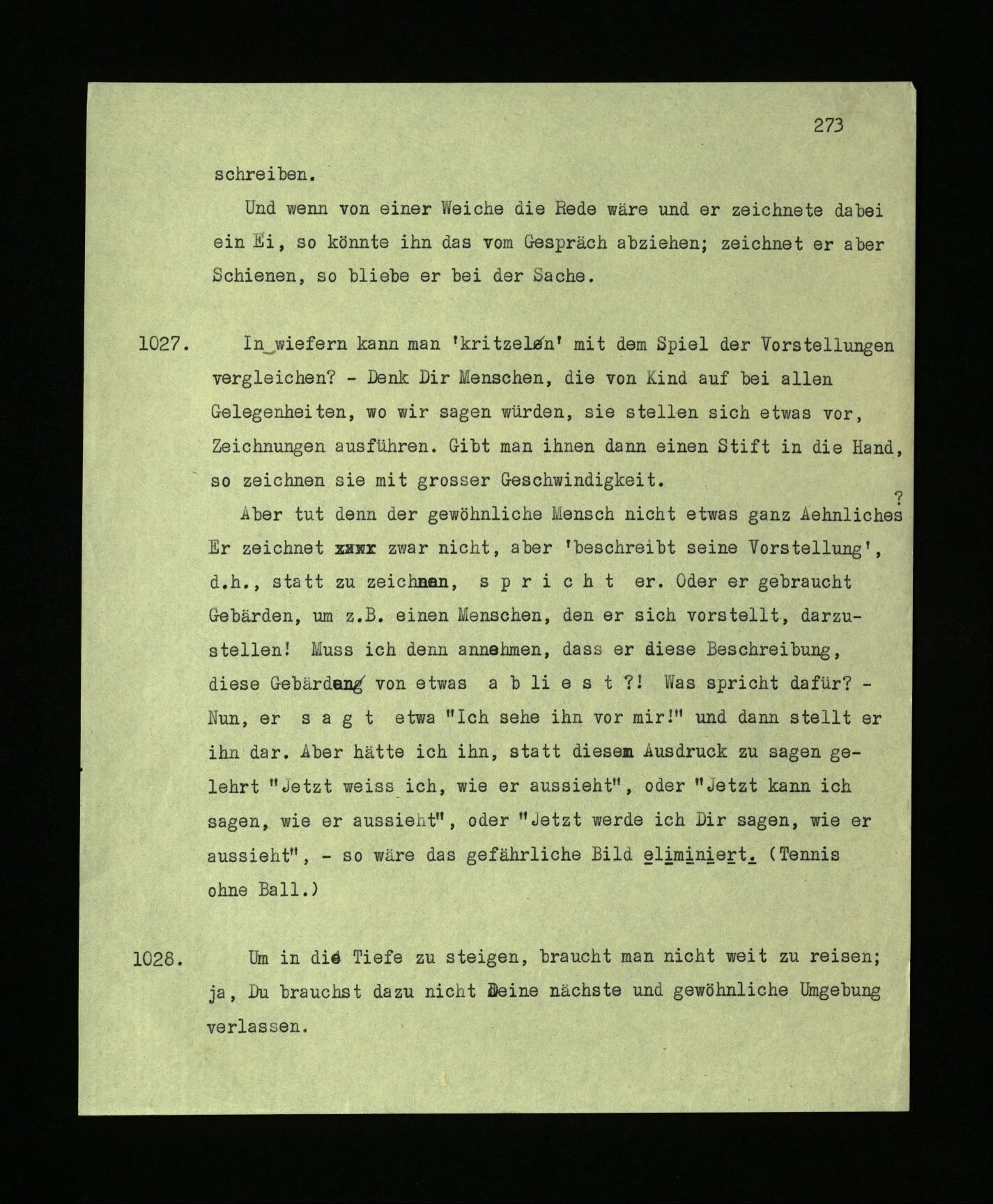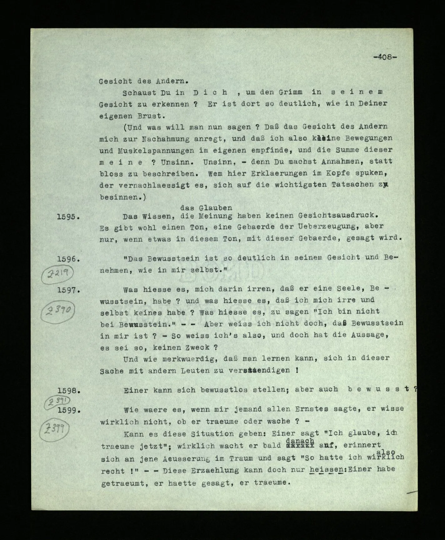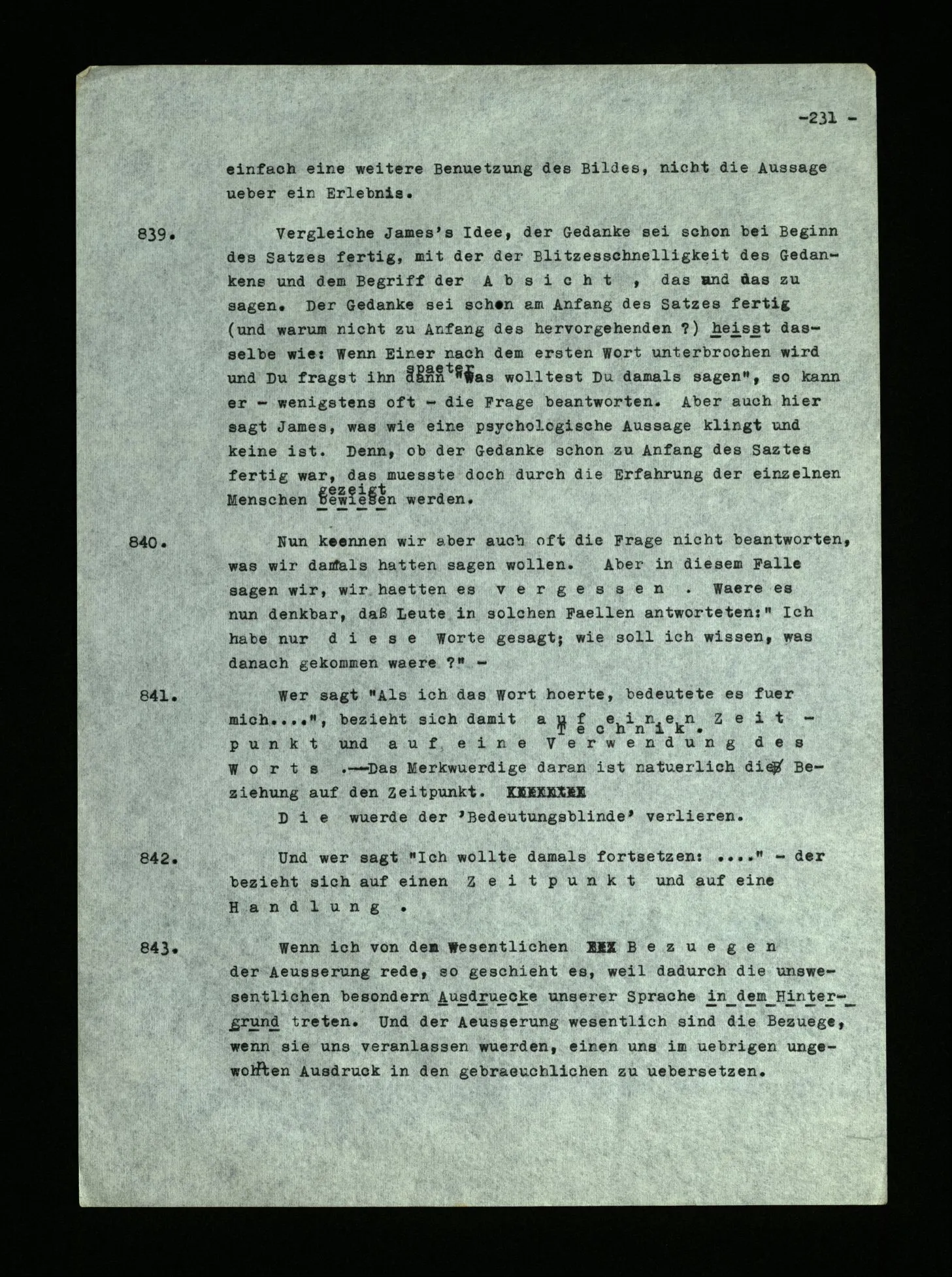 1801. Er fragt “Was hast Du mit dem Wort gemeint?” – Ich beantworte die Frage und setze hinzu: “Hättest Du mich früher gefragt, so hätte ich das gleiche geantwortet; meine Antwort war nicht eine Deutung, die mir jetzt eingefallen ist.” So war sie mir schon früher eingefallen? Nein. – Und wie konnte ich dann sagen: “Hättest Du mich früher gefragt, so hätte ich ‥‥ ”? Woraus schloß ich das? Aus garnichts. Was teile ich ihm mit, wenn ich diesen Konditional ausspreche? Etwas, was manchmal von Wichtigkeit sein kann.