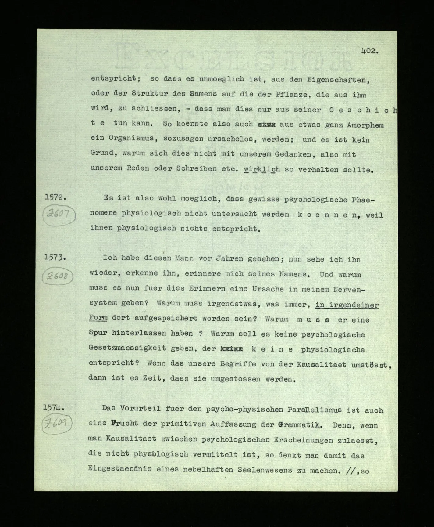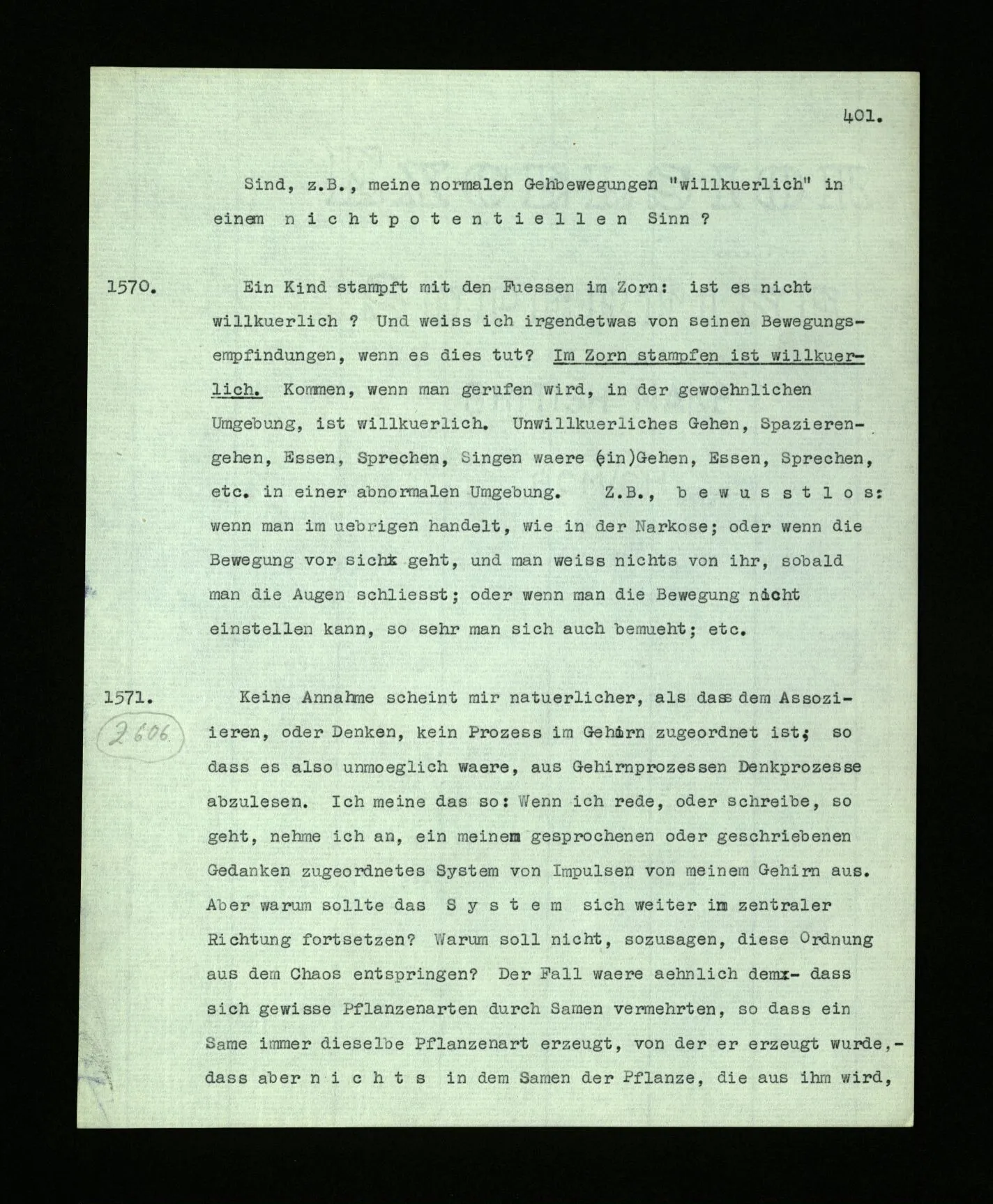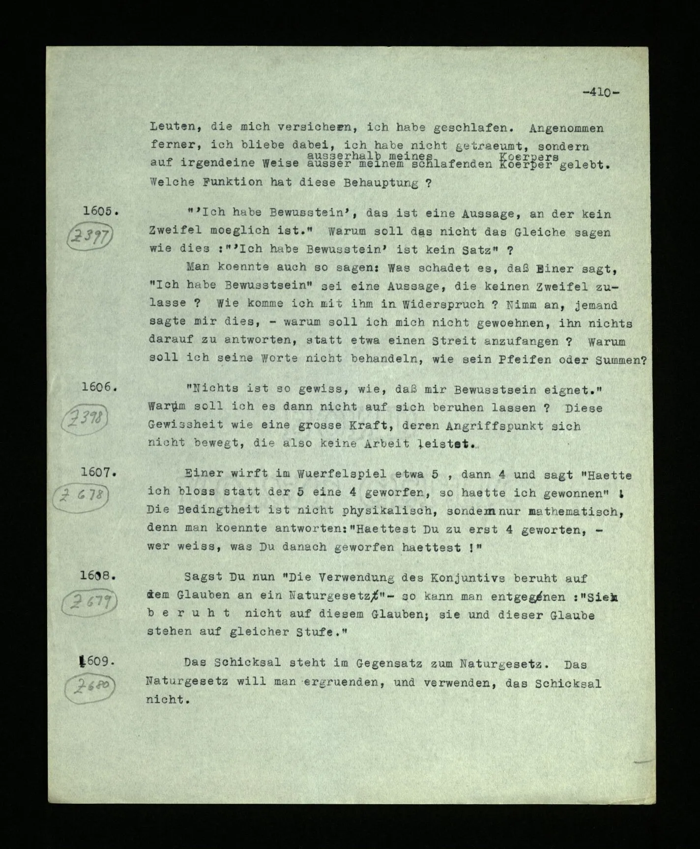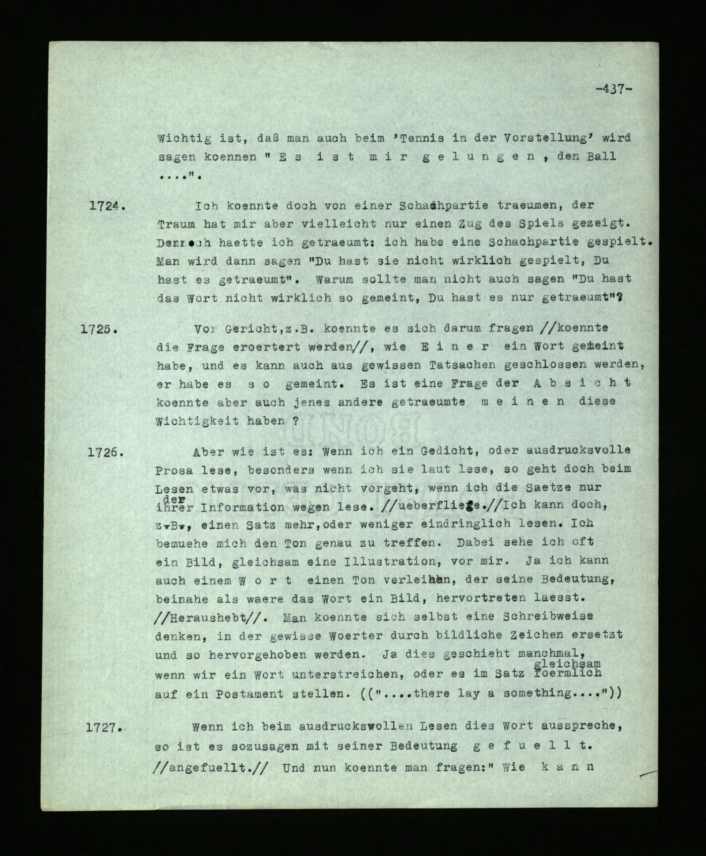 1801. Er fragt “Was hast Du mit dem Wort gemeint?” – Ich beantworte die Frage und setze hinzu: “Hättest Du mich früher gefragt, so hätte ich das gleiche geantwortet; meine Antwort war nicht eine Deutung, die mir jetzt eingefallen ist.” So war sie mir schon früher eingefallen? Nein. – Und wie konnte ich dann sagen: “Hättest Du mich früher gefragt, so hätte ich ‥‥ ”? Woraus schloß ich das? Aus garnichts. Was teile ich ihm mit, wenn ich diesen Konditional ausspreche? Etwas, was manchmal von Wichtigkeit sein kann.